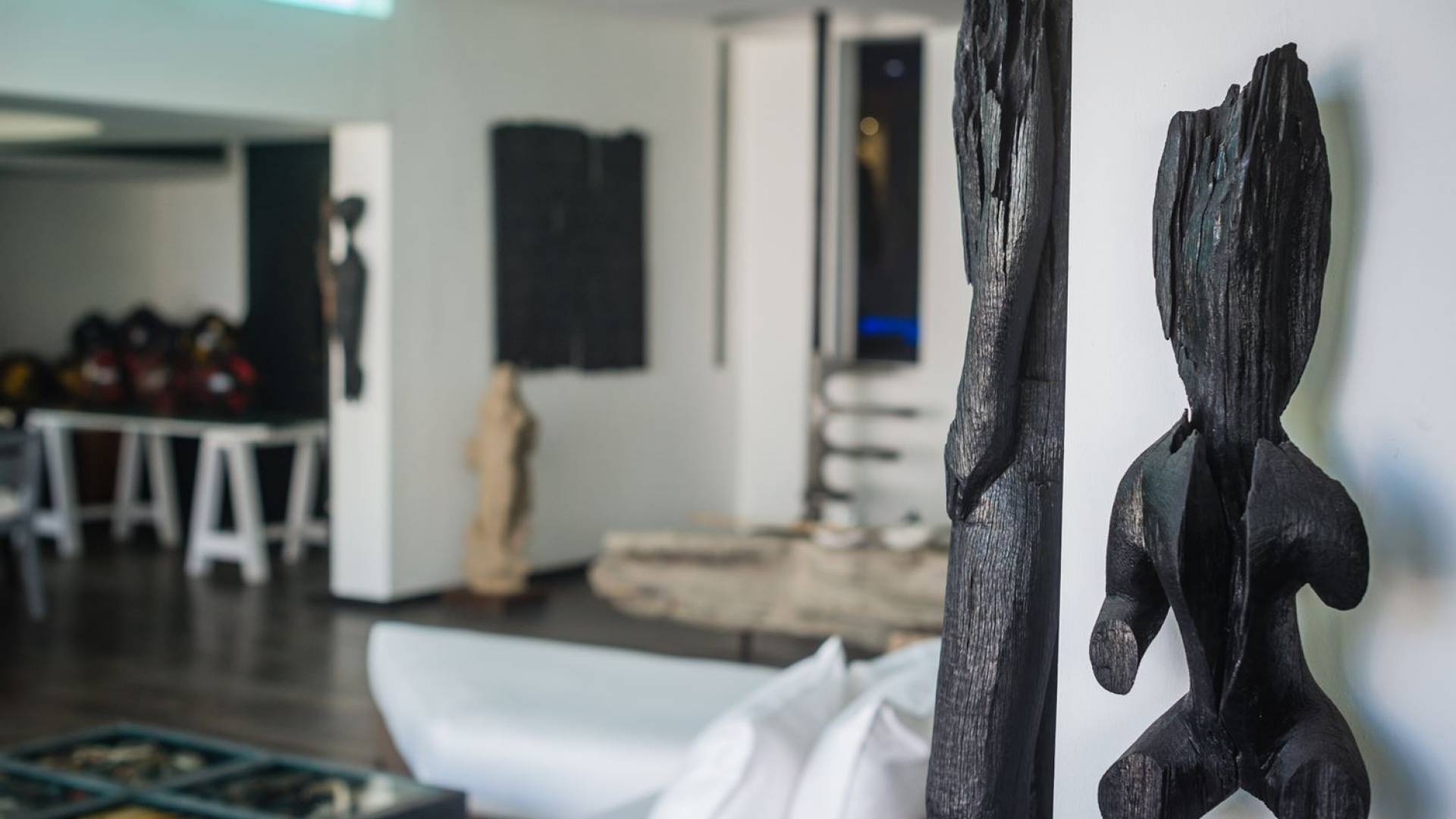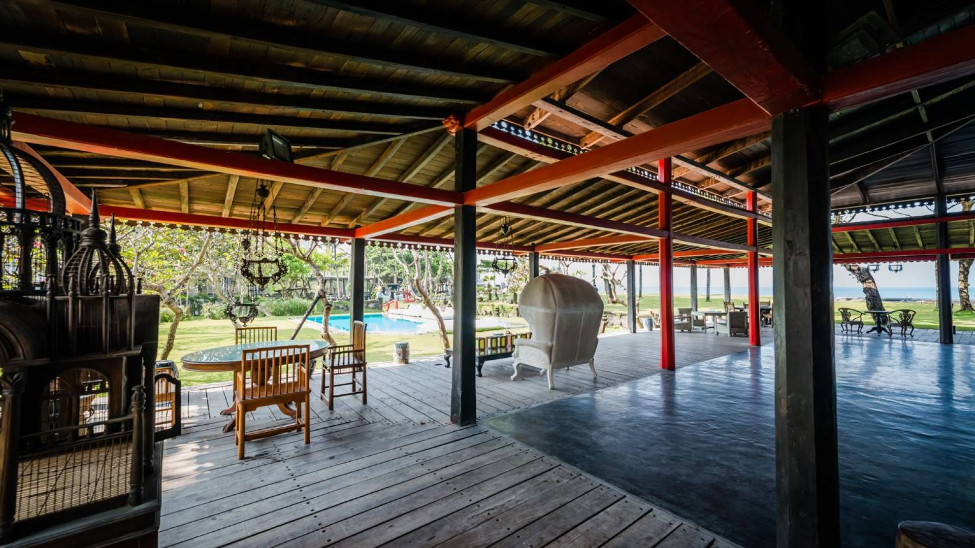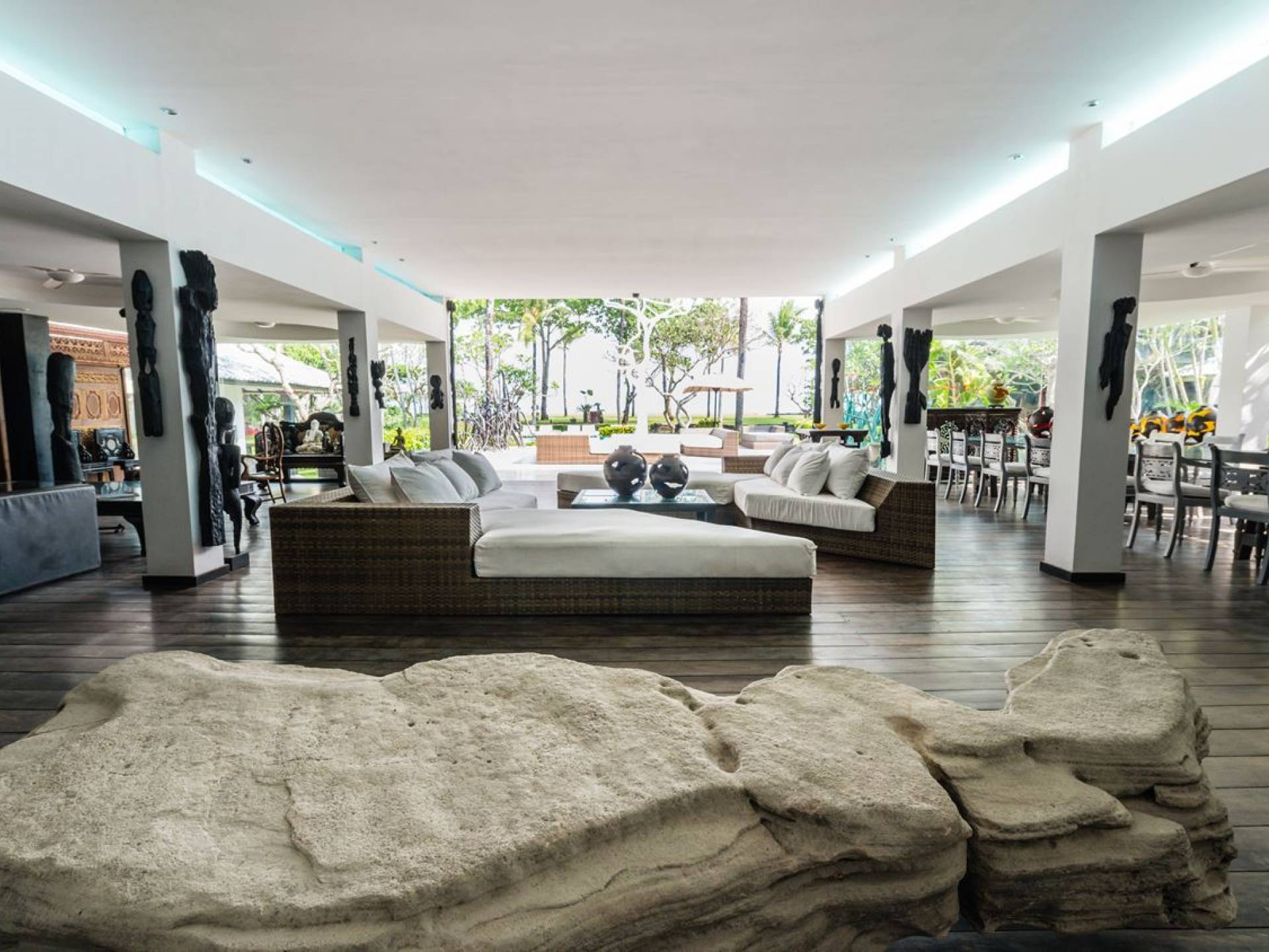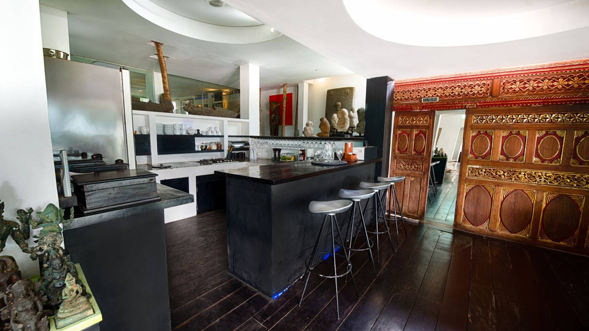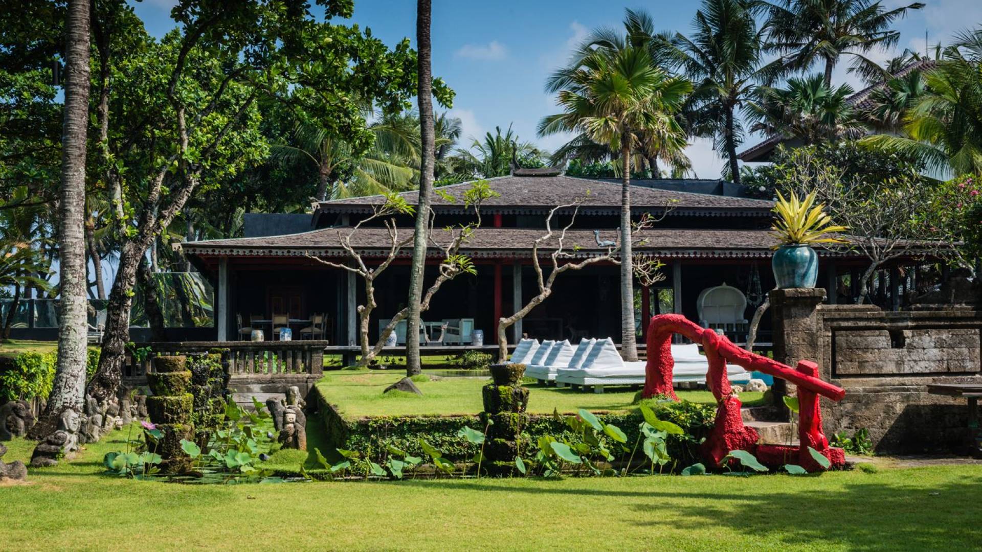 Le spacieux salon décloisonné a l'air d'un musée, décoré d'antiquités et d'œuvres d'art tribales. Le salon dispose d'un parquet rustique, de meubles en bois sculptés à la main, d'une cheminée et de murs traditionnels en bois de teck finement sculptés d'un côté. Magnifique! Il y a de grands canapés en rotin avec des coussins blancs pour se détendre, il y a une longue table à manger pouvant accueillir jusqu'à 24 personnes, il y a une télévision et il y a une cuisine avec un bar et des tabourets. Un autre bâtiment impressionnant sur place est The King's House - une authentique ancienne maison de roi ramenée de Pontianak, Kalimantan. Cette ancienne maison à deux niveaux est idéale pour les célébrations et les événements, située juste à côté de la piscine. Il y a un grand plateau au milieu, qui pourrait constituer une piste de danse ou une scène et il est entouré d'une véranda avec des sièges et des options de restauration. Attenant au pavillon principal, il y a une galerie d'art montrant certaines des propres créations de Morabito. De plus, le domaine dispose d'un home cinéma et d'un spa privé. Quelque chose de plus que vous pourriez souhaiter? Nous ne le pensions pas !
