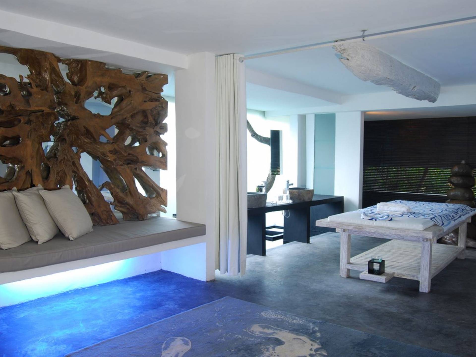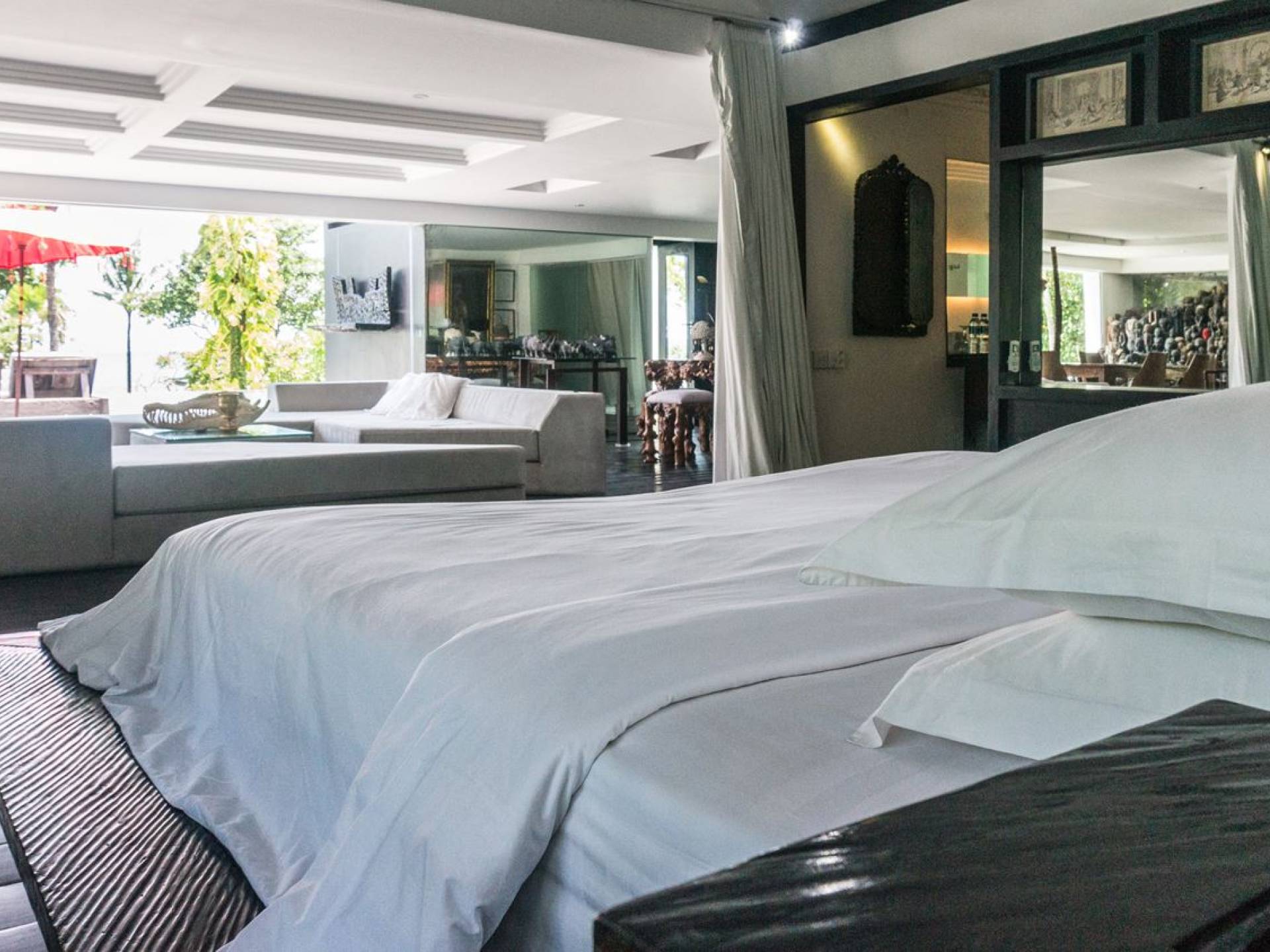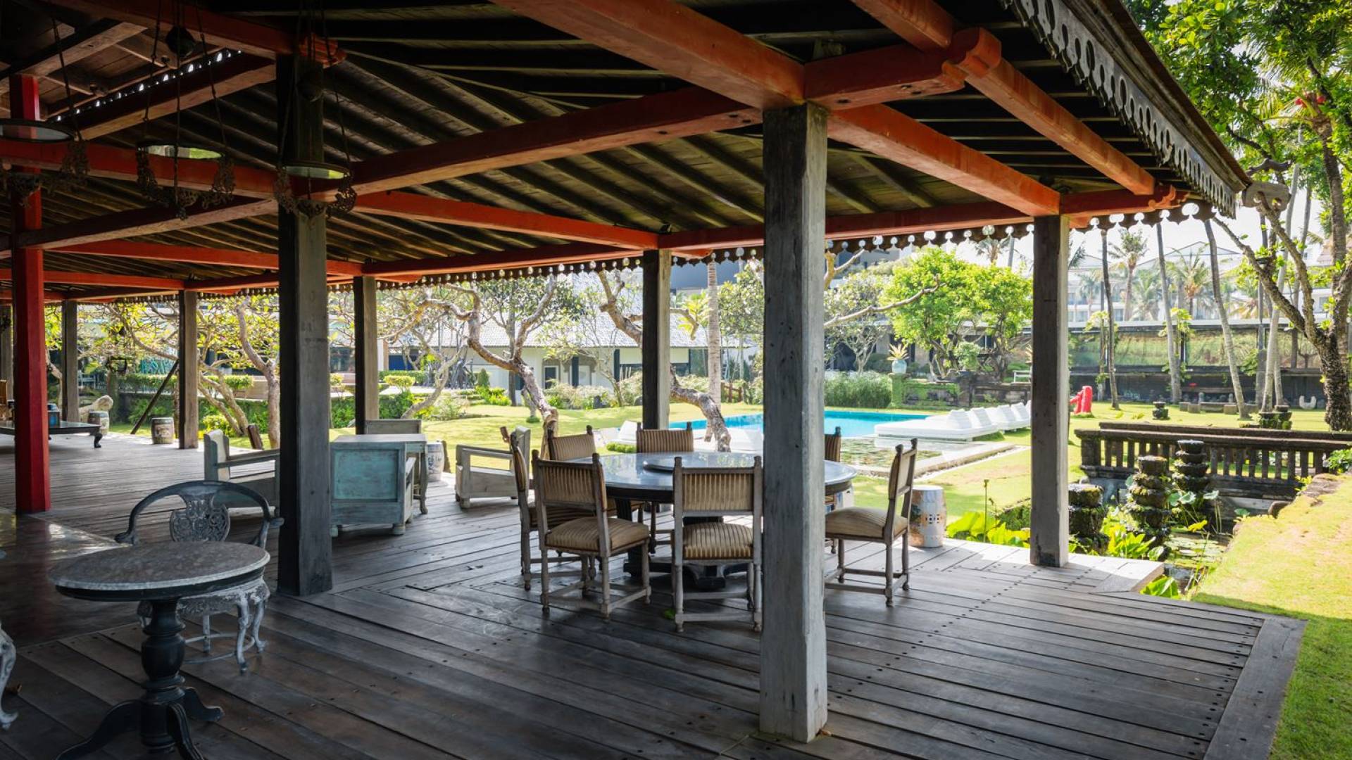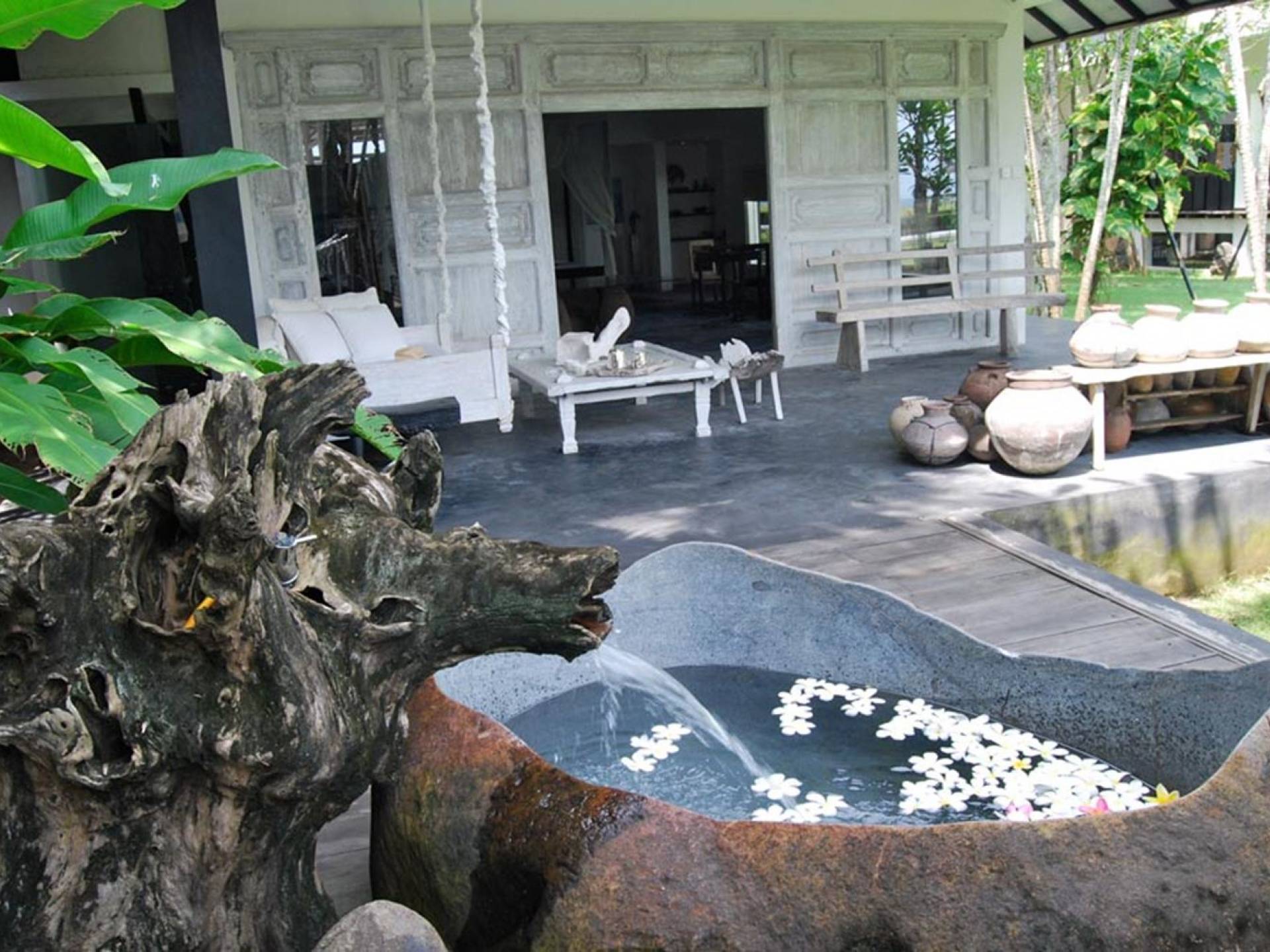 Le spacieux salon décloisonné a l'air d'un musée, décoré d'antiquités et d'œuvres d'art tribales. Le salon dispose d'un parquet rustique, de meubles en bois sculptés à la main, d'une cheminée et de murs traditionnels en bois de teck finement sculptés d'un côté. Magnifique! Il y a de grands canapés en rotin avec des coussins blancs pour se détendre, il y a une longue table à manger pouvant accueillir jusqu'à 24 personnes, il y a une télévision et il y a une cuisine avec un bar et des tabourets. Un autre bâtiment impressionnant sur place est The King's House - une authentique ancienne maison de roi ramenée de Pontianak, Kalimantan. Cette ancienne maison à deux niveaux est idéale pour les célébrations et les événements, située juste à côté de la piscine. Il y a un grand plateau au milieu, qui pourrait constituer une piste de danse ou une scène et il est entouré d'une véranda avec des sièges et des options de restauration. Attenant au pavillon principal, il y a une galerie d'art montrant certaines des propres créations de Morabito. De plus, le domaine dispose d'un home cinéma et d'un spa privé. Quelque chose de plus que vous pourriez souhaiter? Nous ne le pensions pas !