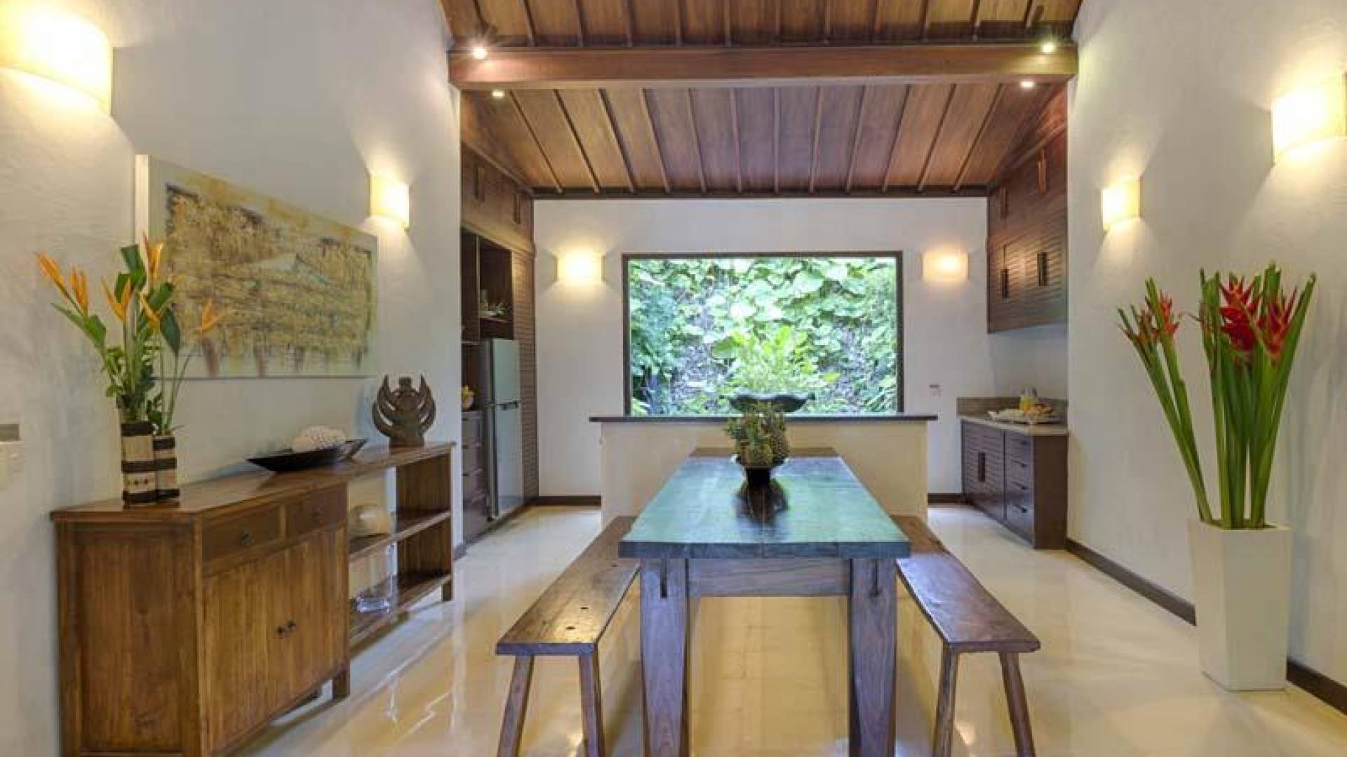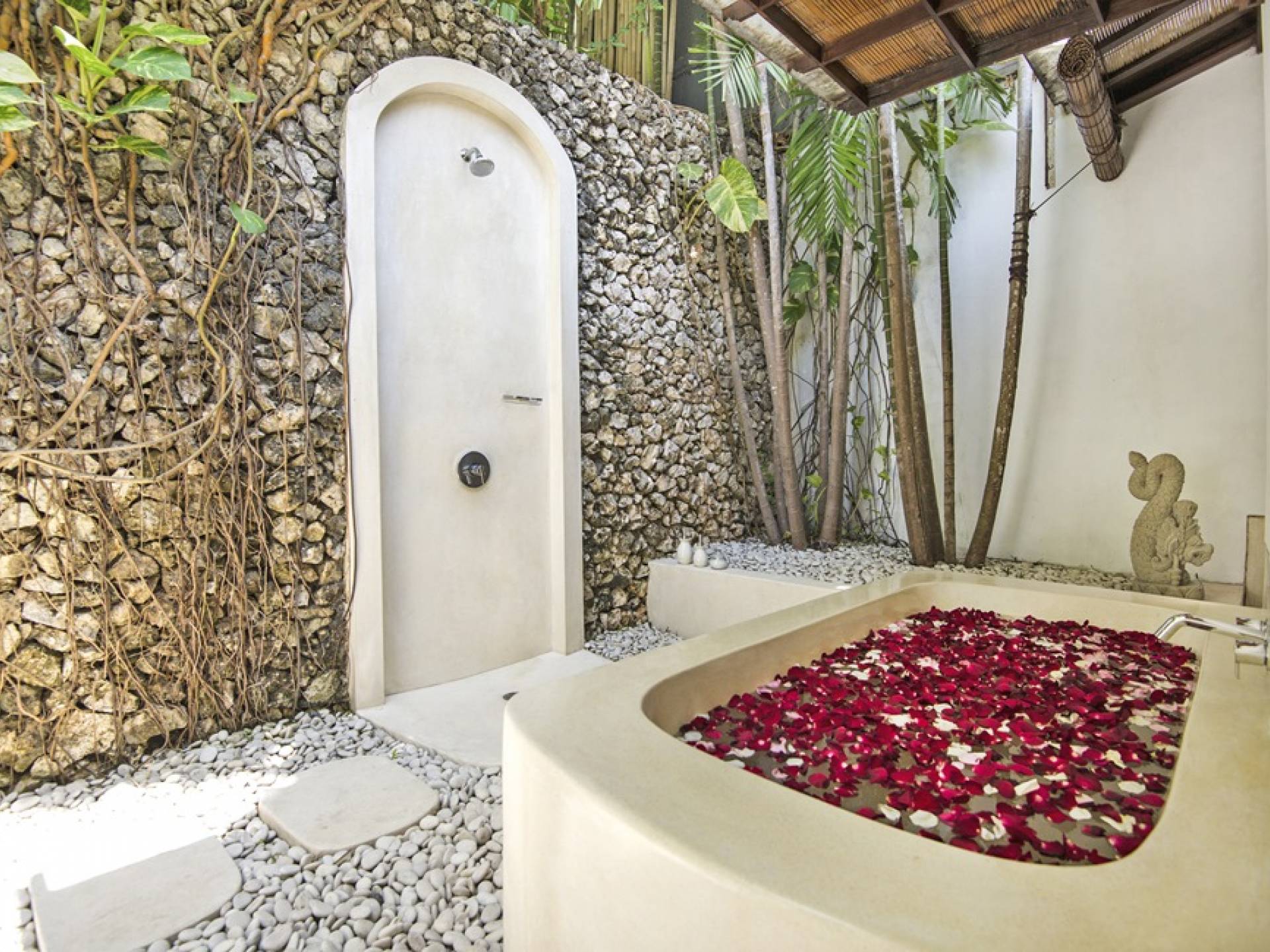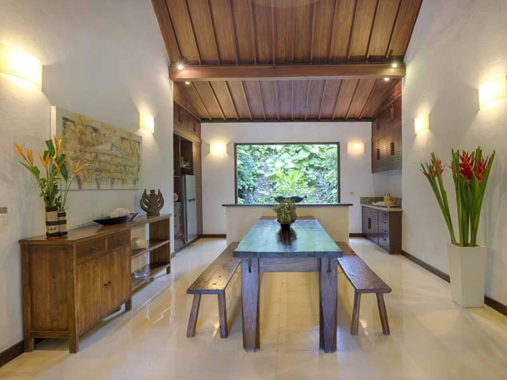 Une grande salle à manger contient une table à manger et des bancs en teck antique, un coin cuisine entièrement équipé avec une toile de fond de jungle ouverte, abritant une statue mystique. De plus, cette charmante villa de Seminyak à deux chambres dispose de salles de bains intérieures-extérieures exotiques de taille généreuse avec de profondes baignoires en terrazzo et des « chaise longues » en velours glamour pour compléter ce tableau impressionnant. Luxe, nature et ambiance balinaise se conjuguent pour votre plus grand plaisir.