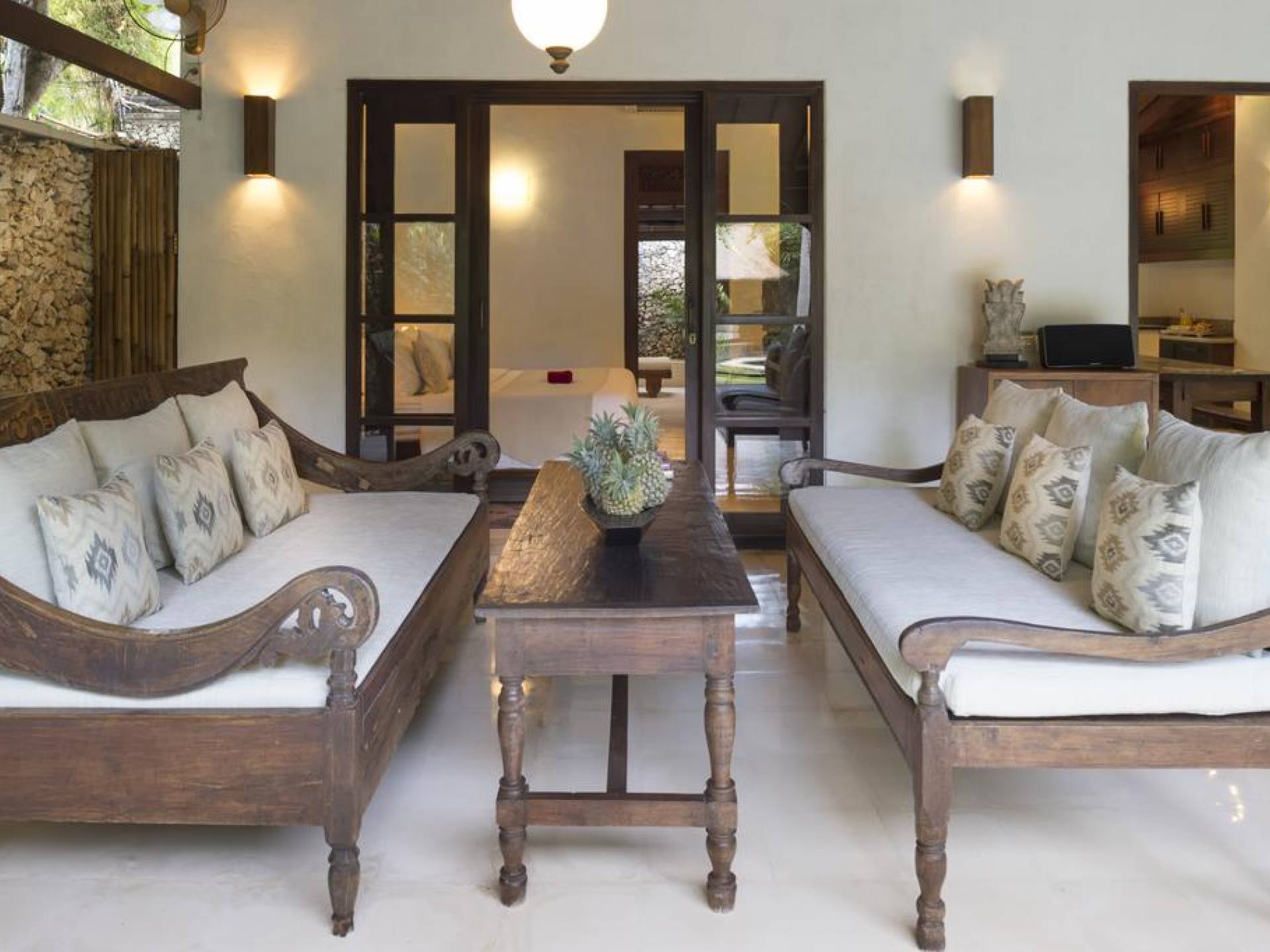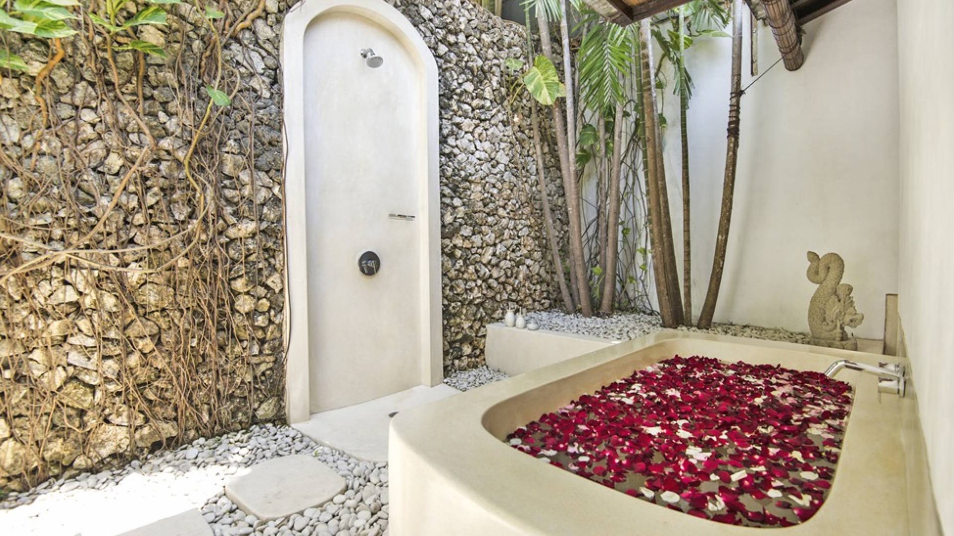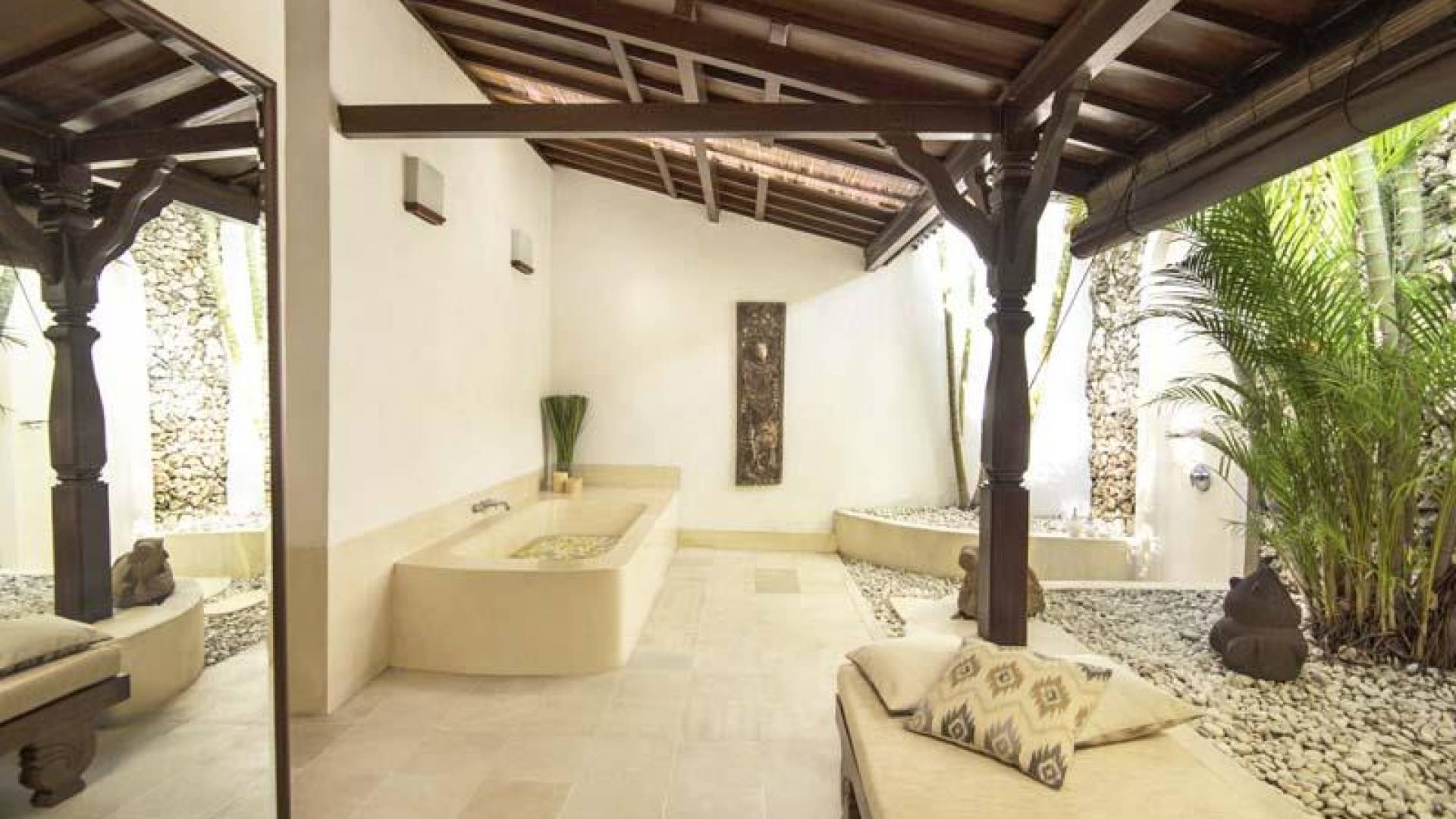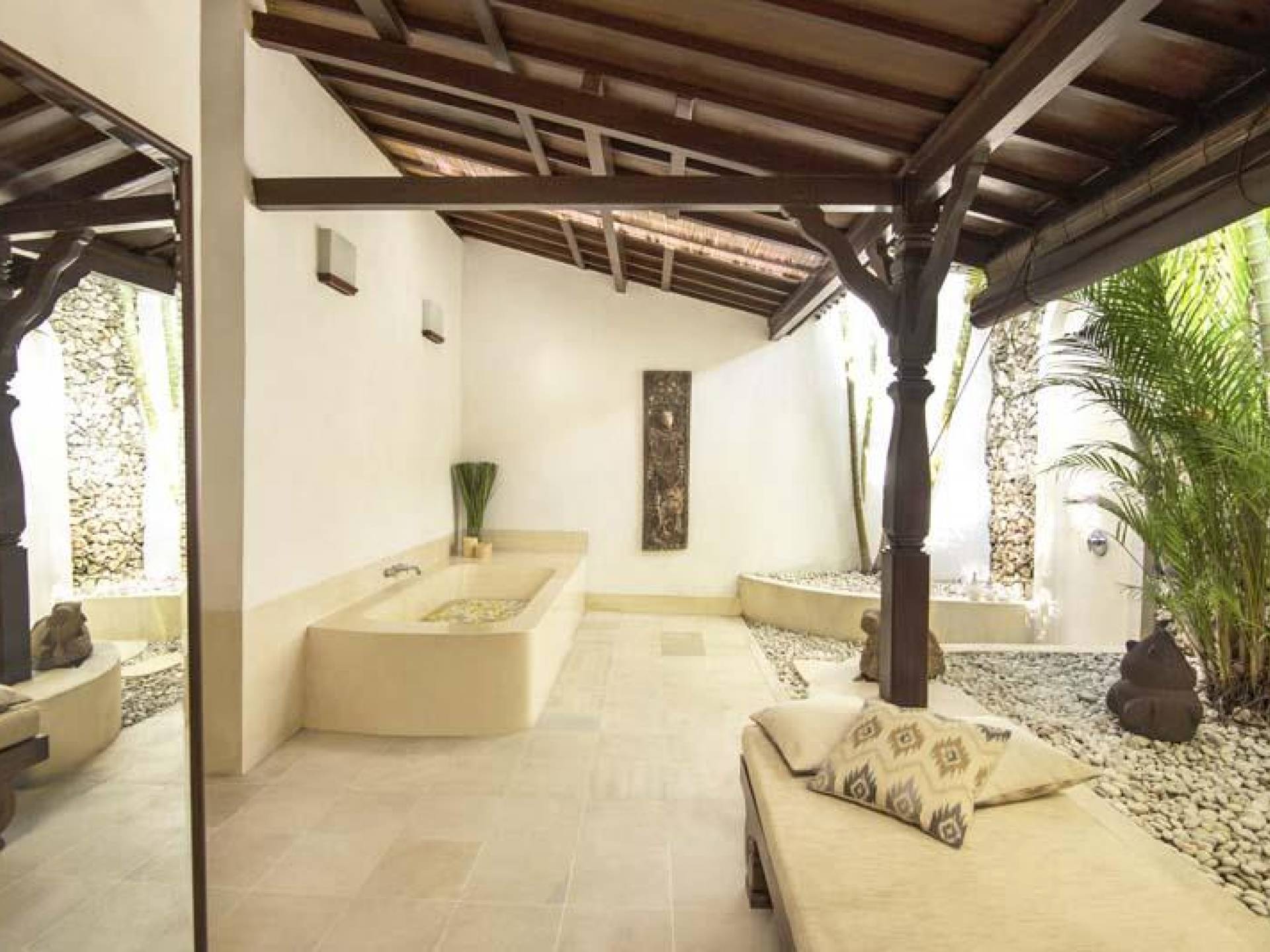 Une grande salle à manger contient une table à manger et des bancs en teck antique, un coin cuisine entièrement équipé avec une toile de fond de jungle ouverte, abritant une statue mystique. De plus, cette charmante villa de Seminyak à deux chambres dispose de salles de bains intérieures-extérieures exotiques de taille généreuse avec de profondes baignoires en terrazzo et des « chaise longues » en velours glamour pour compléter ce tableau impressionnant. Luxe, nature et ambiance balinaise se conjuguent pour votre plus grand plaisir.
