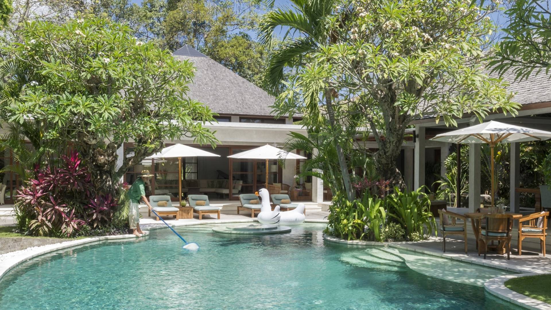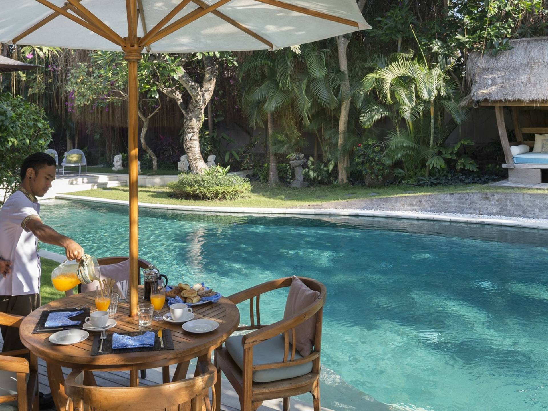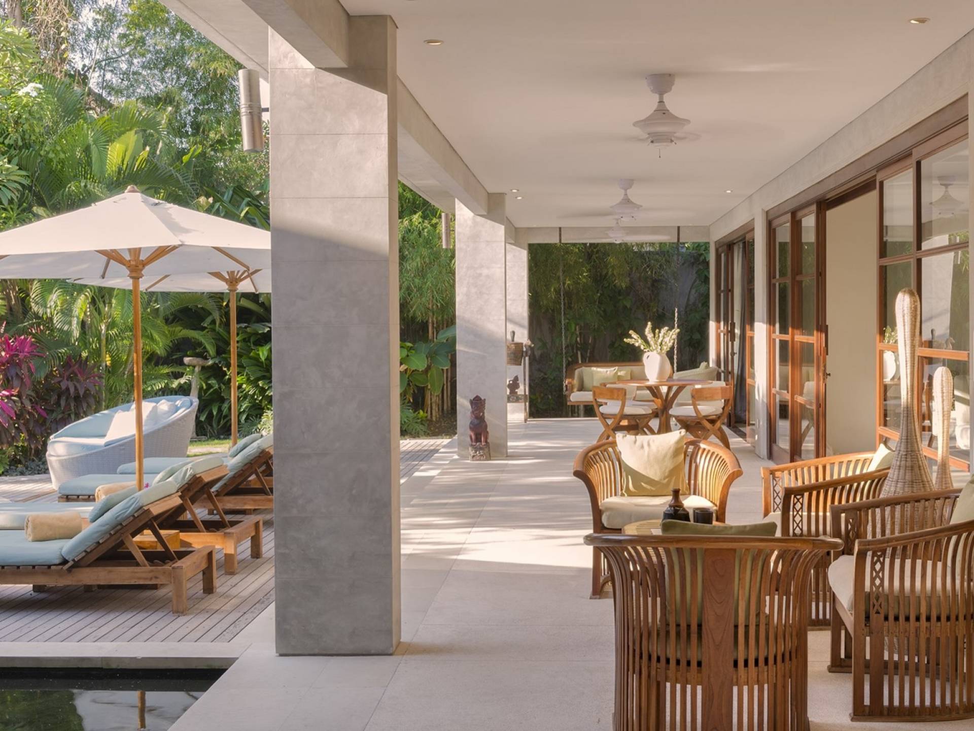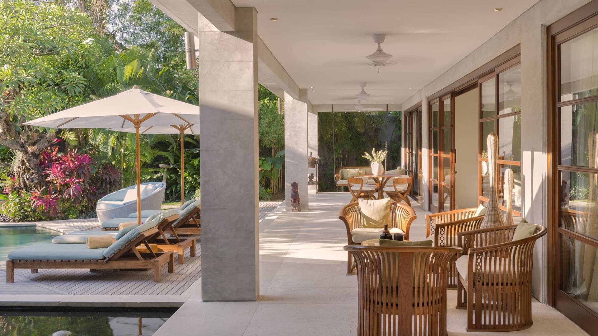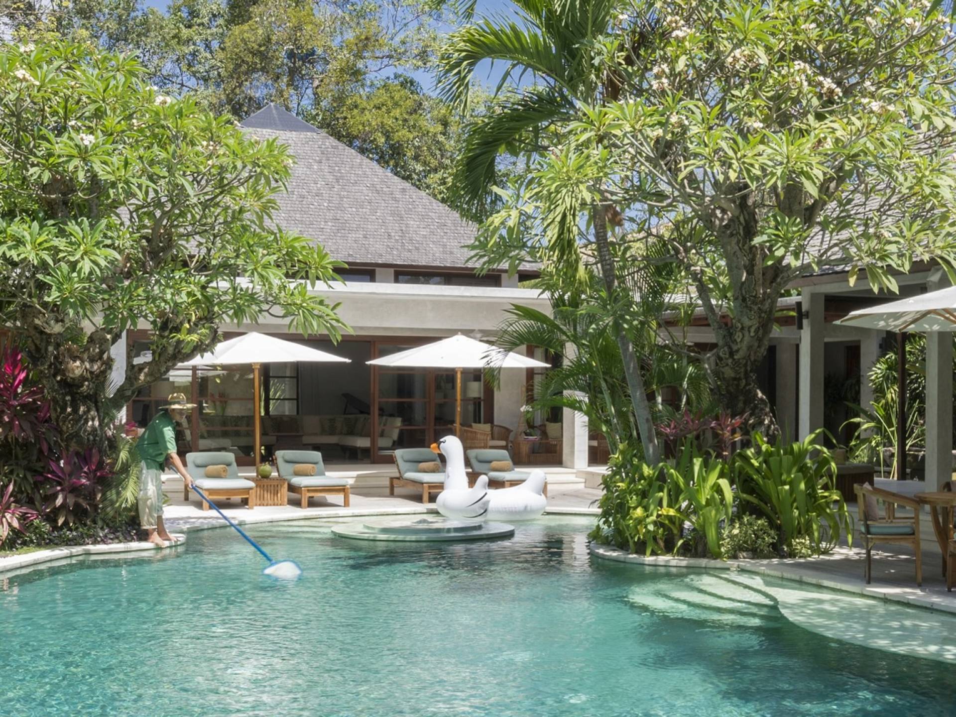 La suite au bord de la piscine est également située dans le pavillon principal. Cette chambre s'ouvre sur des terrasses couvertes face à la piscine d'un côté et à un étang de carpes koï de l'autre. Le lit king-size est doté de moustiquaires pour créer l'intimité d'un lit à baldaquin ou escamotable pour ouvrir l'espace. La salle de bain abrite des douches intérieures et extérieures et une immense baignoire.