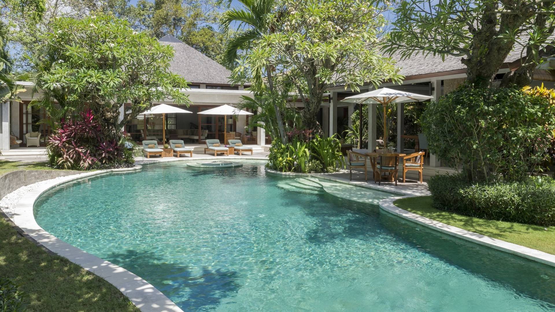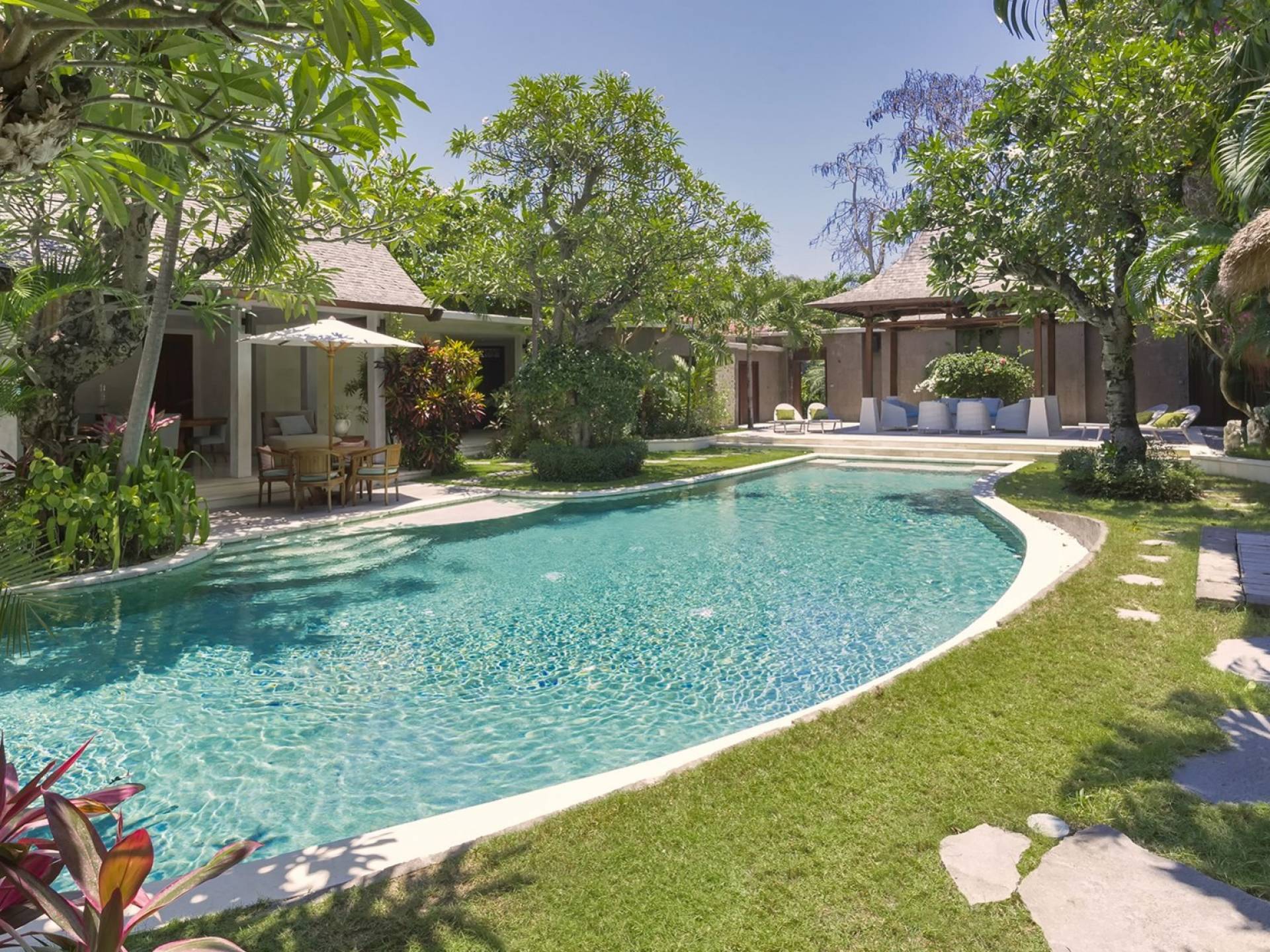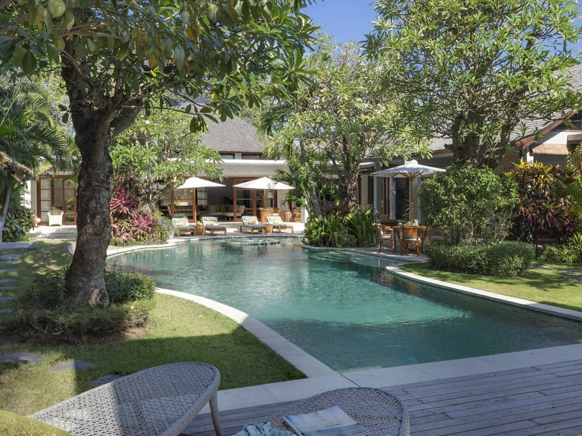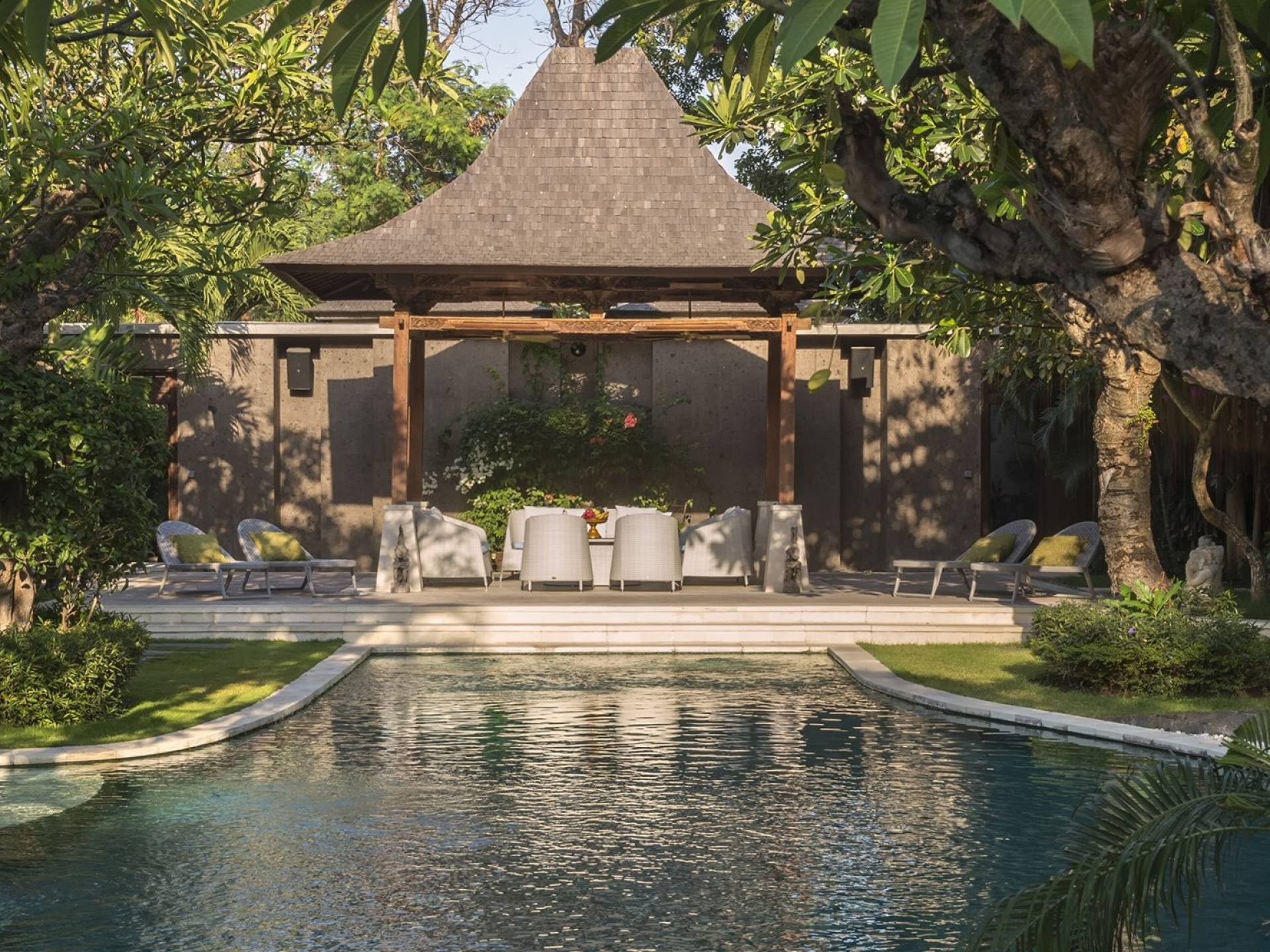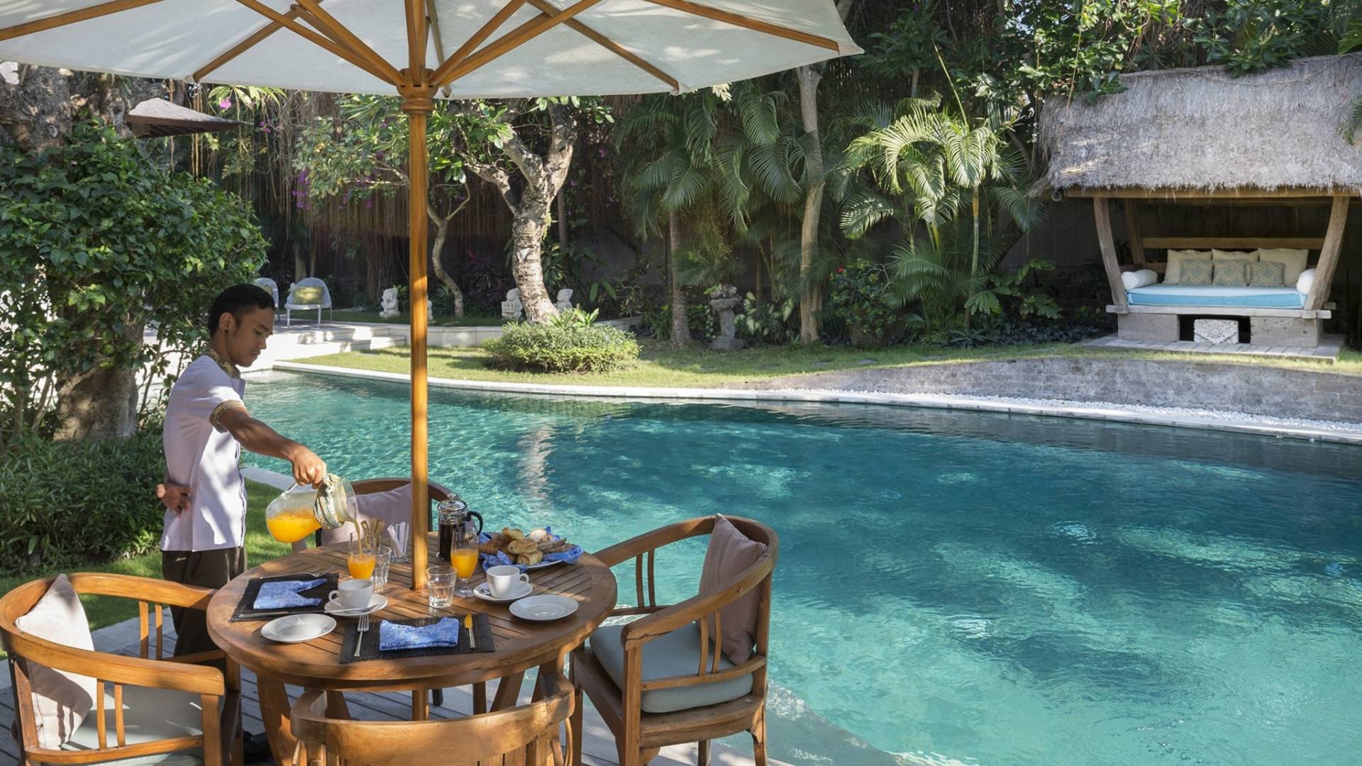 La suite au bord de la piscine est également située dans le pavillon principal. Cette chambre s'ouvre sur des terrasses couvertes face à la piscine d'un côté et à un étang de carpes koï de l'autre. Le lit king-size est doté de moustiquaires pour créer l'intimité d'un lit à baldaquin ou escamotable pour ouvrir l'espace. La salle de bain abrite des douches intérieures et extérieures et une immense baignoire.