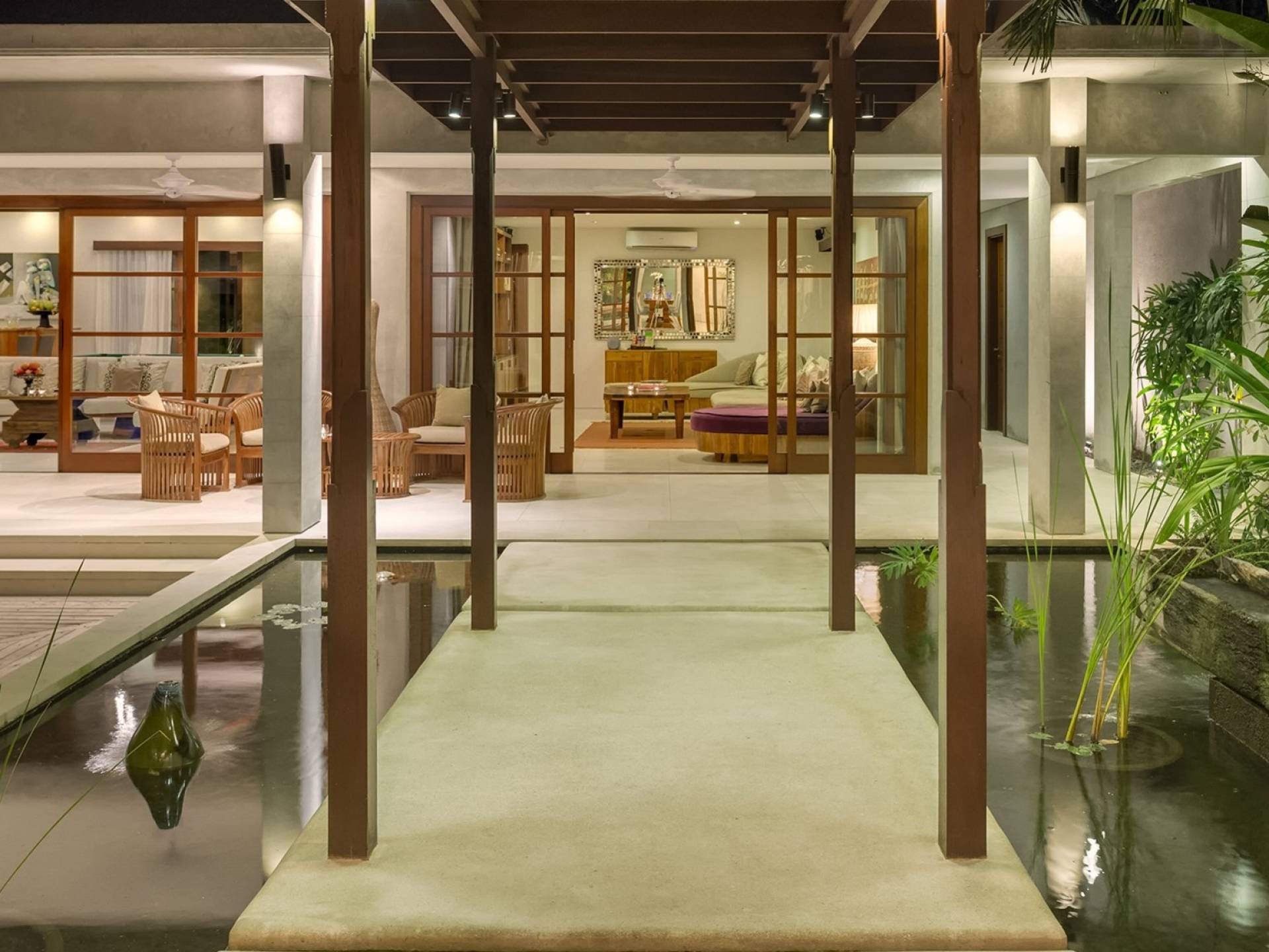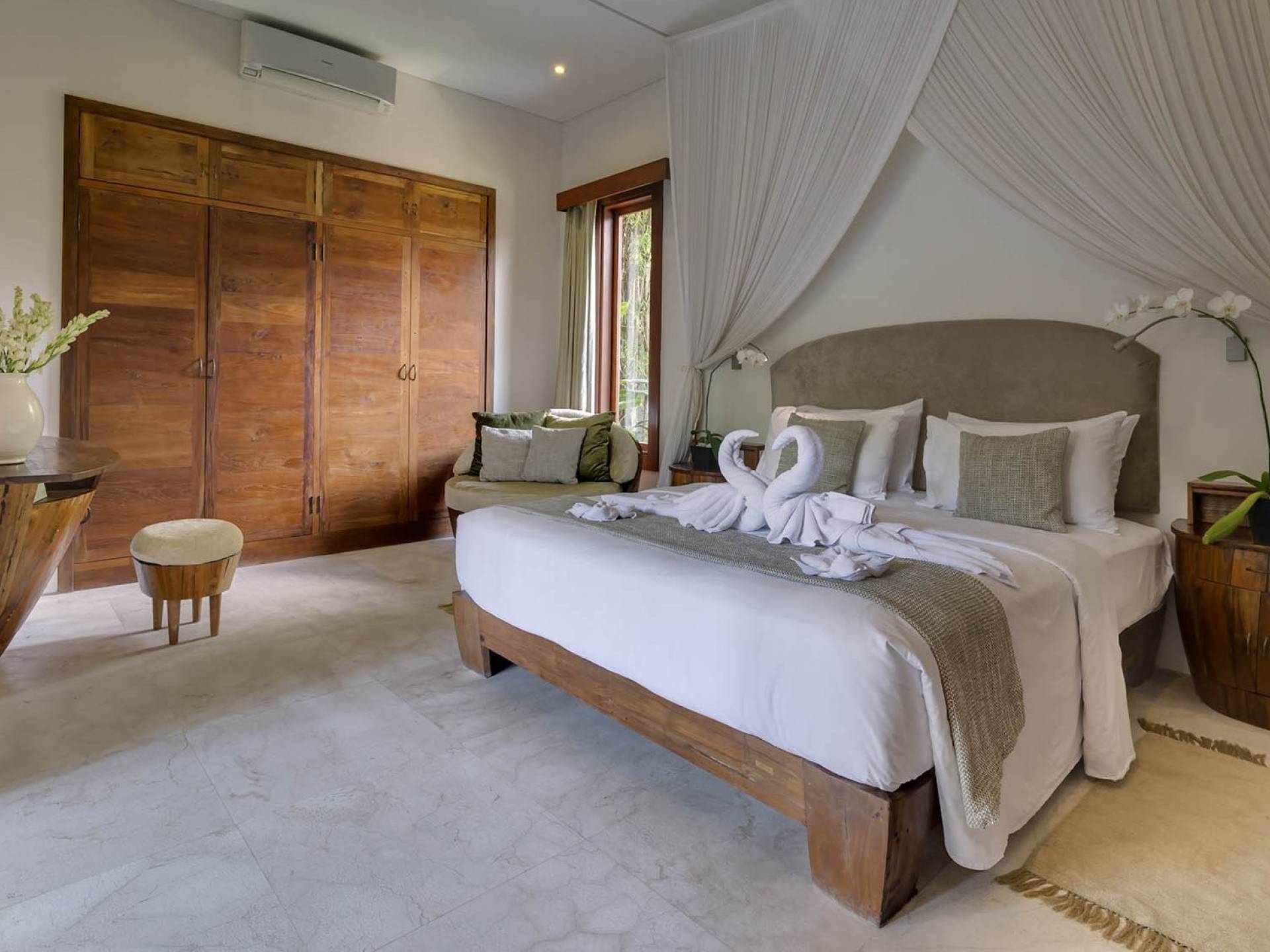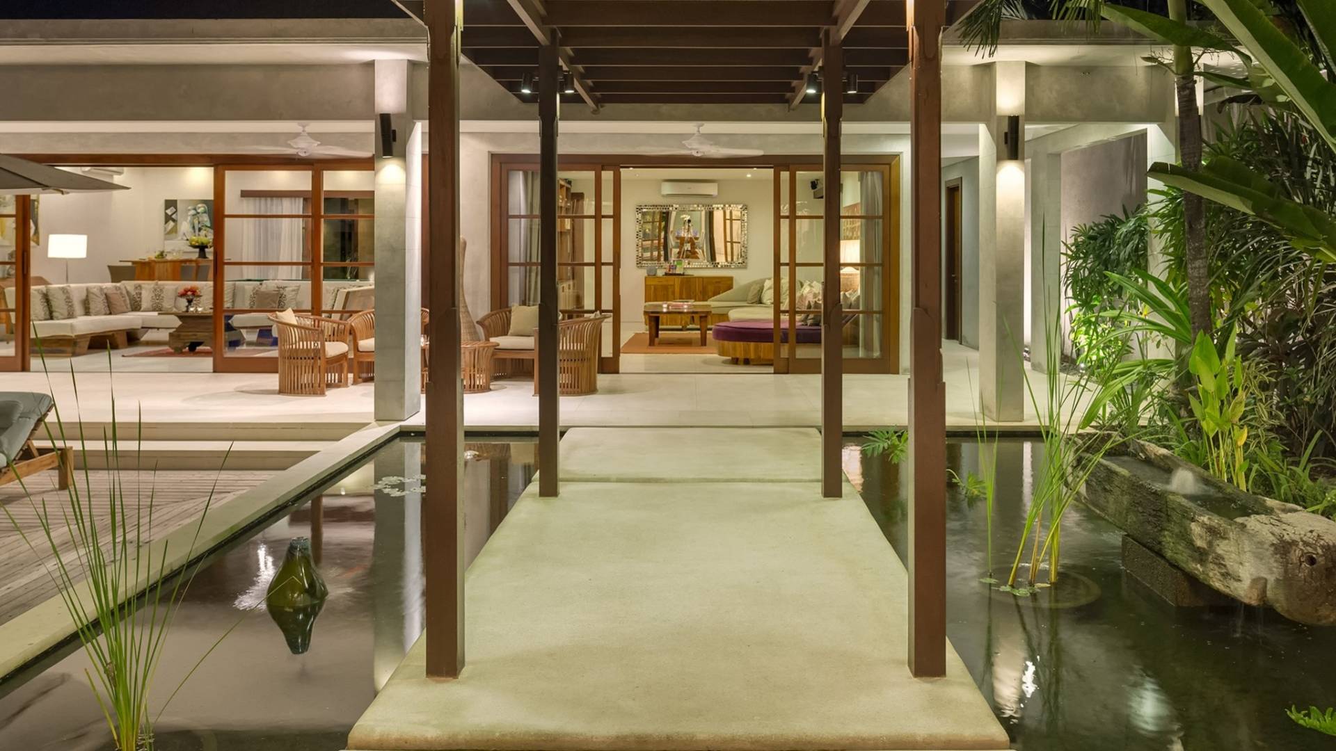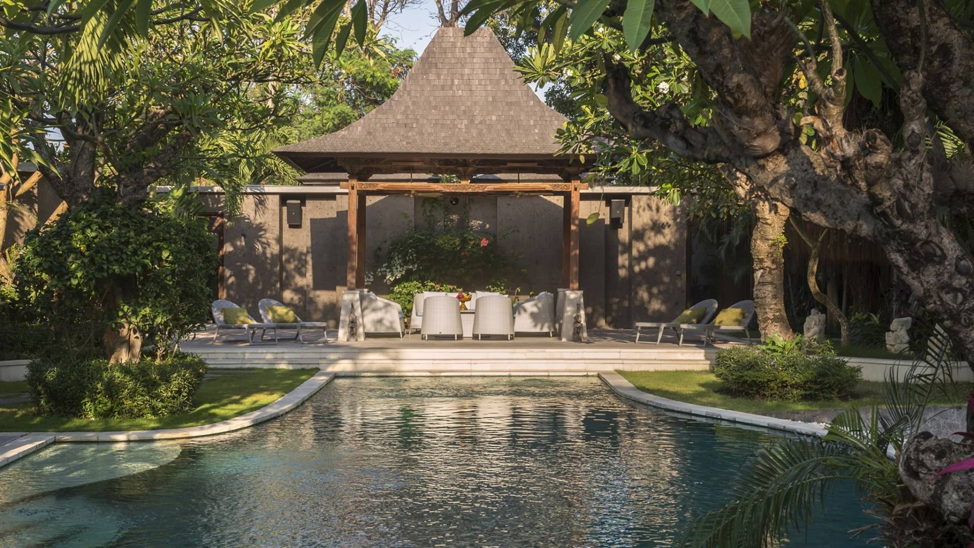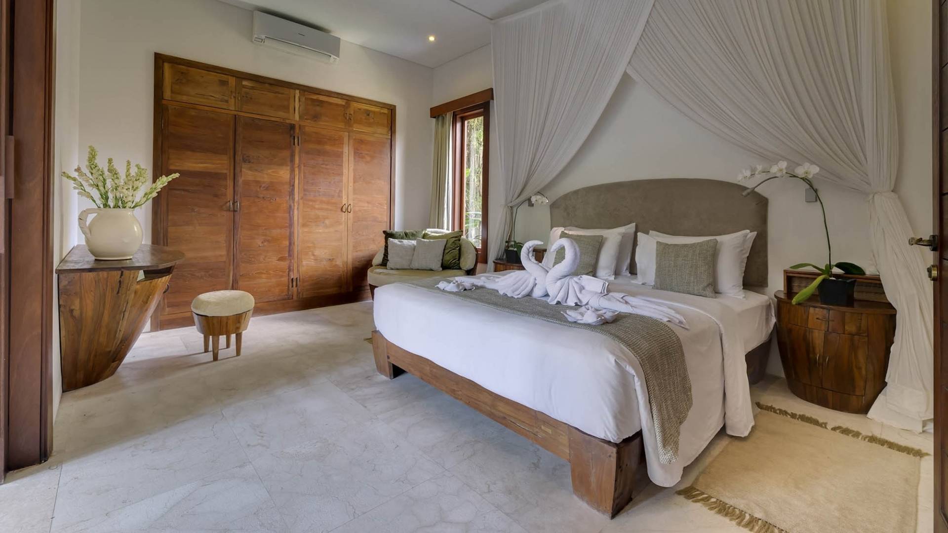 La suite au bord de la piscine est également située dans le pavillon principal. Cette chambre s'ouvre sur des terrasses couvertes face à la piscine d'un côté et à un étang de carpes koï de l'autre. Le lit king-size est doté de moustiquaires pour créer l'intimité d'un lit à baldaquin ou escamotable pour ouvrir l'espace. La salle de bain abrite des douches intérieures et extérieures et une immense baignoire.