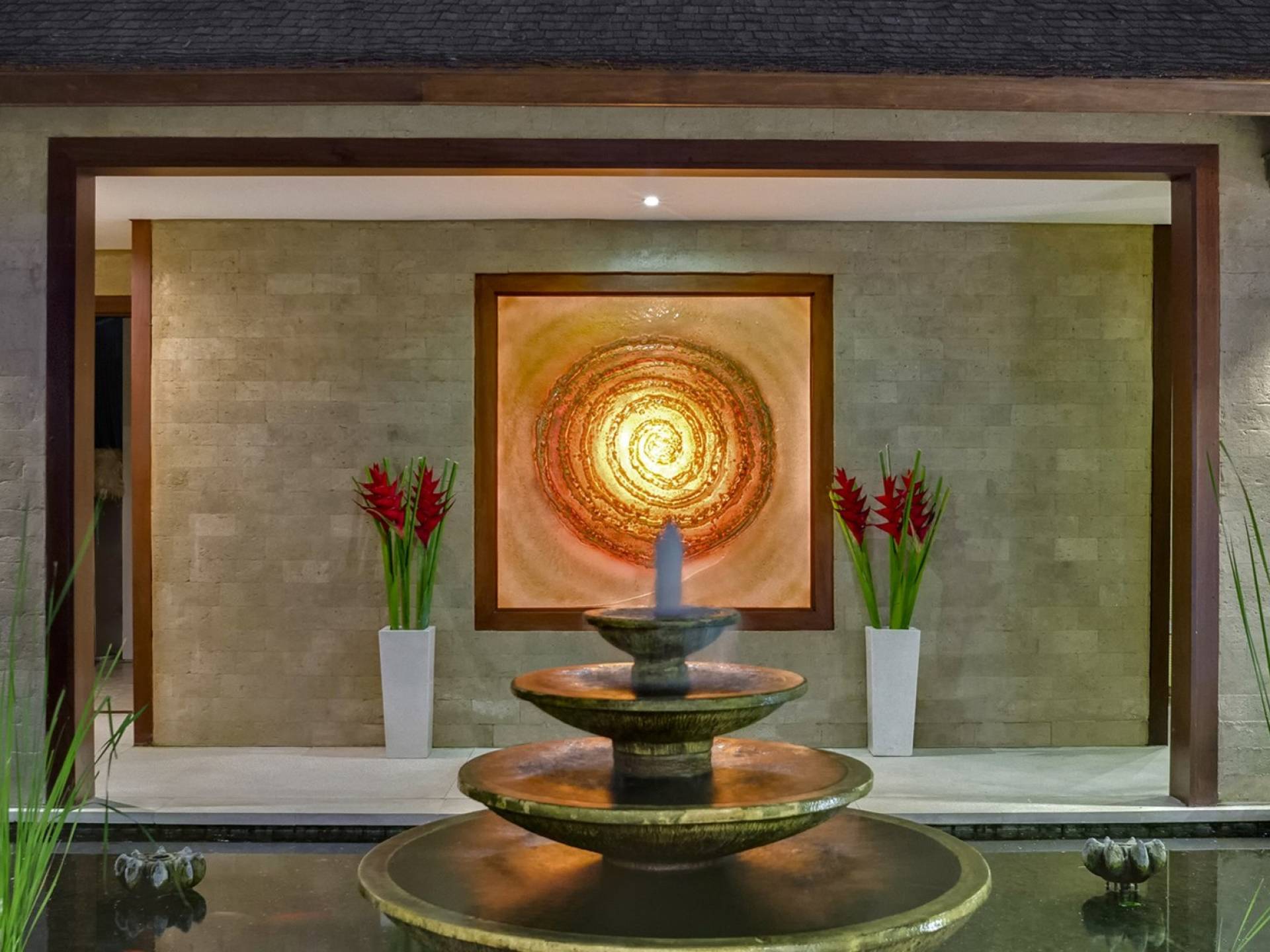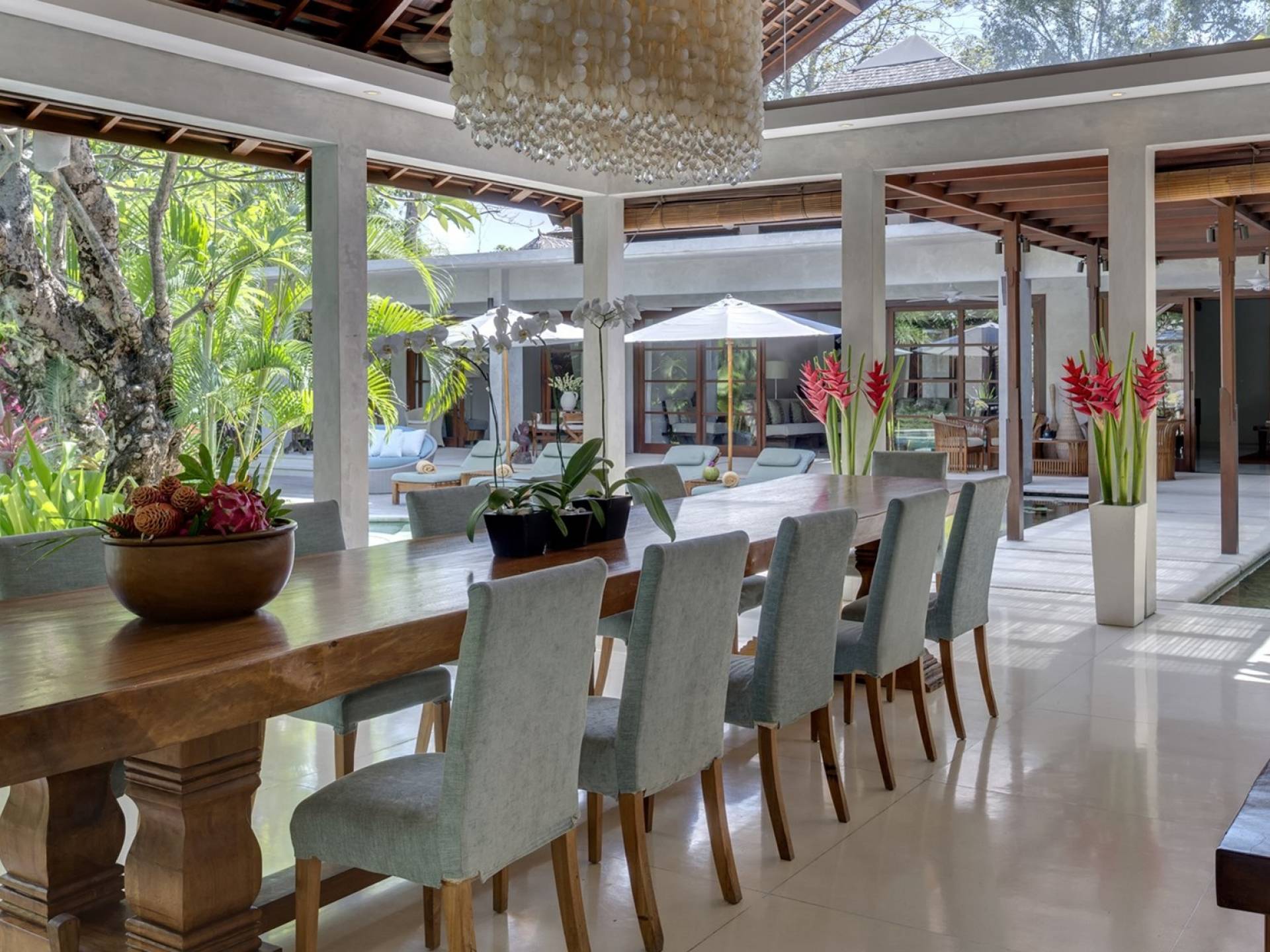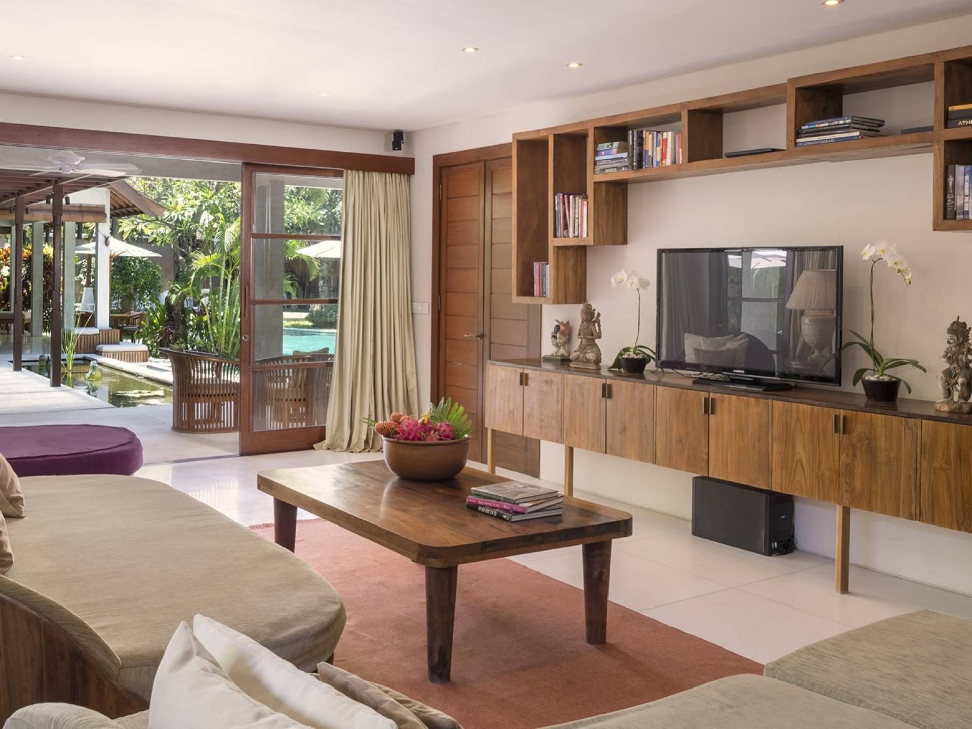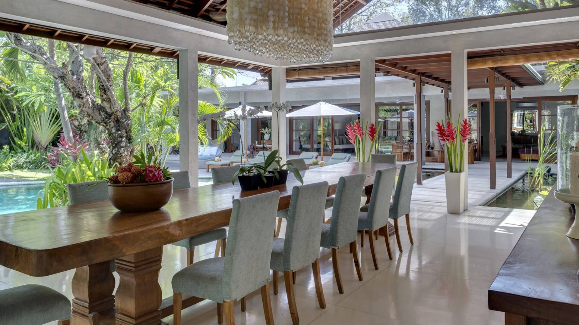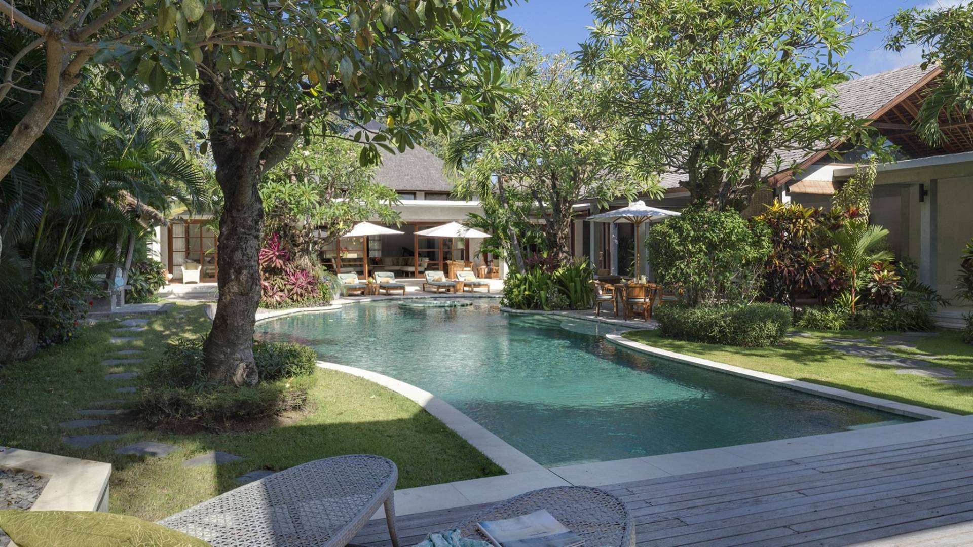 La suite au bord de la piscine est également située dans le pavillon principal. Cette chambre s'ouvre sur des terrasses couvertes face à la piscine d'un côté et à un étang de carpes koï de l'autre. Le lit king-size est doté de moustiquaires pour créer l'intimité d'un lit à baldaquin ou escamotable pour ouvrir l'espace. La salle de bain abrite des douches intérieures et extérieures et une immense baignoire.