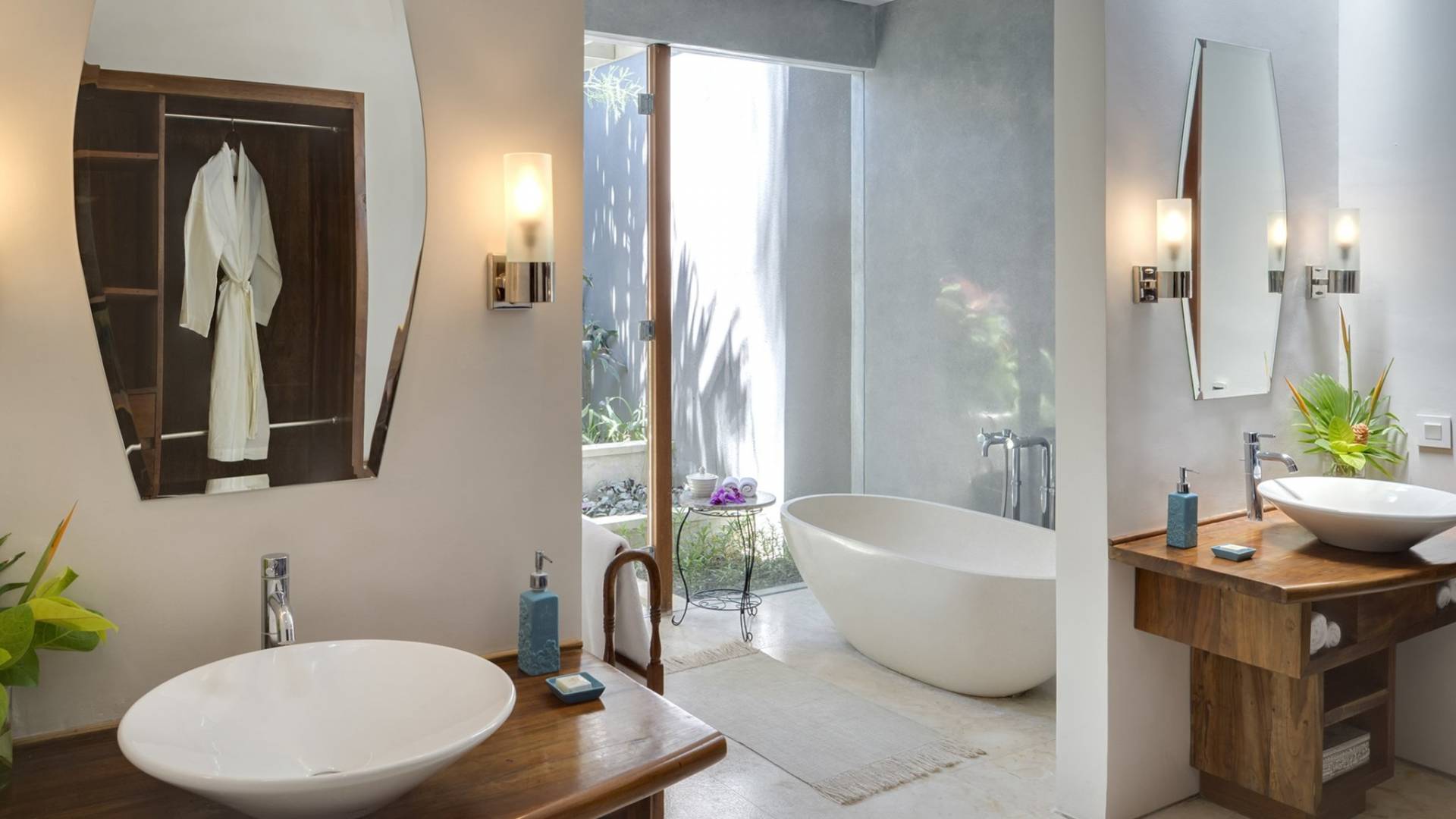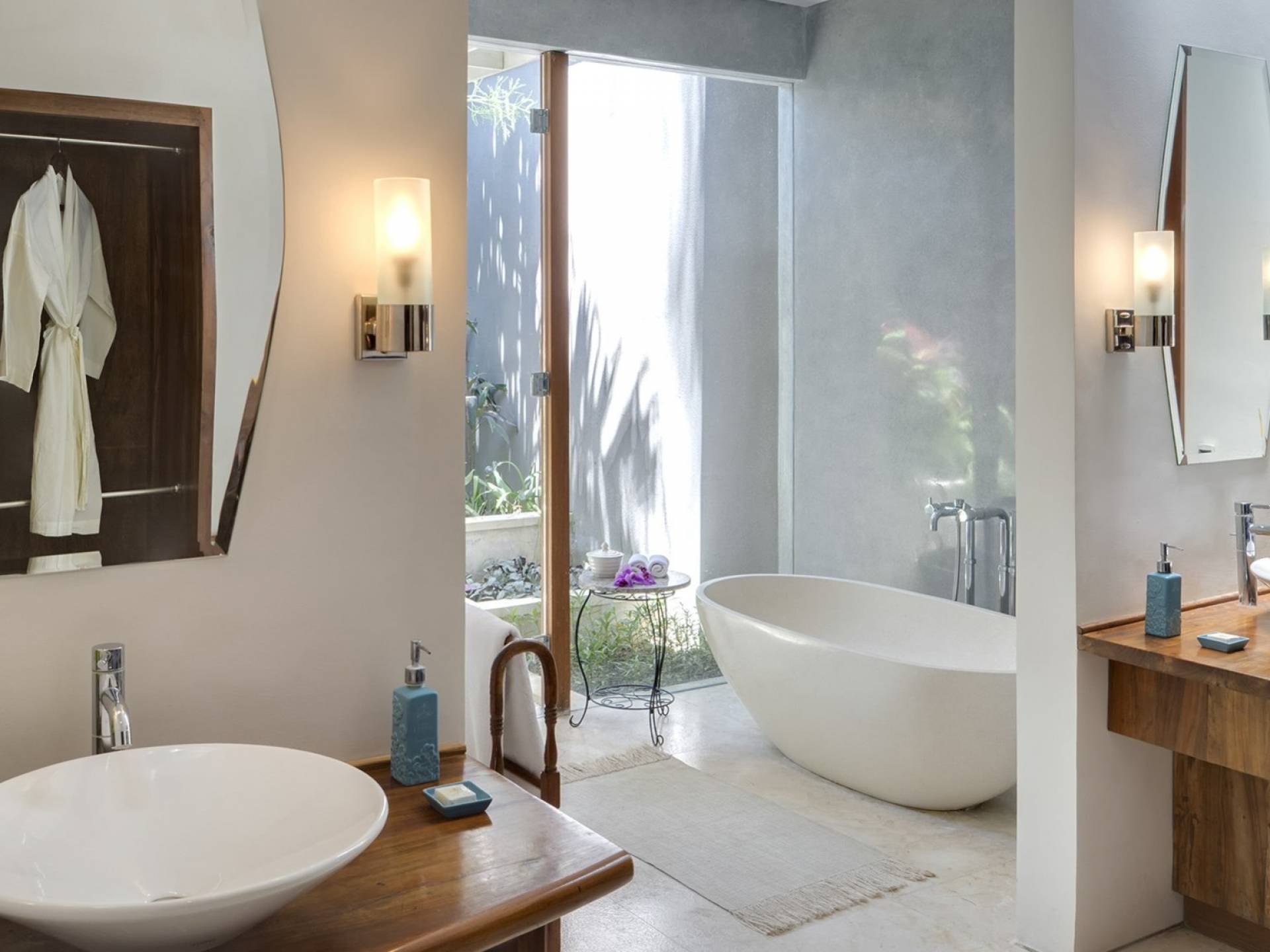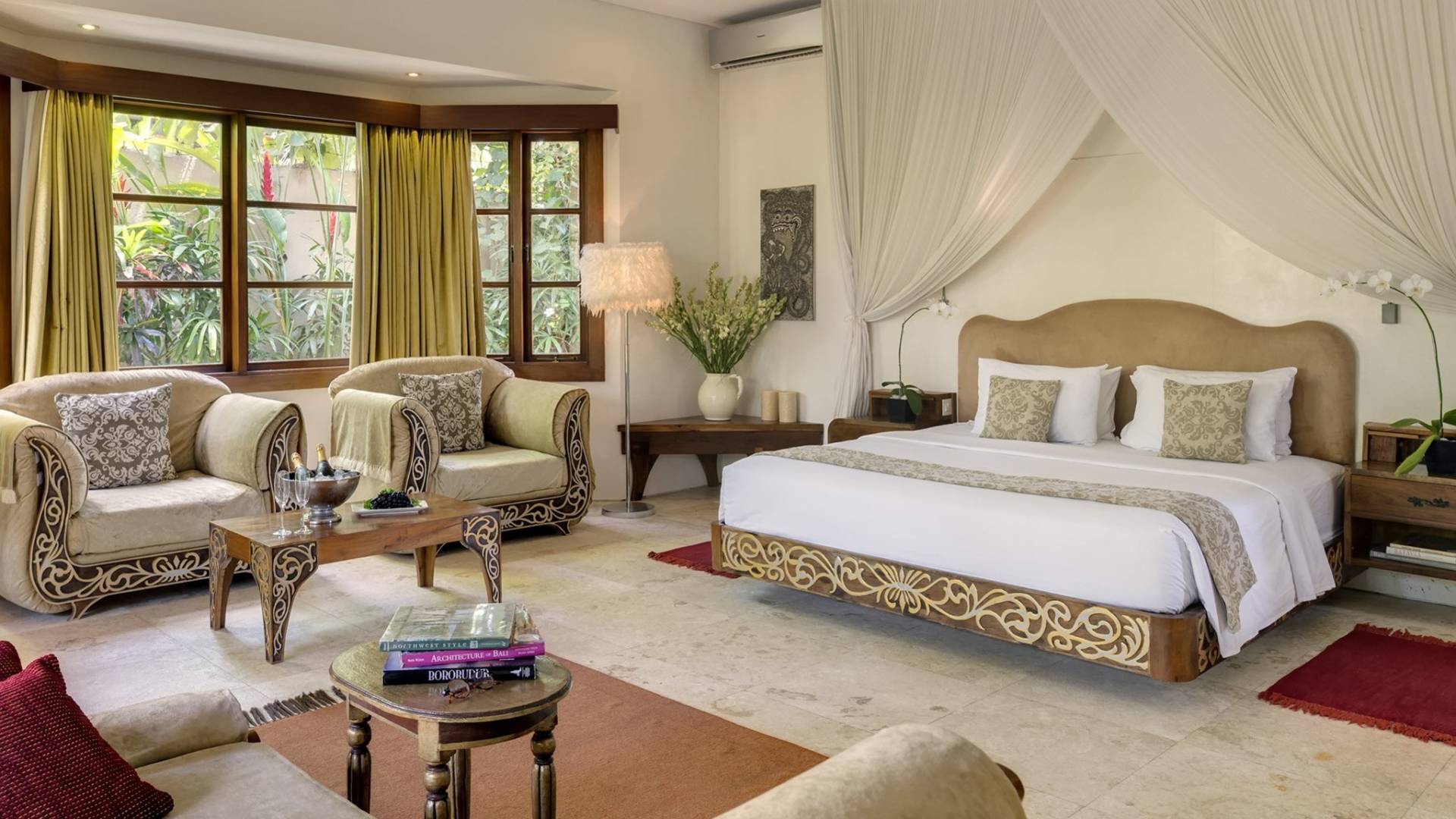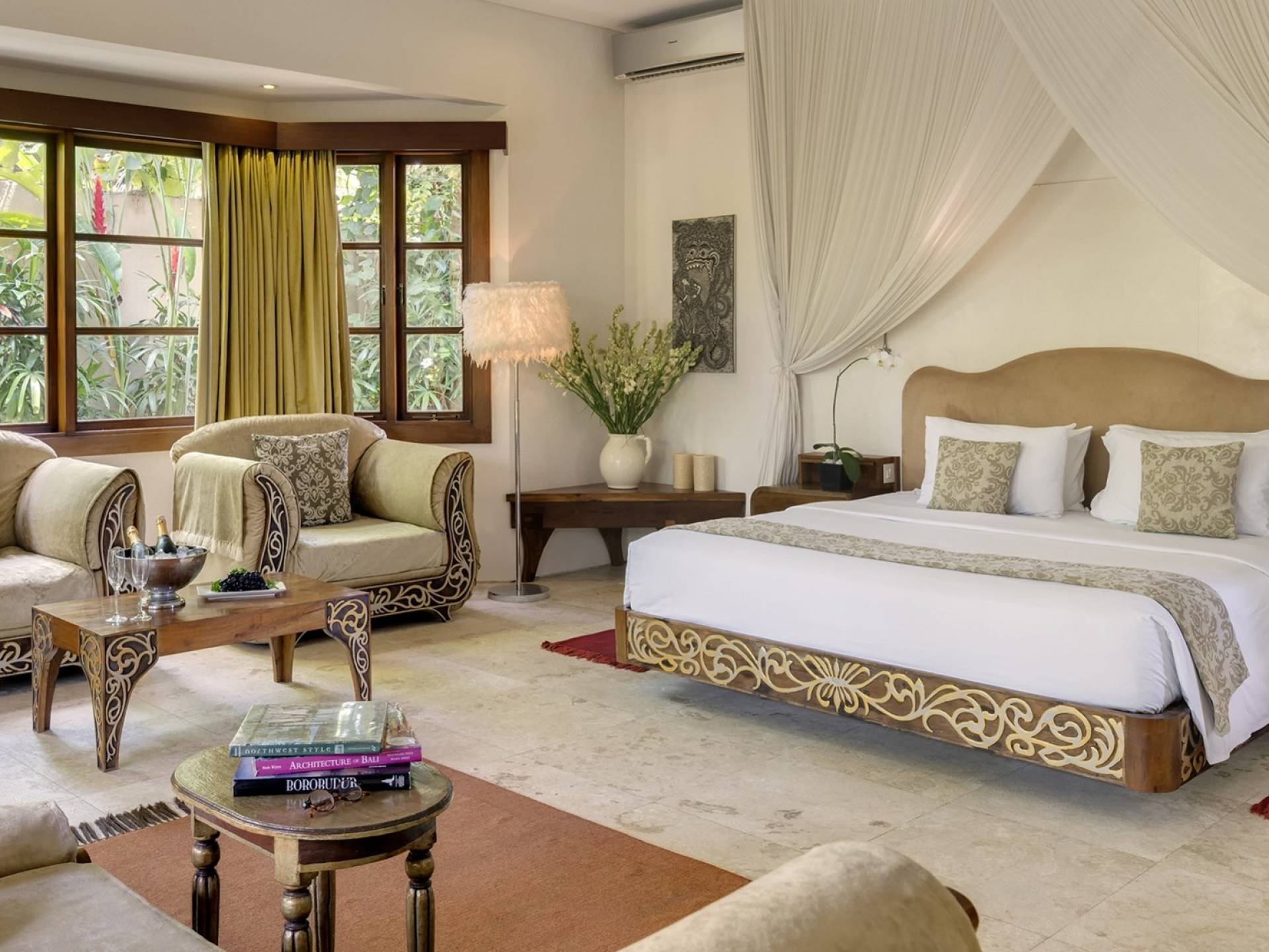 La Suite Nature se trouve également dans le pavillon principal, équipé également d'un lit king-size, nommé pour sa vue sur les grands arbres et le jardin bien entretenu. Parfait pour une famille avec de jeunes enfants, car une porte relie la grande salle de bain du jardin à la salle de bain principale. Une cuisine de majordome cachée, avec maxi-bar, sert ce pavillon.