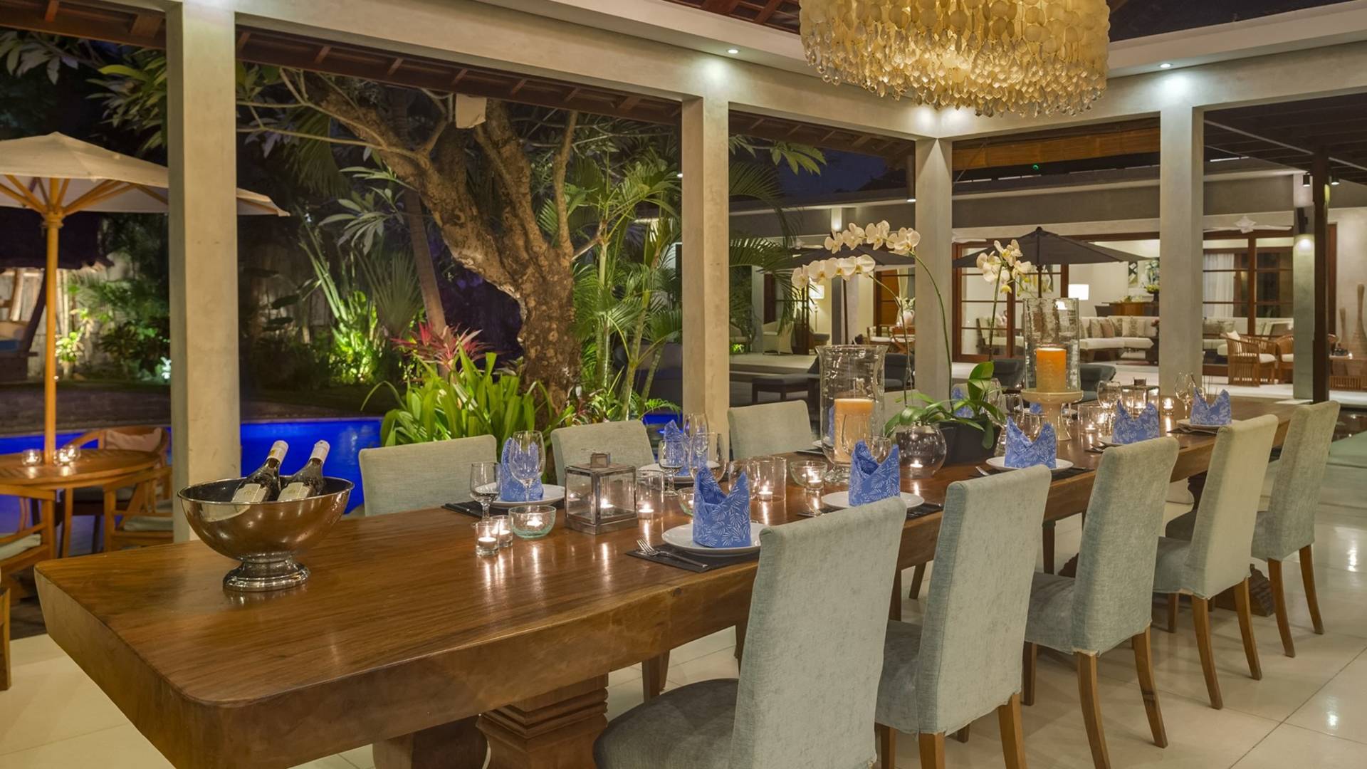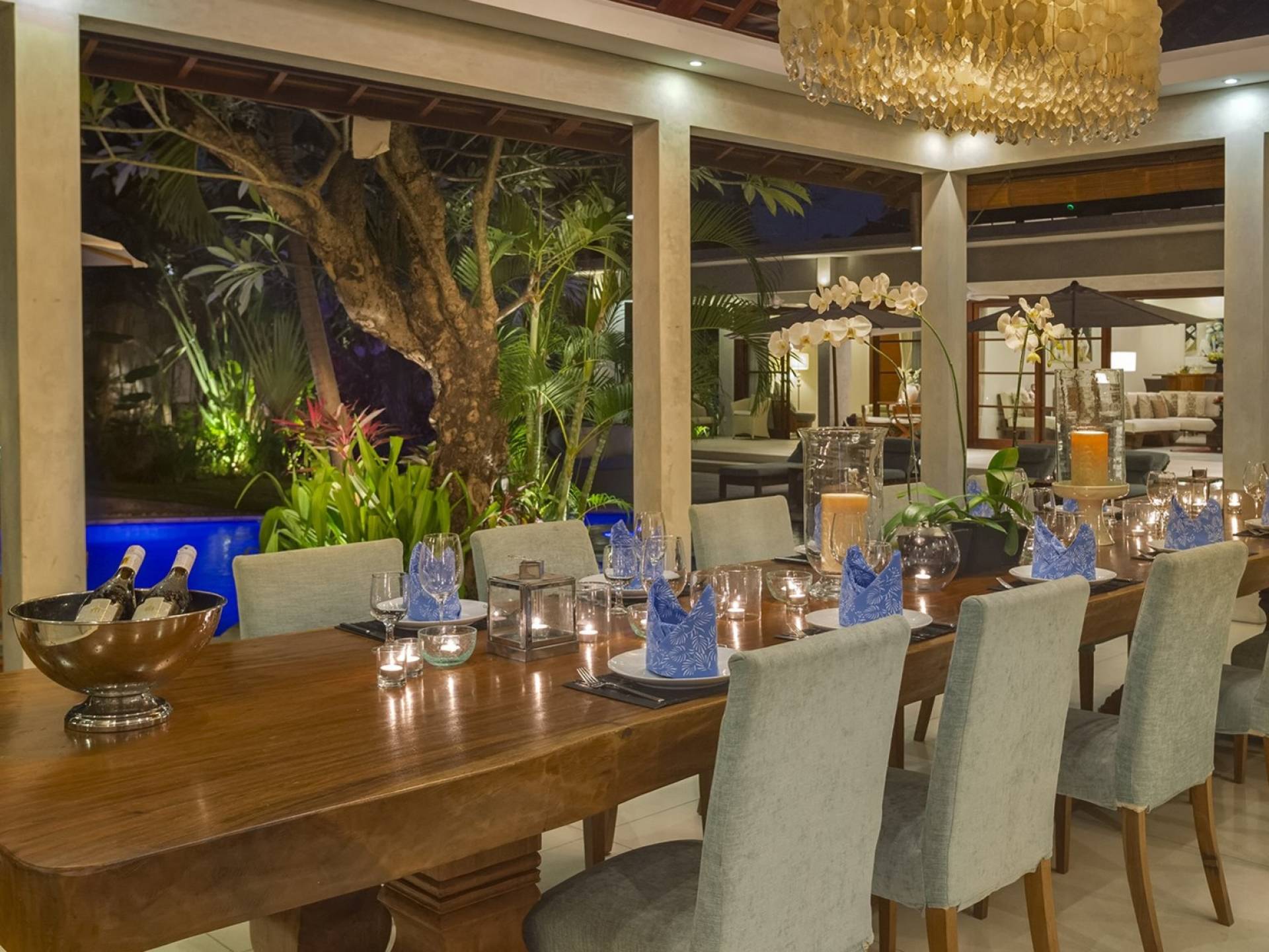Les suites Blue Ocean et Rose Garden tirent leur nom de leurs douces combinaisons de couleurs bleu et rose dans un pavillon discrètement masqué par un mur de jardin. Le pavillon des invités comprend des suites à deux chambres, chacune avec sa propre entrée, des lits pouvant être configurés en lit double king-size ou en lits jumeaux. De délicieuses salles de bains avec dressings, des vanités doubles, de grandes baignoires, des murs de verre et des douches intérieures/extérieures s'ouvrant sur des jardins de la cour complètent le paysage. Un lit enfant peut être ajouté à chaque suite du pavillon invités.