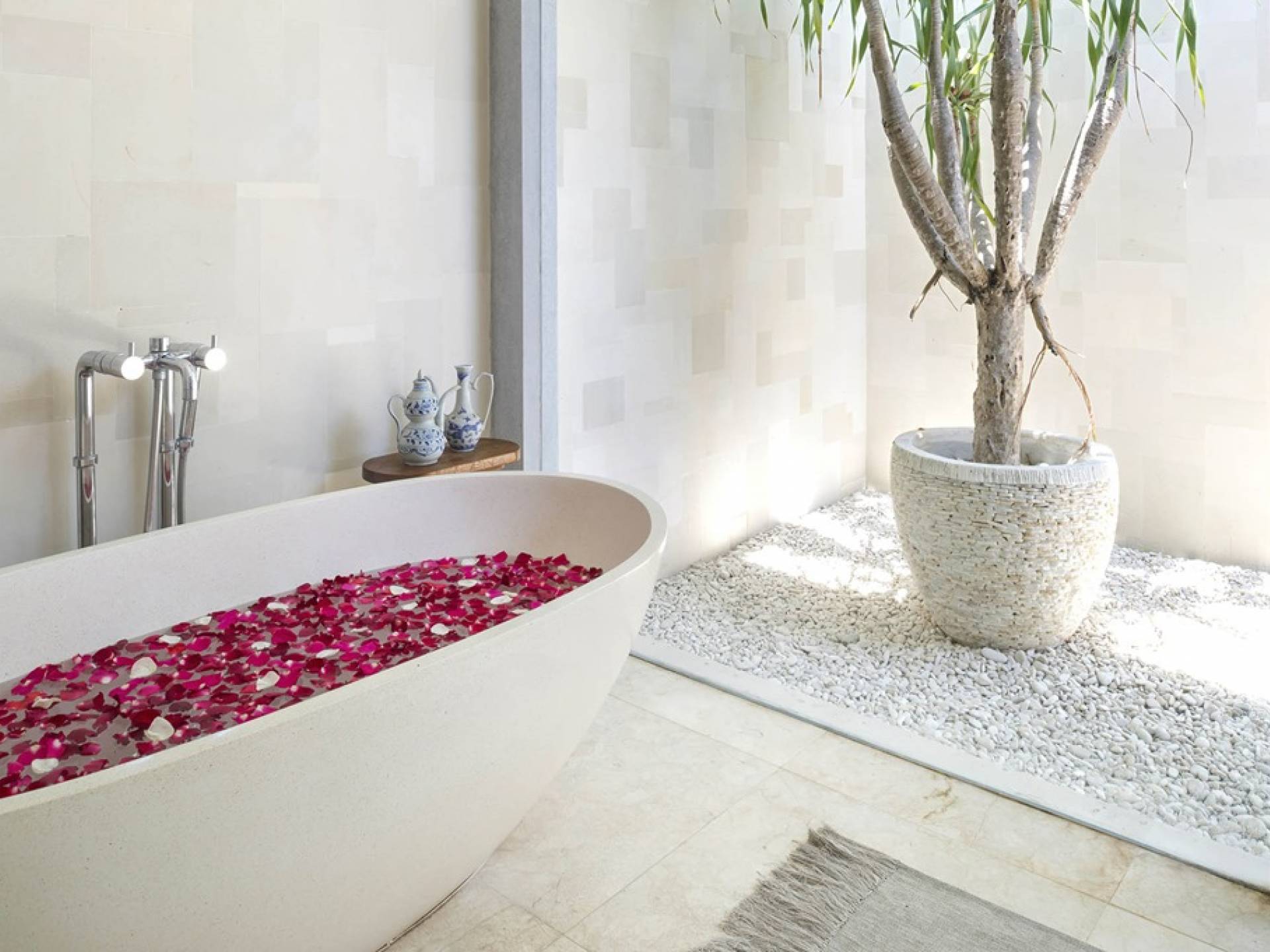 La suite Bau Bau Master est idéale pour une intimité totale. La chambre principale dispose d'un lit king-size impressionnant, de fauteuils jumeaux et d'un canapé, le tout posé sur un sol en marbre roulé, s'ouvrant sur un jardin clos privé avec des sièges, aménagé autour d'un imposant arbre tropical Bau-Bau. Un ou même deux lits enfants peuvent être ajoutés dans la chambre. Un deuxième jardin clos de l'immense salle de bain attenante - un espace décadent avec dressing, pouf, baignoire en pierre et douches intérieure et extérieure - complète le paysage. Cette incroyable retraite de maîtres a accueilli des oligarques, des princesses et même un ange de Victoria's Secret !