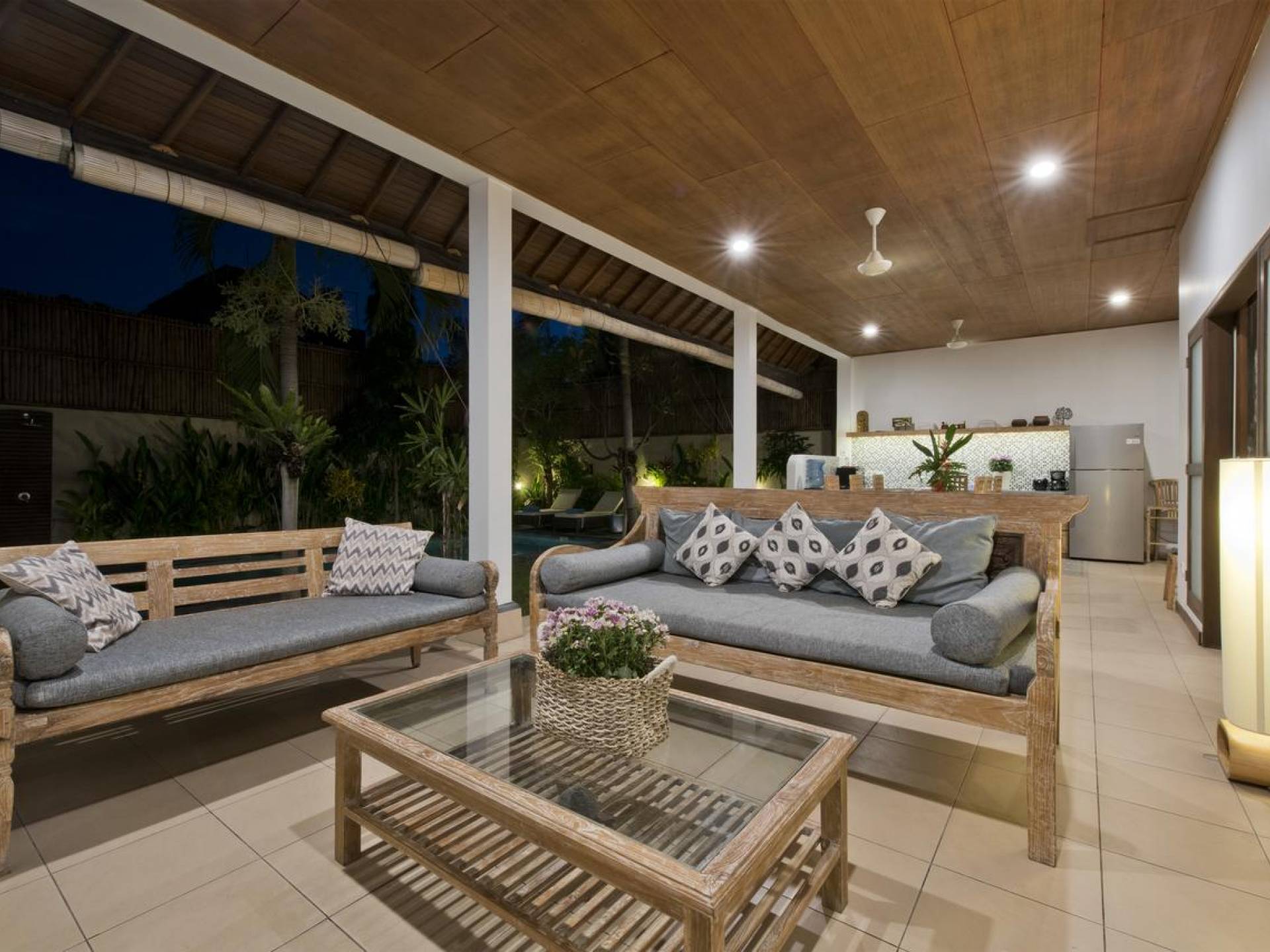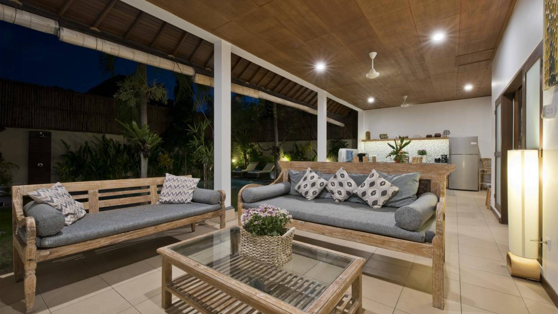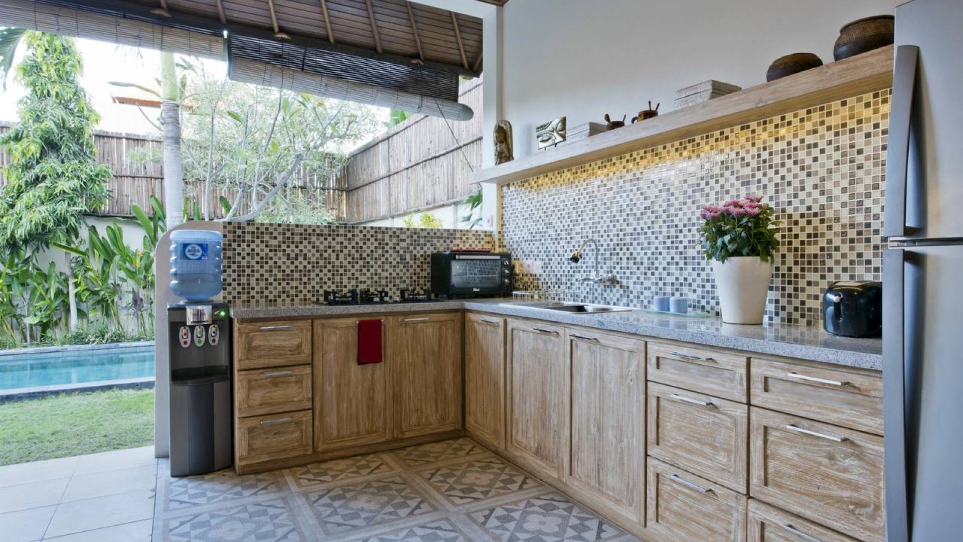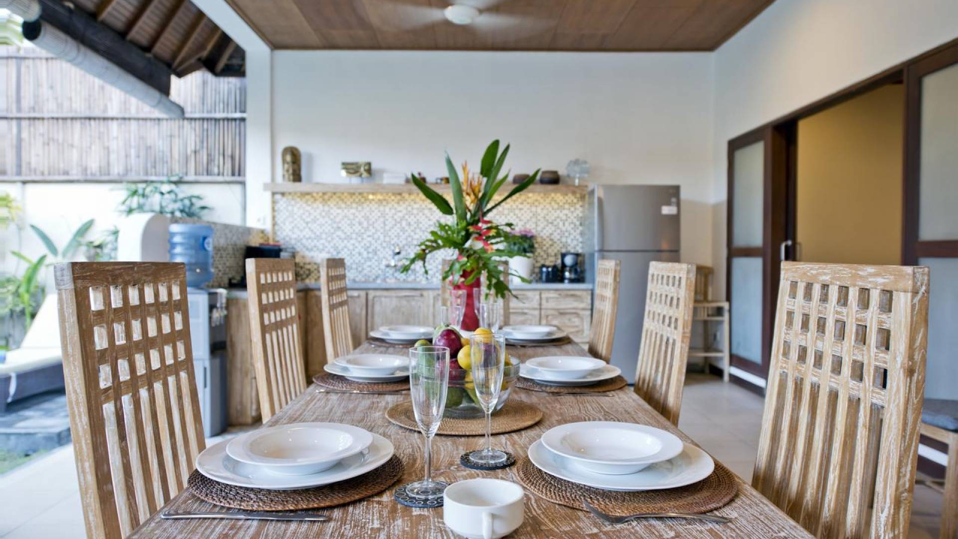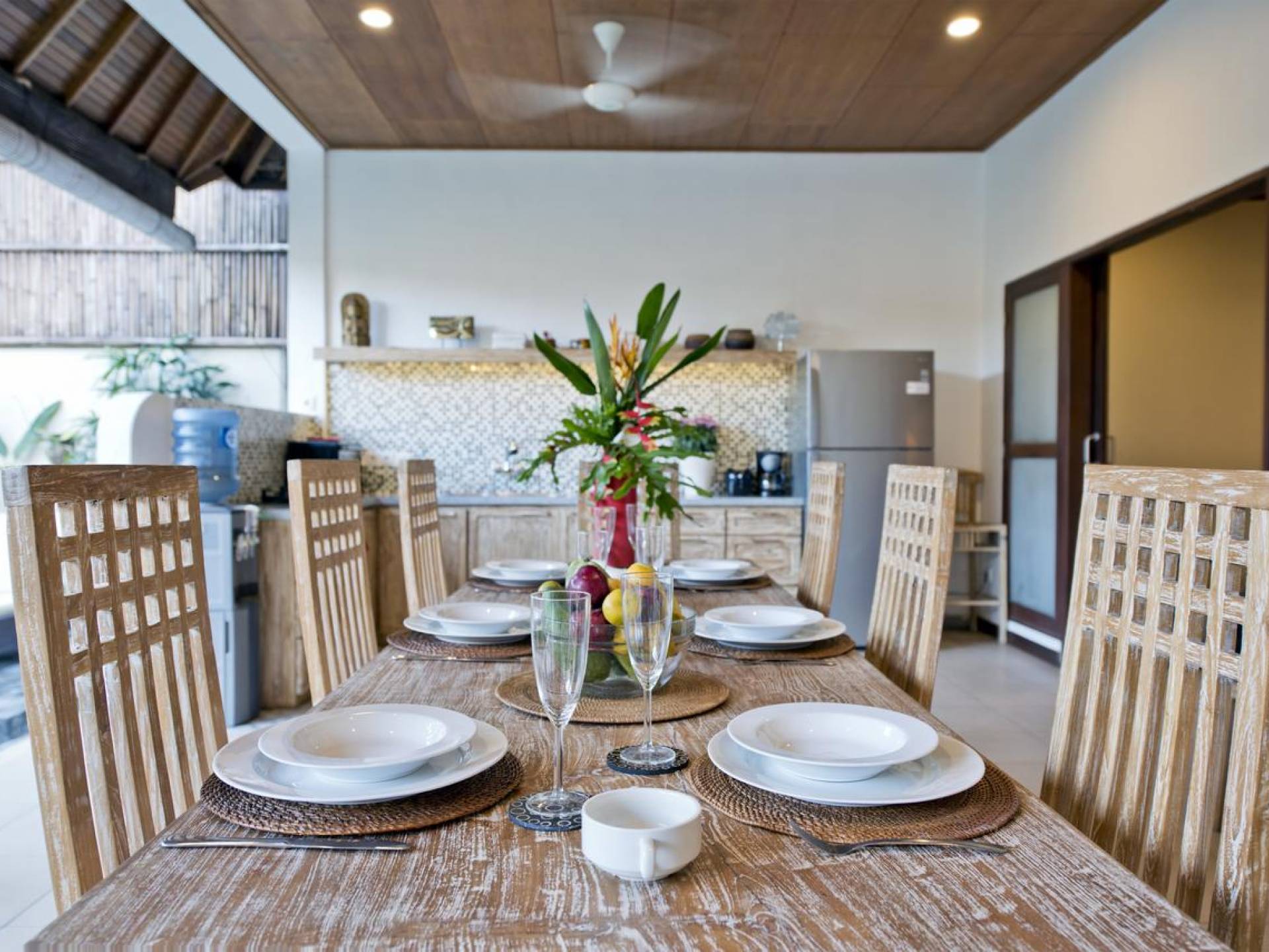 La spacieuse villa de 3 chambres dispose d'un salon et d'un coin repas décloisonnés, décorés dans un style indonésien. Une cuisine entièrement équipée offre toutes les caractéristiques occidentales pour rendre votre séjour aussi confortable que possible. Le salon dispose d'une grande table à manger pour 8 personnes assises et de canapés de style balinais devant la télévision à écran plat avec chaînes internationales, un lecteur DVD et des ventilateurs de plafond.