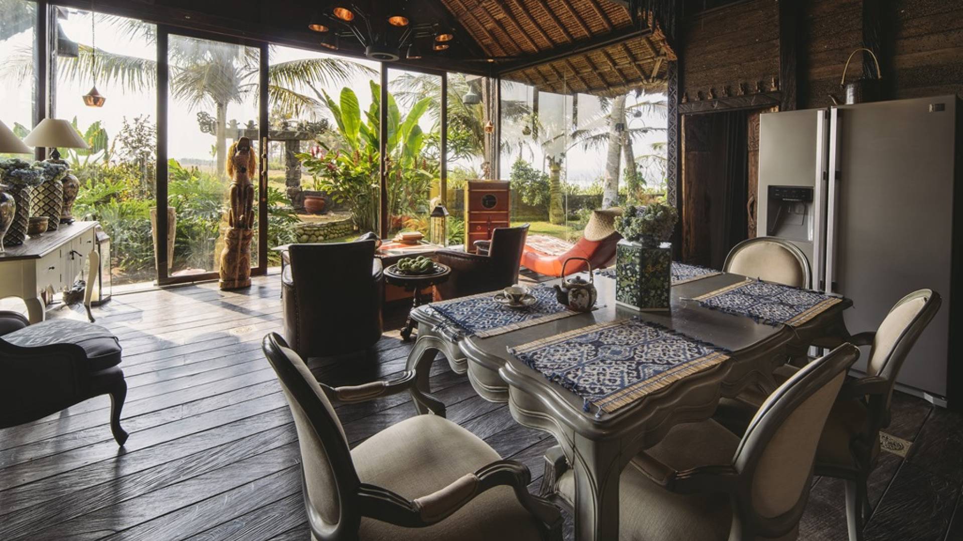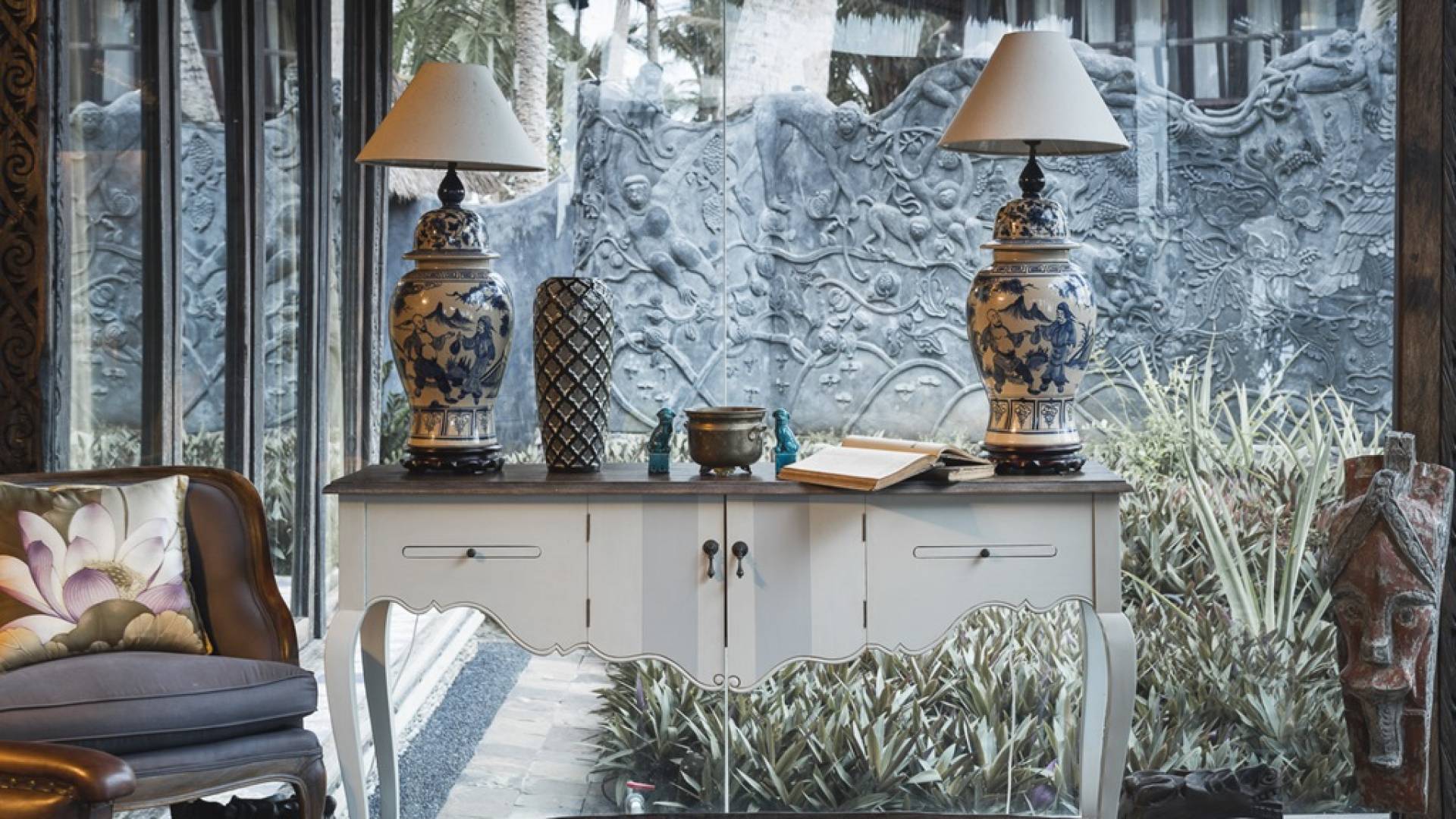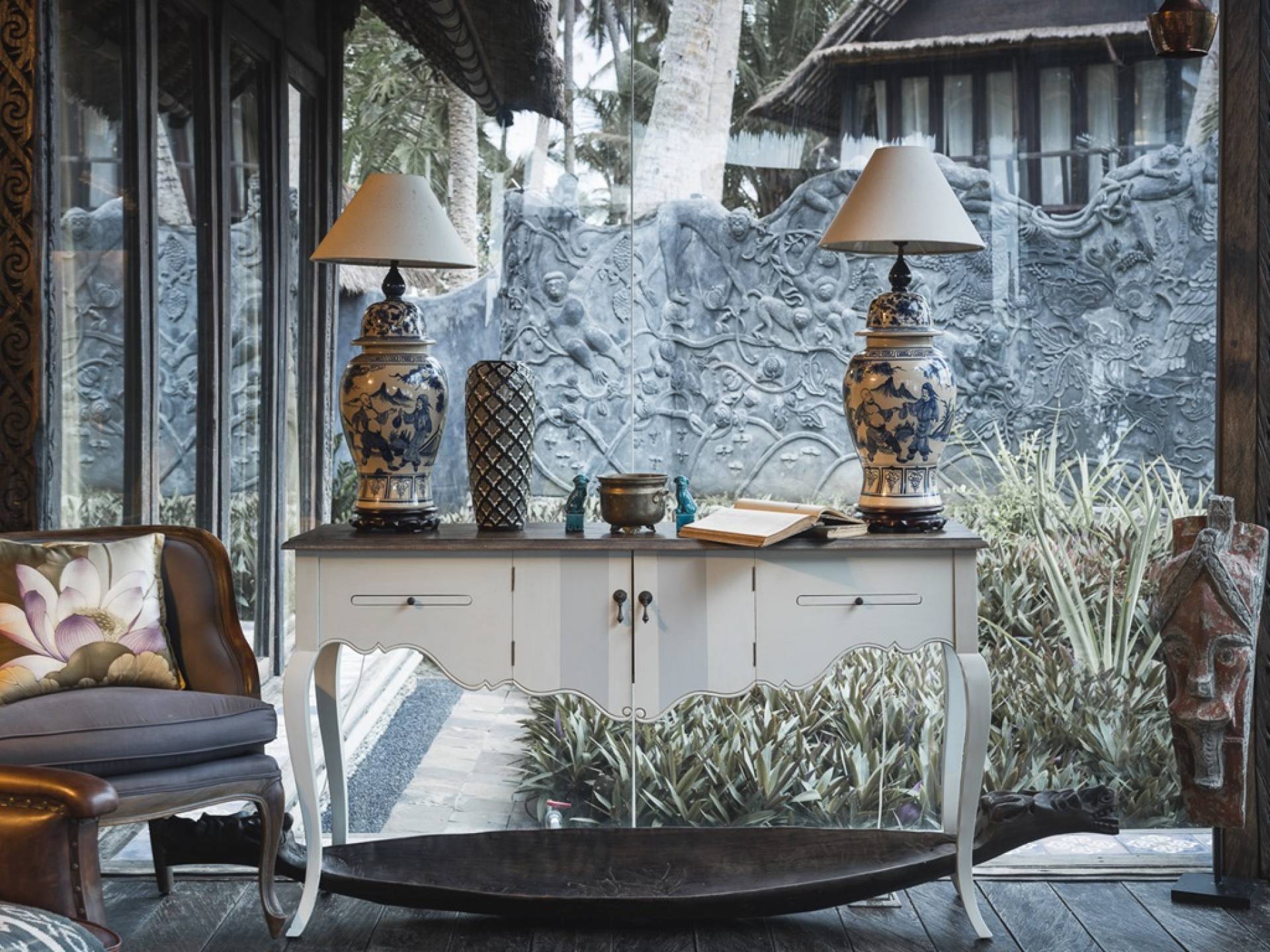 L'intérieur de la Villa Laut Bali combine des meubles design et des détails de différentes époques et pays, de nombreux objets uniques, créés d'après les croquis des propriétaires - architectes. Commodes Félix Monge, lustres fluides Terzani, un coin repas, Louis 15, lampe en porcelaine de Chine, antique, lustre bateau design, créé par les architectes, panneaux sculptés et portes collectés dans différentes îles d'Indonésie, beaucoup de beaux objets, tout ceci est une histoire d'une belle histoire de voyage et de romance.