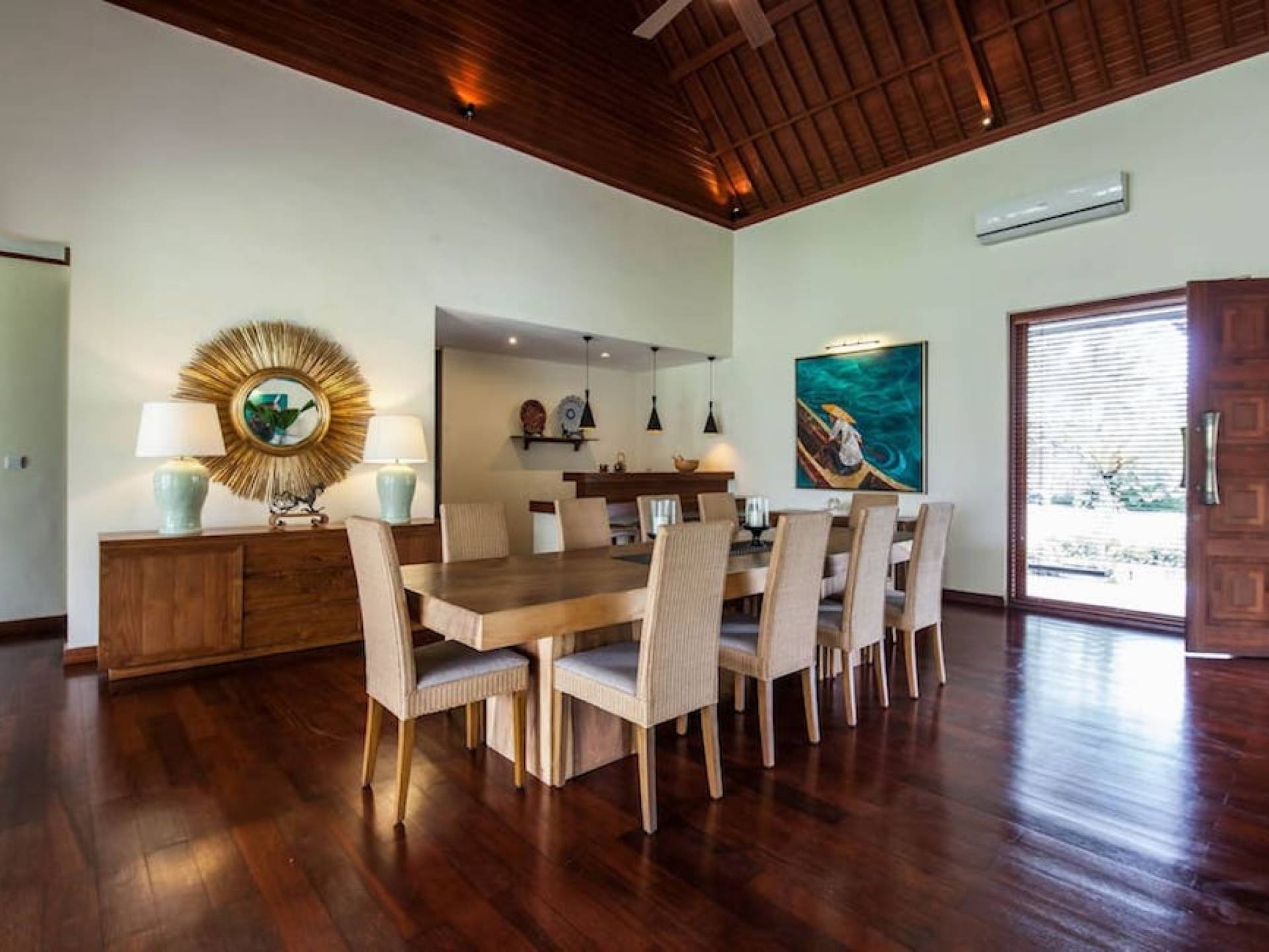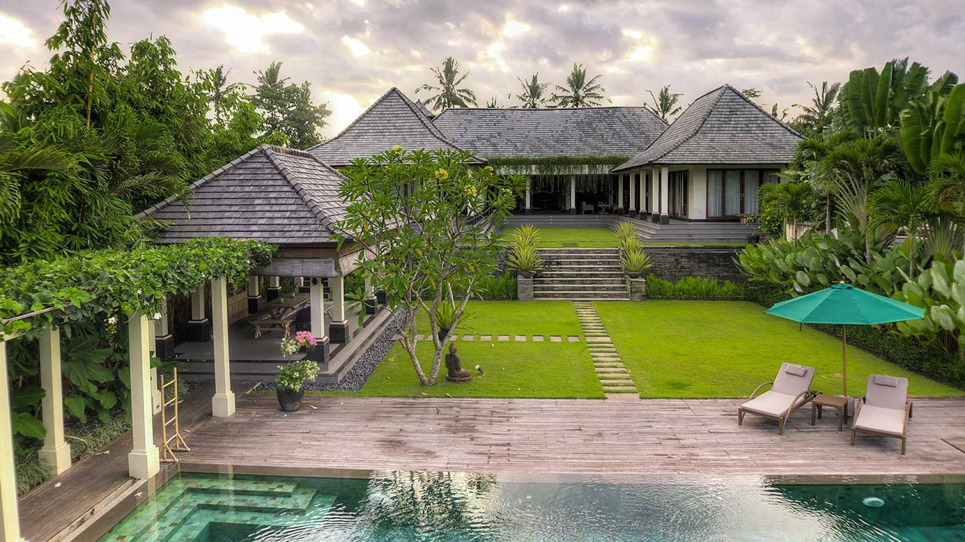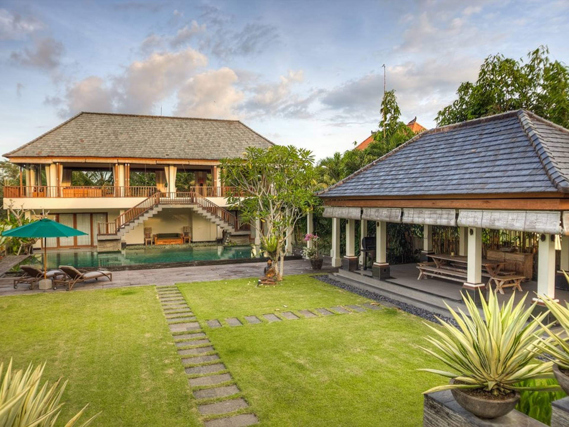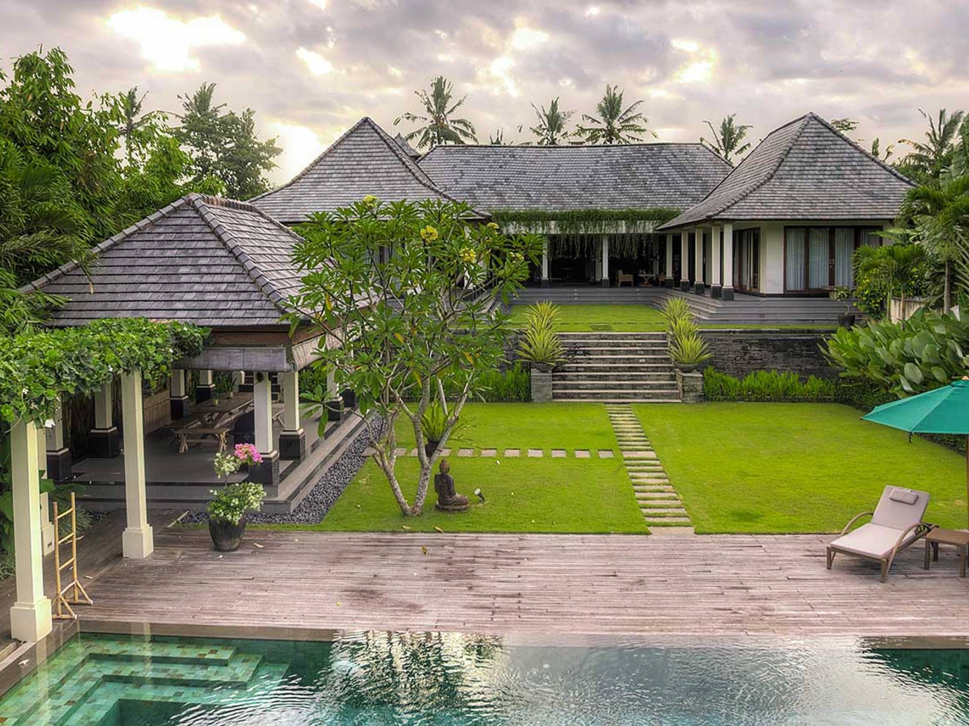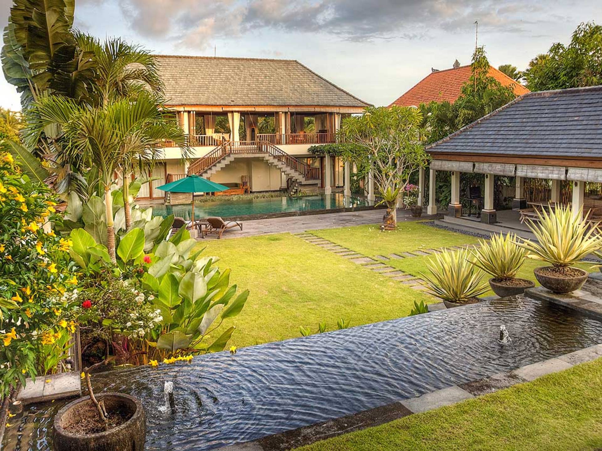 Intégrés dans le salon, une cuisine moderne et un bar ou un garde-manger sont également fournis au personnel pour préparer les délicieux repas servis aux clients de l'hôtel, en plus d'être utilisés par les clients eux-mêmes pour cuisiner leurs propres repas savoureux . De plus, cette maison dispose également de divers endroits pour vous détendre et vous détendre dans toute la résidence, par ex. le Bale au bord de la piscine ou le grand yoga Bale d'observation et de relaxation au sommet des suites d'invités. Il y a un jardin tropical exquis qui entoure un 14 m. piscine à débordement.