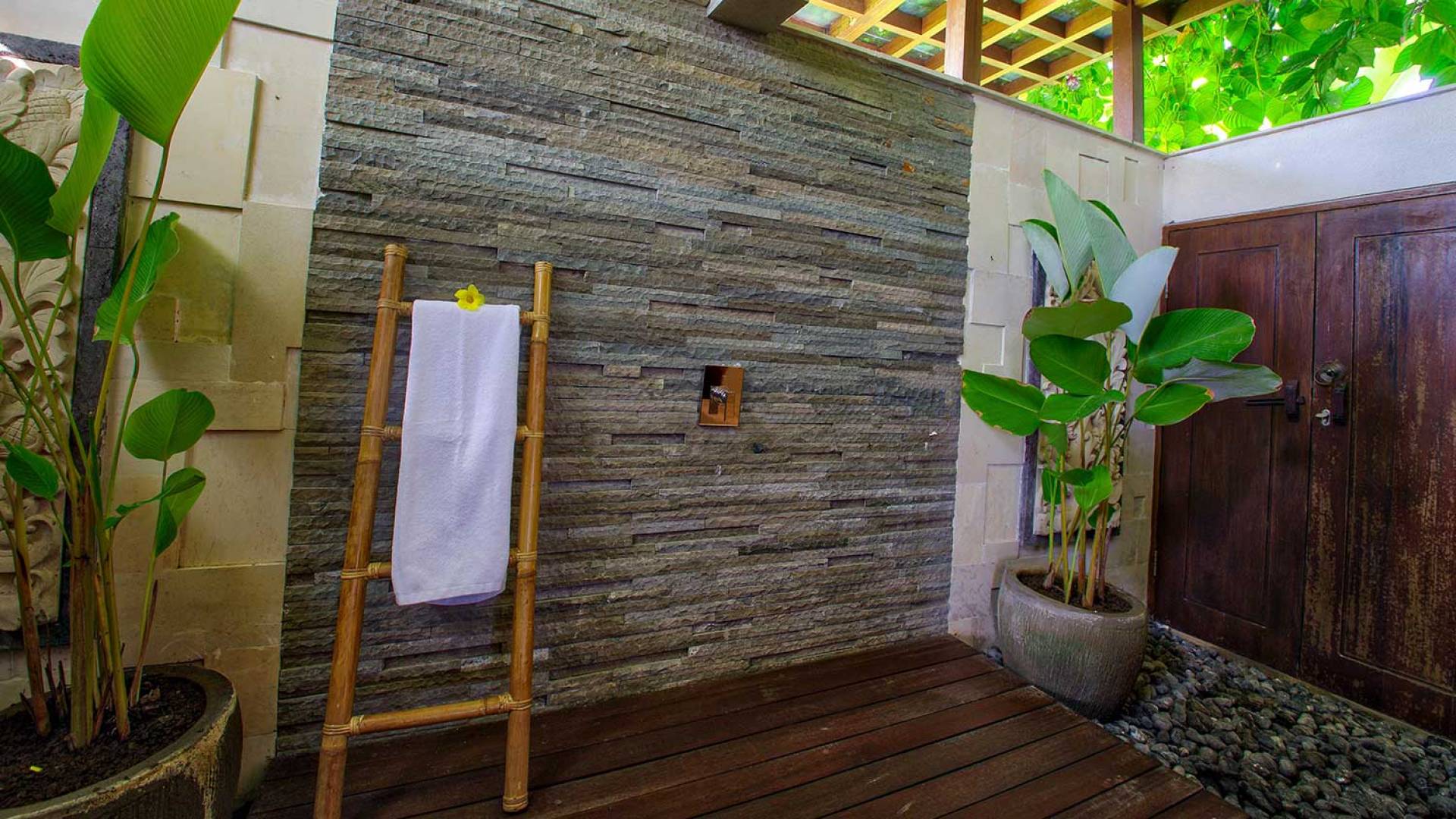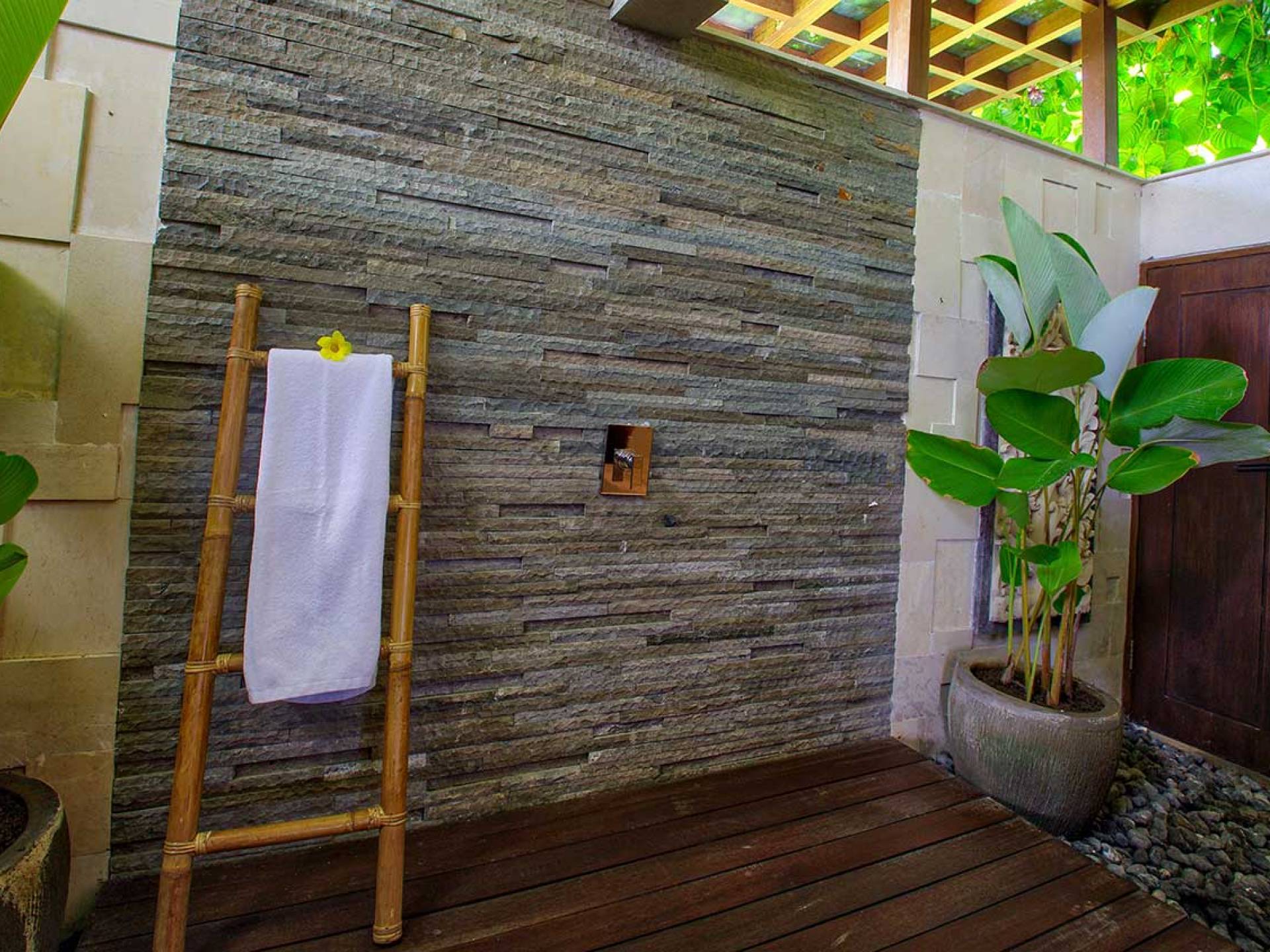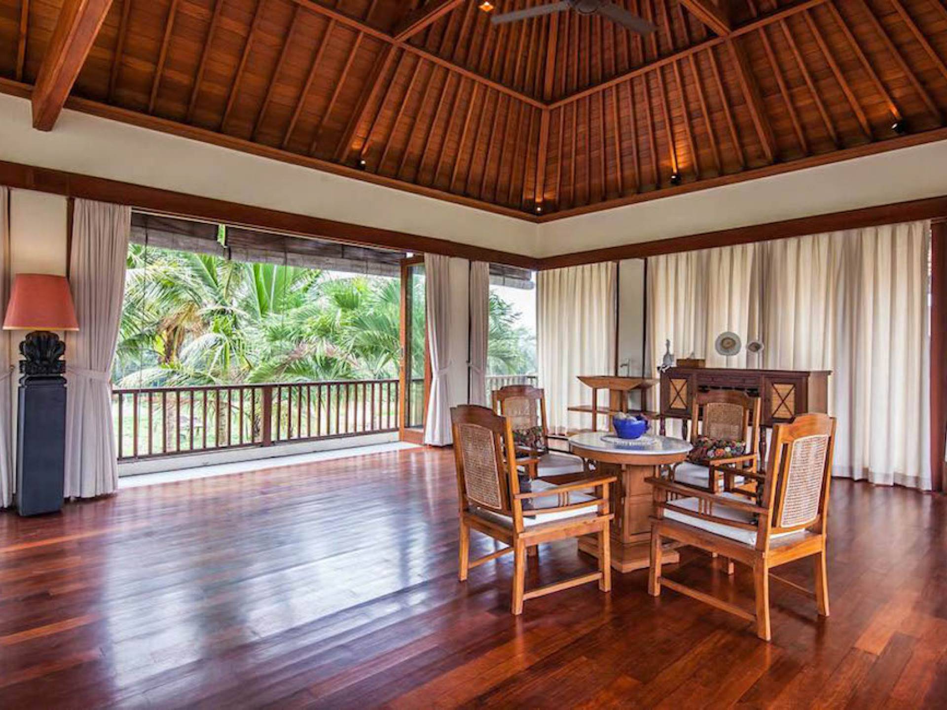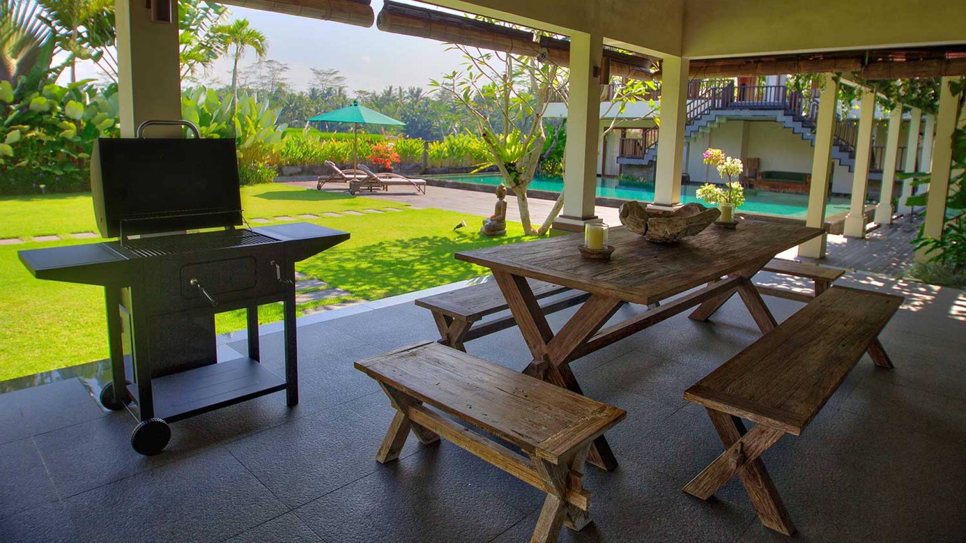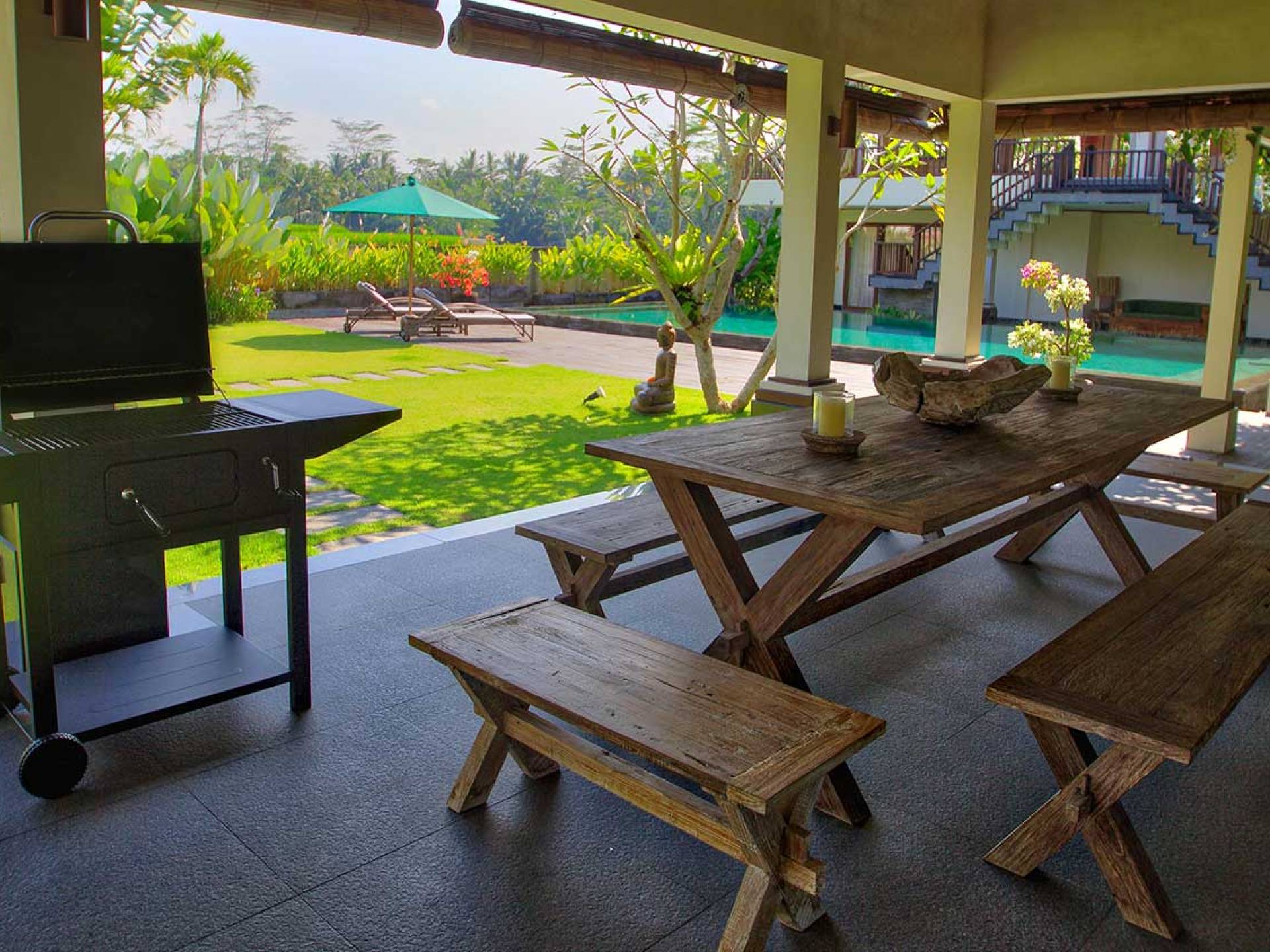 Le Bale au bord de la piscine est magnifiquement aménagé pour vous permettre d'organiser un barbecue de vos bons repas ou de manger à la table rustique pendant que le personnel prépare le choix de coupes ou de côtes levées pour vous. En plus des repas et du barbecue, vous pouvez prendre un bain de soleil sur les chaises longues au bord de la piscine disposées sur la longue terrasse de la piscine en bois de fer ou mieux encore, pratiquer le yoga sur les tapis disponibles avec un professeur de yoga, si vous le souhaitez.