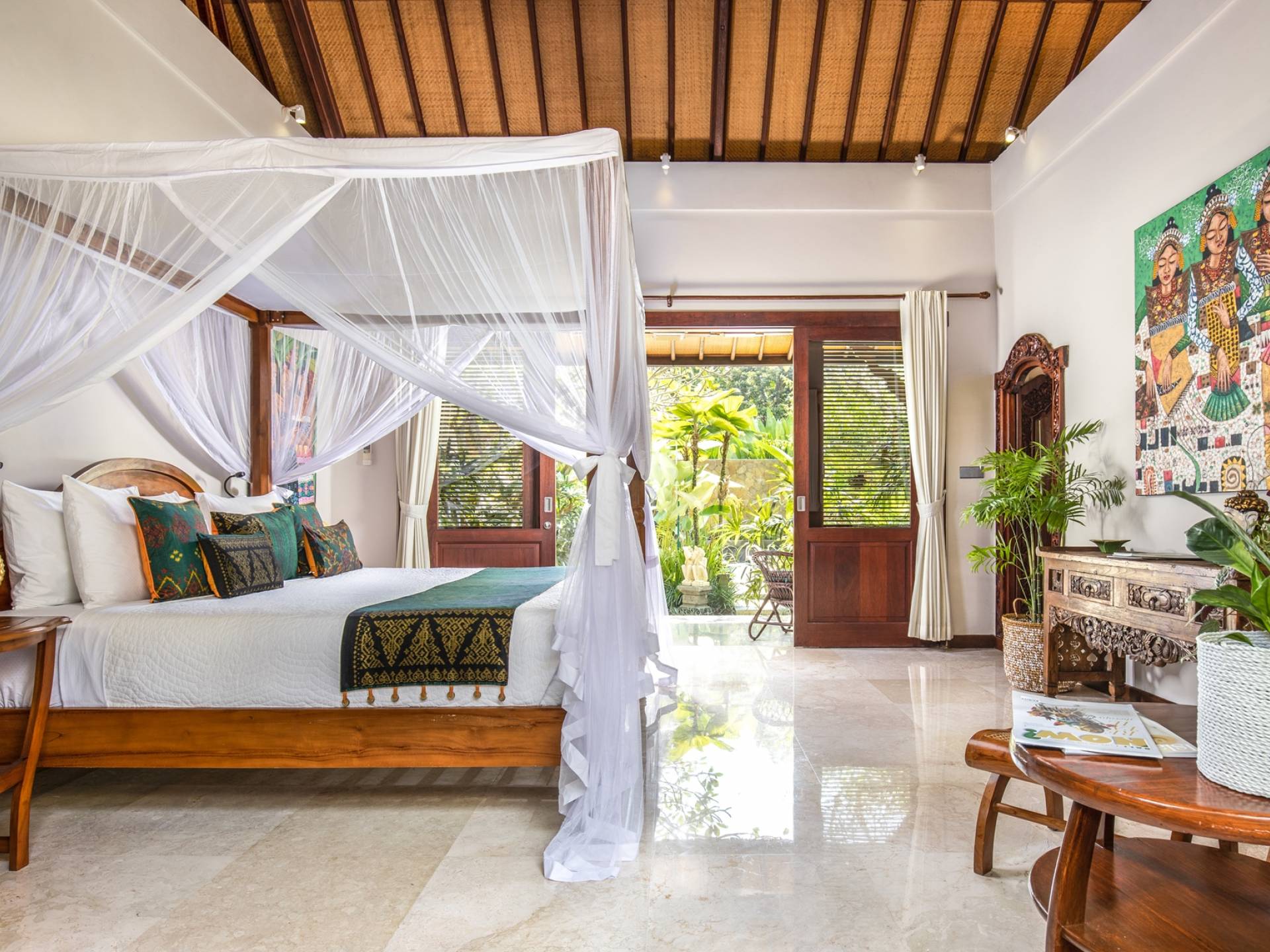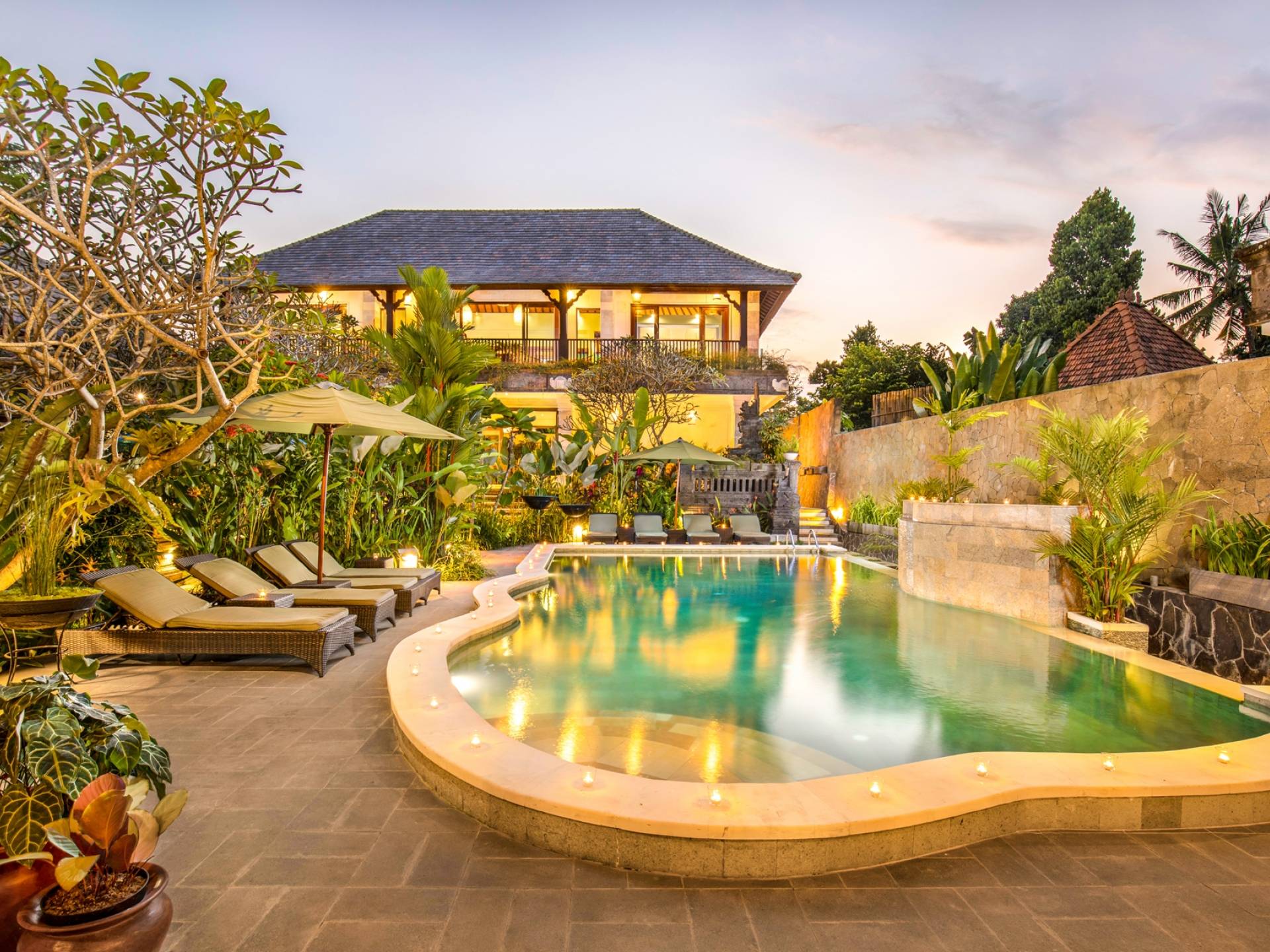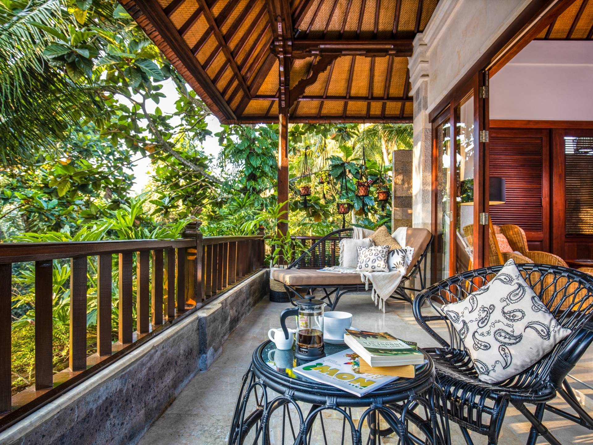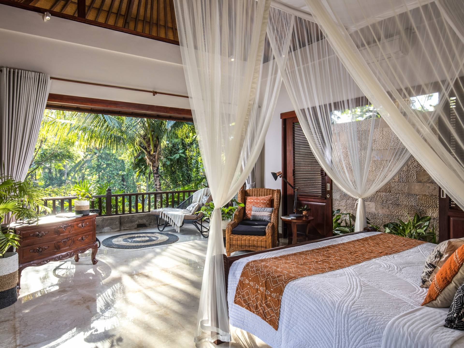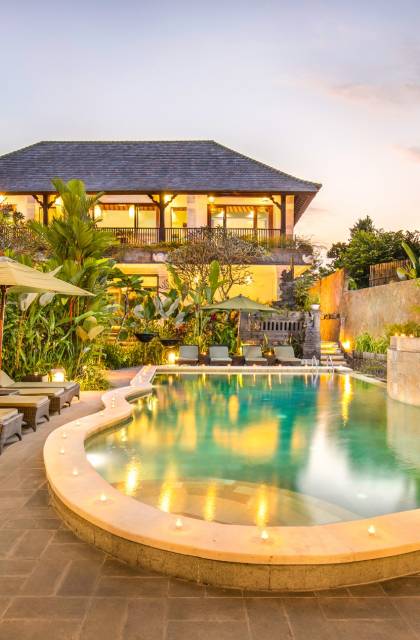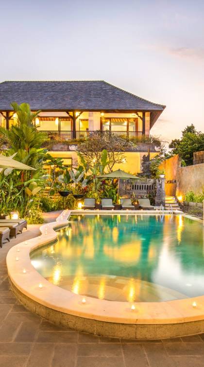 La Villa Kano Sari se compose de six suites réparties autour d'une belle piscine, dans de magnifiques jardins tropicaux surplombant les gorges de la rivière Jero Gadung. Conçu à l'origine comme une maison familiale de luxe, il y a une abondance d'espaces privés et communs bien pensés. Toutes les suites sont conçues et décorées individuellement. Ces chambres très spacieuses sont lumineuses et aérées, chacune avec sa propre terrasse extérieure privée. Tous les espaces de couchage sont climatisés et disposent de meubles fabriqués à la main sur mesure, de draps et de tissus d'ameublement balinais raffinés, de lampes de lecture et de moustiquaires drapées.