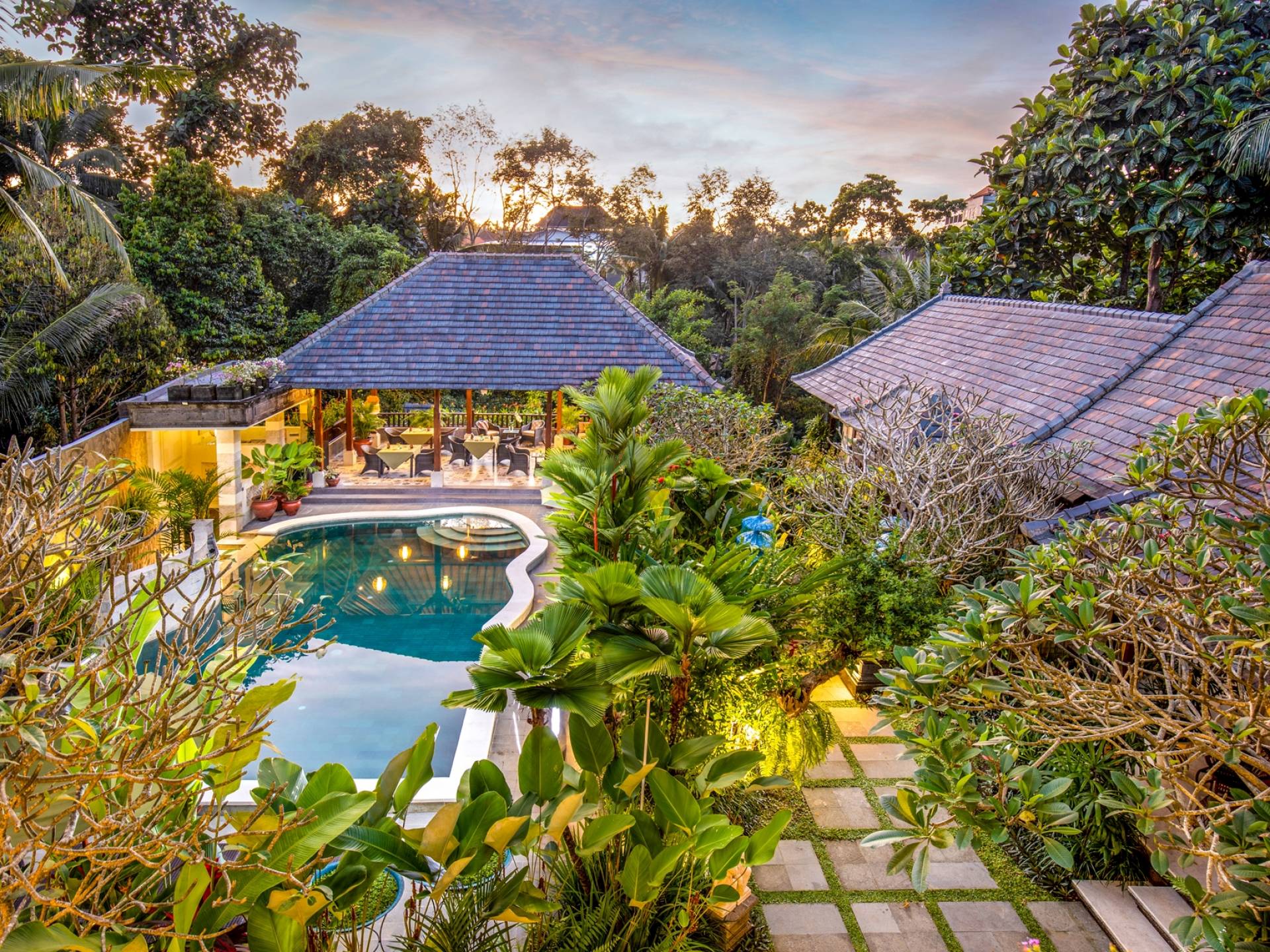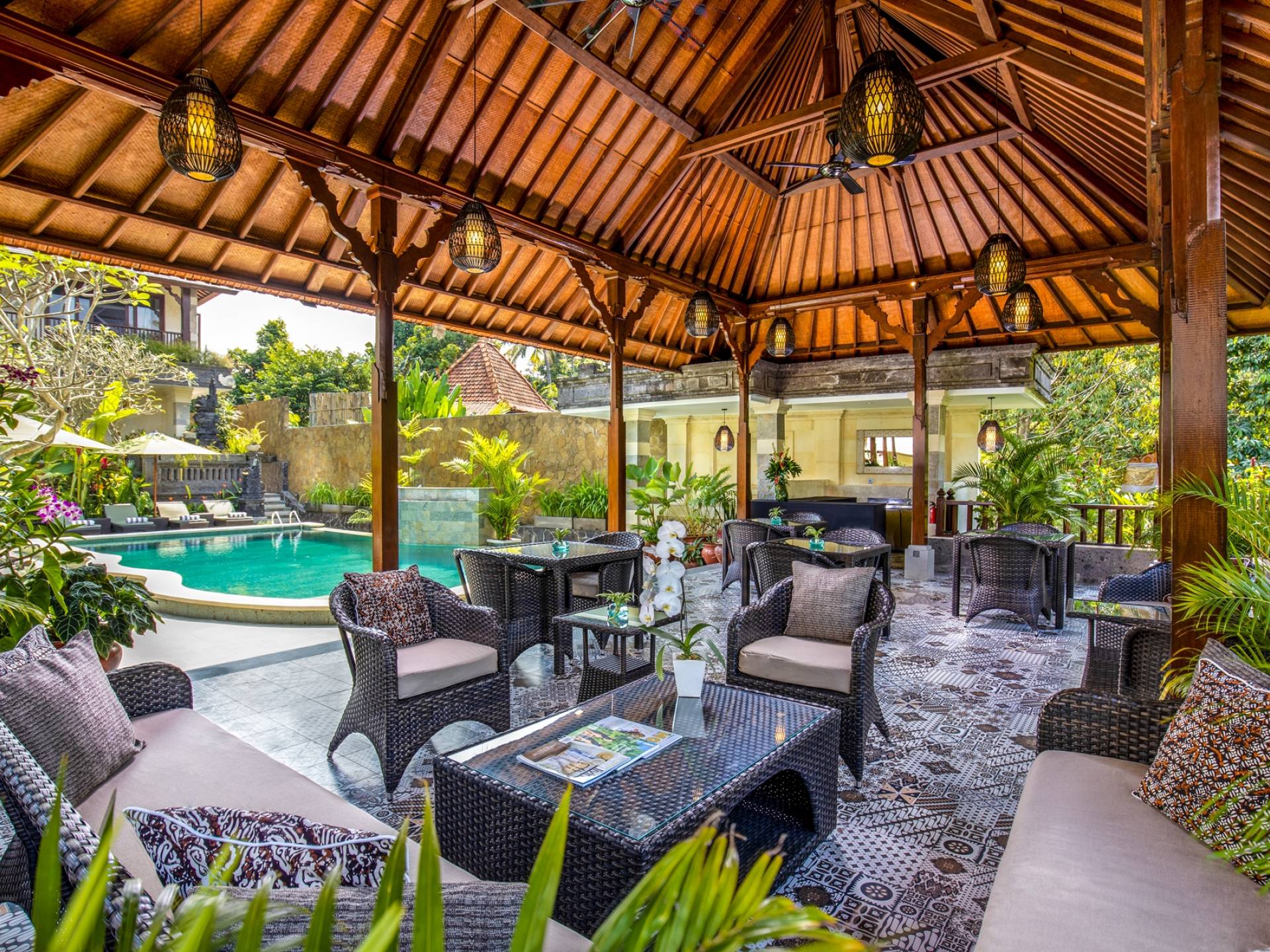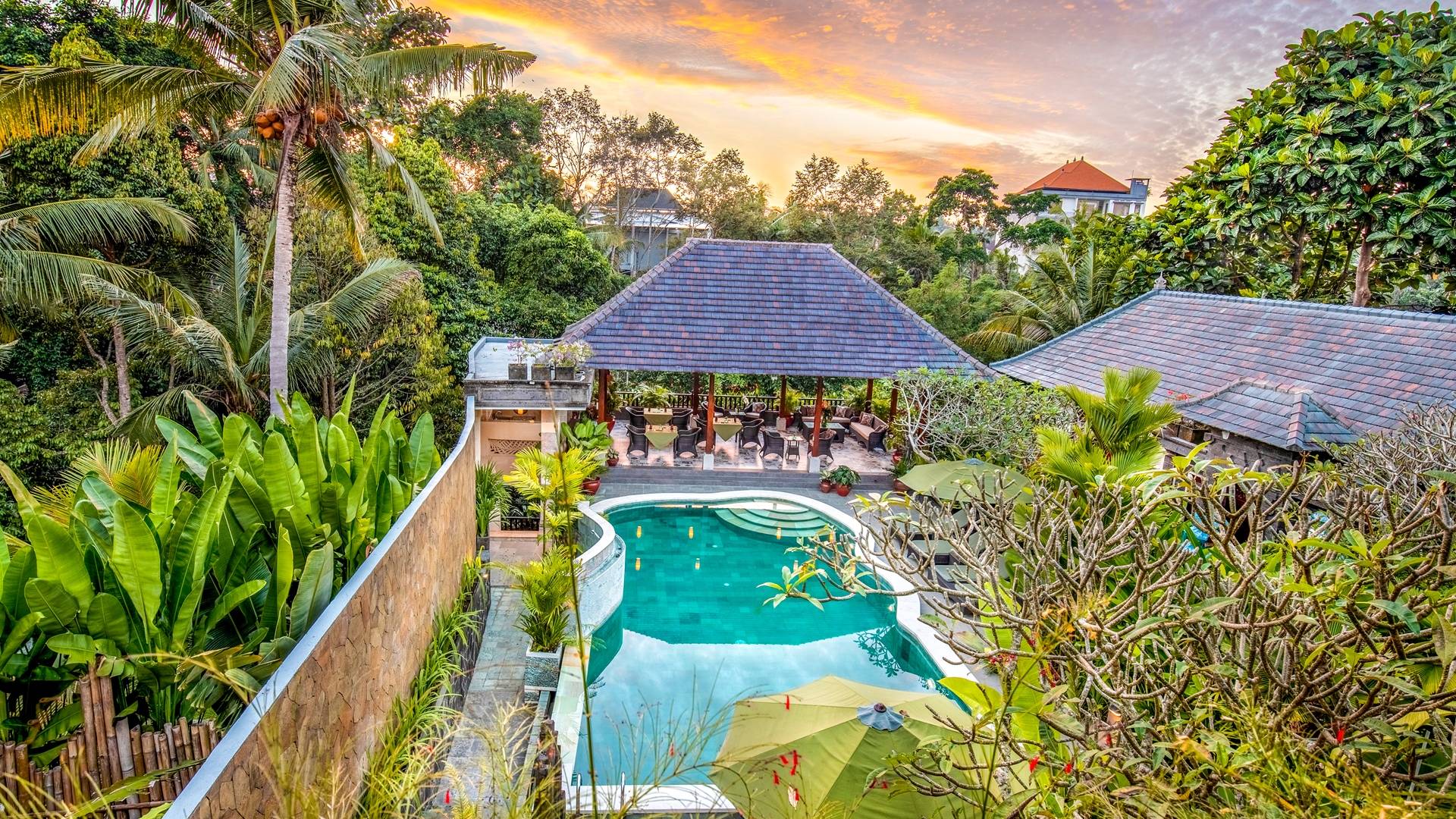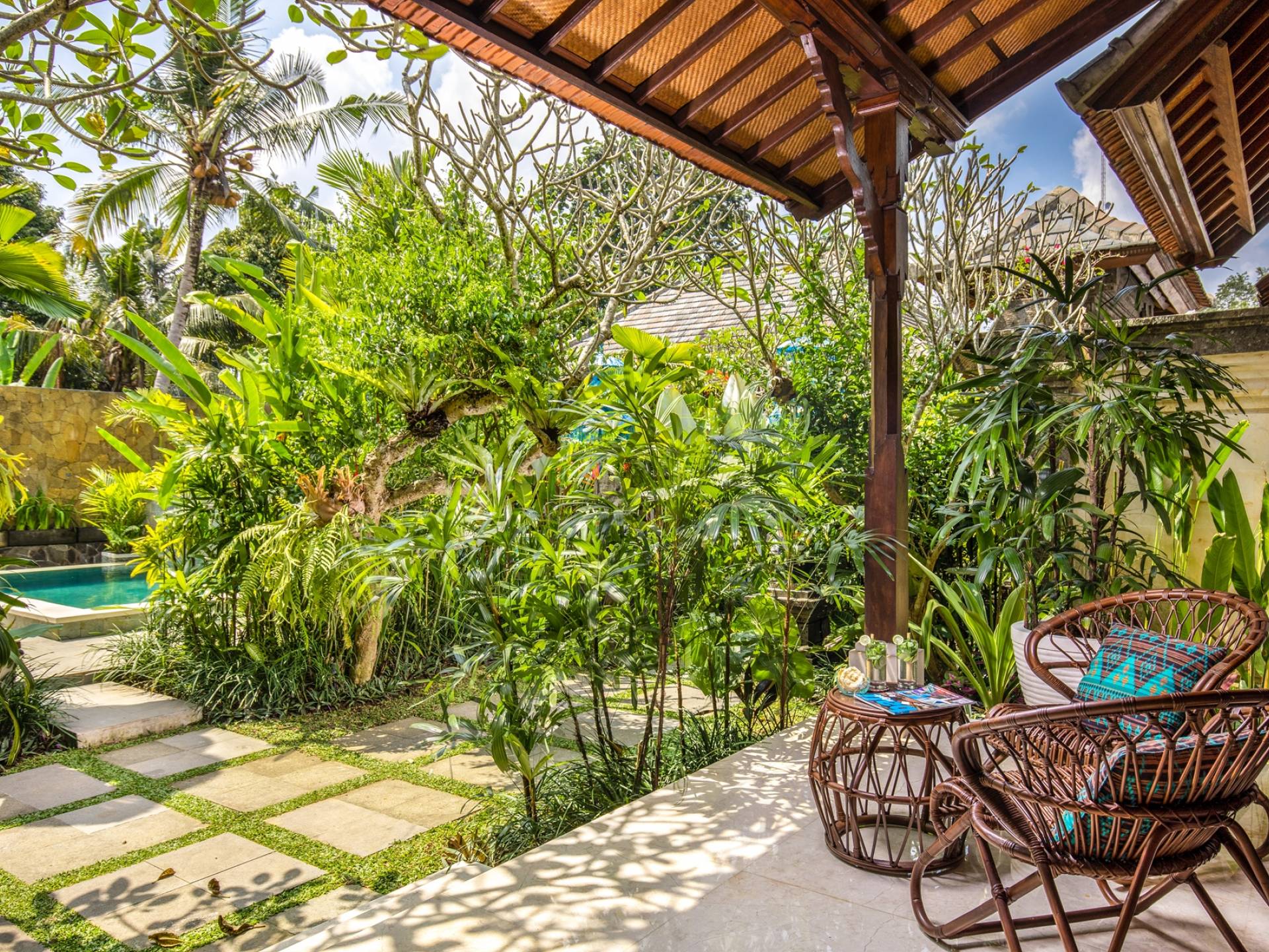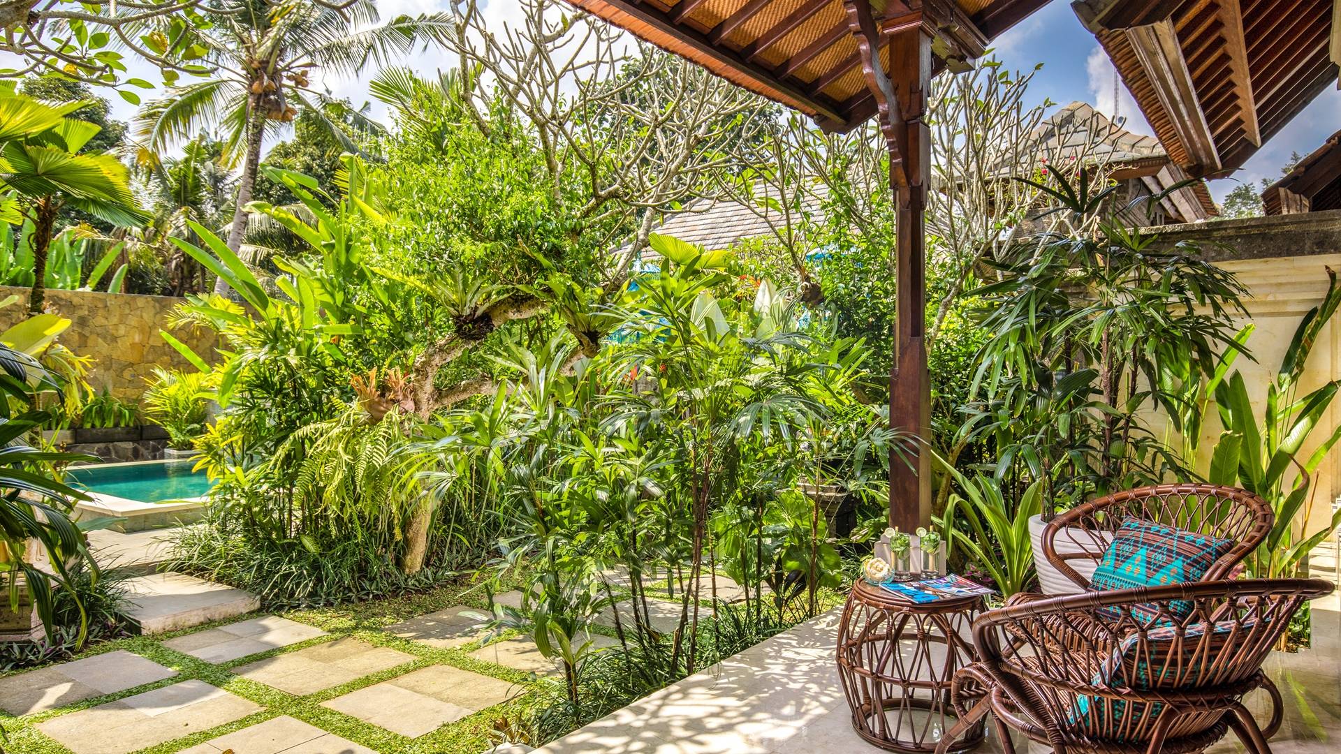 La Villa Kano Sari se compose de six suites réparties autour d'une belle piscine, dans de magnifiques jardins tropicaux surplombant les gorges de la rivière Jero Gadung. Conçu à l'origine comme une maison familiale de luxe, il y a une abondance d'espaces privés et communs bien pensés. Toutes les suites sont conçues et décorées individuellement. Ces chambres très spacieuses sont lumineuses et aérées, chacune avec sa propre terrasse extérieure privée. Tous les espaces de couchage sont climatisés et disposent de meubles fabriqués à la main sur mesure, de draps et de tissus d'ameublement balinais raffinés, de lampes de lecture et de moustiquaires drapées.