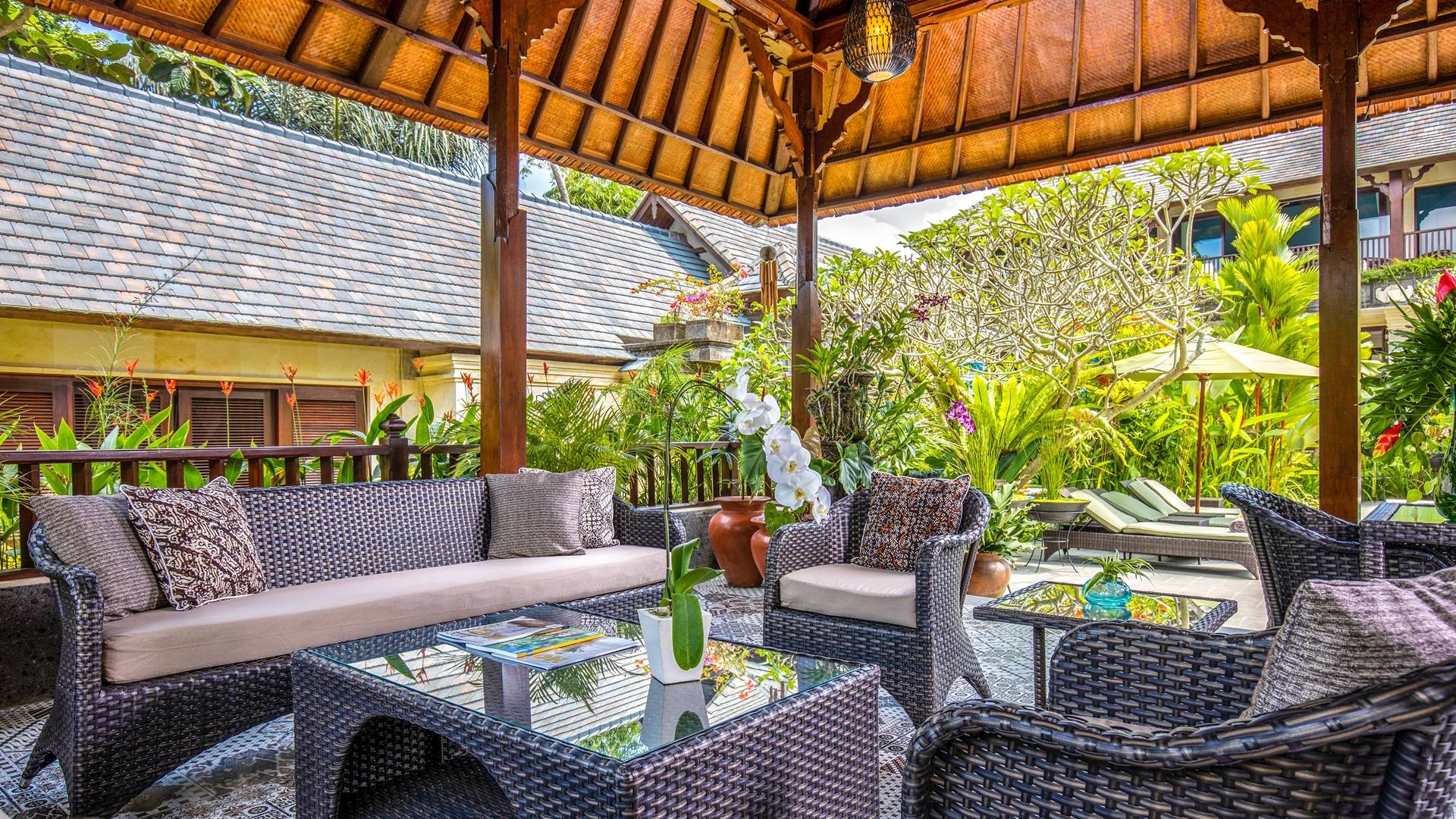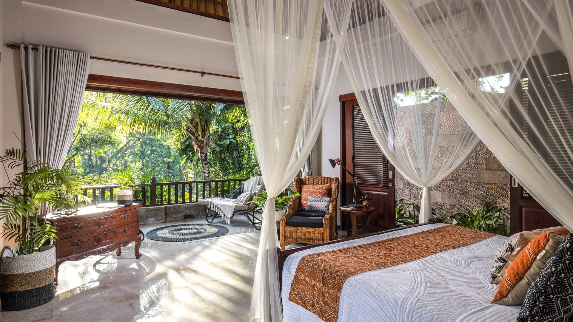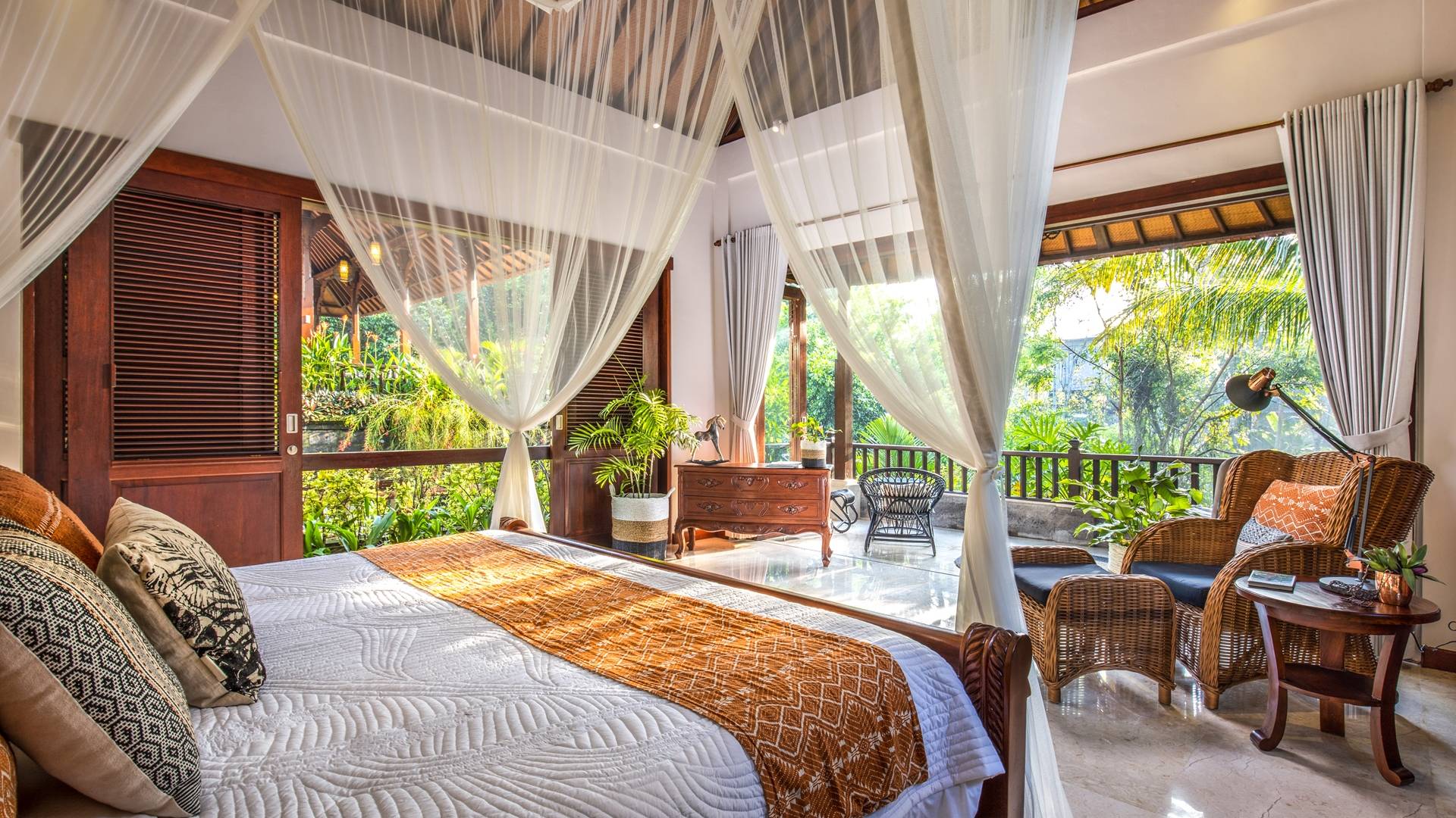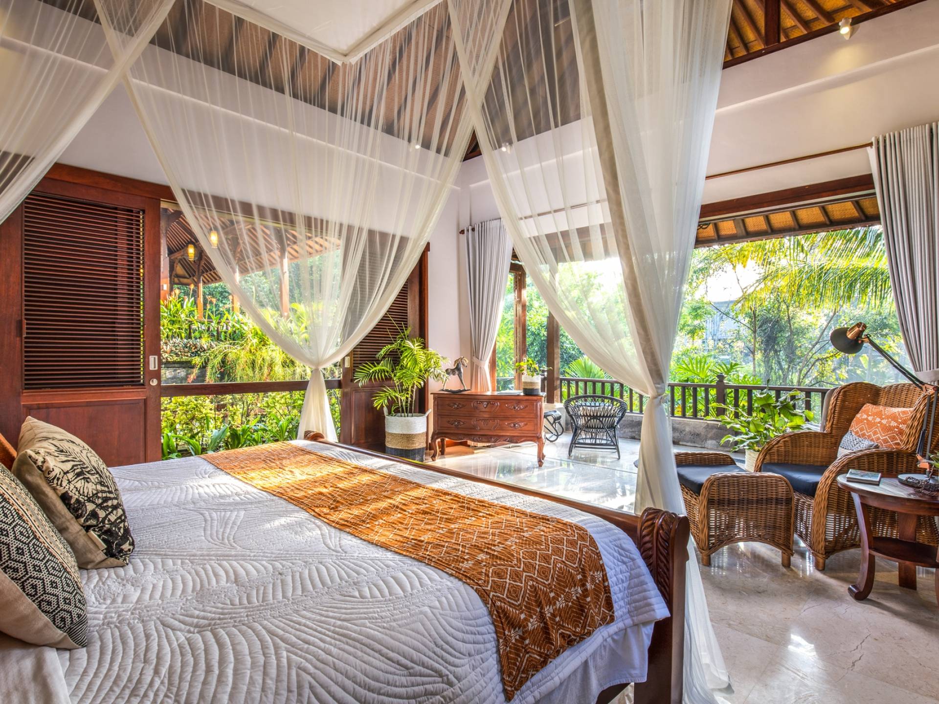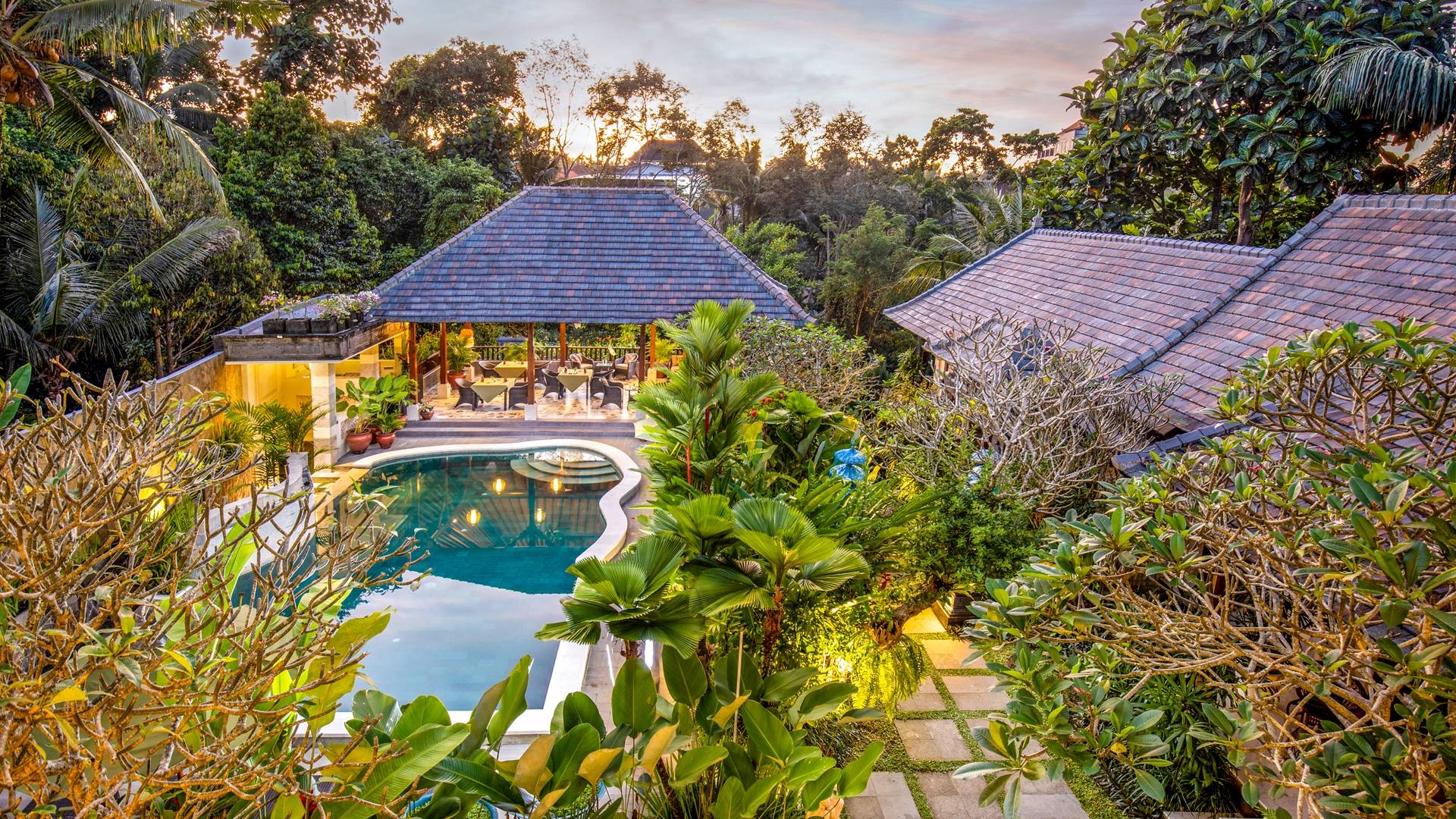 La Villa Kano Sari se compose de six suites réparties autour d'une belle piscine, dans de magnifiques jardins tropicaux surplombant les gorges de la rivière Jero Gadung. Conçu à l'origine comme une maison familiale de luxe, il y a une abondance d'espaces privés et communs bien pensés. Toutes les suites sont conçues et décorées individuellement. Ces chambres très spacieuses sont lumineuses et aérées, chacune avec sa propre terrasse extérieure privée. Tous les espaces de couchage sont climatisés et disposent de meubles fabriqués à la main sur mesure, de draps et de tissus d'ameublement balinais raffinés, de lampes de lecture et de moustiquaires drapées.
