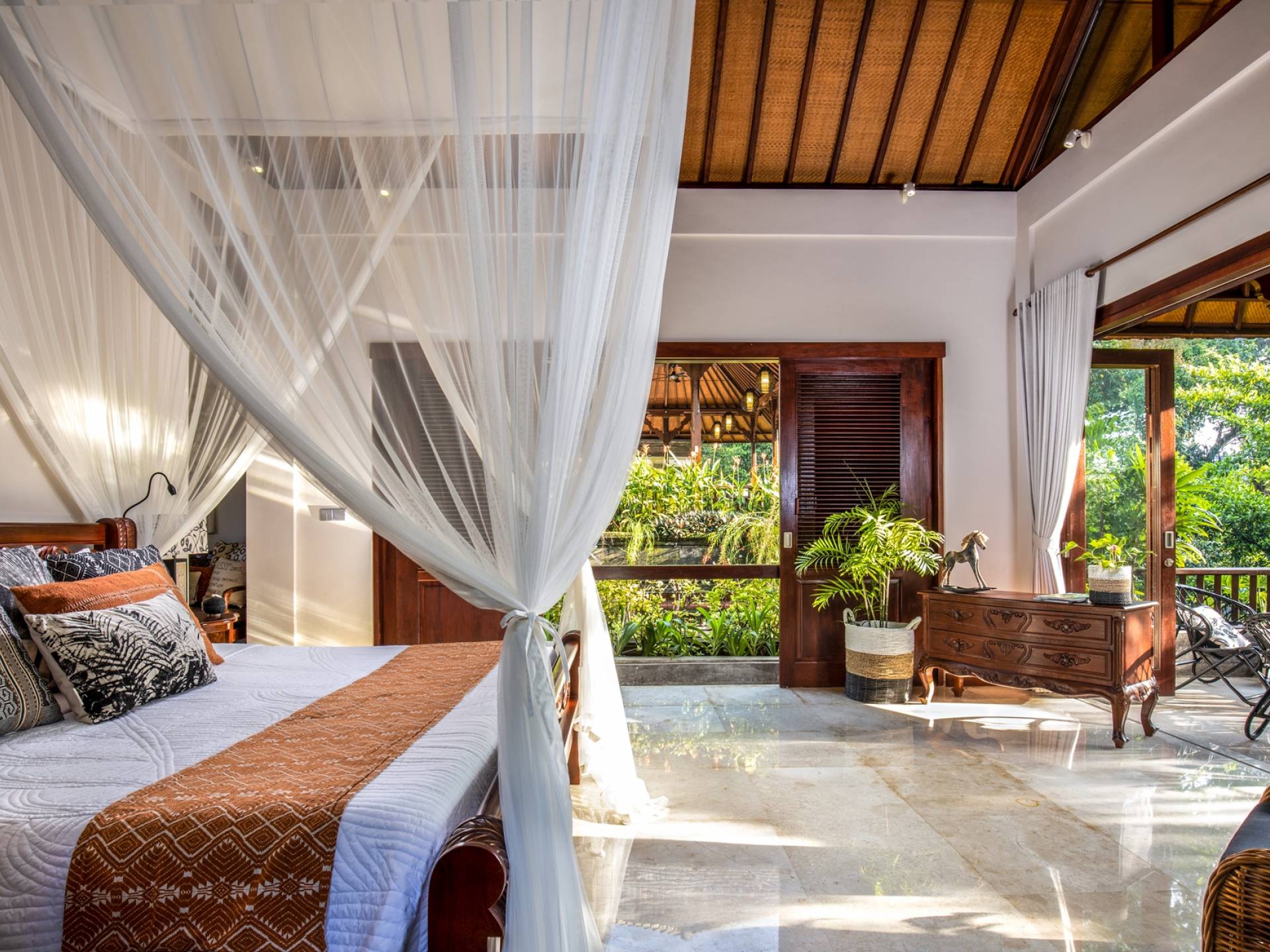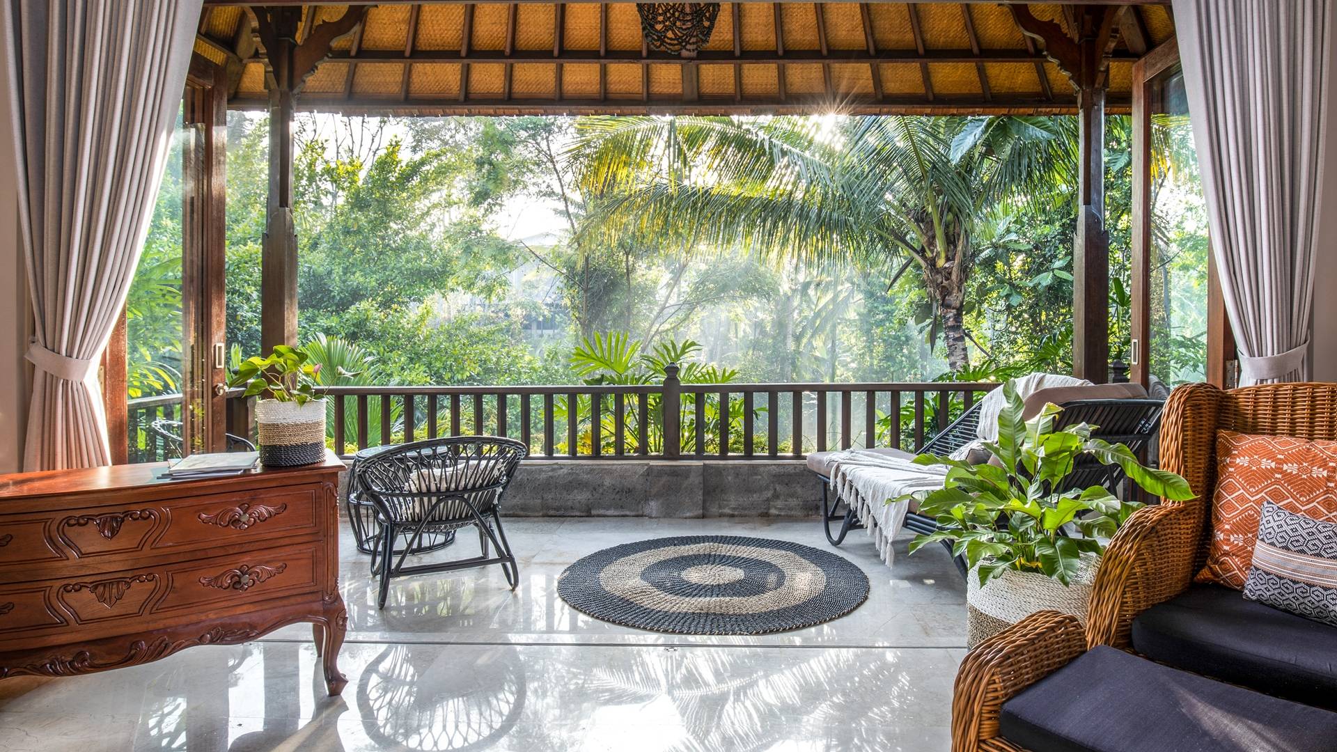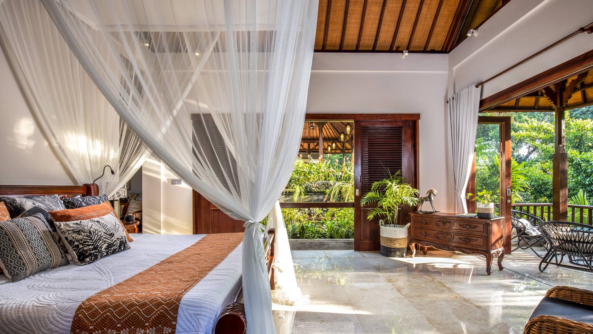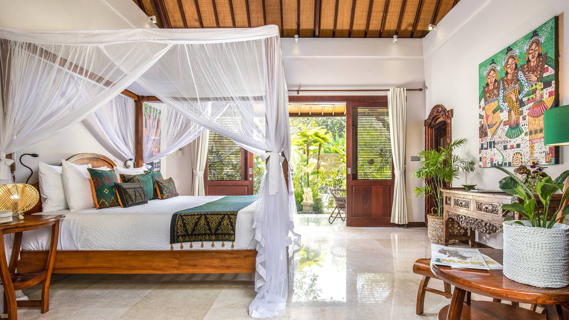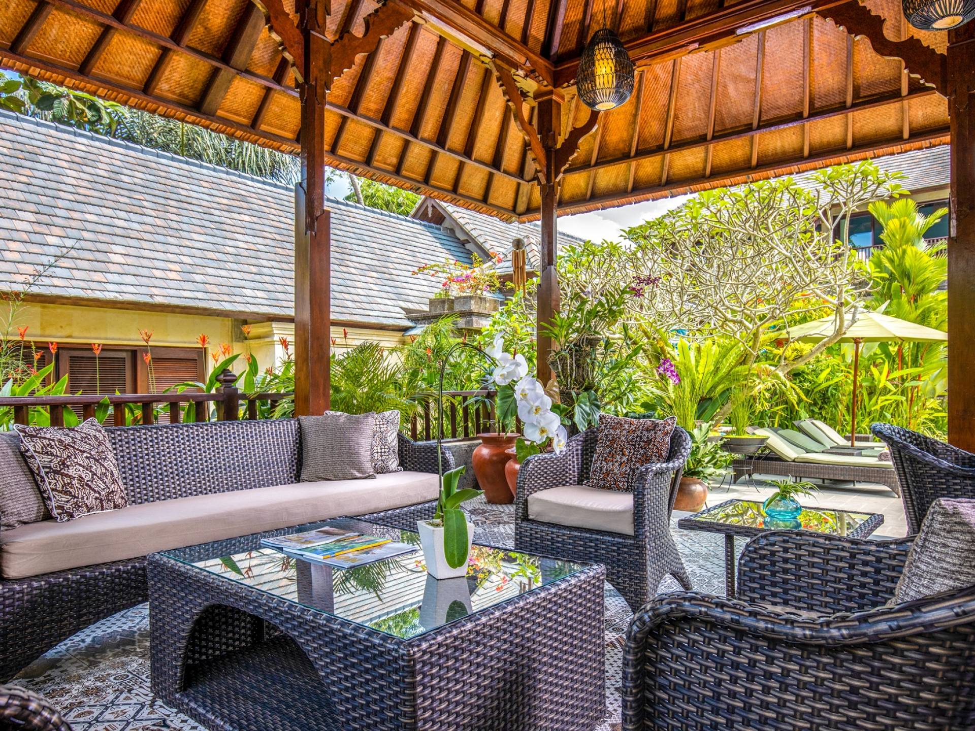 La Villa Kano Sari se compose de six suites réparties autour d'une belle piscine, dans de magnifiques jardins tropicaux surplombant les gorges de la rivière Jero Gadung. Conçu à l'origine comme une maison familiale de luxe, il y a une abondance d'espaces privés et communs bien pensés. Toutes les suites sont conçues et décorées individuellement. Ces chambres très spacieuses sont lumineuses et aérées, chacune avec sa propre terrasse extérieure privée. Tous les espaces de couchage sont climatisés et disposent de meubles fabriqués à la main sur mesure, de draps et de tissus d'ameublement balinais raffinés, de lampes de lecture et de moustiquaires drapées.