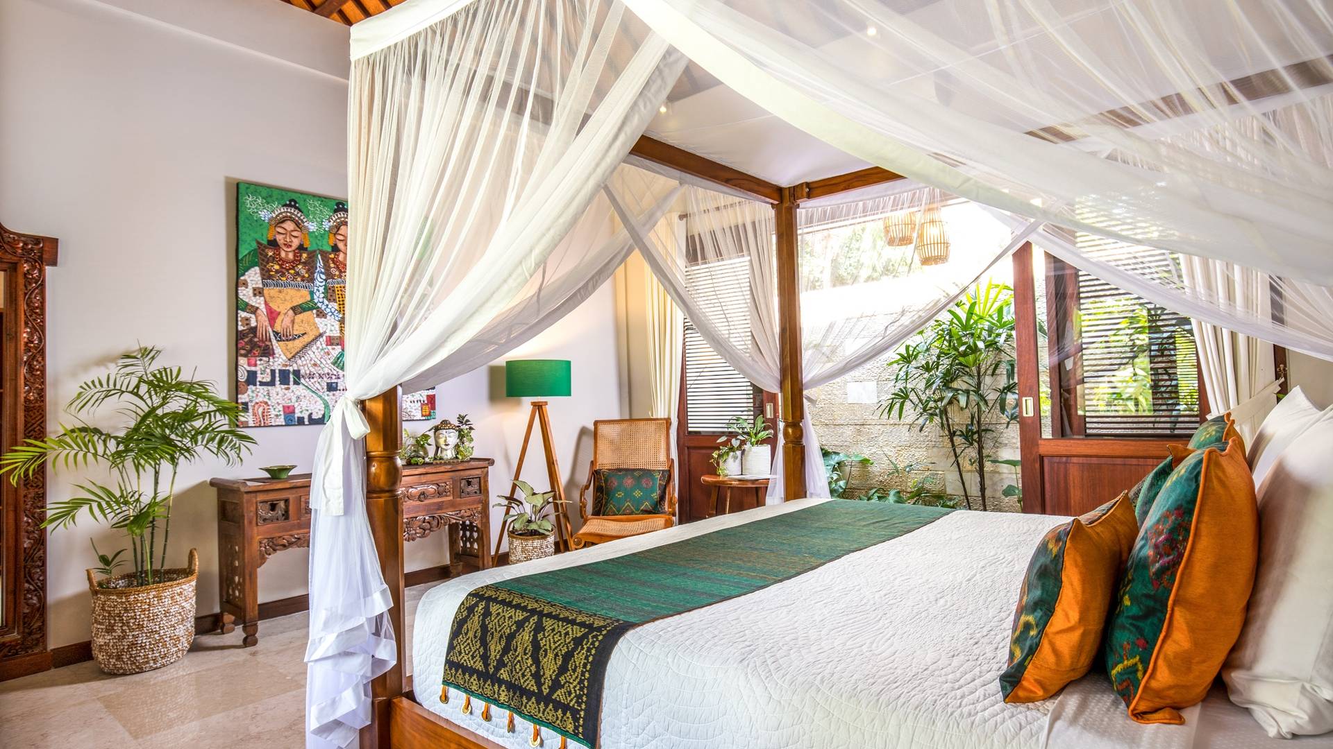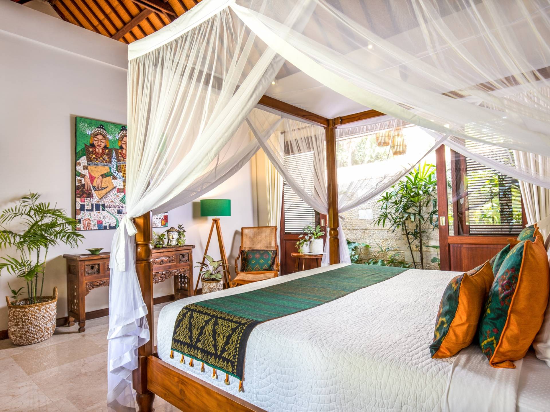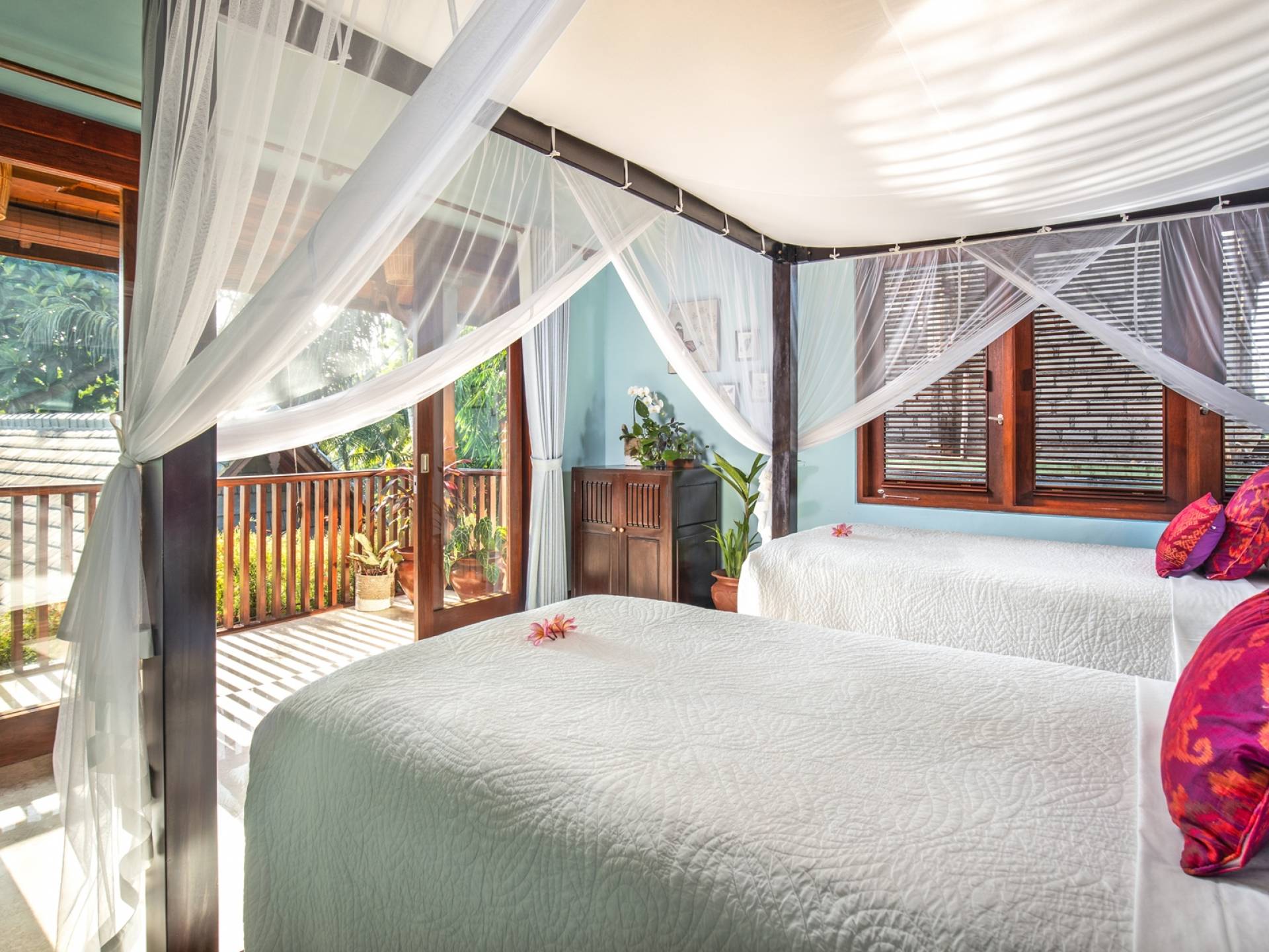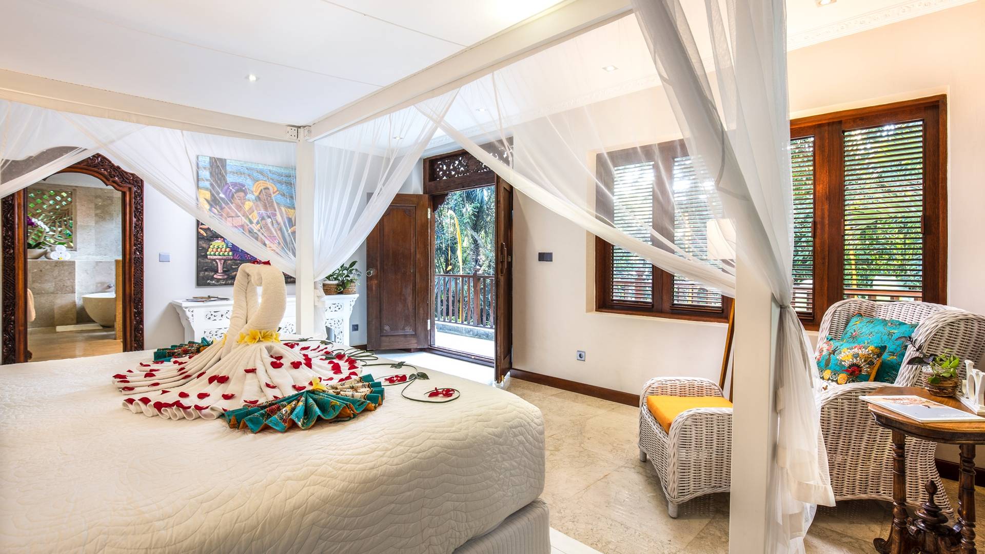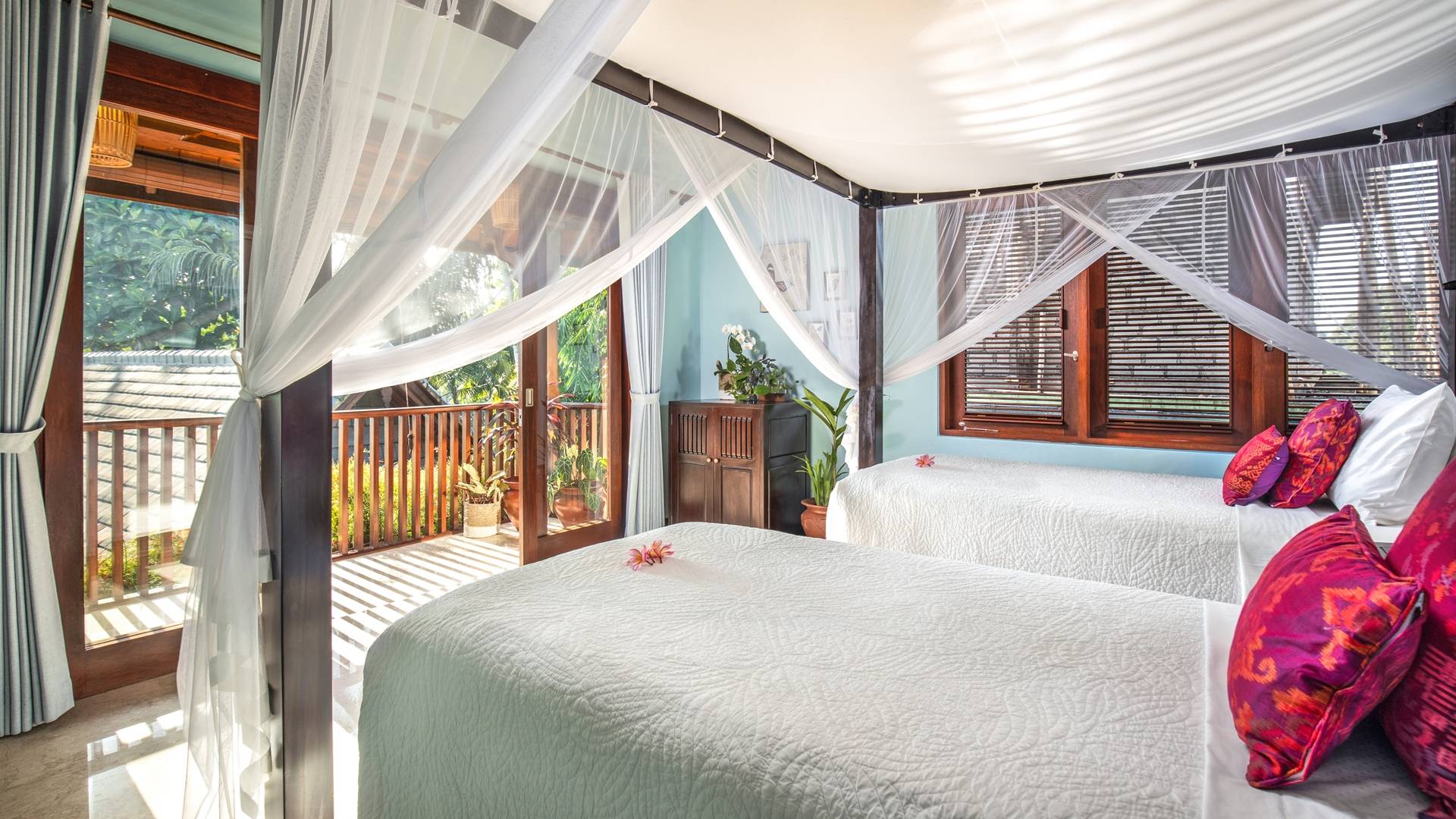 La Villa Kano Sari se compose de six suites réparties autour d'une belle piscine, dans de magnifiques jardins tropicaux surplombant les gorges de la rivière Jero Gadung. Conçu à l'origine comme une maison familiale de luxe, il y a une abondance d'espaces privés et communs bien pensés. Toutes les suites sont conçues et décorées individuellement. Ces chambres très spacieuses sont lumineuses et aérées, chacune avec sa propre terrasse extérieure privée. Tous les espaces de couchage sont climatisés et disposent de meubles fabriqués à la main sur mesure, de draps et de tissus d'ameublement balinais raffinés, de lampes de lecture et de moustiquaires drapées.