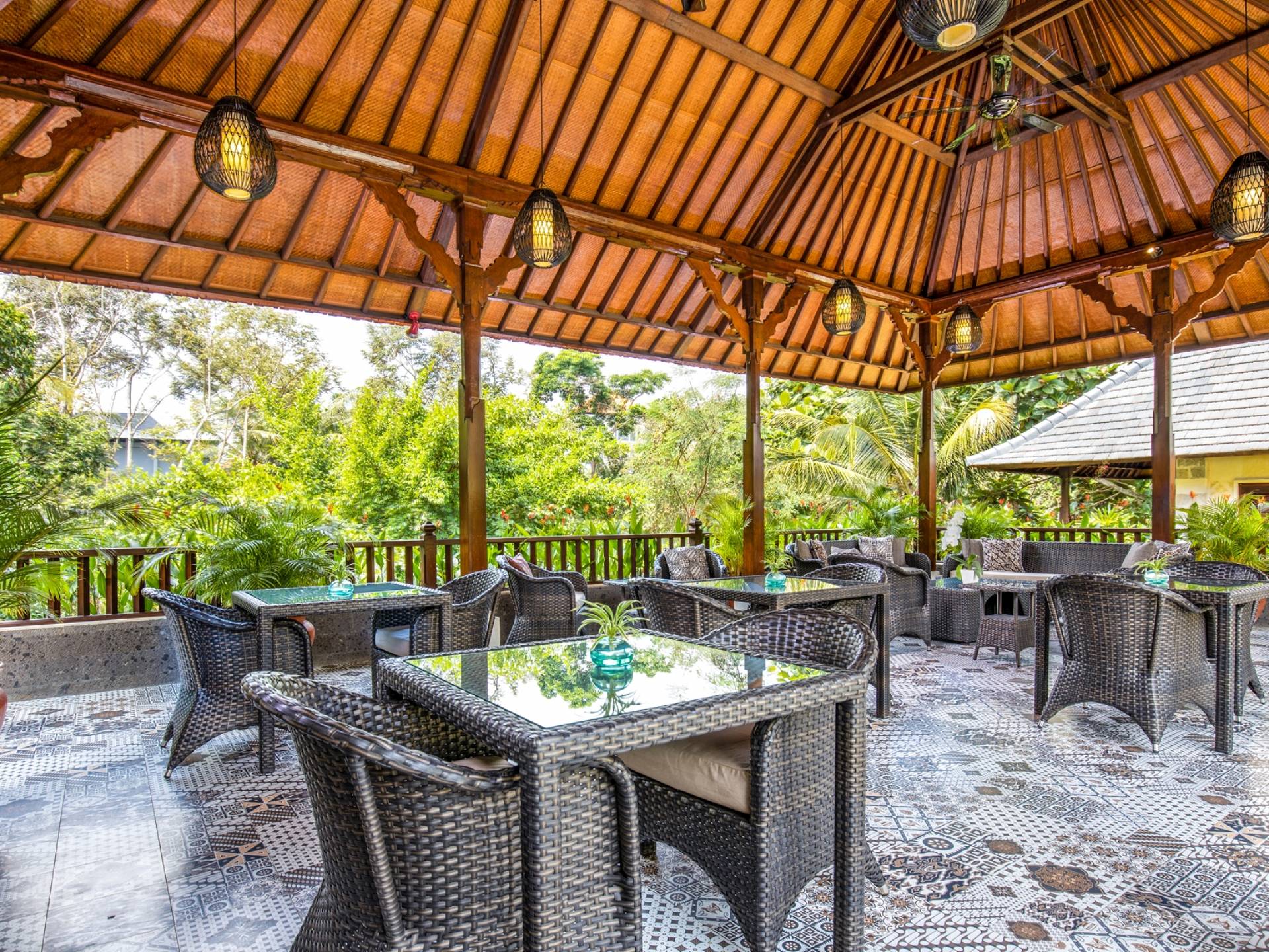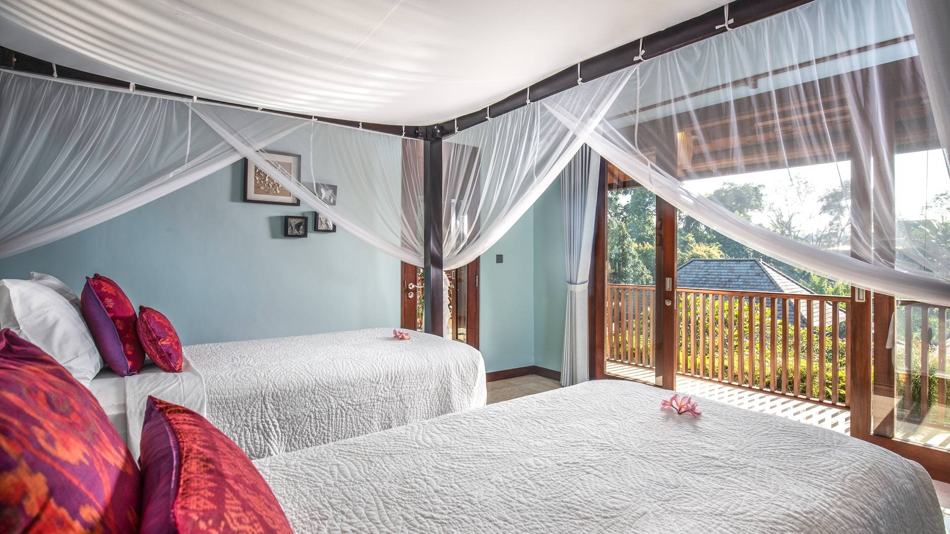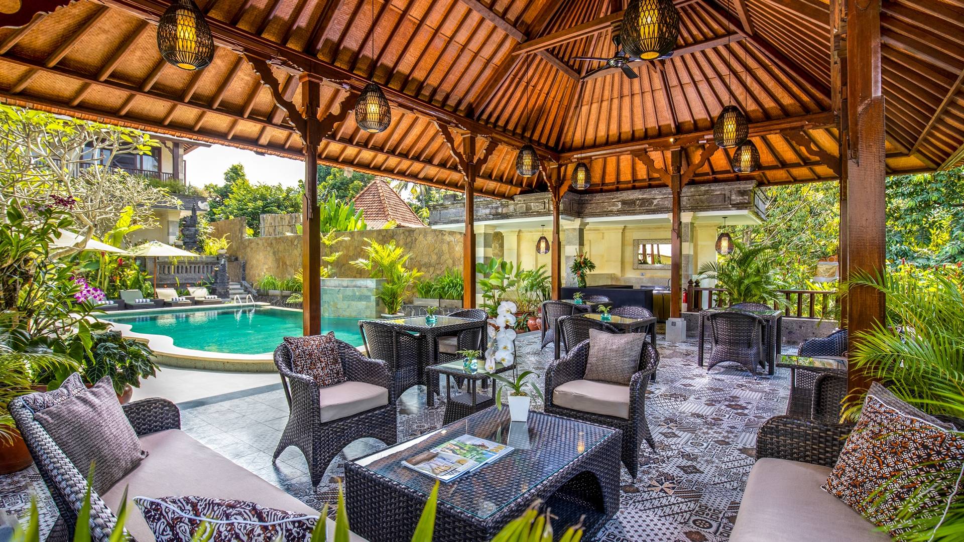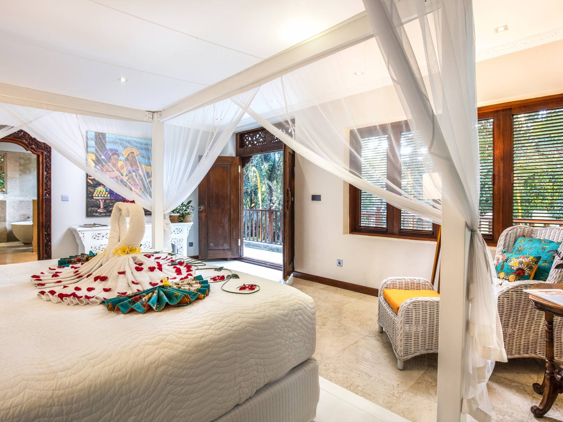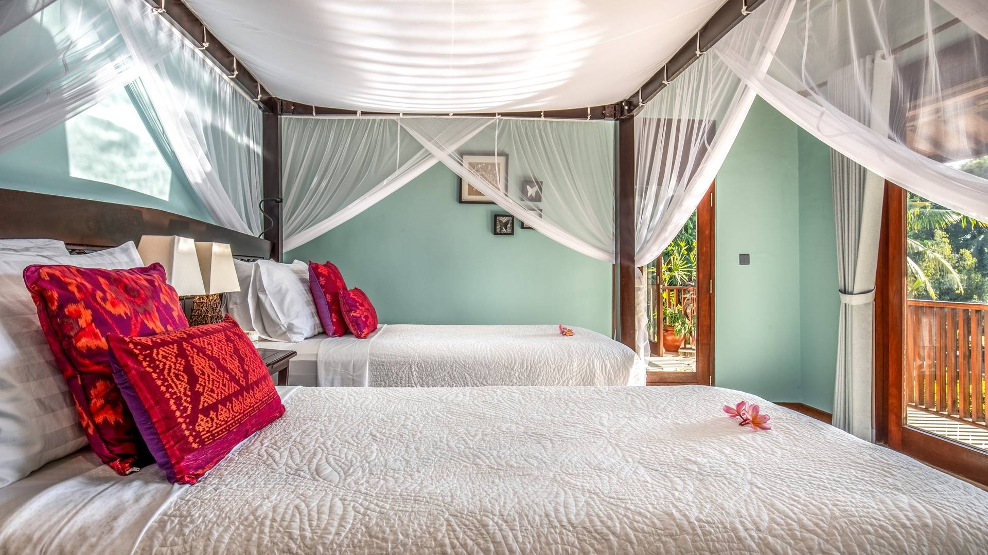 La Villa Kano Sari se compose de six suites réparties autour d'une belle piscine, dans de magnifiques jardins tropicaux surplombant les gorges de la rivière Jero Gadung. Conçu à l'origine comme une maison familiale de luxe, il y a une abondance d'espaces privés et communs bien pensés. Toutes les suites sont conçues et décorées individuellement. Ces chambres très spacieuses sont lumineuses et aérées, chacune avec sa propre terrasse extérieure privée. Tous les espaces de couchage sont climatisés et disposent de meubles fabriqués à la main sur mesure, de draps et de tissus d'ameublement balinais raffinés, de lampes de lecture et de moustiquaires drapées.