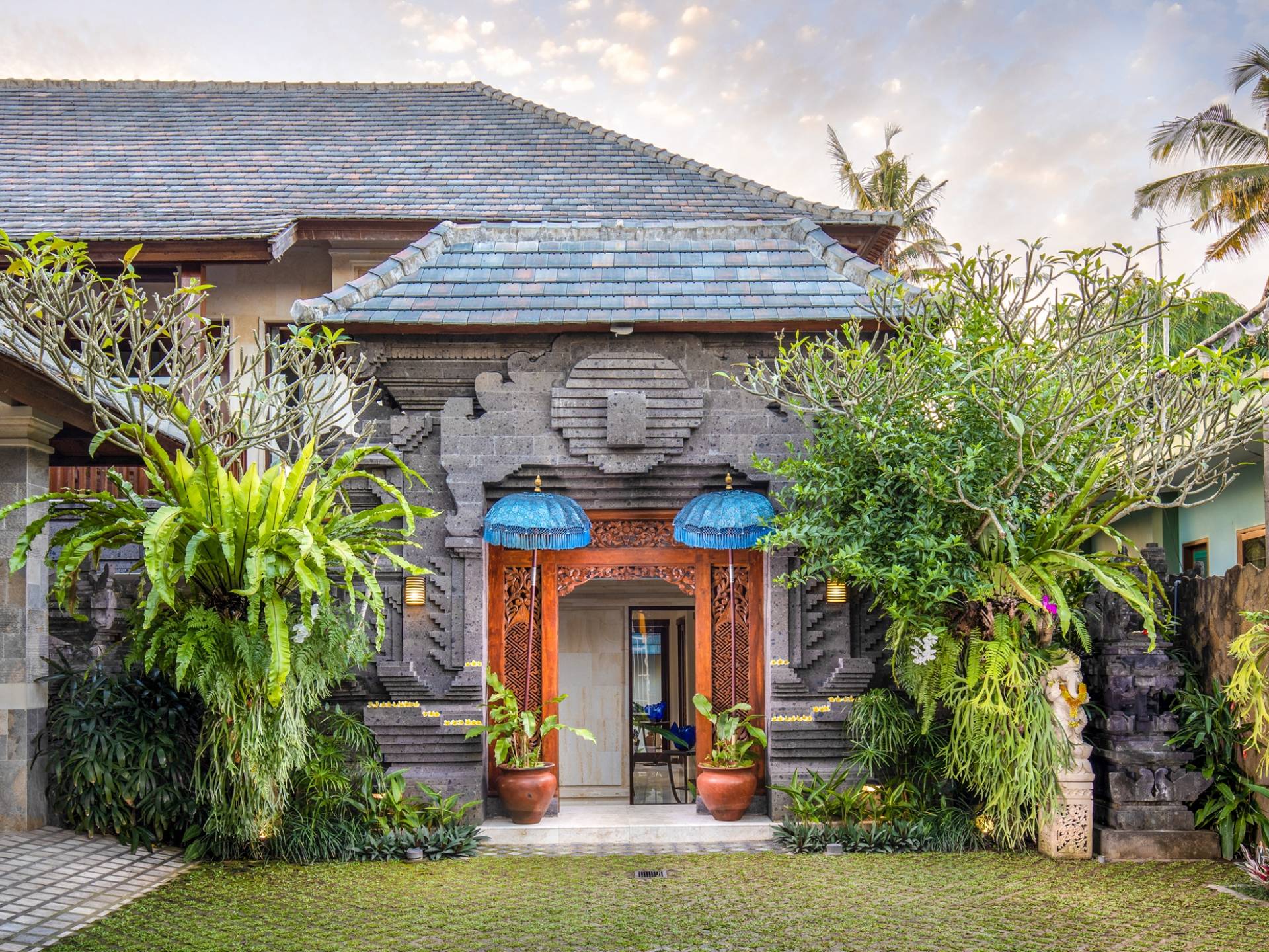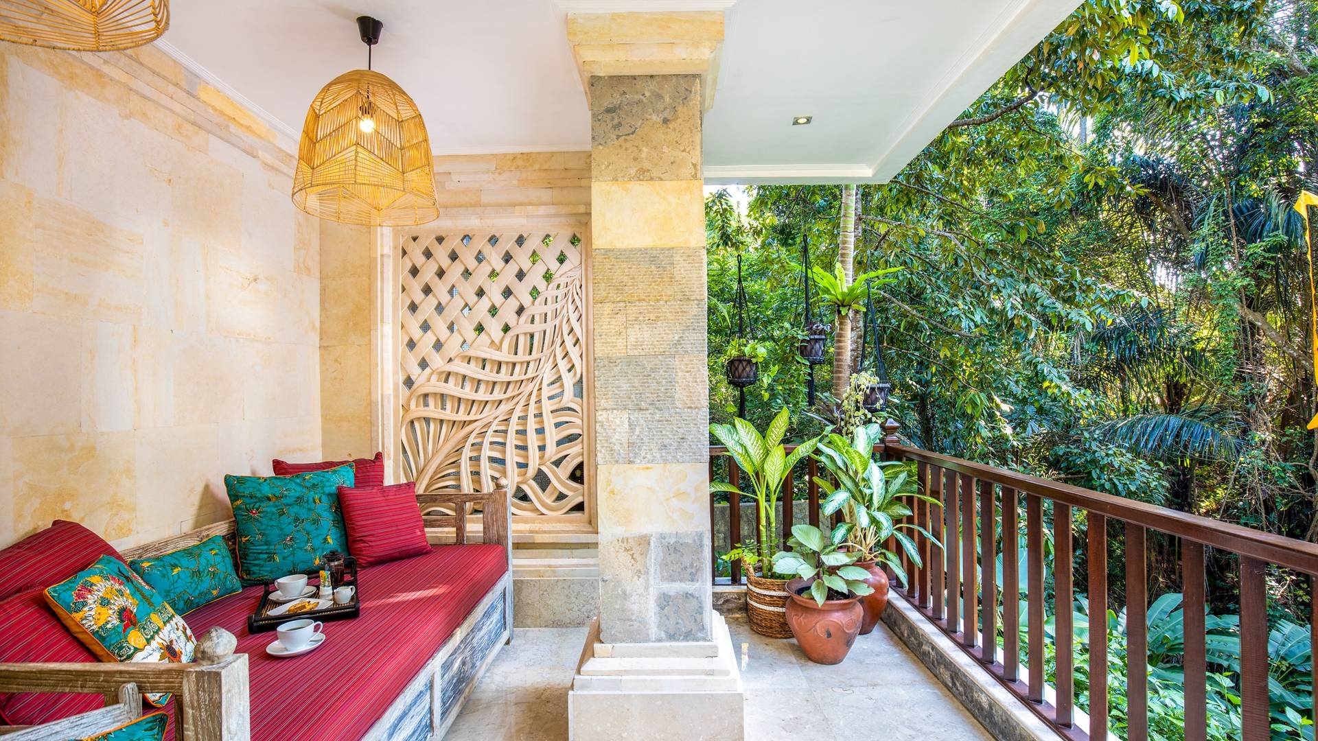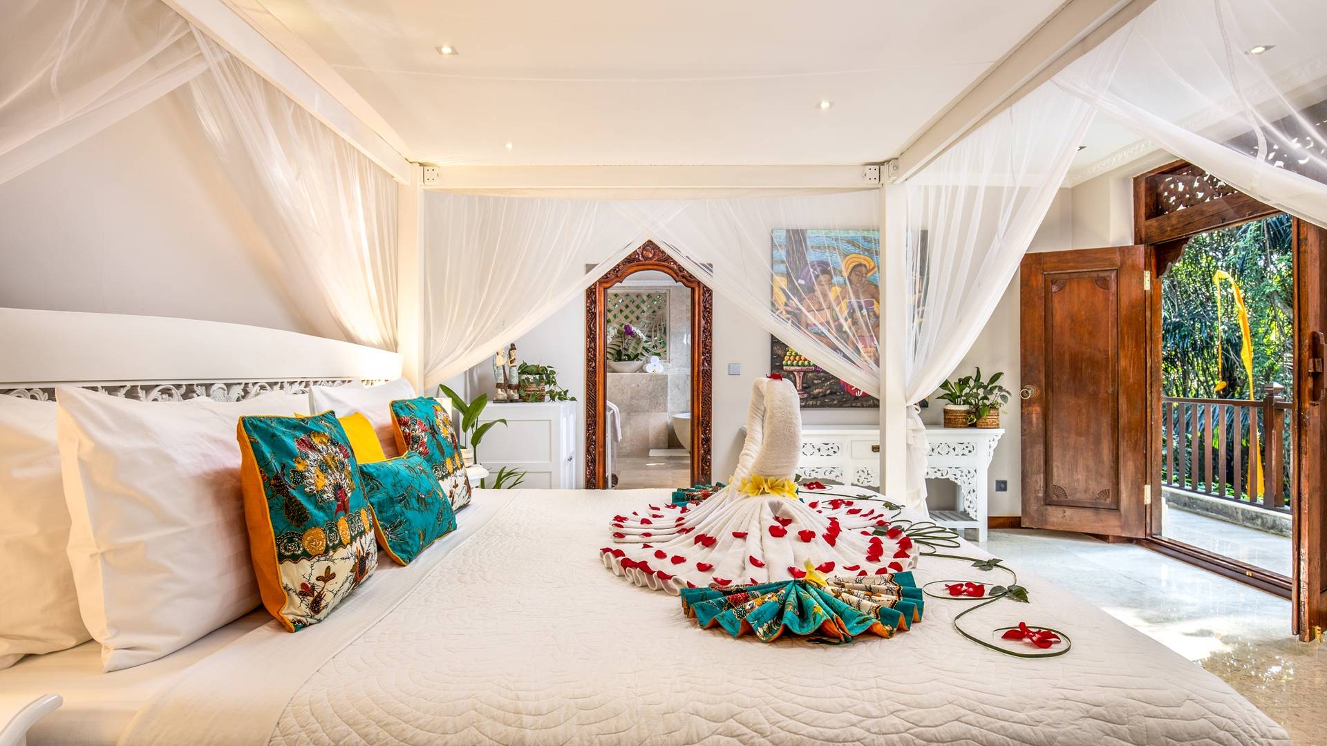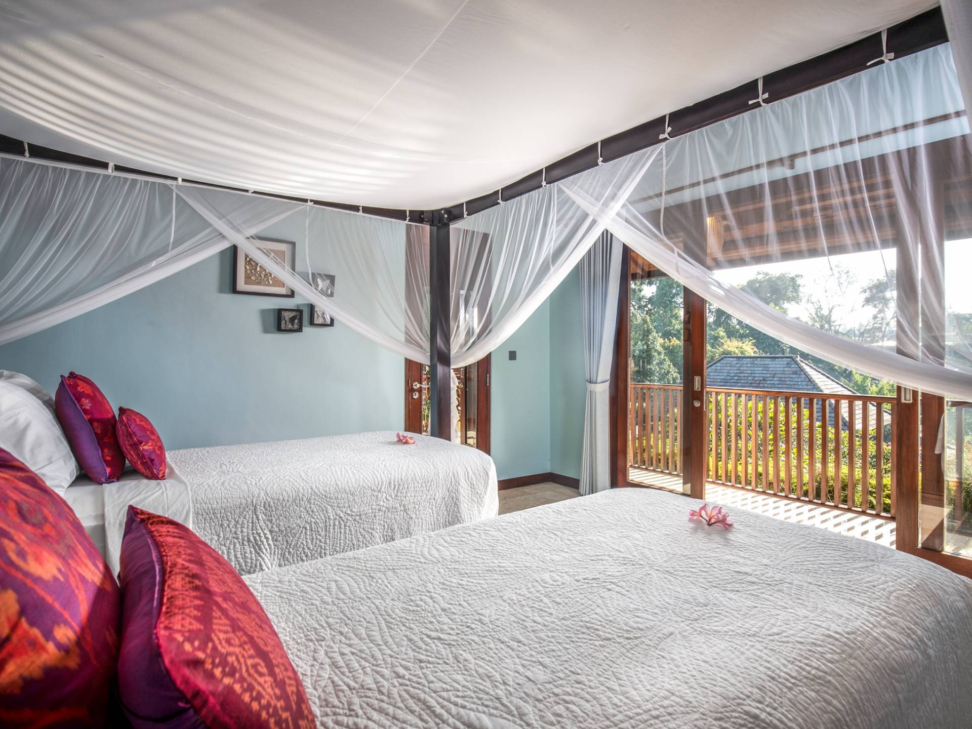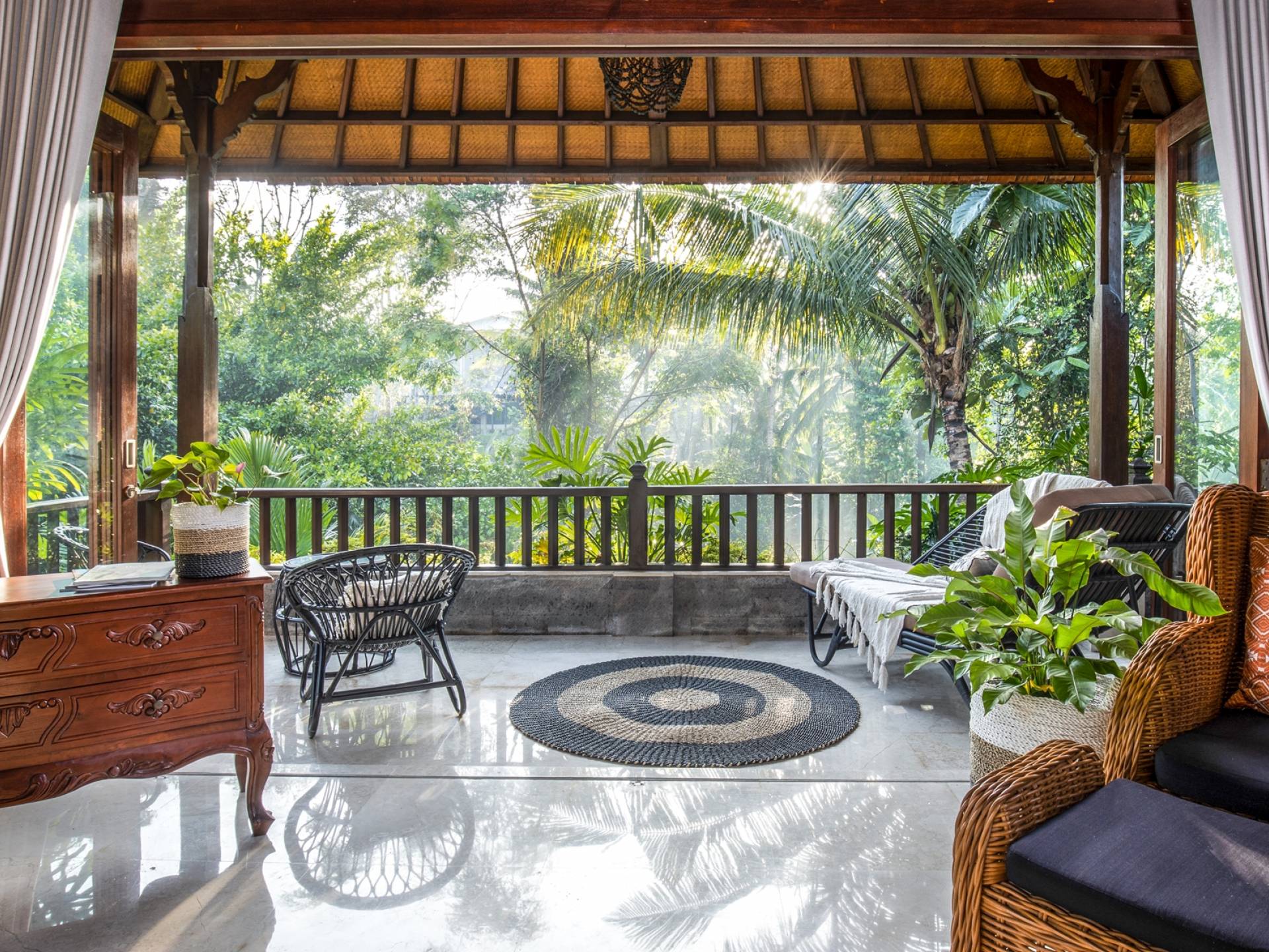 La Villa Kano Sari se compose de six suites réparties autour d'une belle piscine, dans de magnifiques jardins tropicaux surplombant les gorges de la rivière Jero Gadung. Conçu à l'origine comme une maison familiale de luxe, il y a une abondance d'espaces privés et communs bien pensés. Toutes les suites sont conçues et décorées individuellement. Ces chambres très spacieuses sont lumineuses et aérées, chacune avec sa propre terrasse extérieure privée. Tous les espaces de couchage sont climatisés et disposent de meubles fabriqués à la main sur mesure, de draps et de tissus d'ameublement balinais raffinés, de lampes de lecture et de moustiquaires drapées.