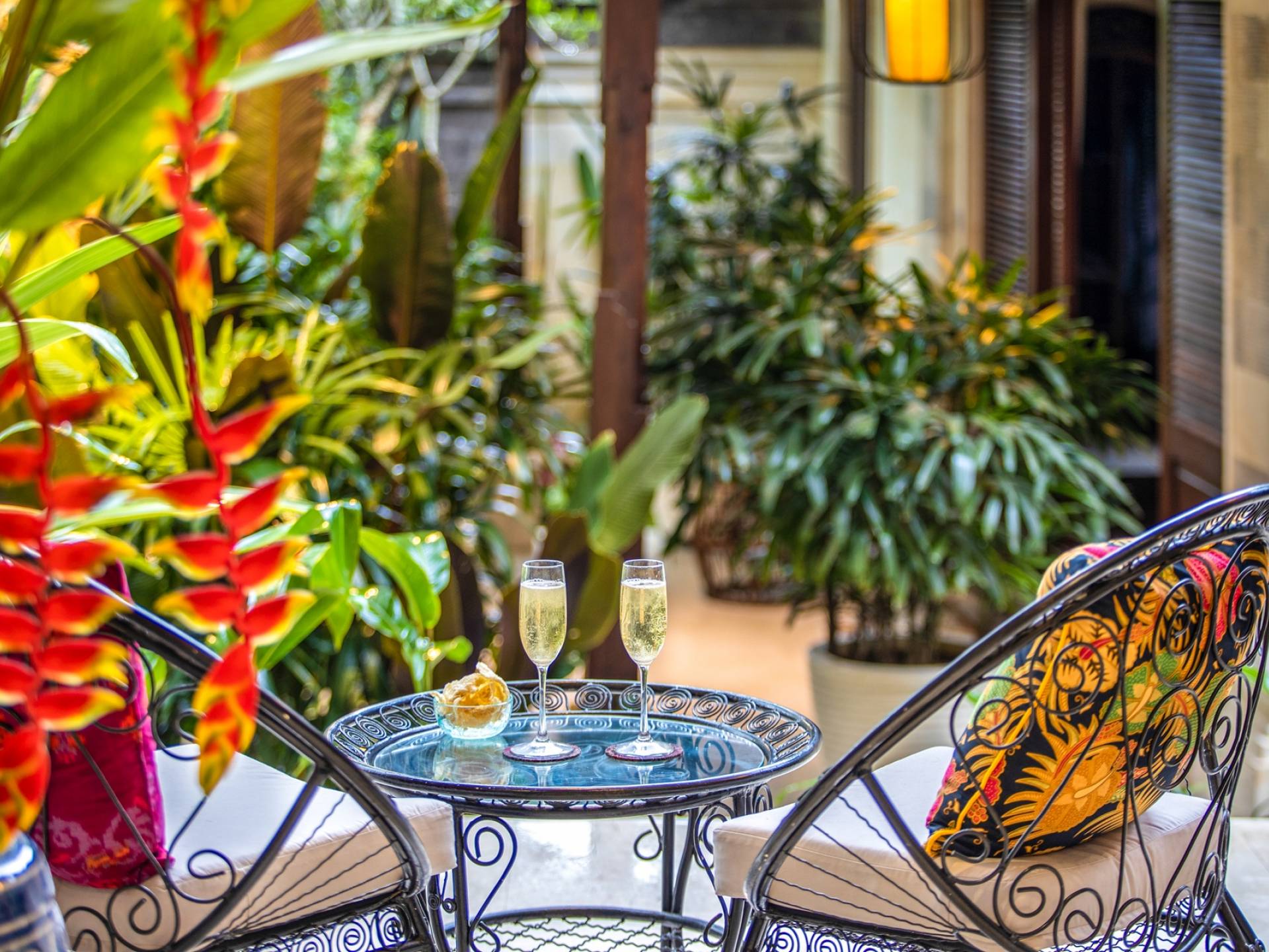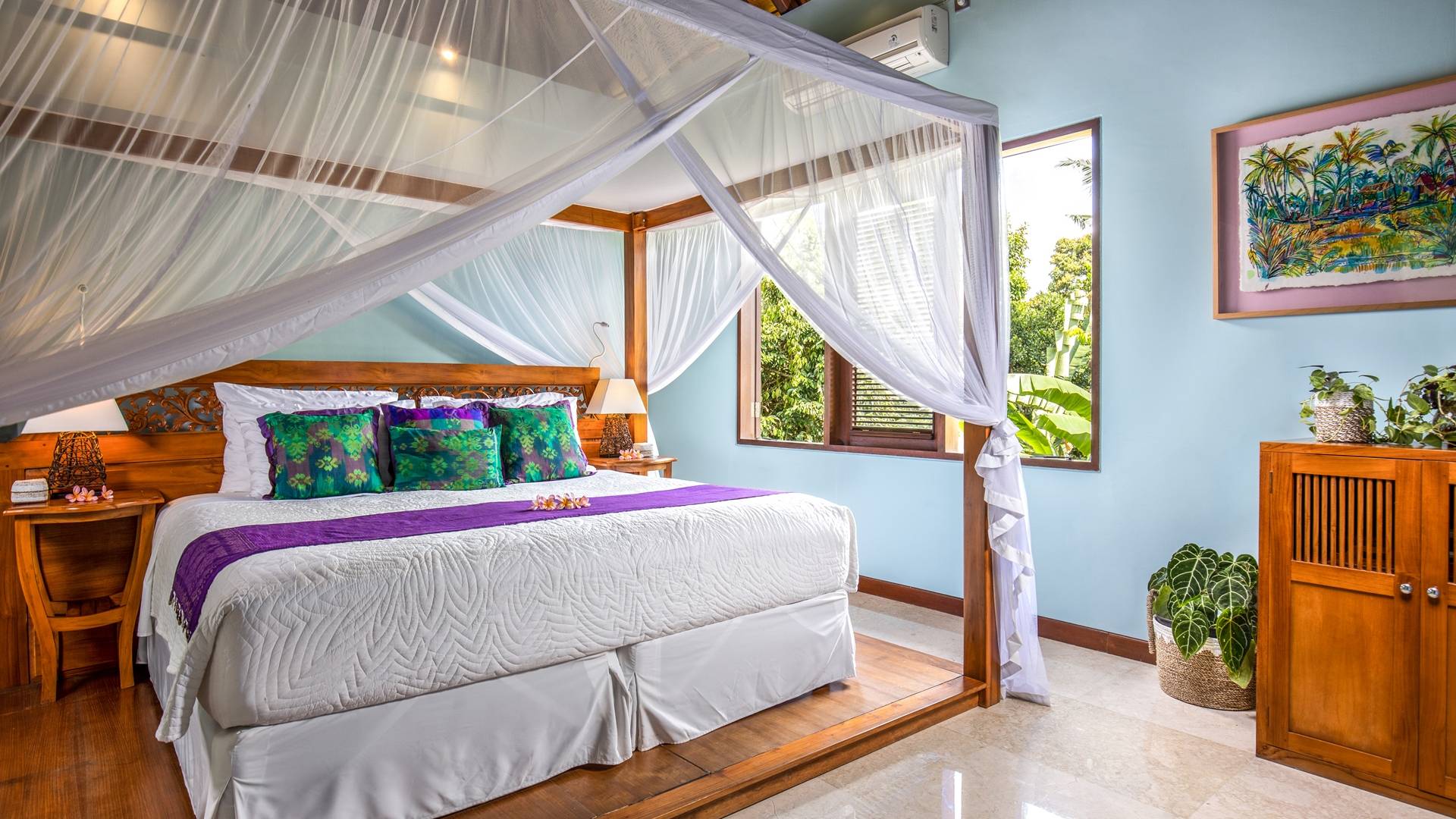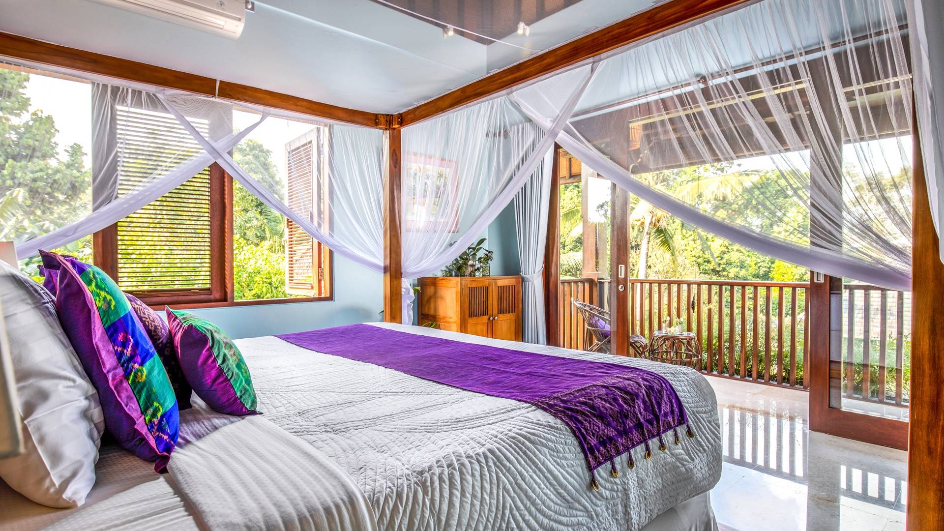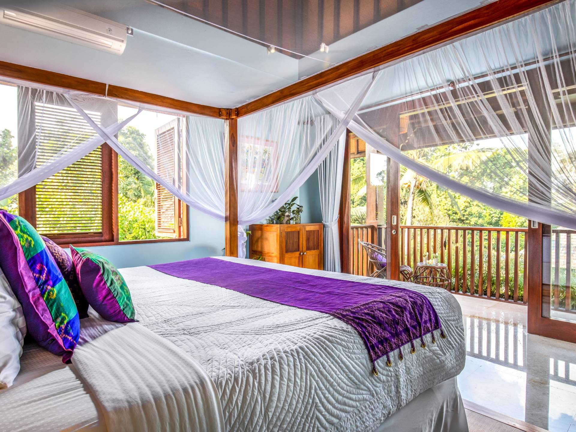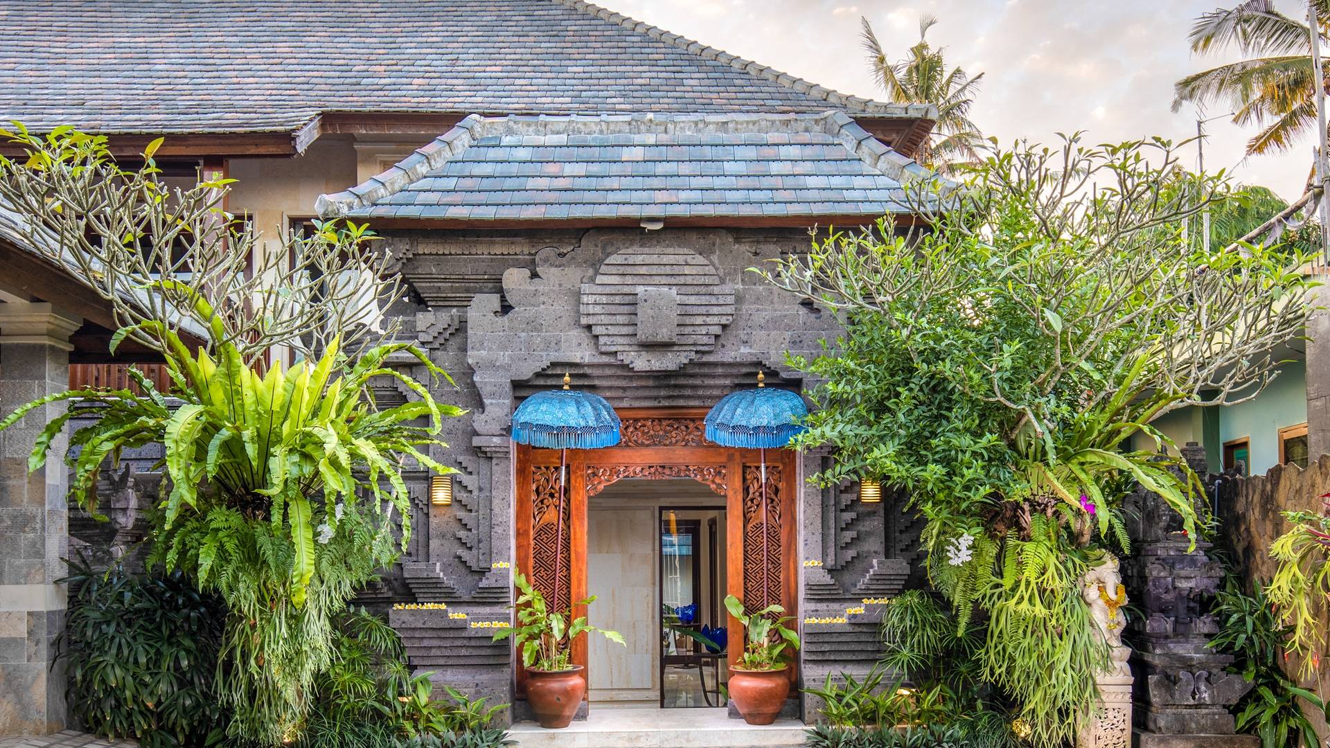 La Villa Kano Sari se compose de six suites réparties autour d'une belle piscine, dans de magnifiques jardins tropicaux surplombant les gorges de la rivière Jero Gadung. Conçu à l'origine comme une maison familiale de luxe, il y a une abondance d'espaces privés et communs bien pensés. Toutes les suites sont conçues et décorées individuellement. Ces chambres très spacieuses sont lumineuses et aérées, chacune avec sa propre terrasse extérieure privée. Tous les espaces de couchage sont climatisés et disposent de meubles fabriqués à la main sur mesure, de draps et de tissus d'ameublement balinais raffinés, de lampes de lecture et de moustiquaires drapées.
