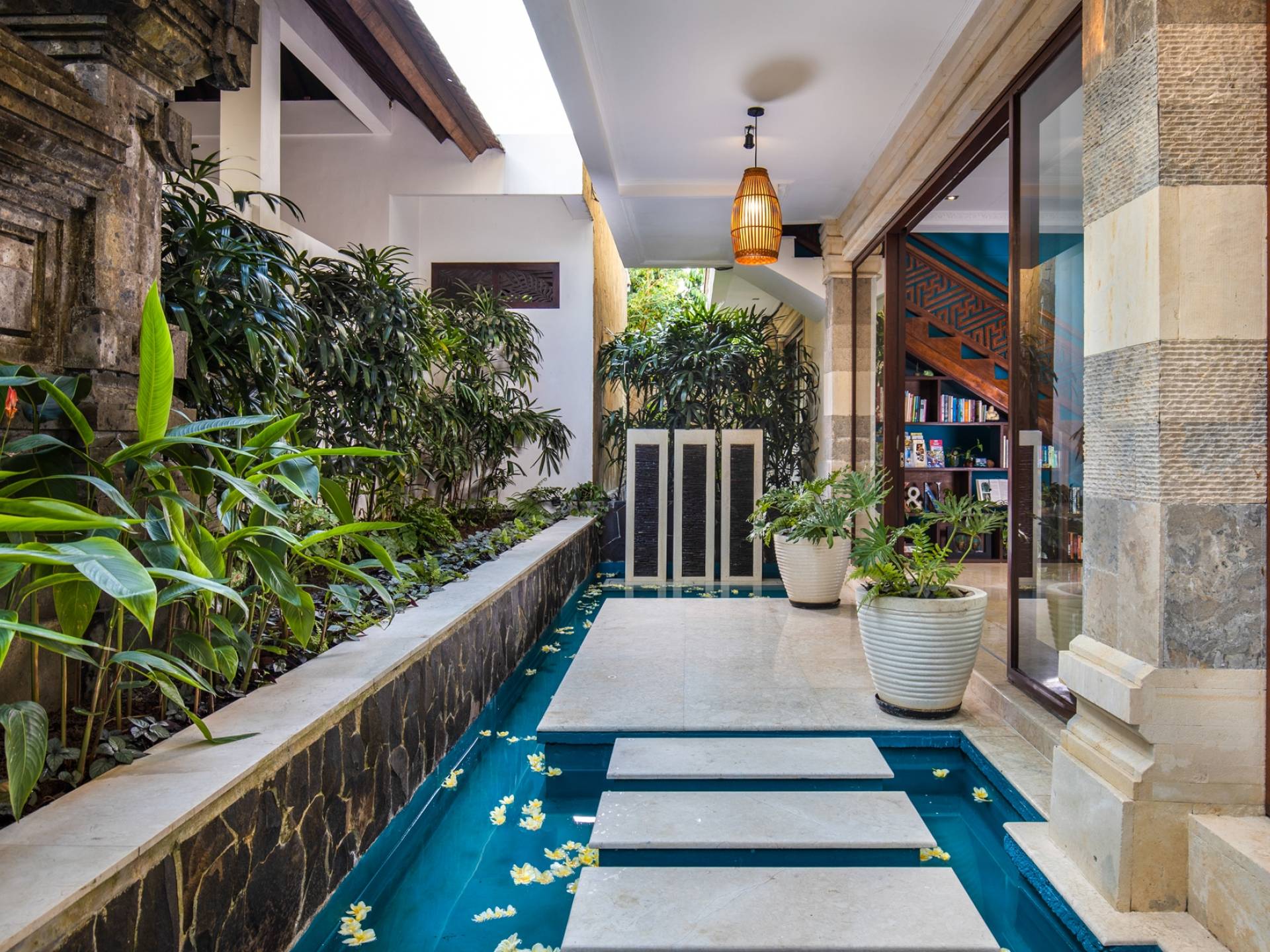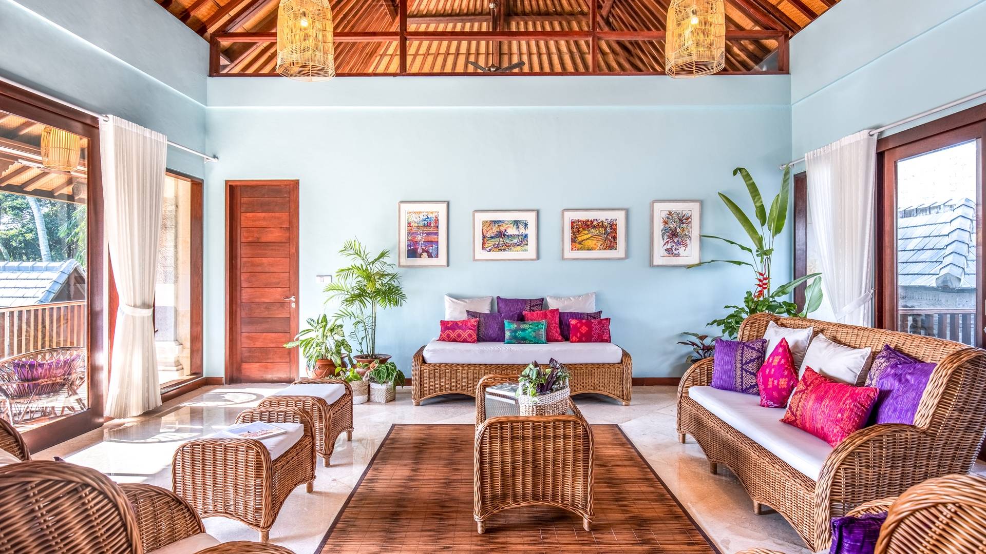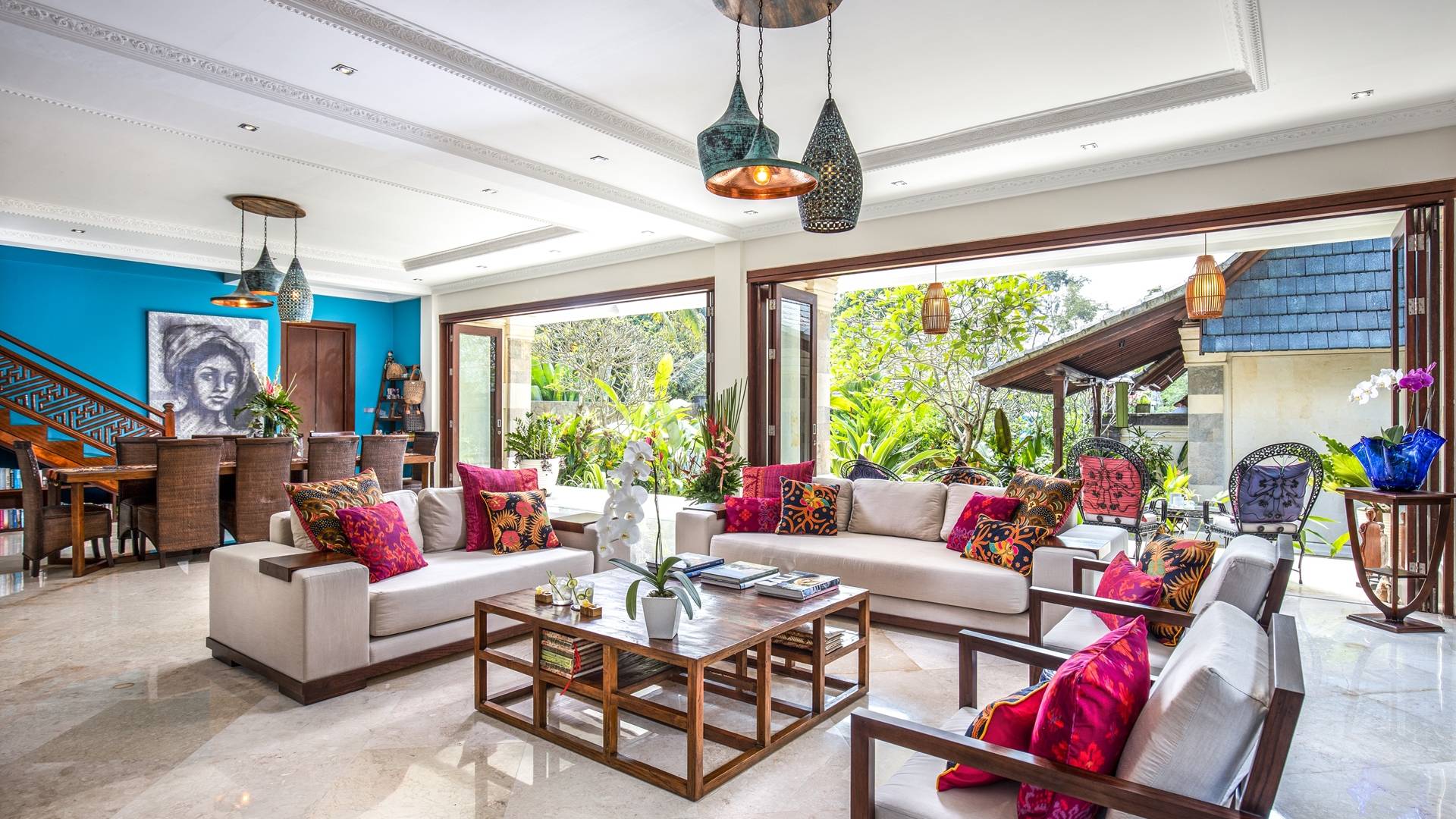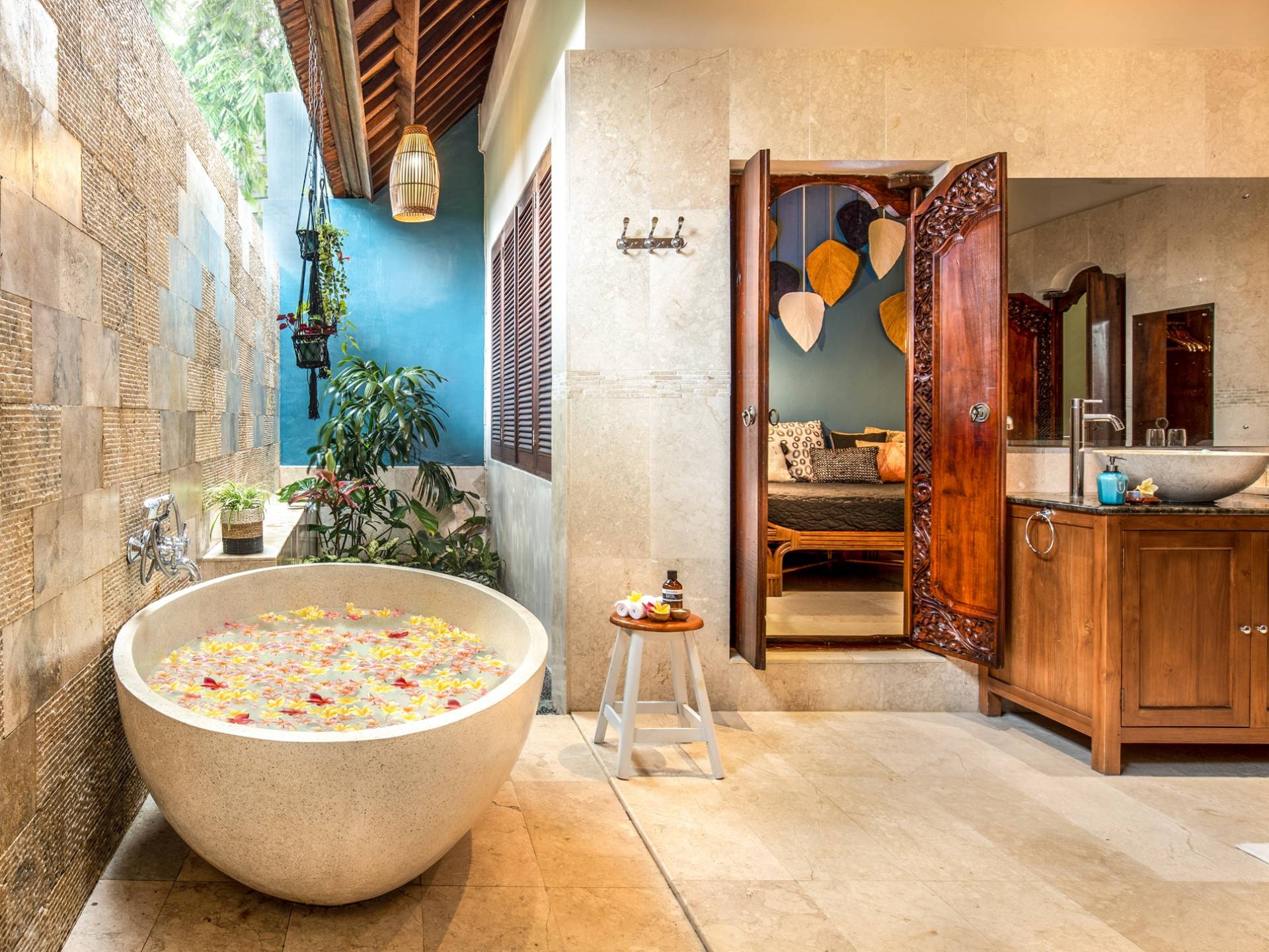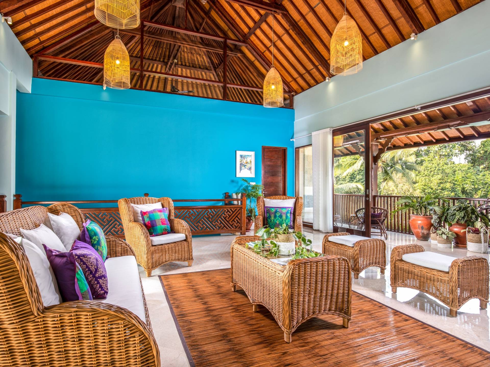 La Villa Kano Sari se compose de six suites réparties autour d'une belle piscine, dans de magnifiques jardins tropicaux surplombant les gorges de la rivière Jero Gadung. Conçu à l'origine comme une maison familiale de luxe, il y a une abondance d'espaces privés et communs bien pensés. Toutes les suites sont conçues et décorées individuellement. Ces chambres très spacieuses sont lumineuses et aérées, chacune avec sa propre terrasse extérieure privée. Tous les espaces de couchage sont climatisés et disposent de meubles fabriqués à la main sur mesure, de draps et de tissus d'ameublement balinais raffinés, de lampes de lecture et de moustiquaires drapées.