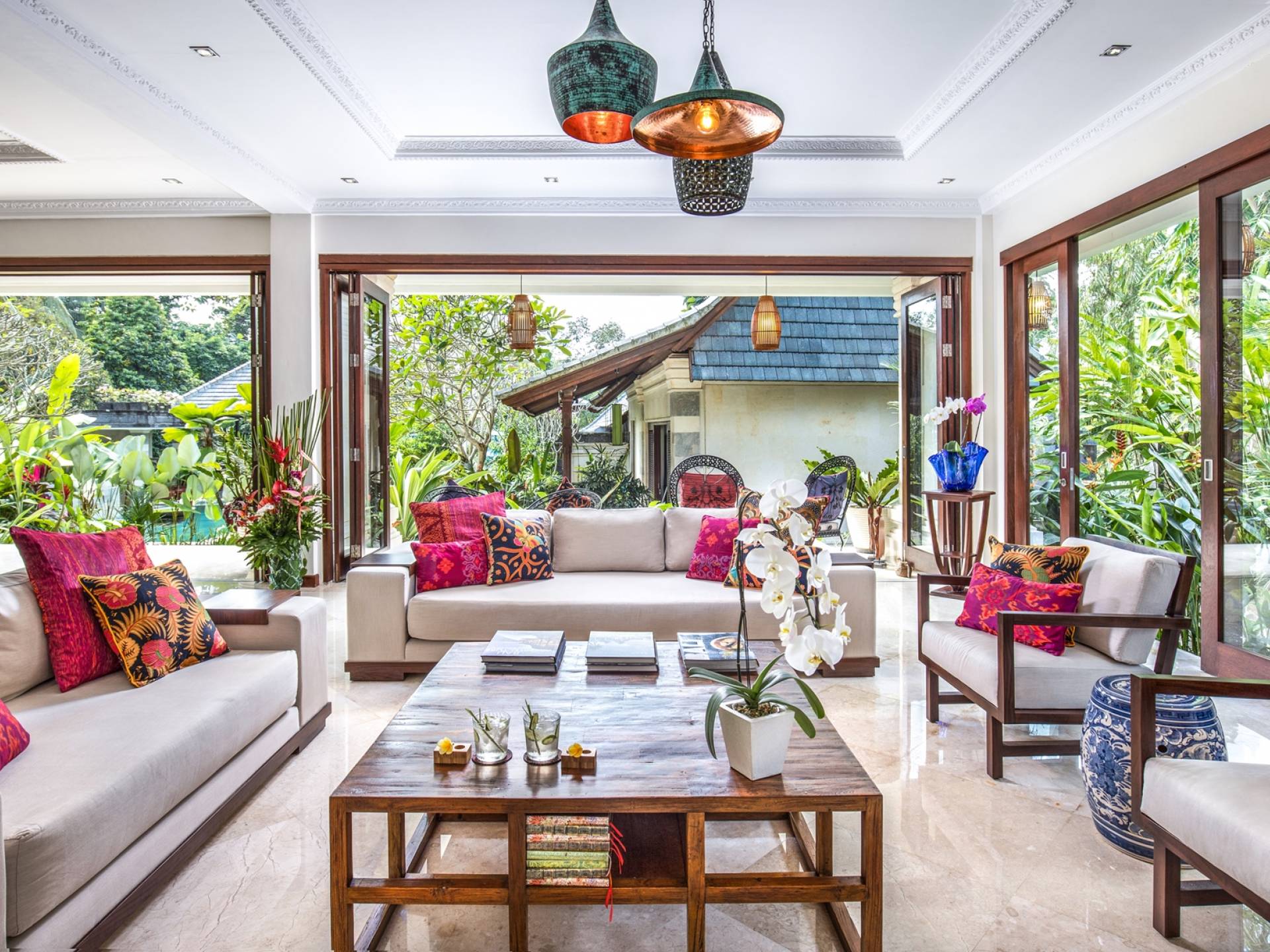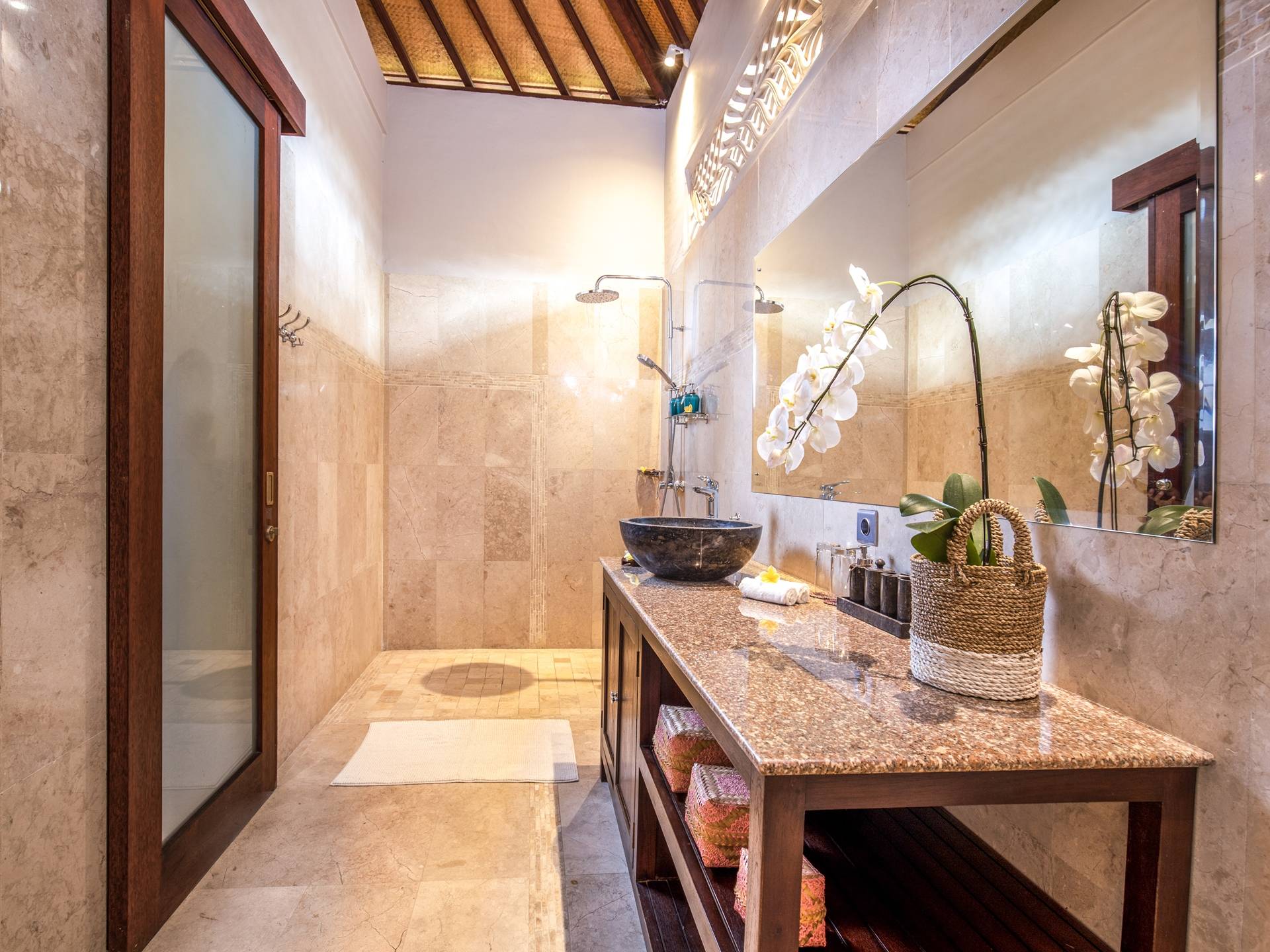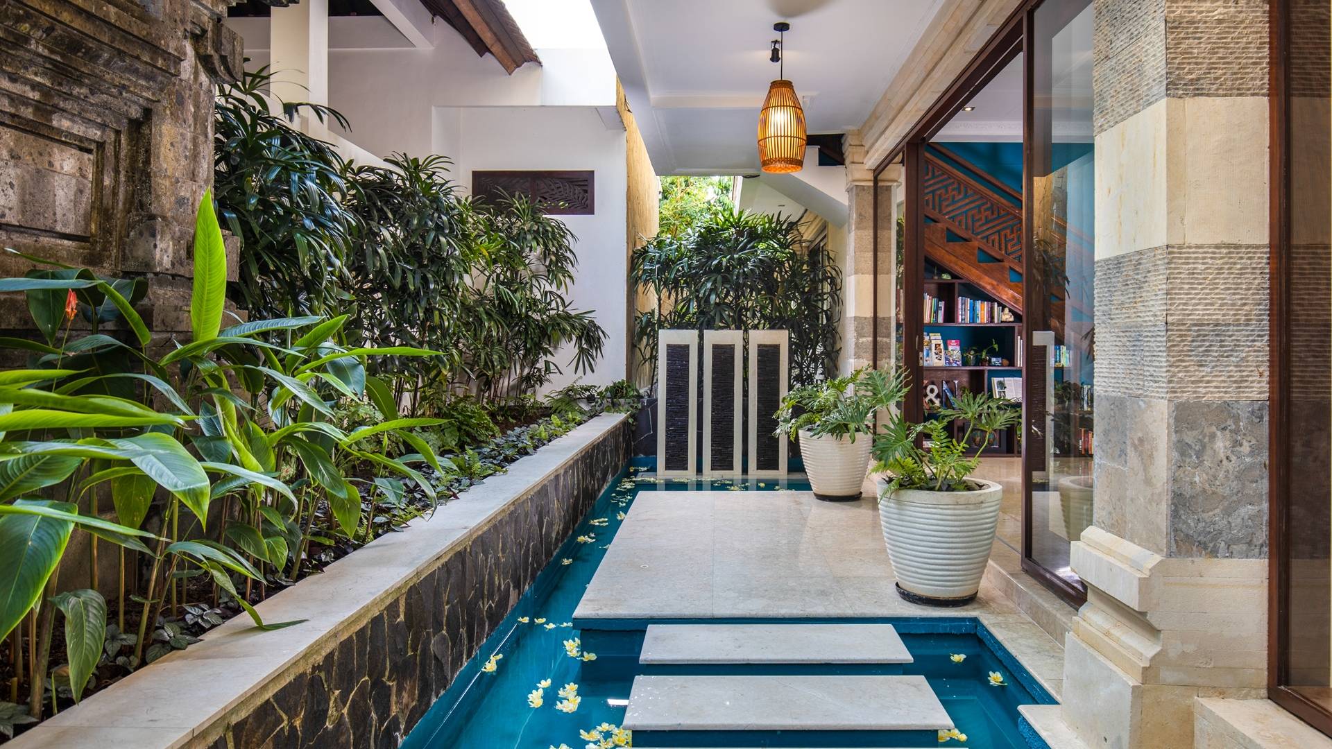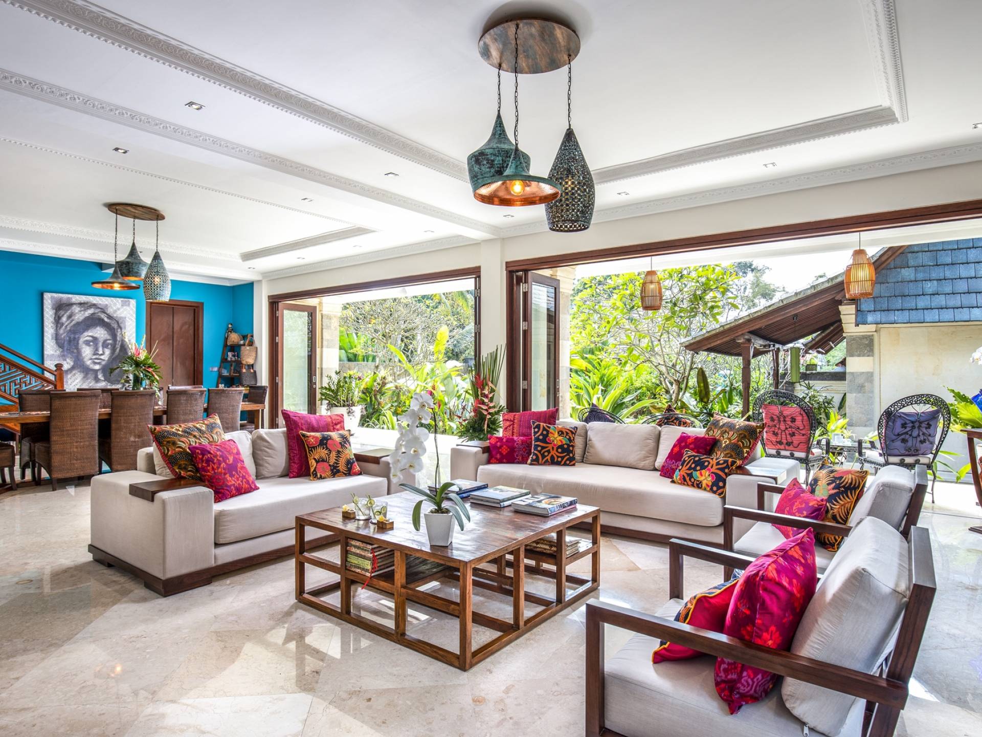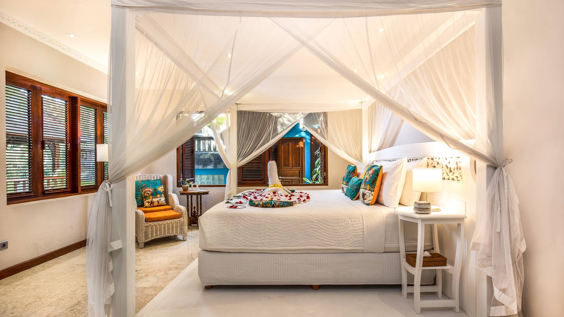 La Villa Kano Sari se compose de six suites réparties autour d'une belle piscine, dans de magnifiques jardins tropicaux surplombant les gorges de la rivière Jero Gadung. Conçu à l'origine comme une maison familiale de luxe, il y a une abondance d'espaces privés et communs bien pensés. Toutes les suites sont conçues et décorées individuellement. Ces chambres très spacieuses sont lumineuses et aérées, chacune avec sa propre terrasse extérieure privée. Tous les espaces de couchage sont climatisés et disposent de meubles fabriqués à la main sur mesure, de draps et de tissus d'ameublement balinais raffinés, de lampes de lecture et de moustiquaires drapées.