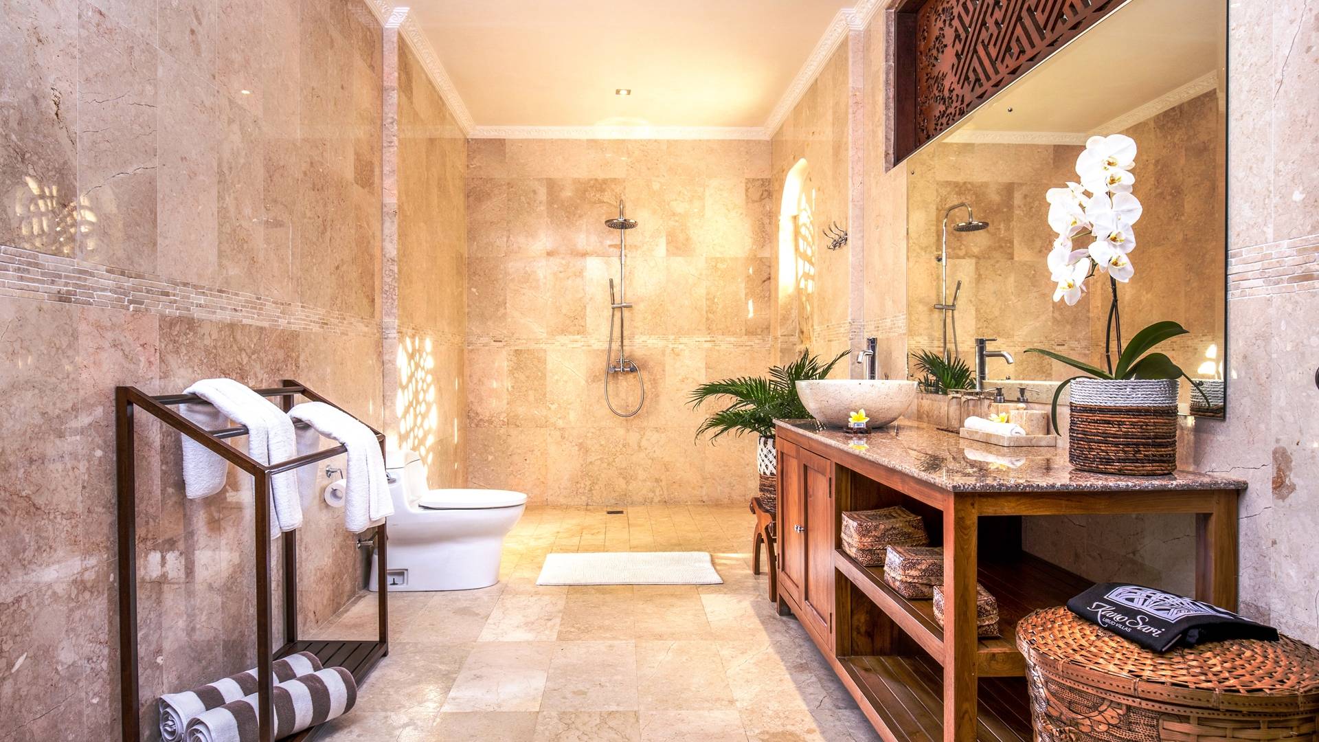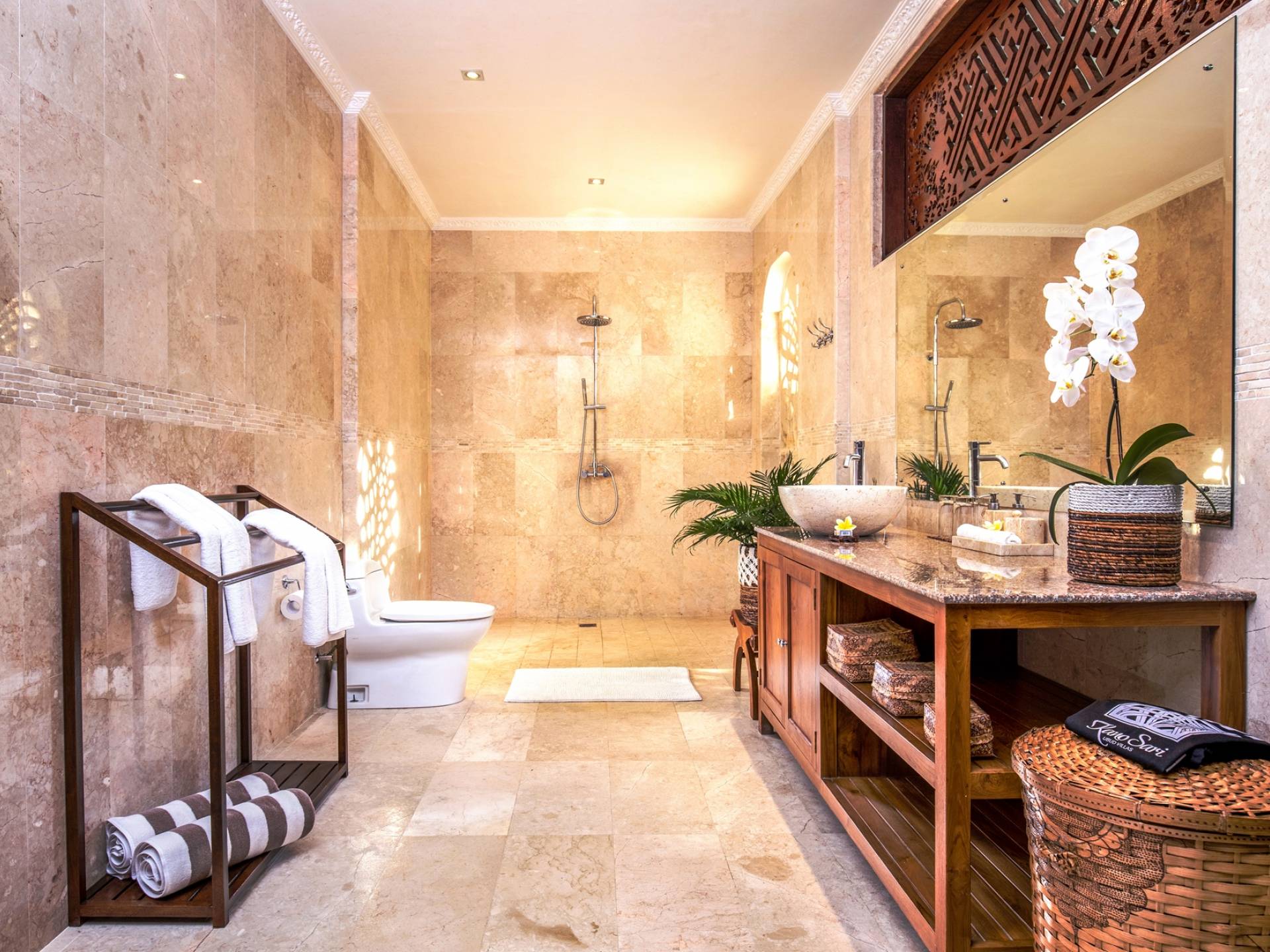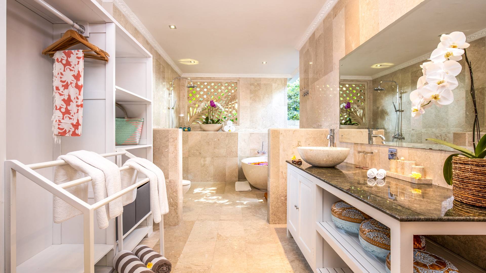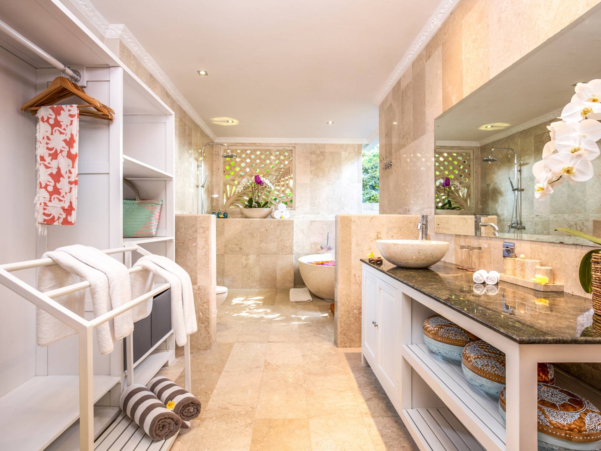 Les salles de bains luxueuses en marbre sont généreusement aménagées avec des douches à effet pluie, des articles de toilette haut de gamme, un sèche-cheveux, des serviettes de grande taille et une armoire avec un coffre-fort numérique. Chaque suite est également équipée d'un bar-réfrigérateur bien approvisionné, d'un plateau/bouilloire et d'eau potable filtrée à volonté. Internet haut débit gratuit est disponible dans tout le complexe.