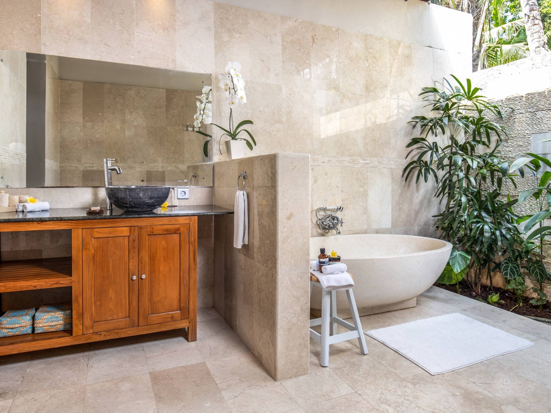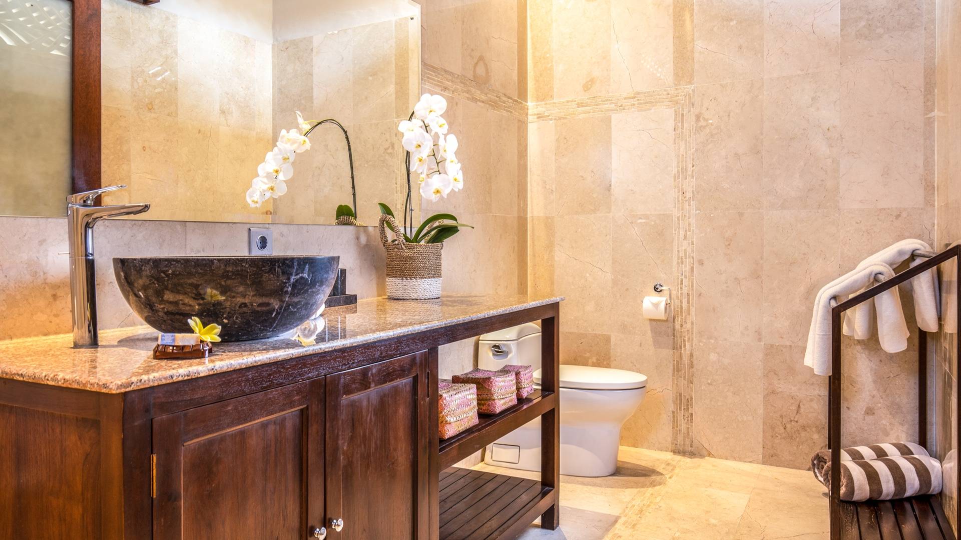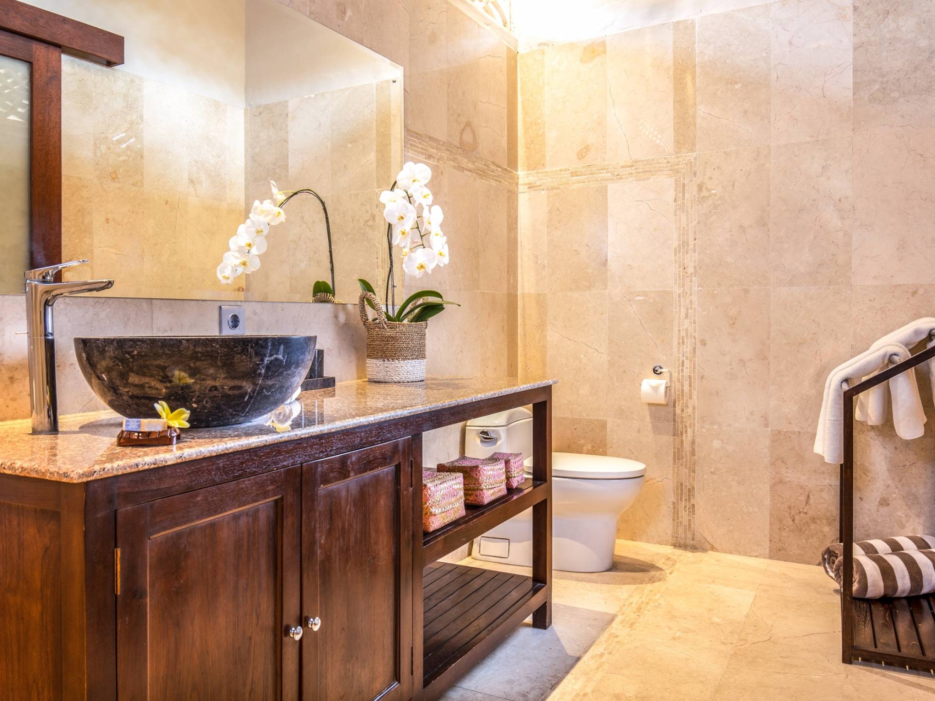 Les salles de bains luxueuses en marbre sont généreusement aménagées avec des douches à effet pluie, des articles de toilette haut de gamme, un sèche-cheveux, des serviettes de grande taille et une armoire avec un coffre-fort numérique. Chaque suite est également équipée d'un bar-réfrigérateur bien approvisionné, d'un plateau/bouilloire et d'eau potable filtrée à volonté. Internet haut débit gratuit est disponible dans tout le complexe.