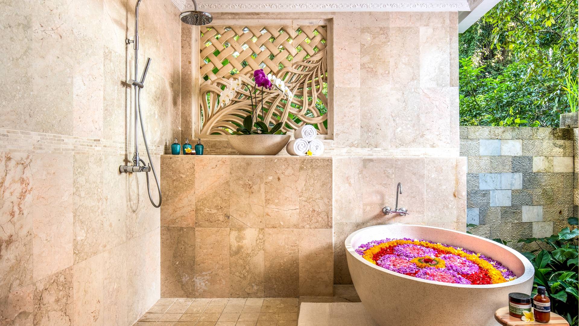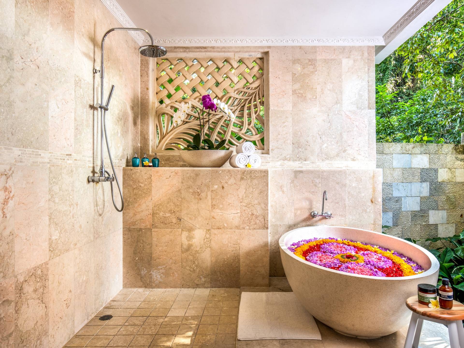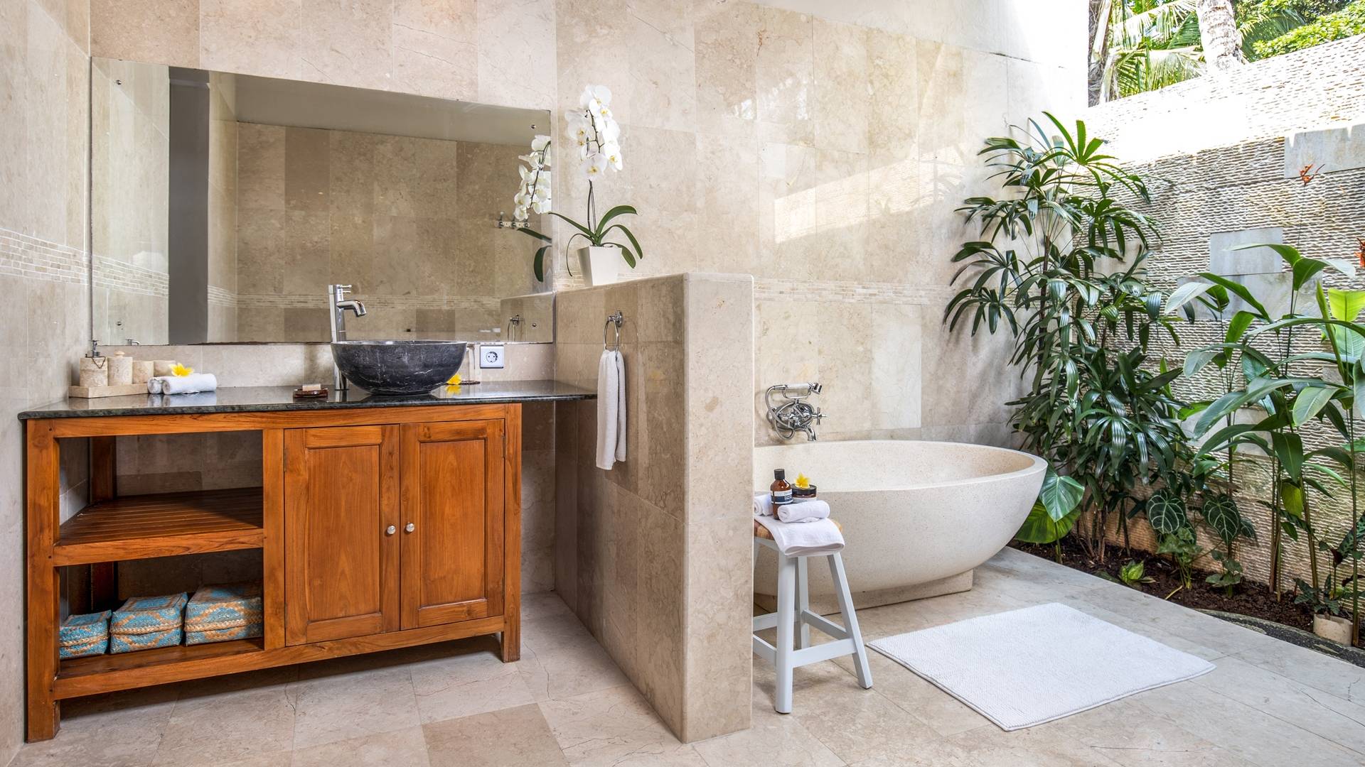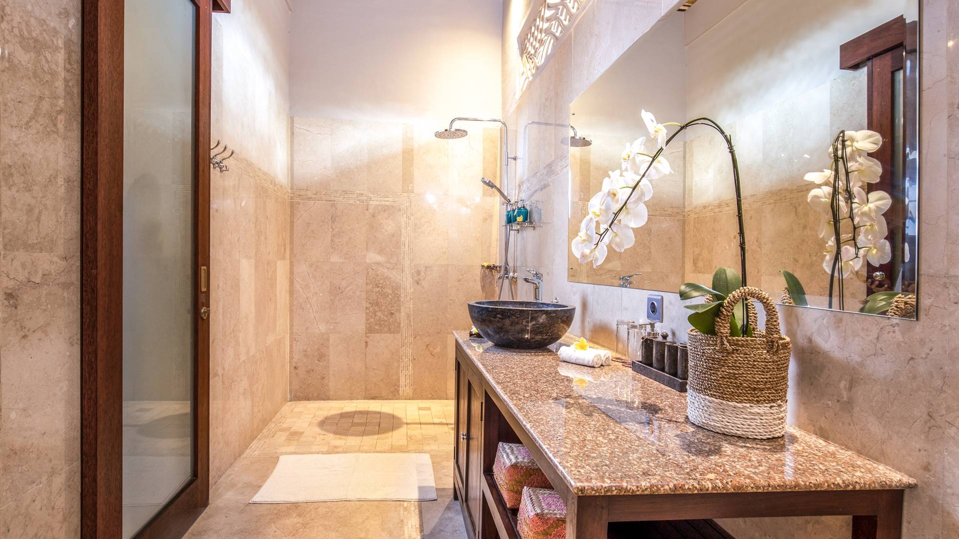 Les salles de bains luxueuses en marbre sont généreusement aménagées avec des douches à effet pluie, des articles de toilette haut de gamme, un sèche-cheveux, des serviettes de grande taille et une armoire avec un coffre-fort numérique. Chaque suite est également équipée d'un bar-réfrigérateur bien approvisionné, d'un plateau/bouilloire et d'eau potable filtrée à volonté. Internet haut débit gratuit est disponible dans tout le complexe.
