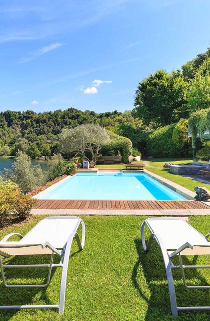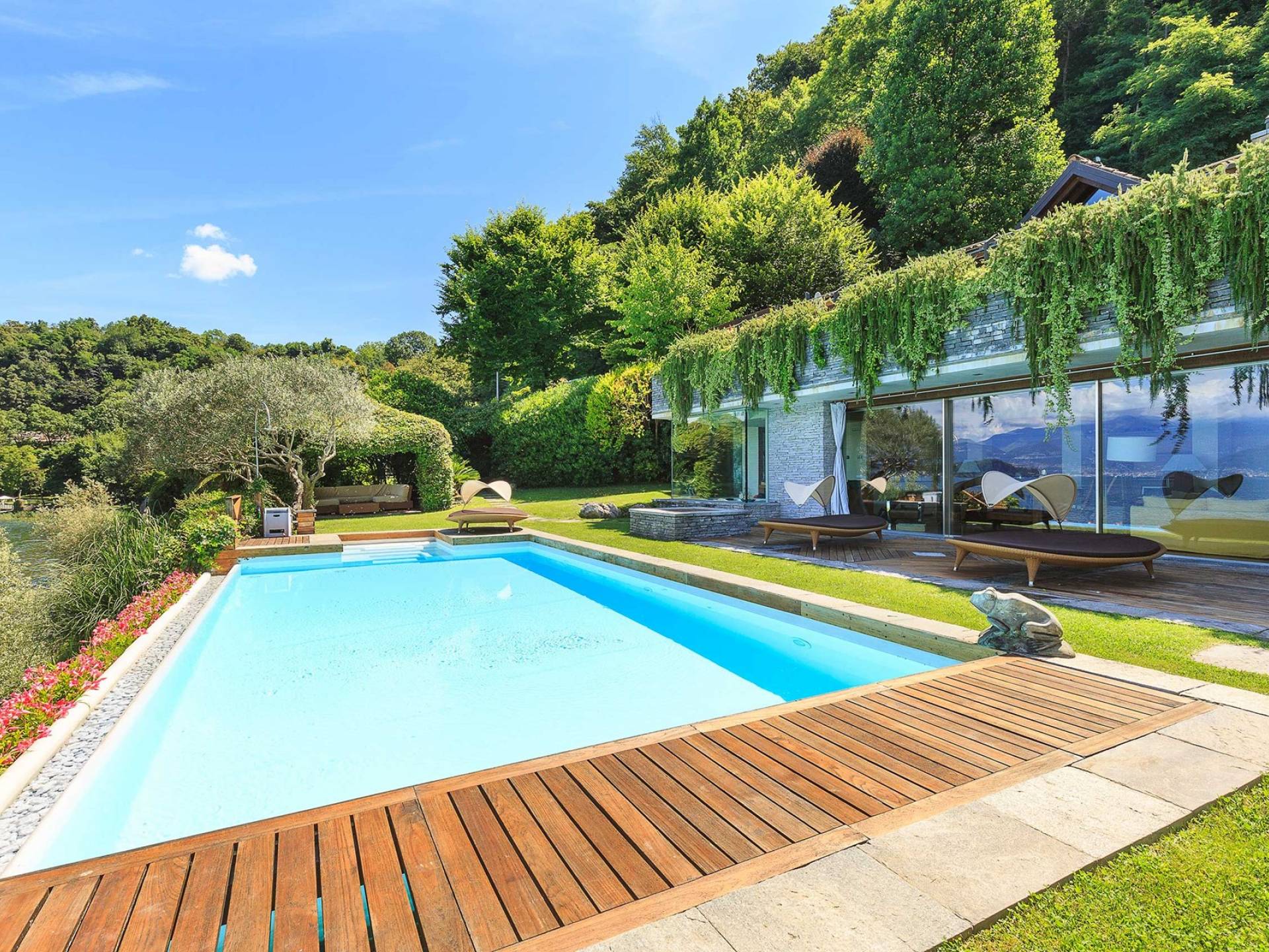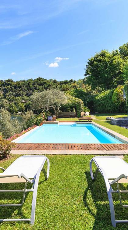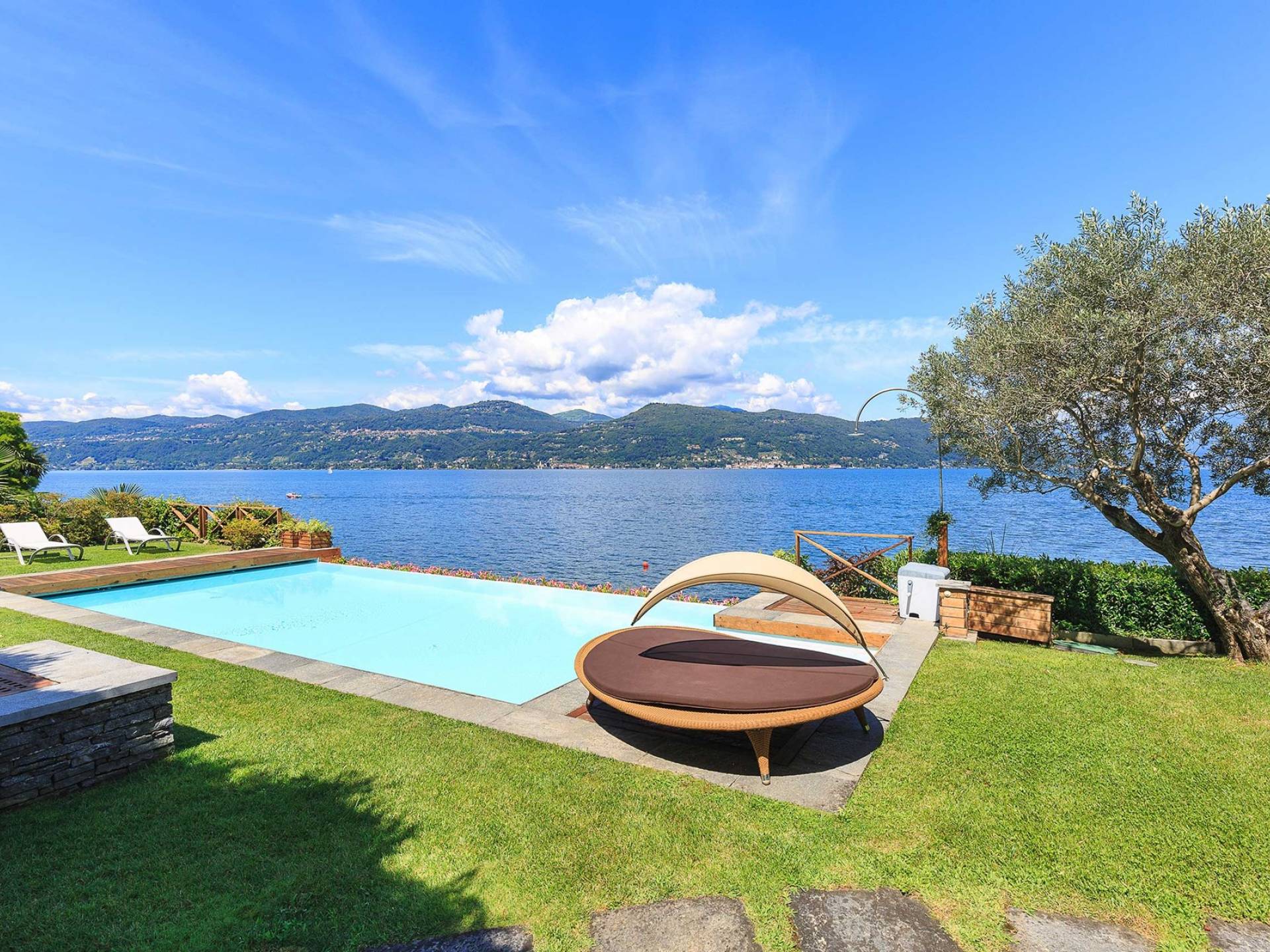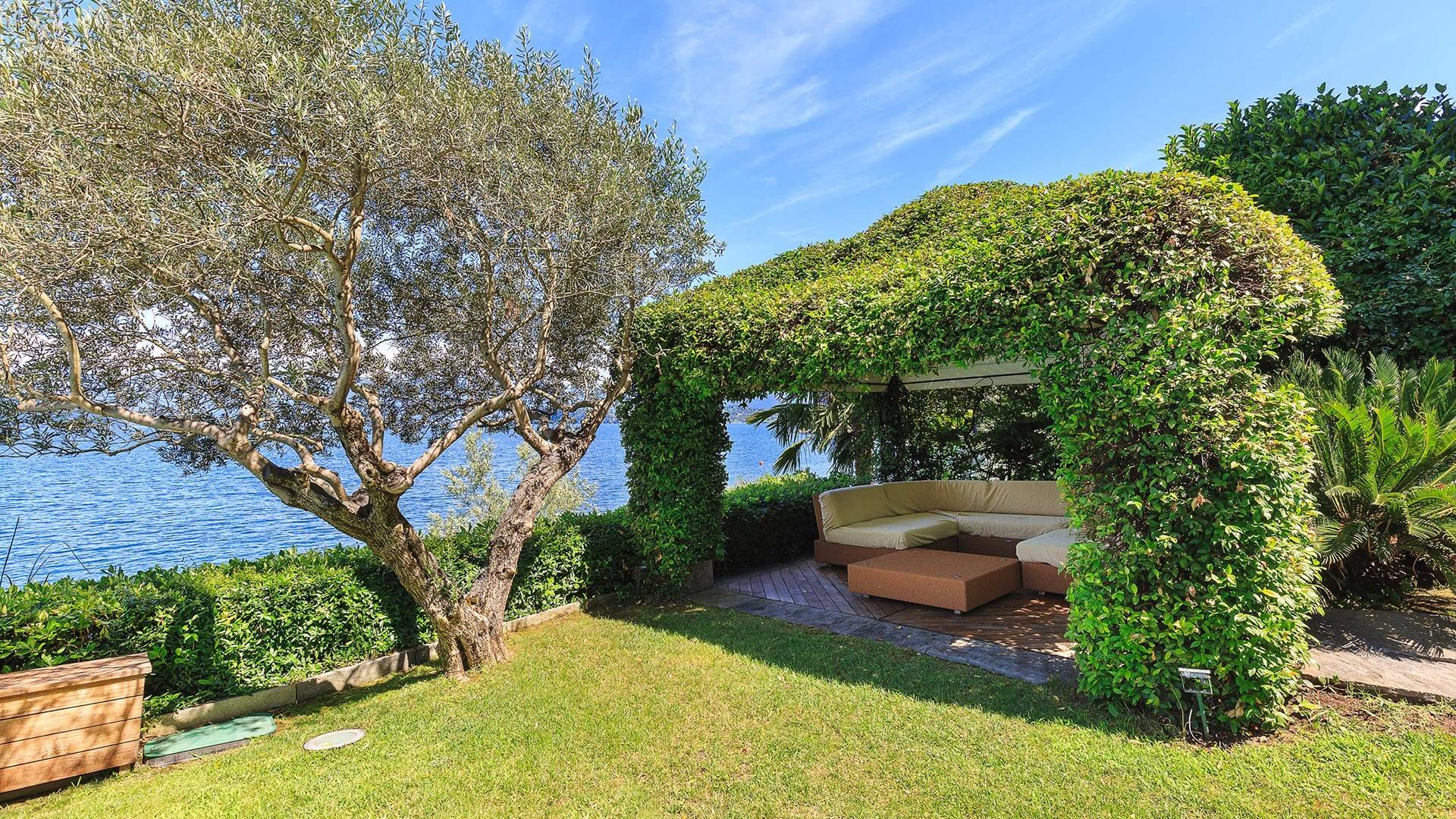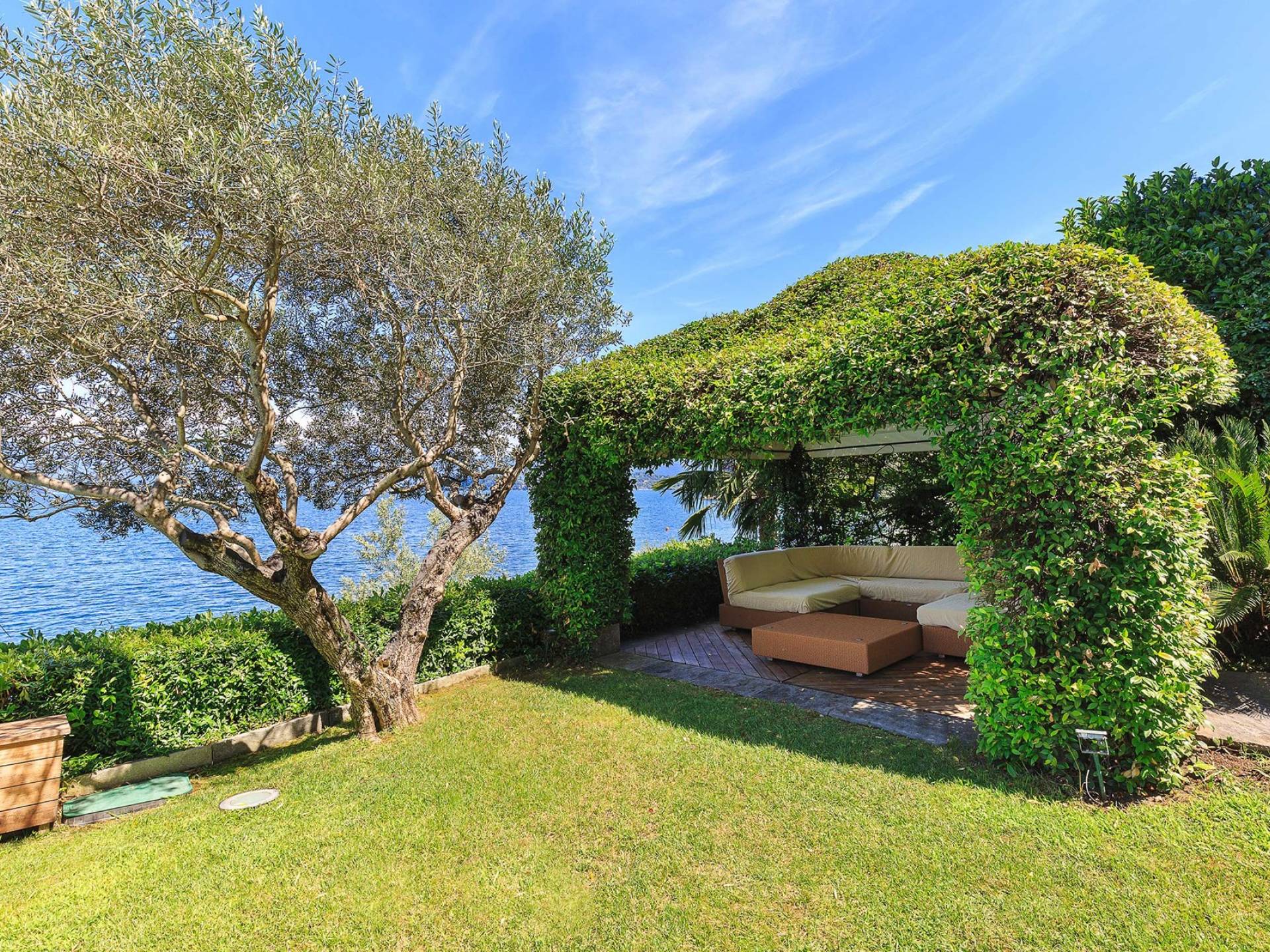 L'extérieur continuera de vous impressionner avec son jardin en terrasse avec plusieurs coins et pelouses pour s'asseoir et se détendre. La zone de la piscine comprend une piscine à débordement (équipée d'un système de nage à contre-courant) entourée de chaises longues et de lits, d'une douche extérieure et d'un joli belvédère fleuri avec des canapés pour rêver tout en regardant les bateaux qui passent. En suivant les escaliers en pierre, vous arriverez à une plage de galets pour une baignade rafraîchissante dans le lac.