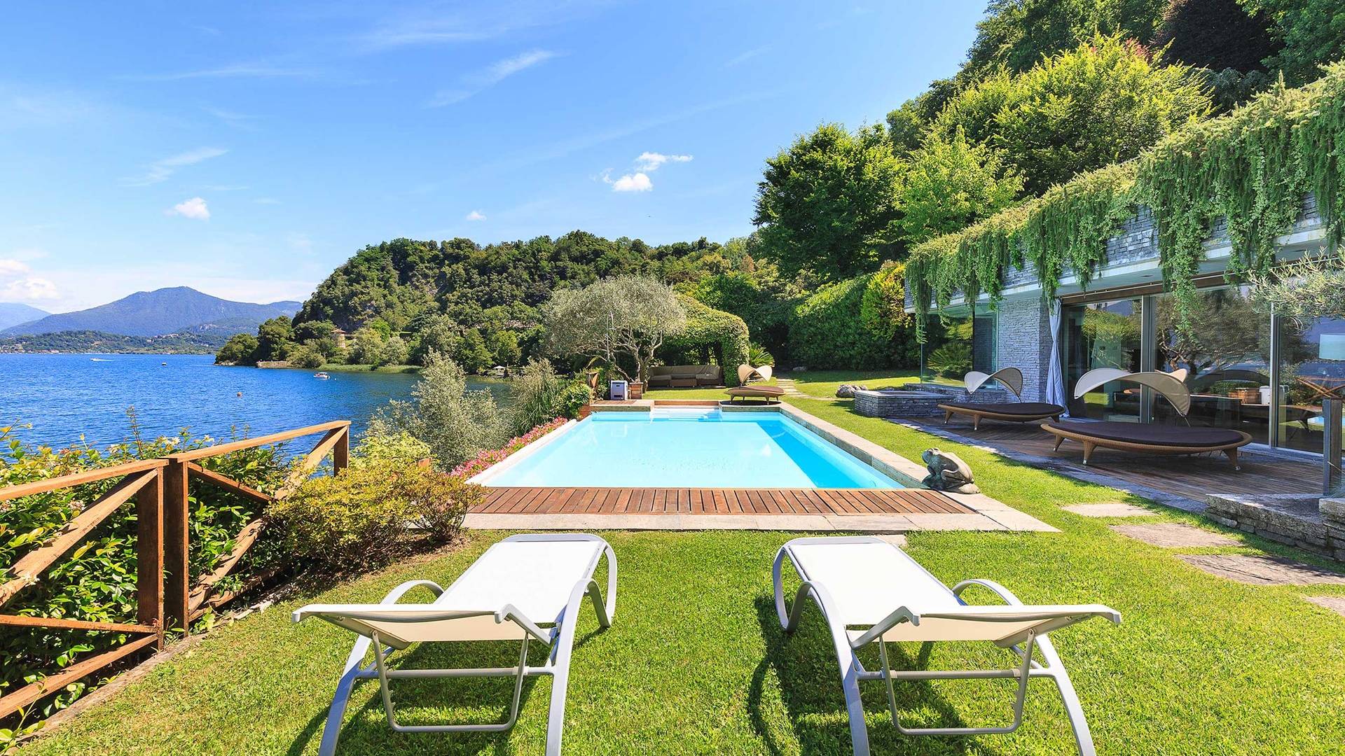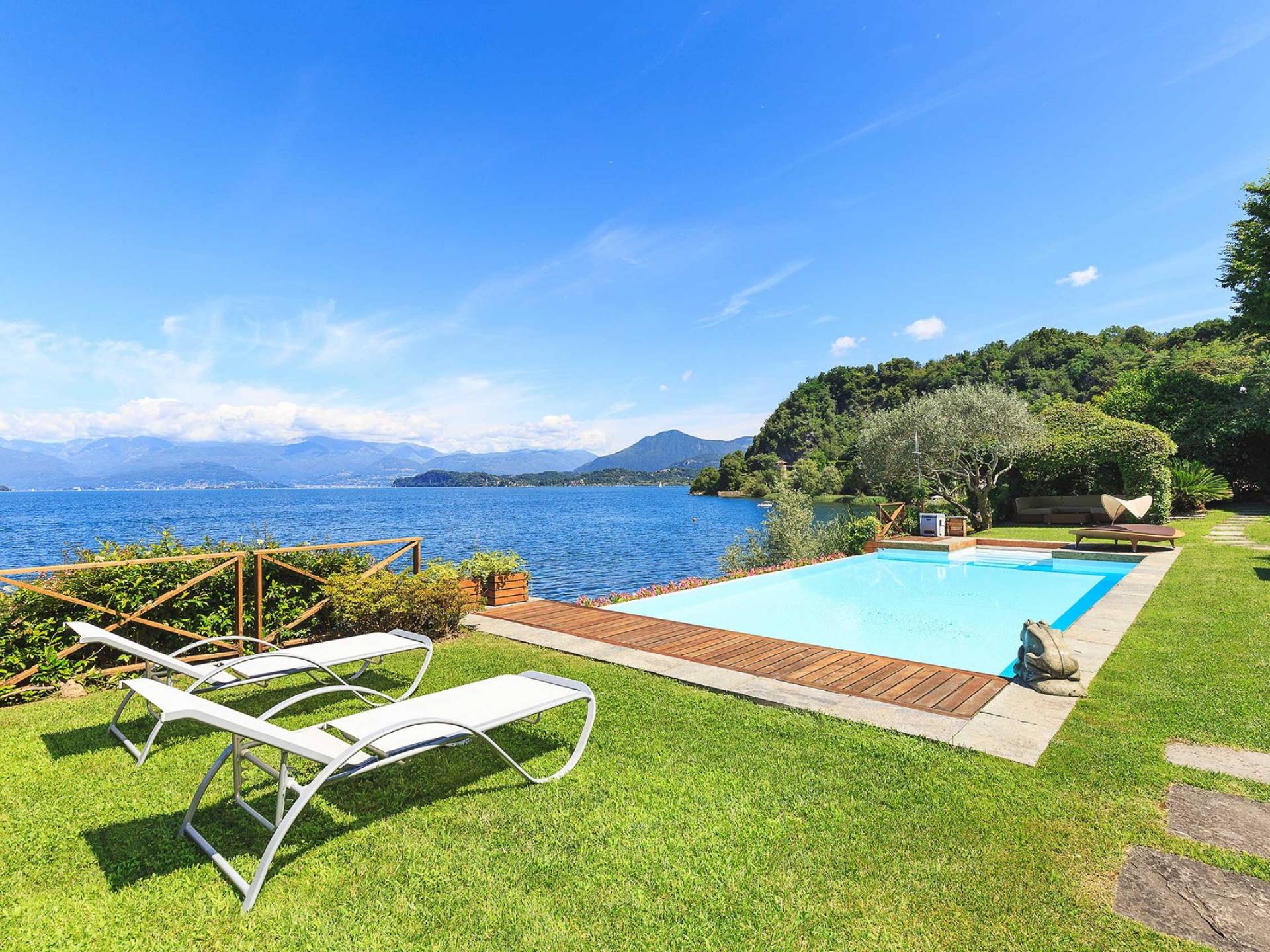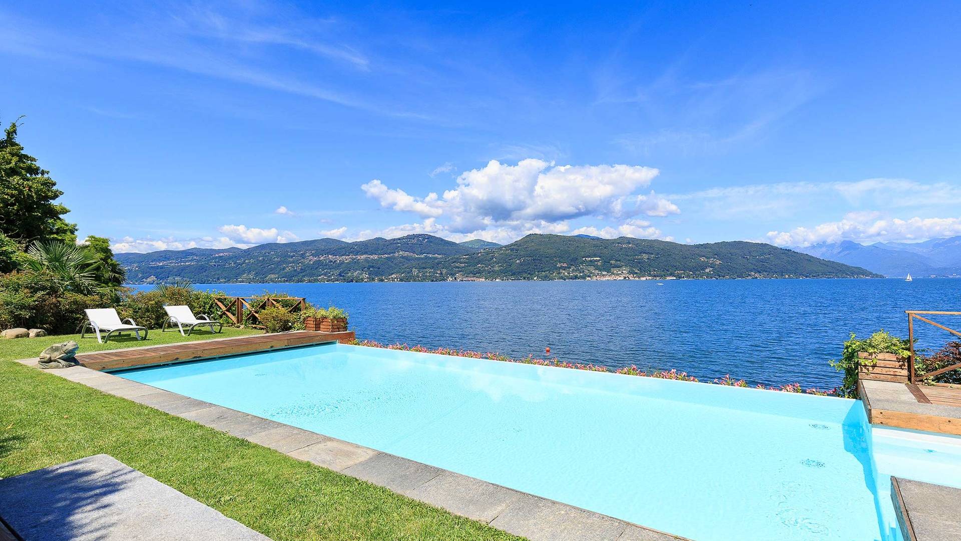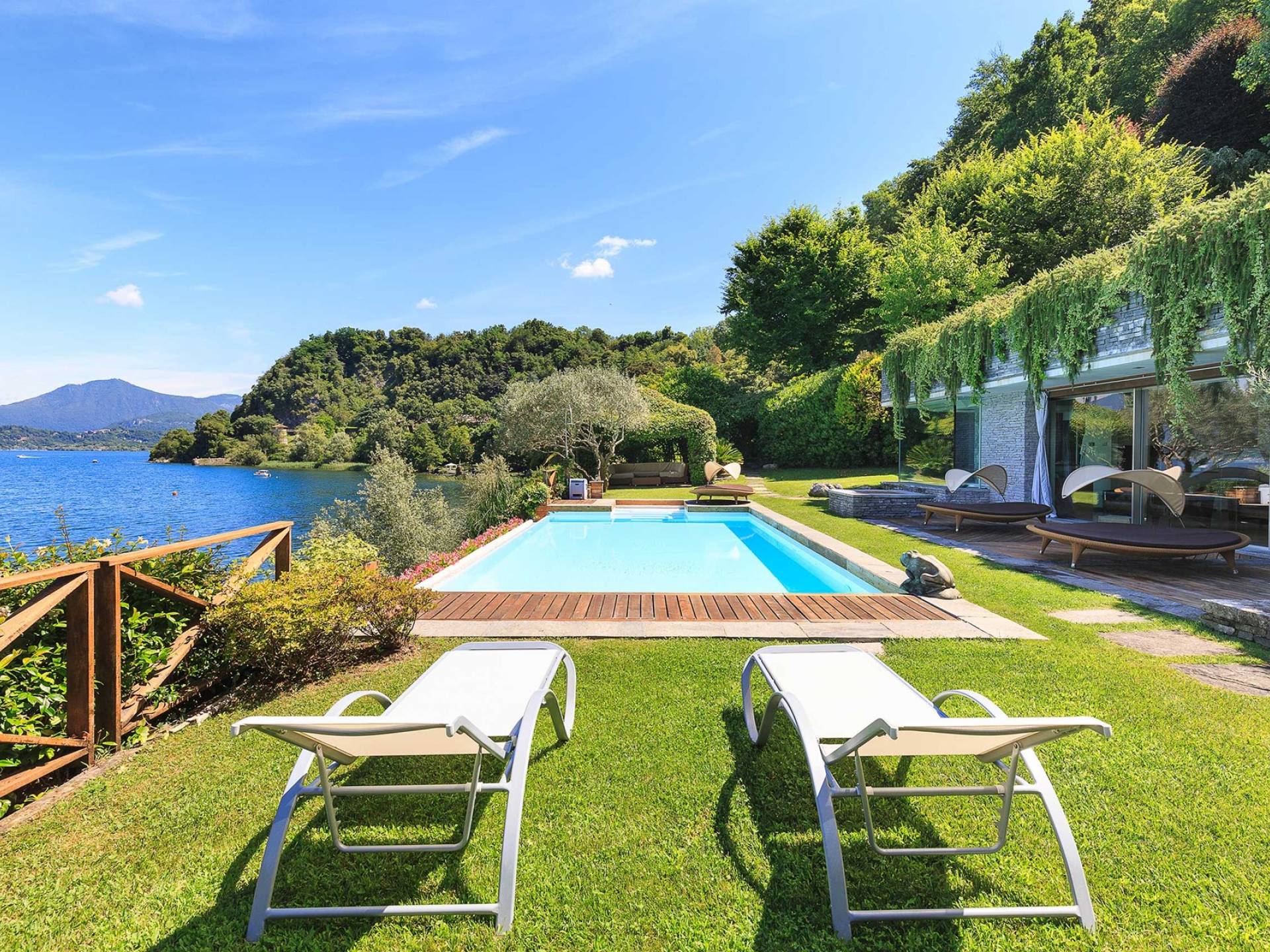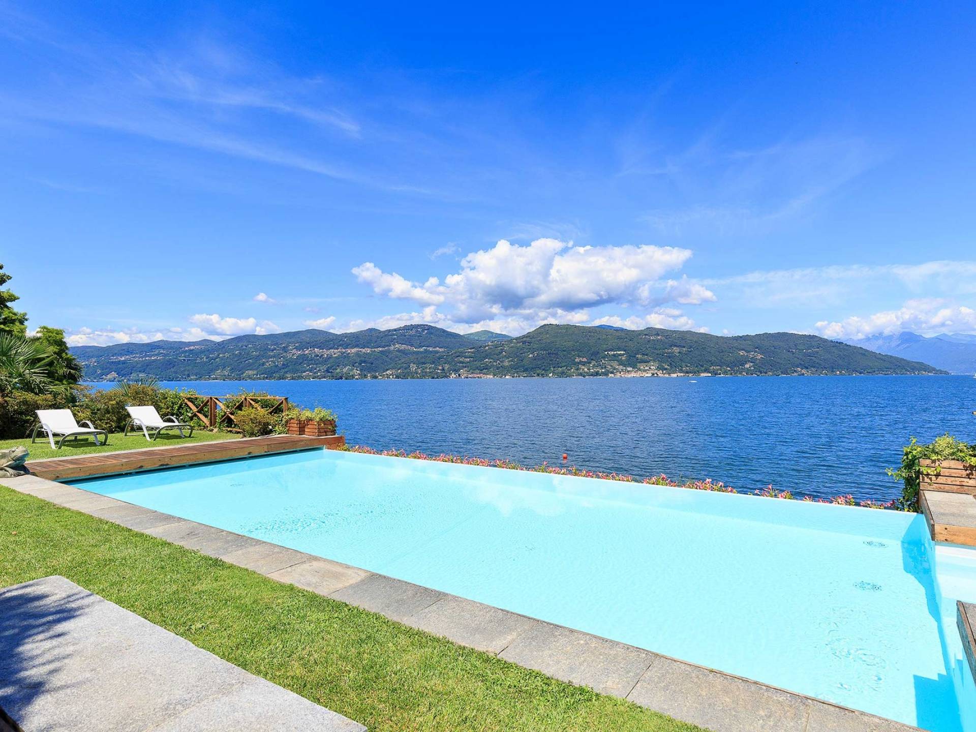 L'extérieur continuera de vous impressionner avec son jardin en terrasse avec plusieurs coins et pelouses pour s'asseoir et se détendre. La zone de la piscine comprend une piscine à débordement (équipée d'un système de nage à contre-courant) entourée de chaises longues et de lits, d'une douche extérieure et d'un joli belvédère fleuri avec des canapés pour rêver tout en regardant les bateaux qui passent. En suivant les escaliers en pierre, vous arriverez à une plage de galets pour une baignade rafraîchissante dans le lac.