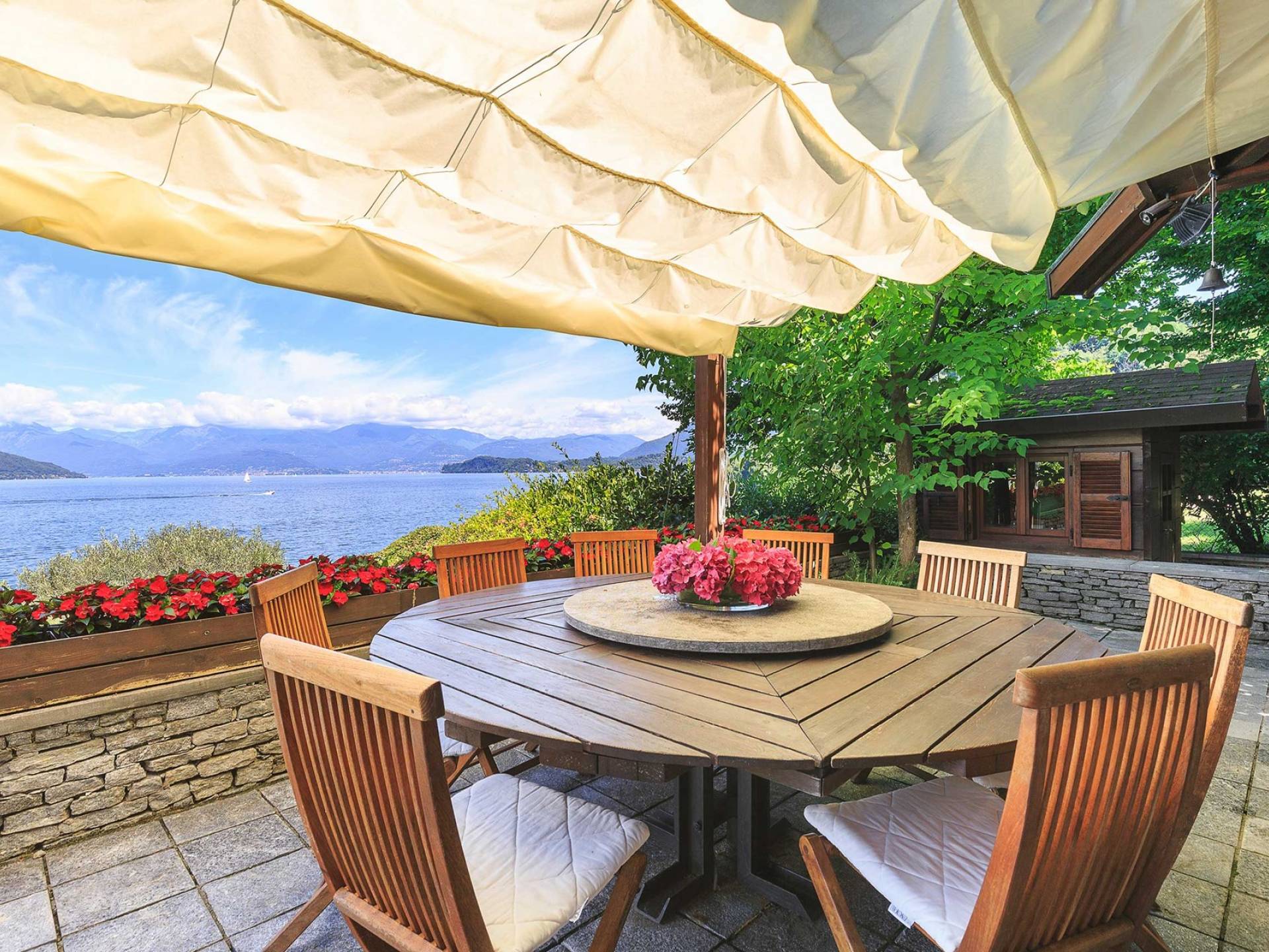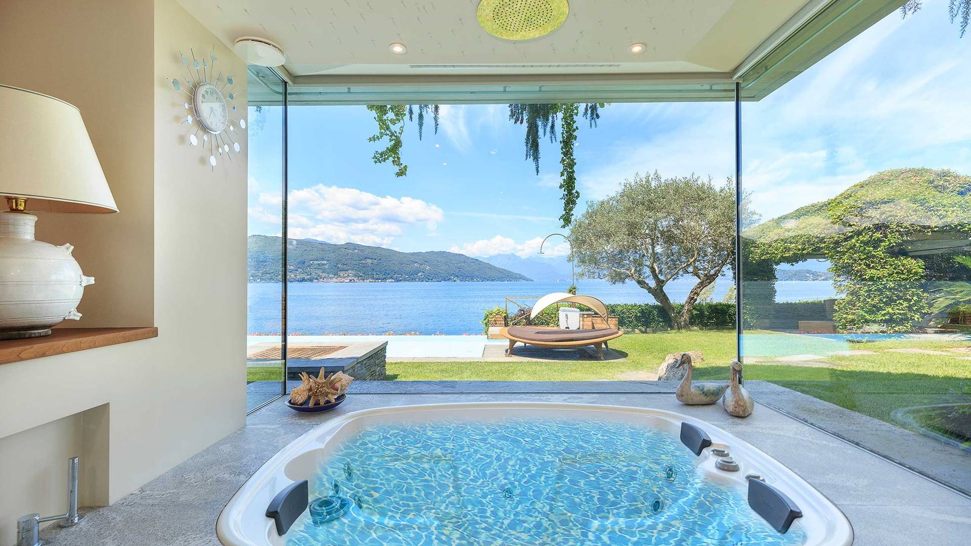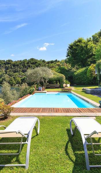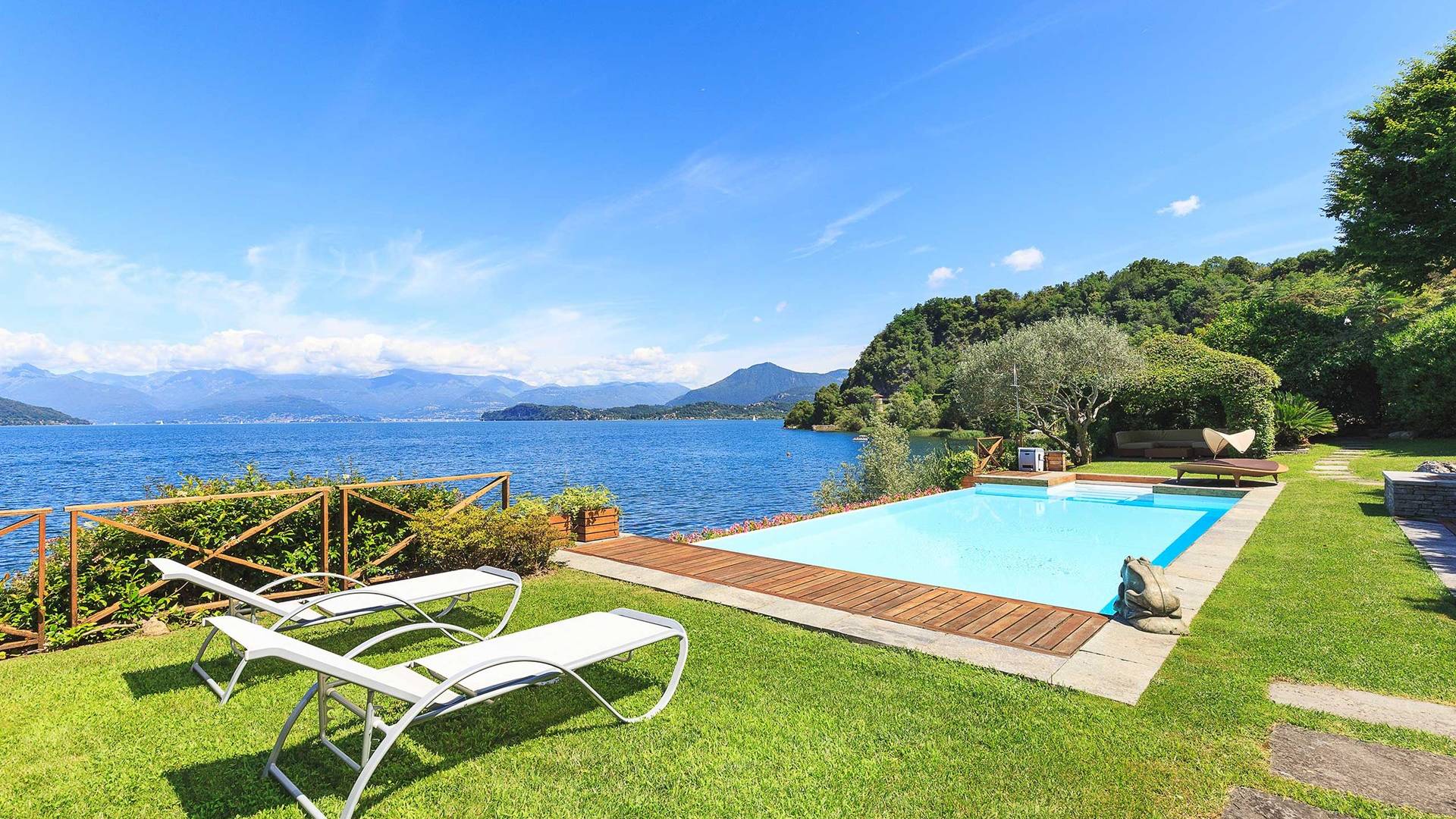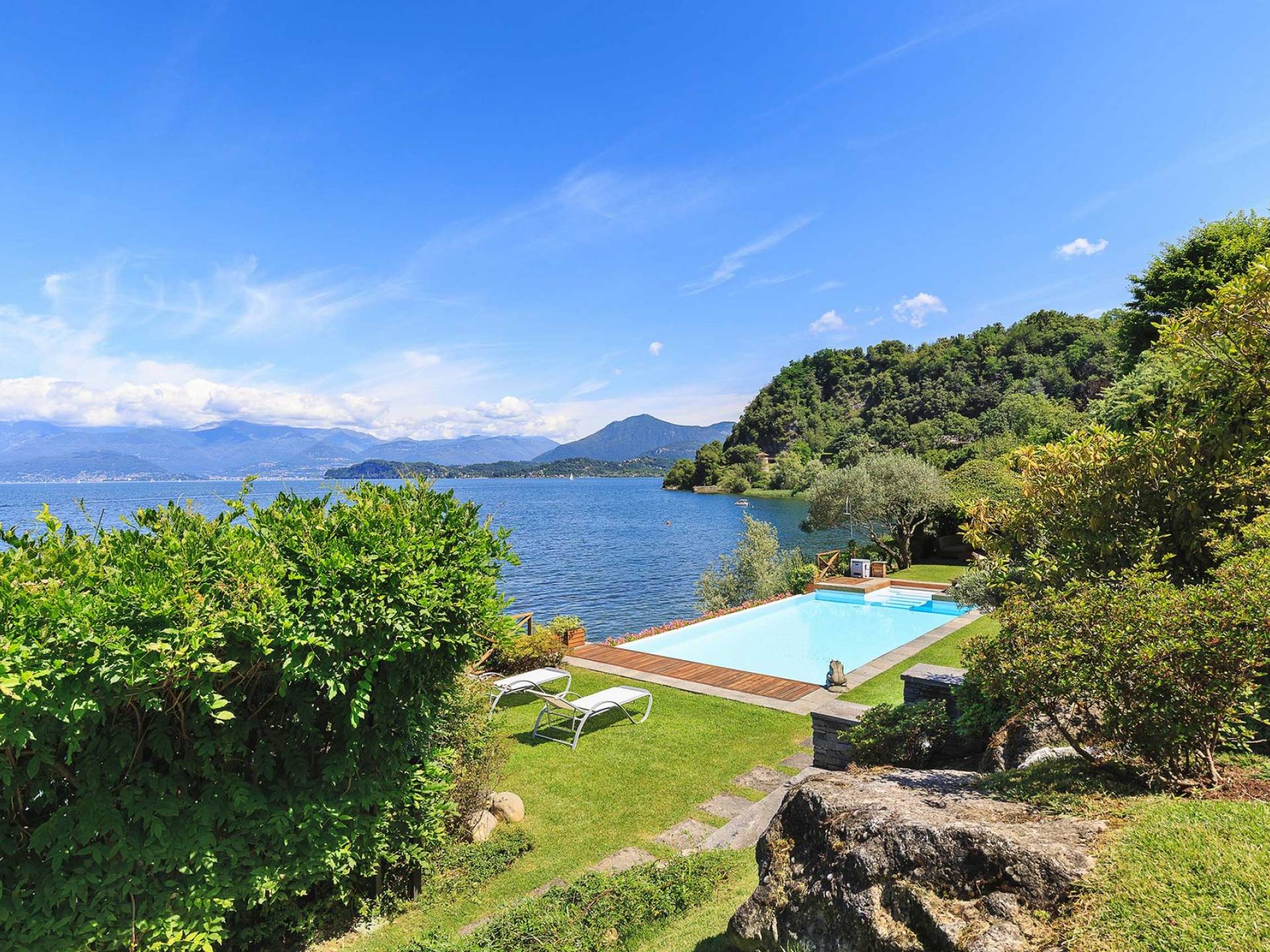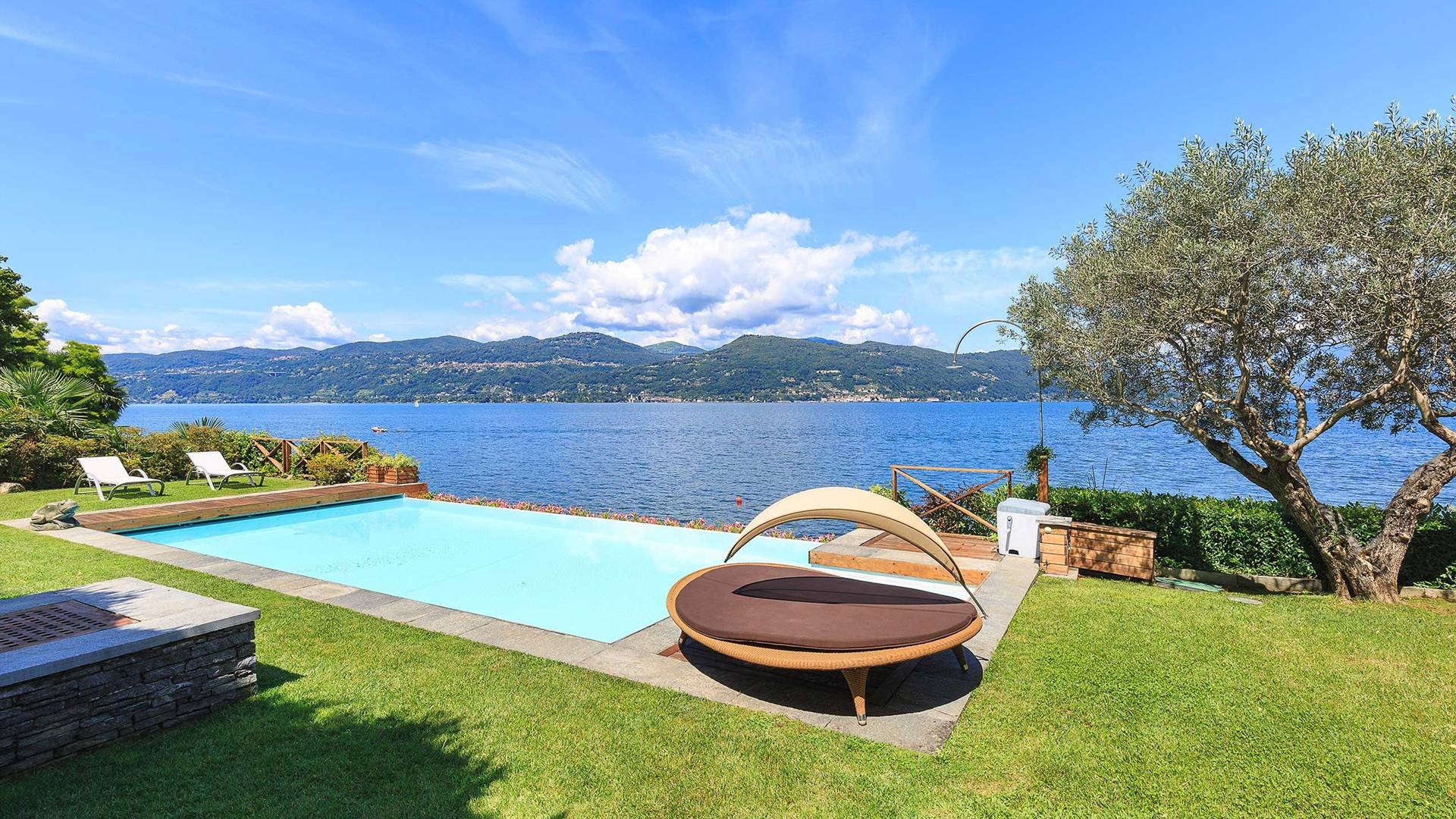 L'extérieur continuera de vous impressionner avec son jardin en terrasse avec plusieurs coins et pelouses pour s'asseoir et se détendre. La zone de la piscine comprend une piscine à débordement (équipée d'un système de nage à contre-courant) entourée de chaises longues et de lits, d'une douche extérieure et d'un joli belvédère fleuri avec des canapés pour rêver tout en regardant les bateaux qui passent. En suivant les escaliers en pierre, vous arriverez à une plage de galets pour une baignade rafraîchissante dans le lac.