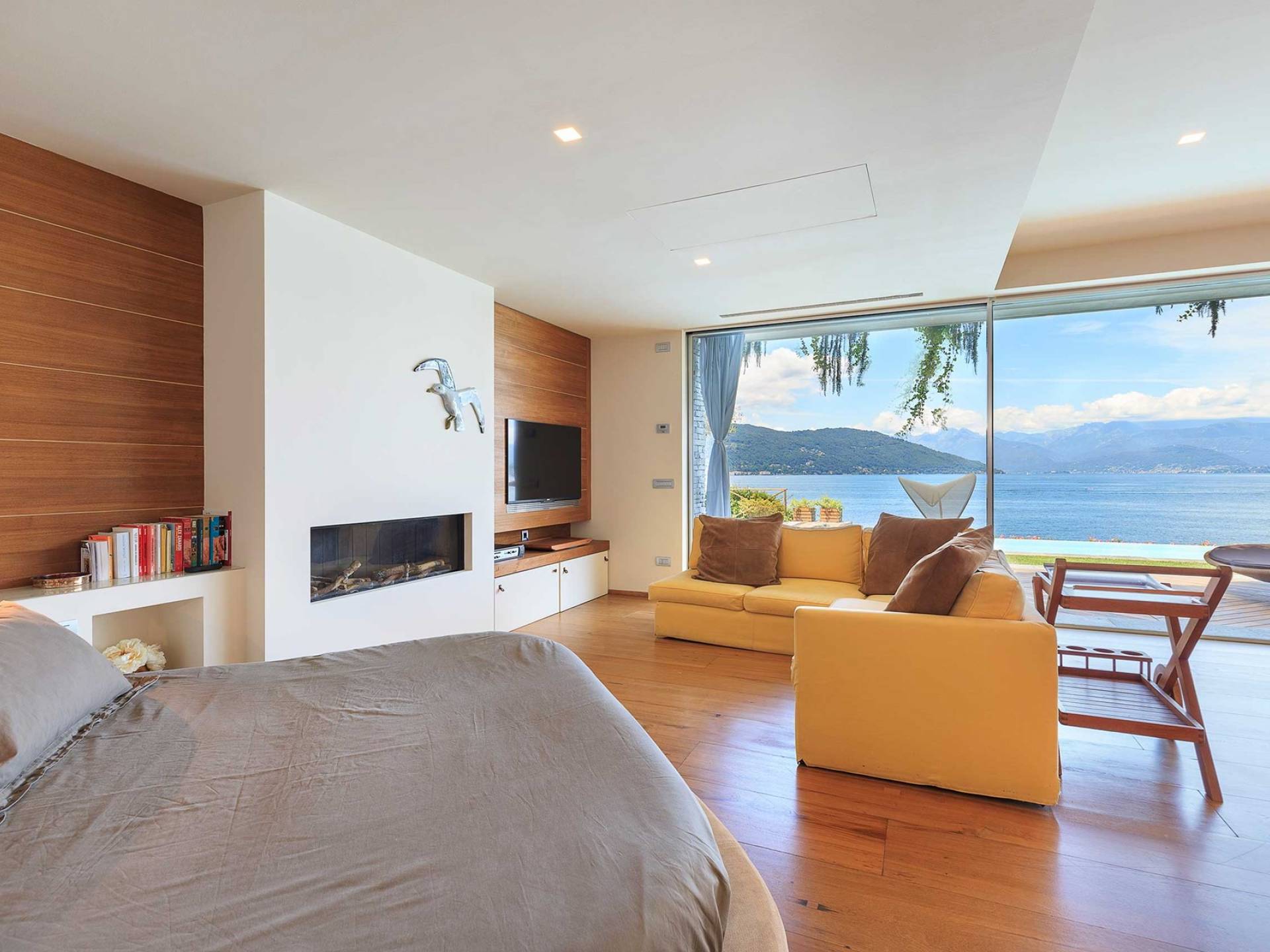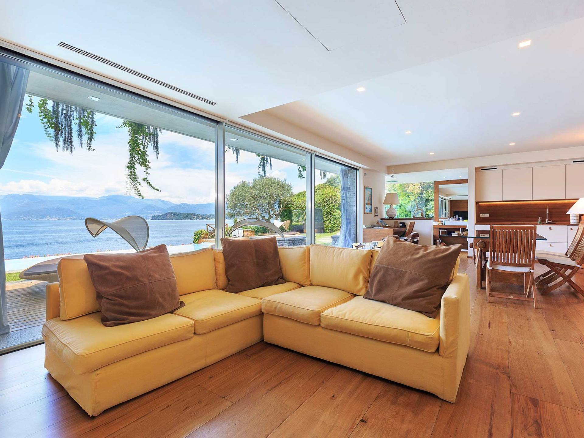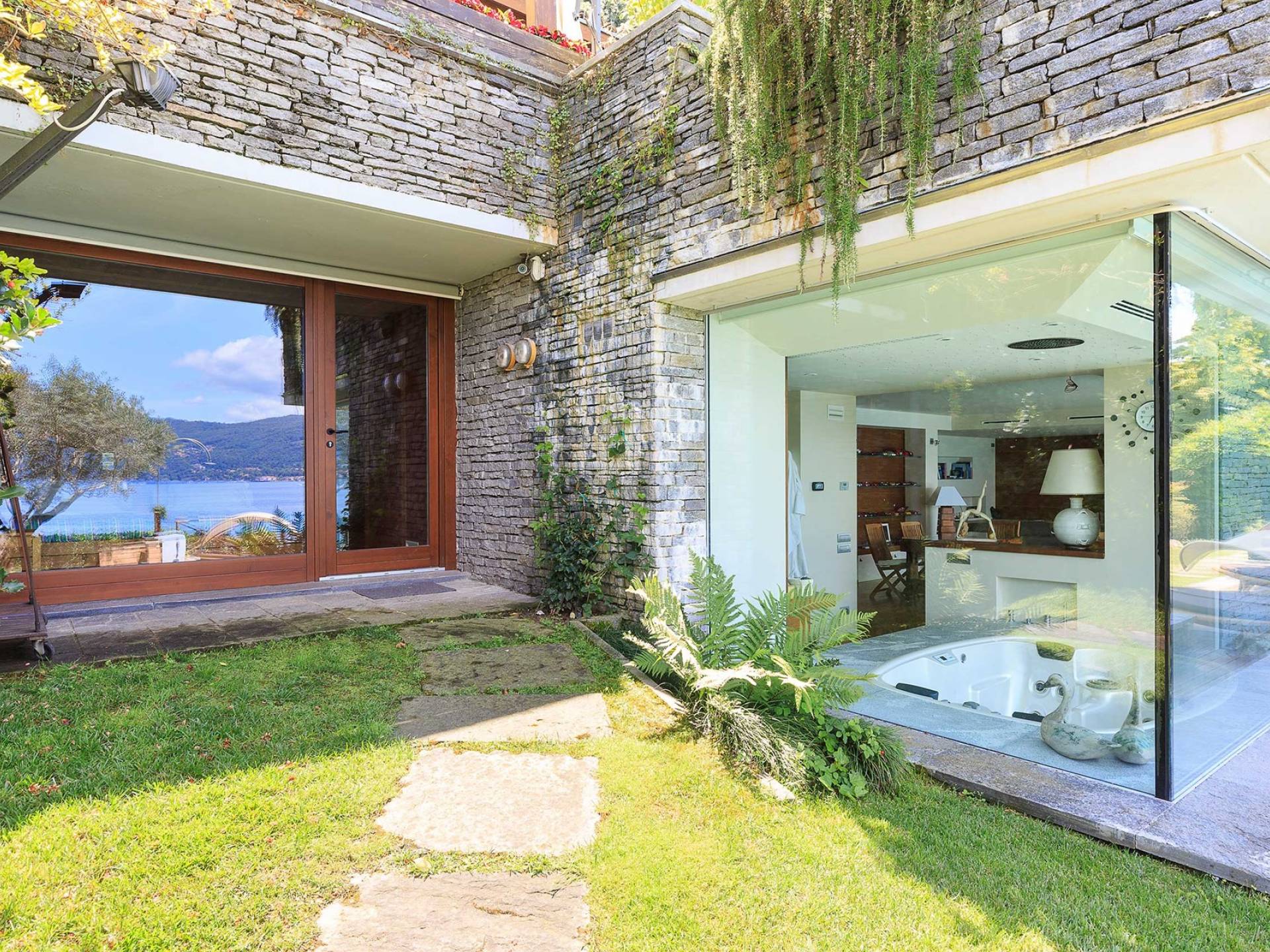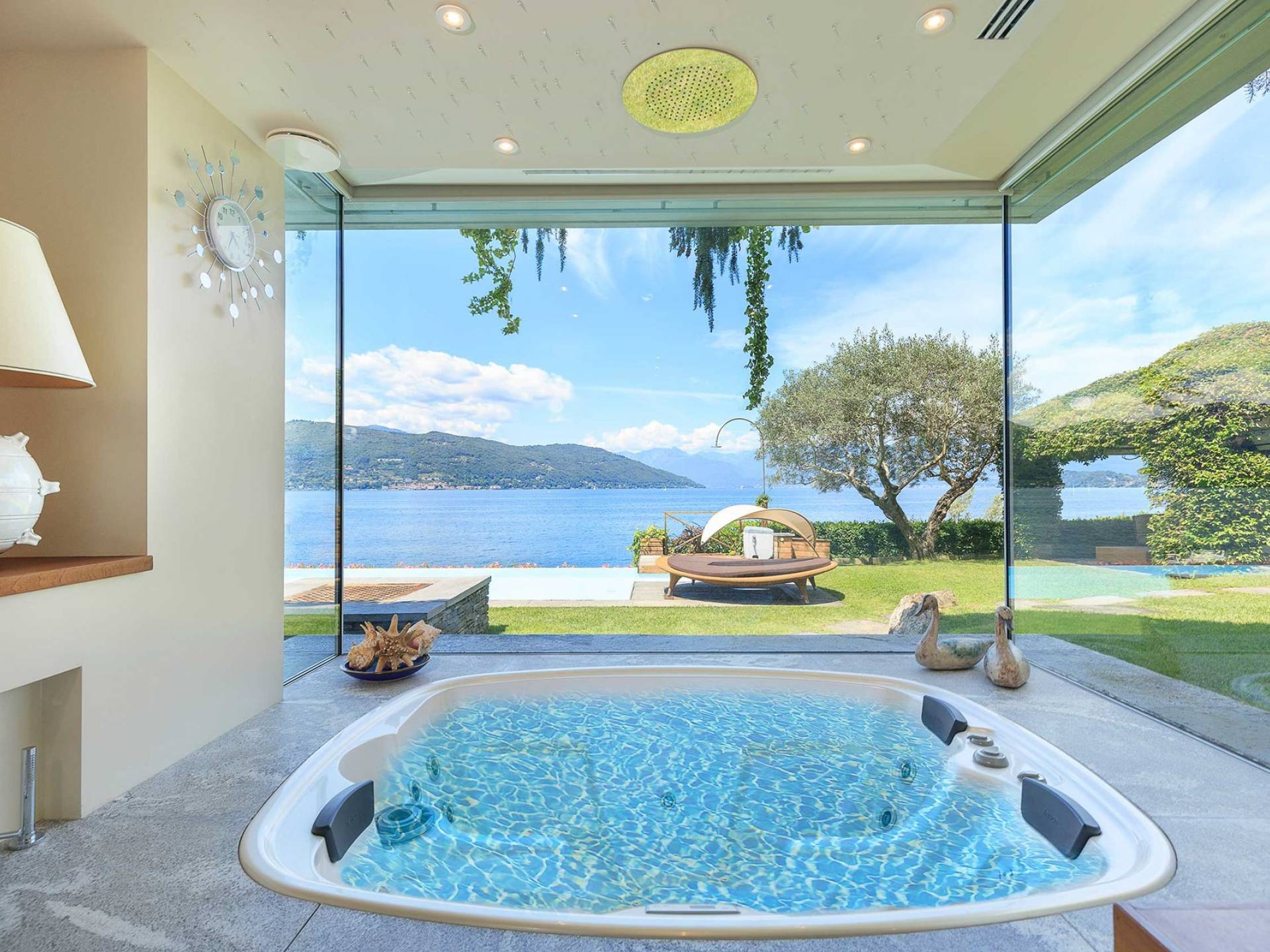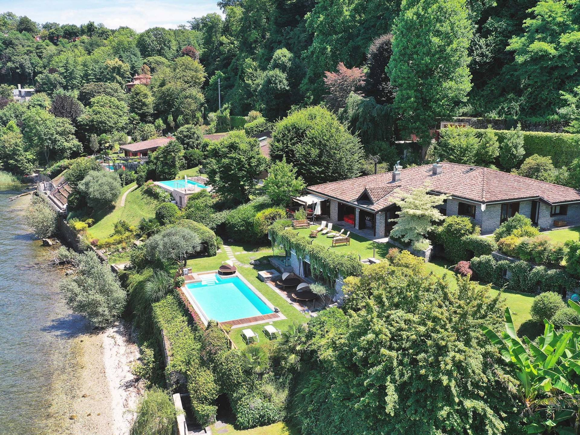 L'extérieur continuera de vous impressionner avec son jardin en terrasse avec plusieurs coins et pelouses pour s'asseoir et se détendre. La zone de la piscine comprend une piscine à débordement (équipée d'un système de nage à contre-courant) entourée de chaises longues et de lits, d'une douche extérieure et d'un joli belvédère fleuri avec des canapés pour rêver tout en regardant les bateaux qui passent. En suivant les escaliers en pierre, vous arriverez à une plage de galets pour une baignade rafraîchissante dans le lac.