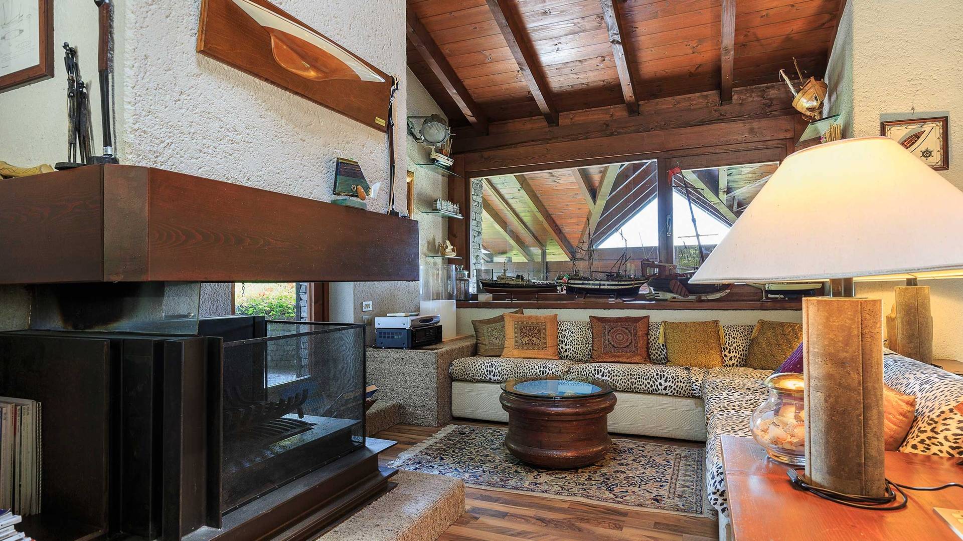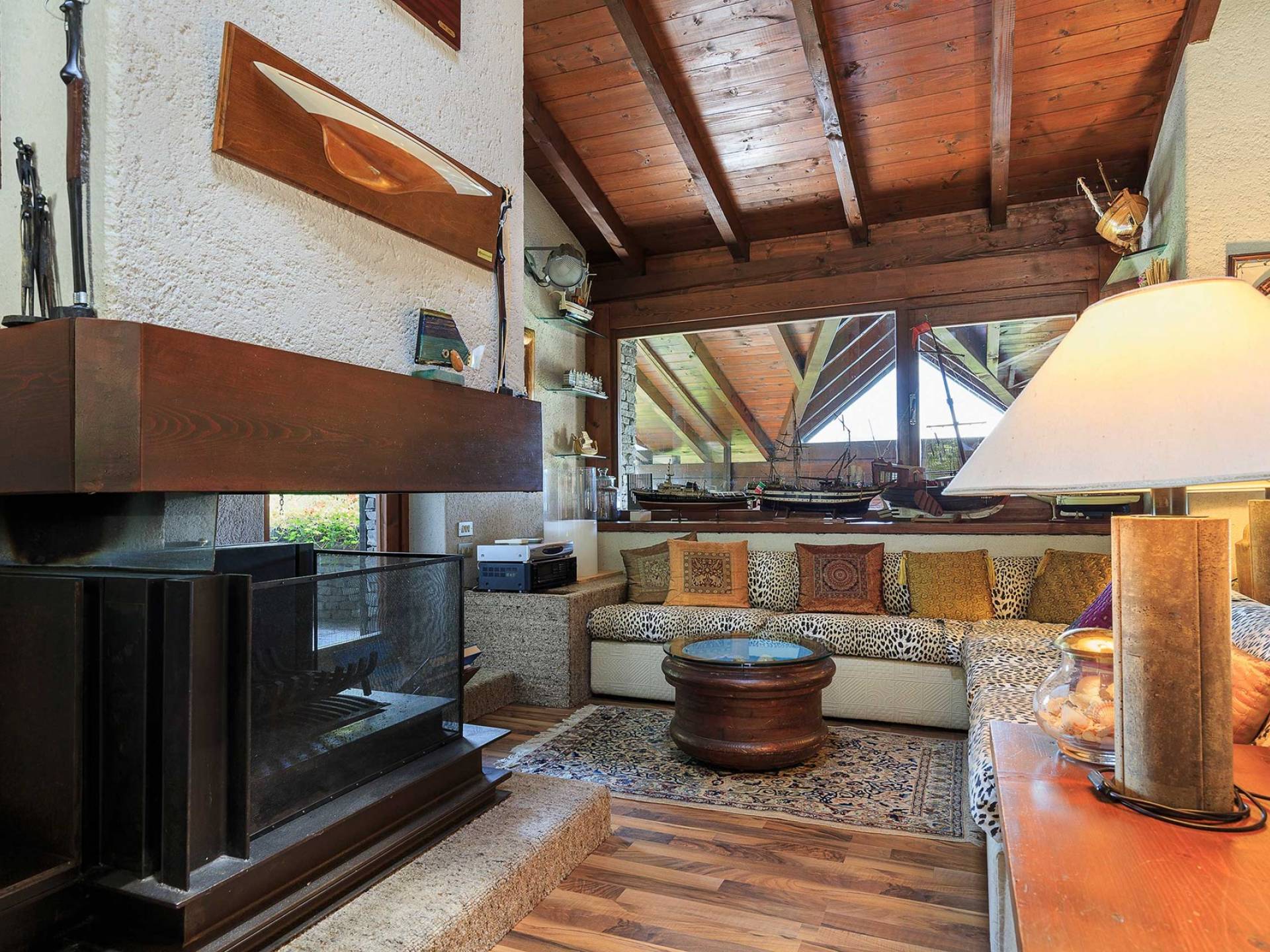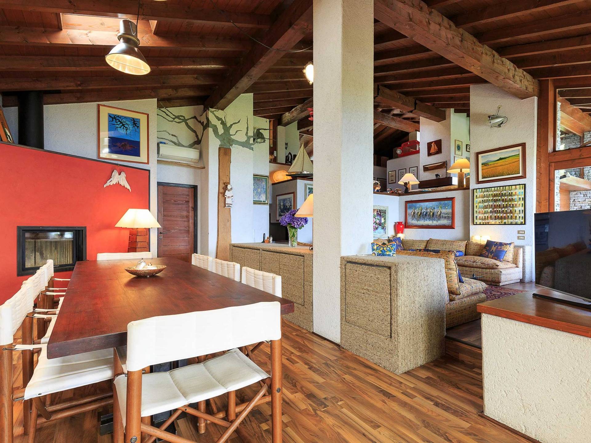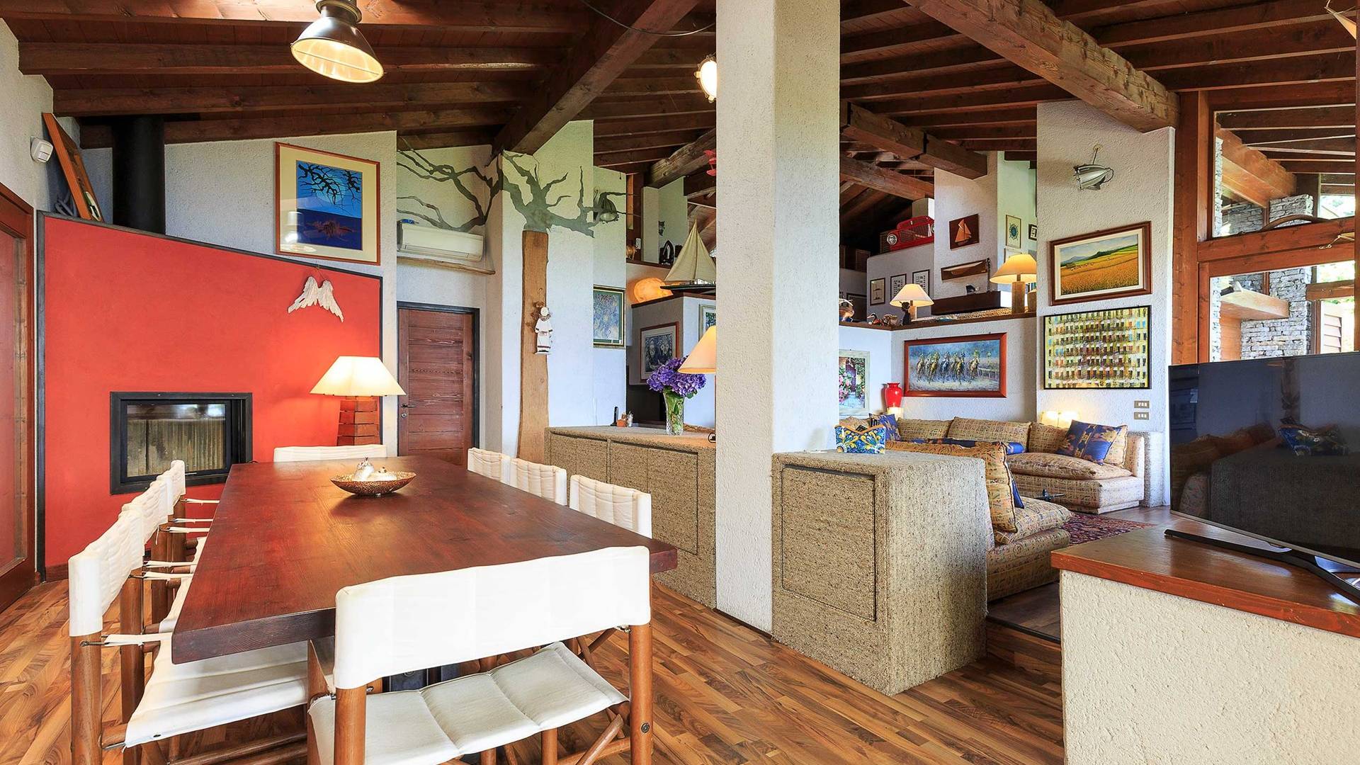 La zone d'entrée mène, quelques marches plus bas, dans le salon et la salle à manger décloisonnés avec de grandes fenêtres donnant sur le lac et accédant à la terrasse avec table pour une vue imprenable sur le lac. La cuisine entièrement équipée à l'arrière donne sur un espace extérieur latéral avec barbecue et four à bois. Quelques marches plus haut, donnant sur le salon central, vous trouverez un coin détente confortable avec des canapés et une cheminée à foyer ouvert