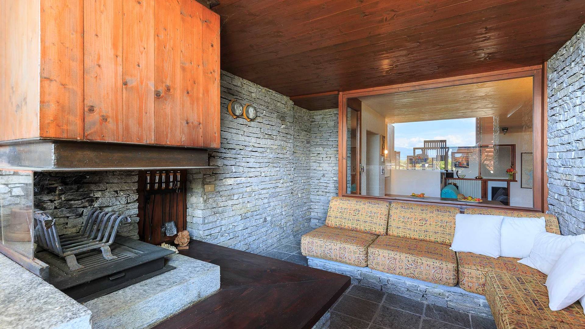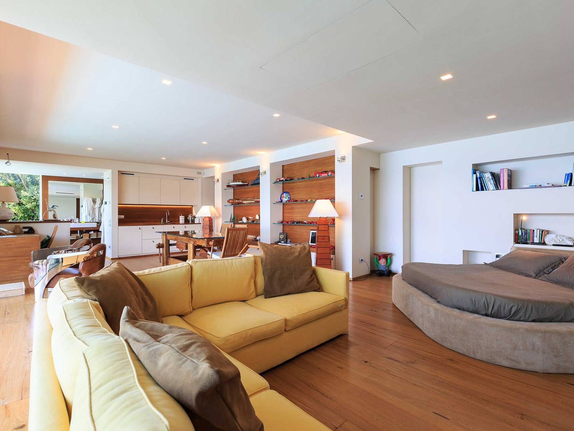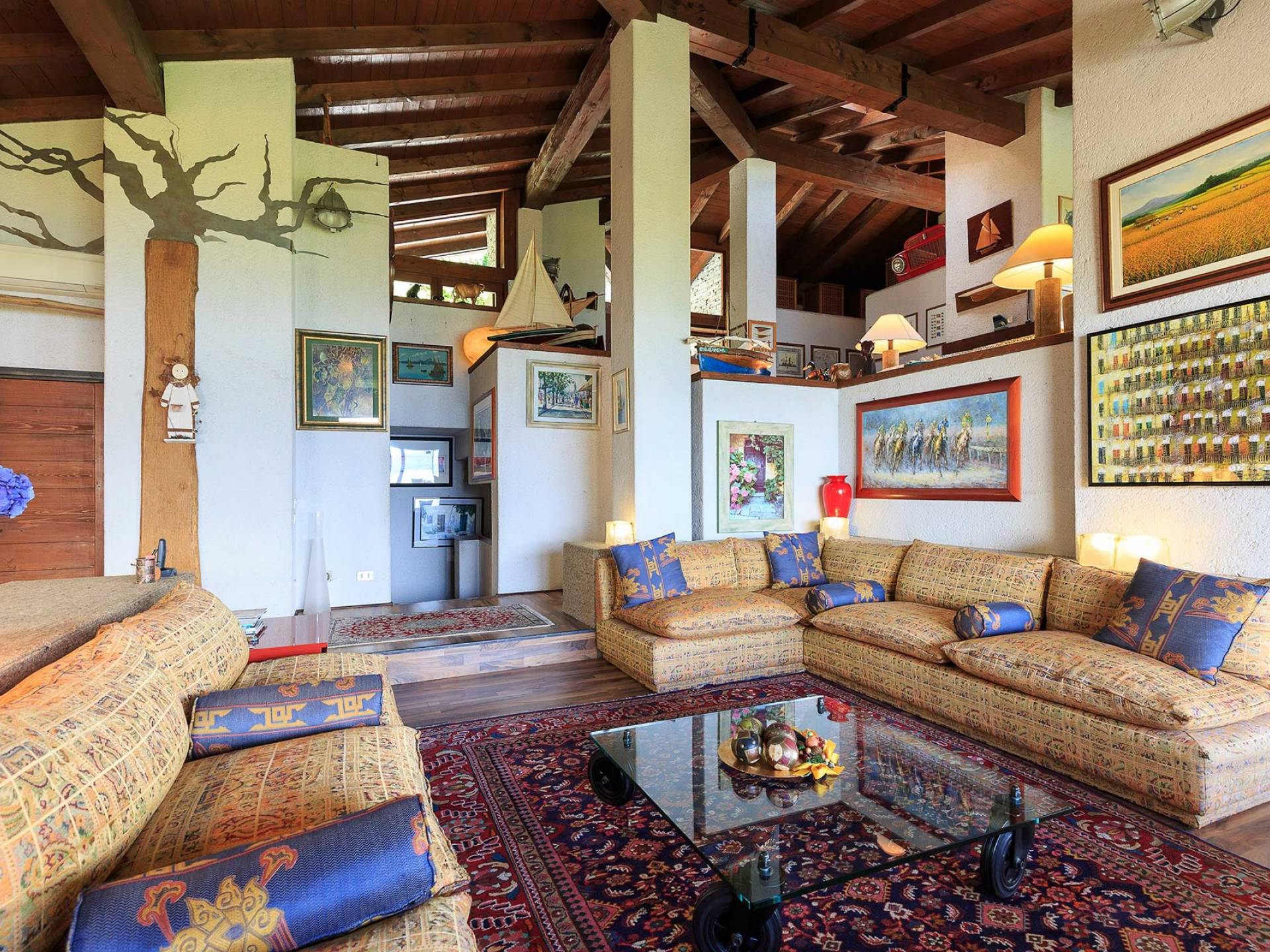 La zone d'entrée mène, quelques marches plus bas, dans le salon et la salle à manger décloisonnés avec de grandes fenêtres donnant sur le lac et accédant à la terrasse avec table pour une vue imprenable sur le lac. La cuisine entièrement équipée à l'arrière donne sur un espace extérieur latéral avec barbecue et four à bois. Quelques marches plus haut, donnant sur le salon central, vous trouverez un coin détente confortable avec des canapés et une cheminée à foyer ouvert