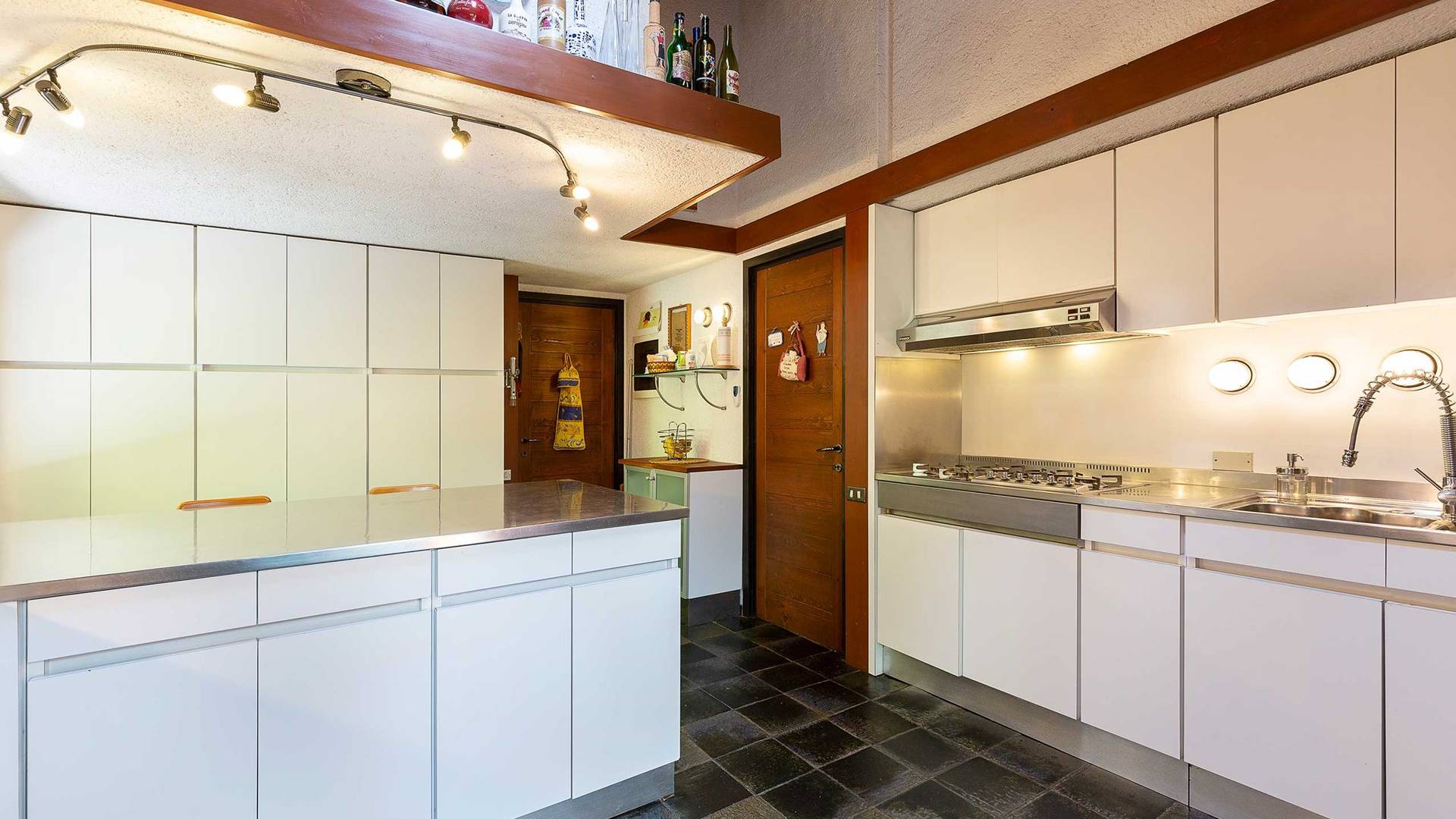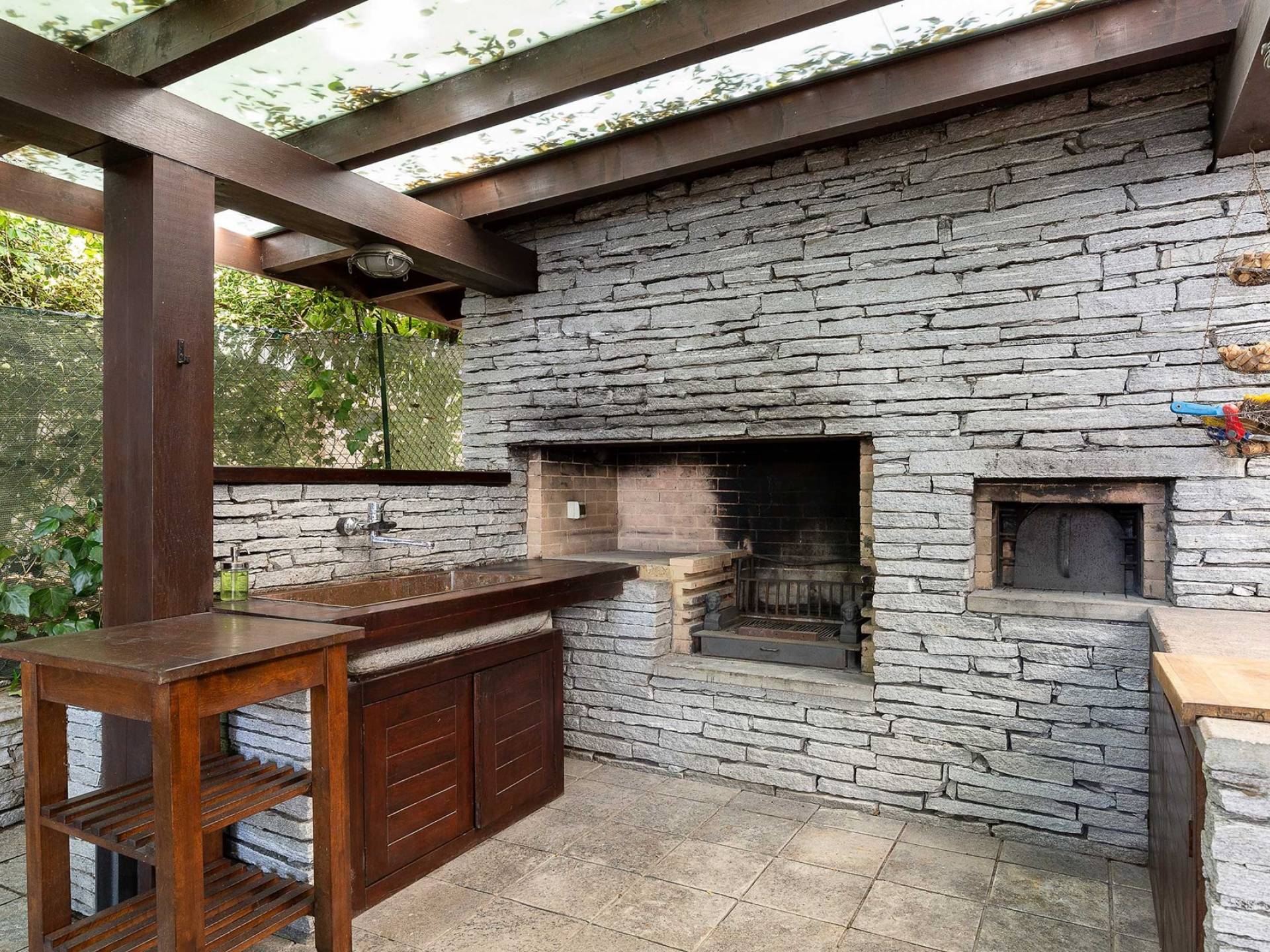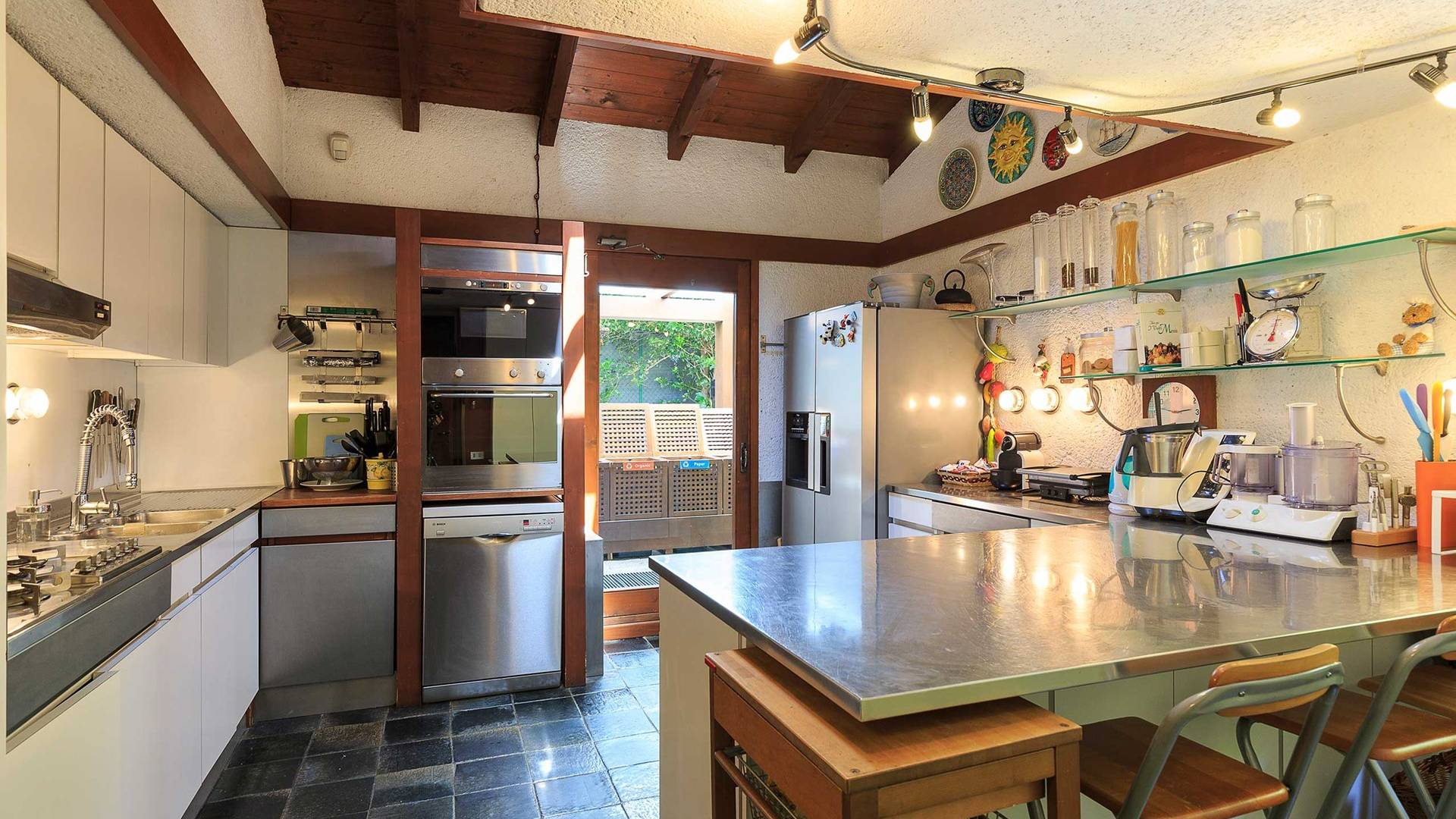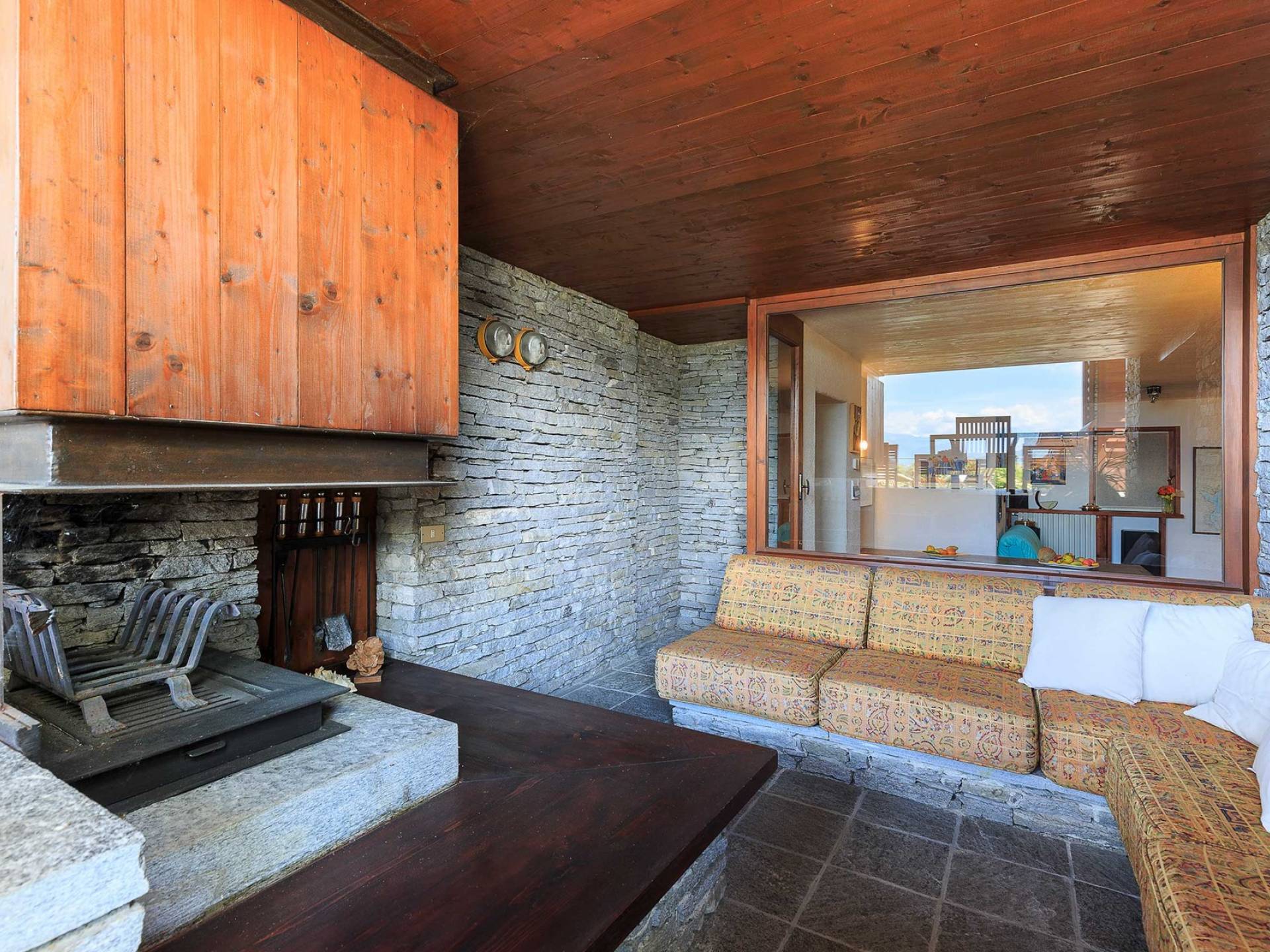 La zone d'entrée mène, quelques marches plus bas, dans le salon et la salle à manger décloisonnés avec de grandes fenêtres donnant sur le lac et accédant à la terrasse avec table pour une vue imprenable sur le lac. La cuisine entièrement équipée à l'arrière donne sur un espace extérieur latéral avec barbecue et four à bois. Quelques marches plus haut, donnant sur le salon central, vous trouverez un coin détente confortable avec des canapés et une cheminée à foyer ouvert