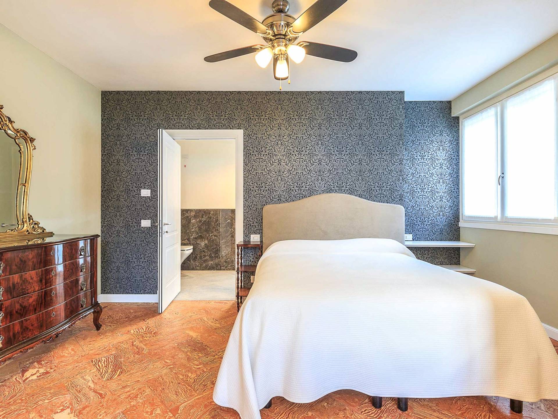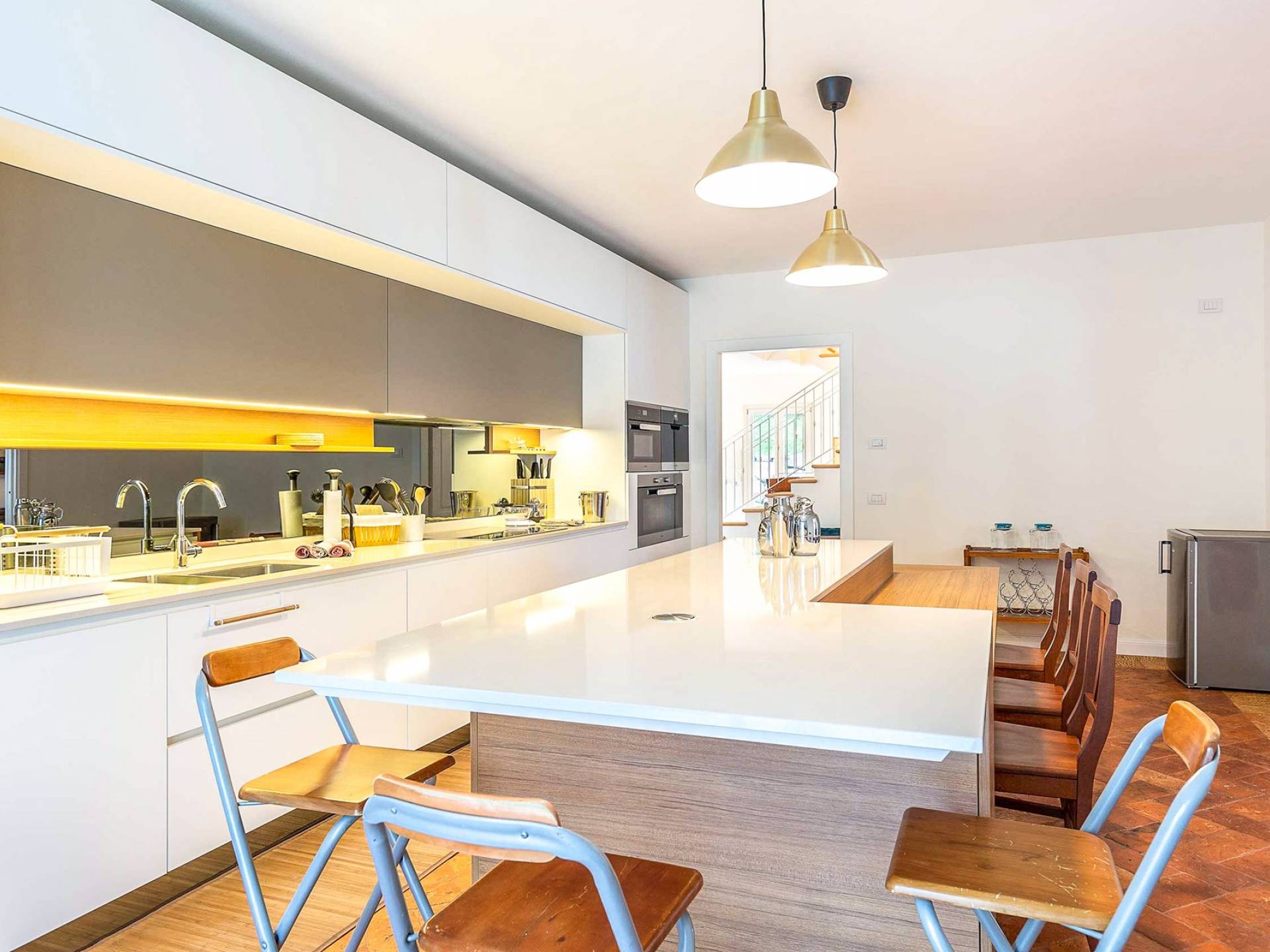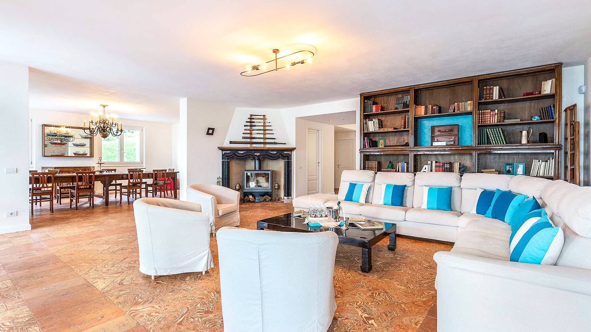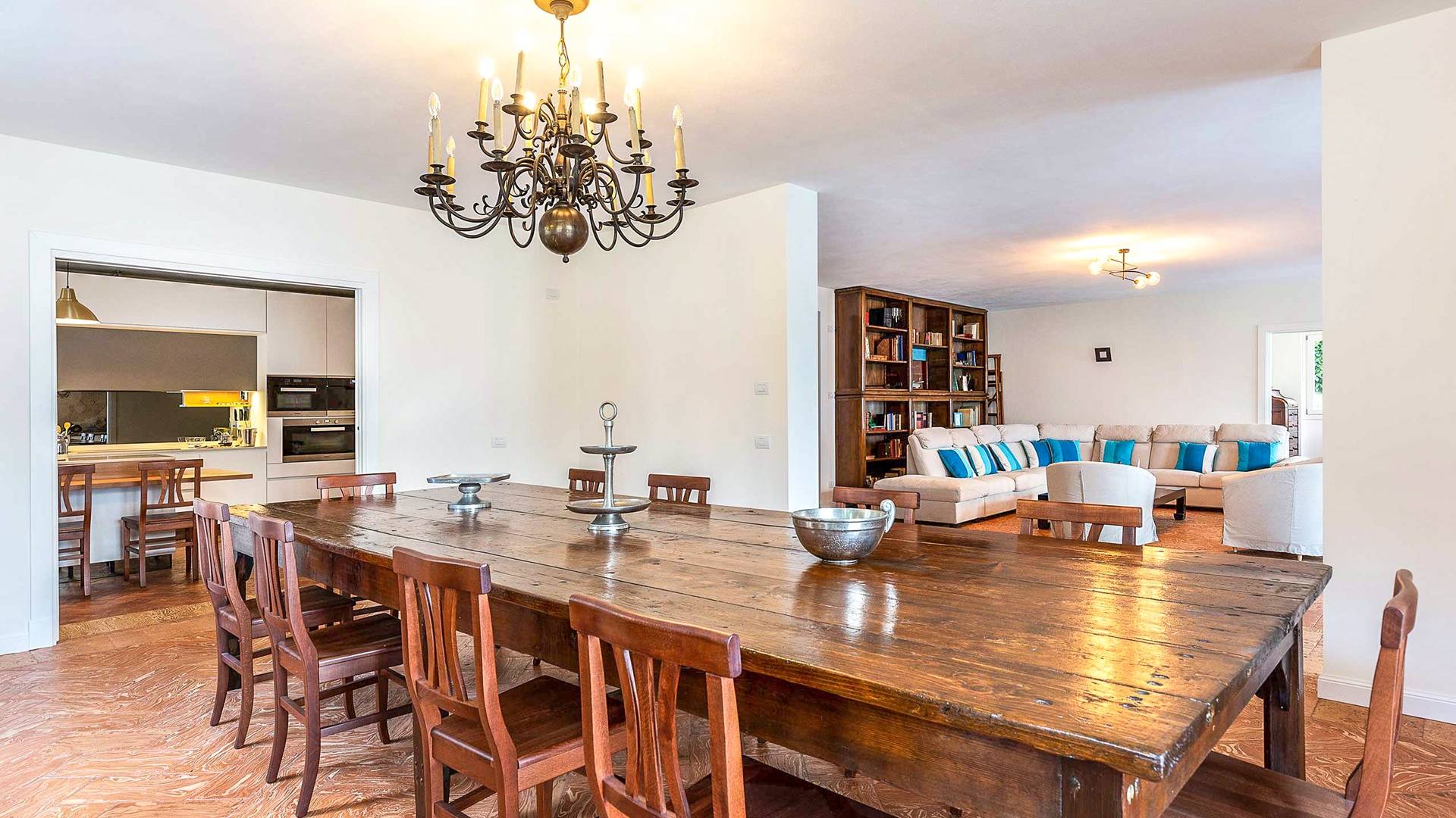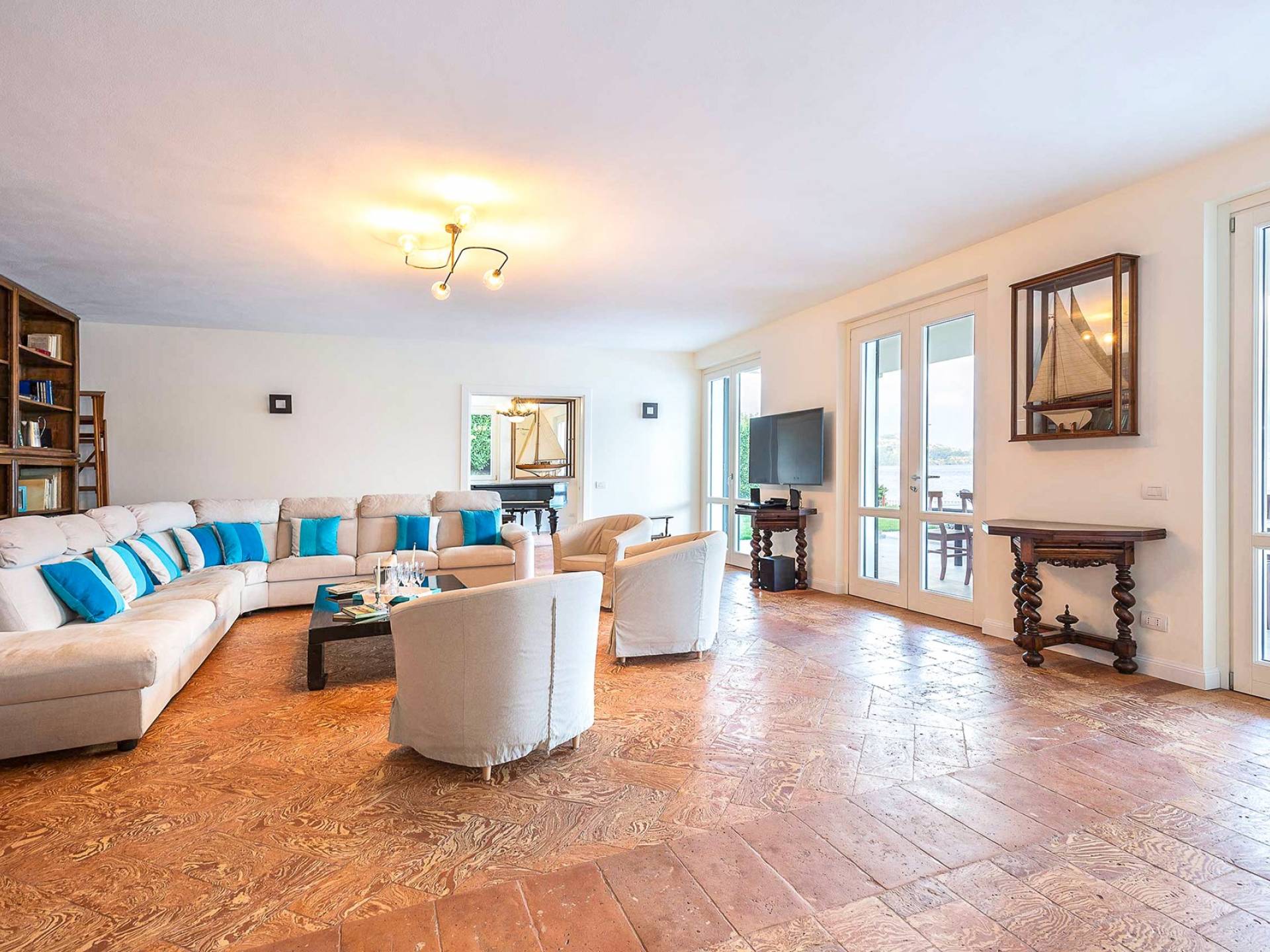 Il y a un grand salon ensoleillé avec des canapés confortables et une télévision par satellite, une salle à manger avec une table ancienne en bois pouvant accueillir jusqu'à 18 personnes, un salon confortable avec un magnifique piano à queue, une cuisine moderne et entièrement équipée (2 fours, une cellule de refroidissement rapide, 2 lave-vaisselle, un grand réfrigérateur avec congélateur et un large îlot de cuisine). Une chambre double, avec une salle de bain attenante, accessible aux personnes handicapées. Au fond de la cuisine, il y a une chambre du personnel (9 m²) avec une salle de bain dédiée (6,50 m²).