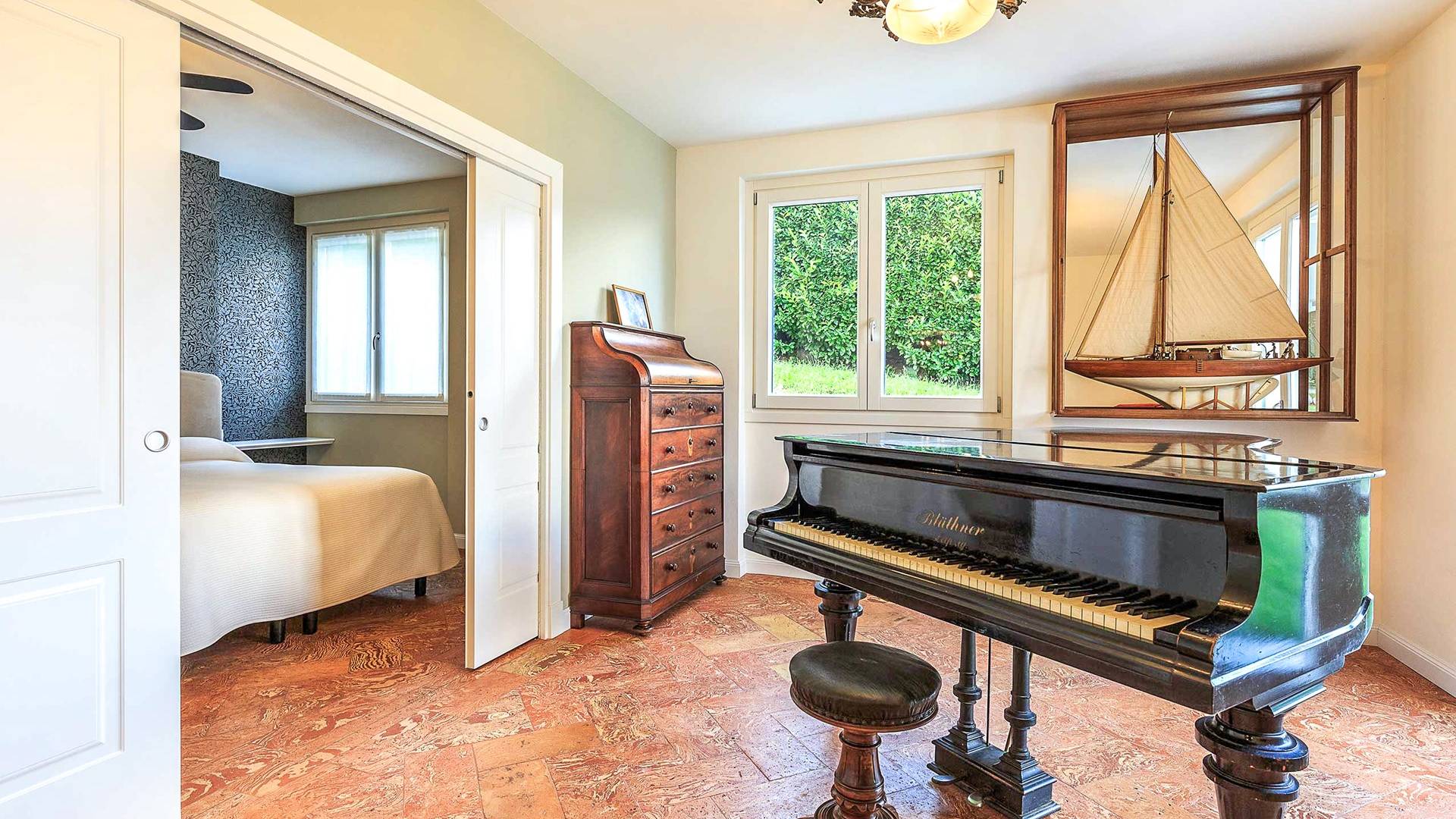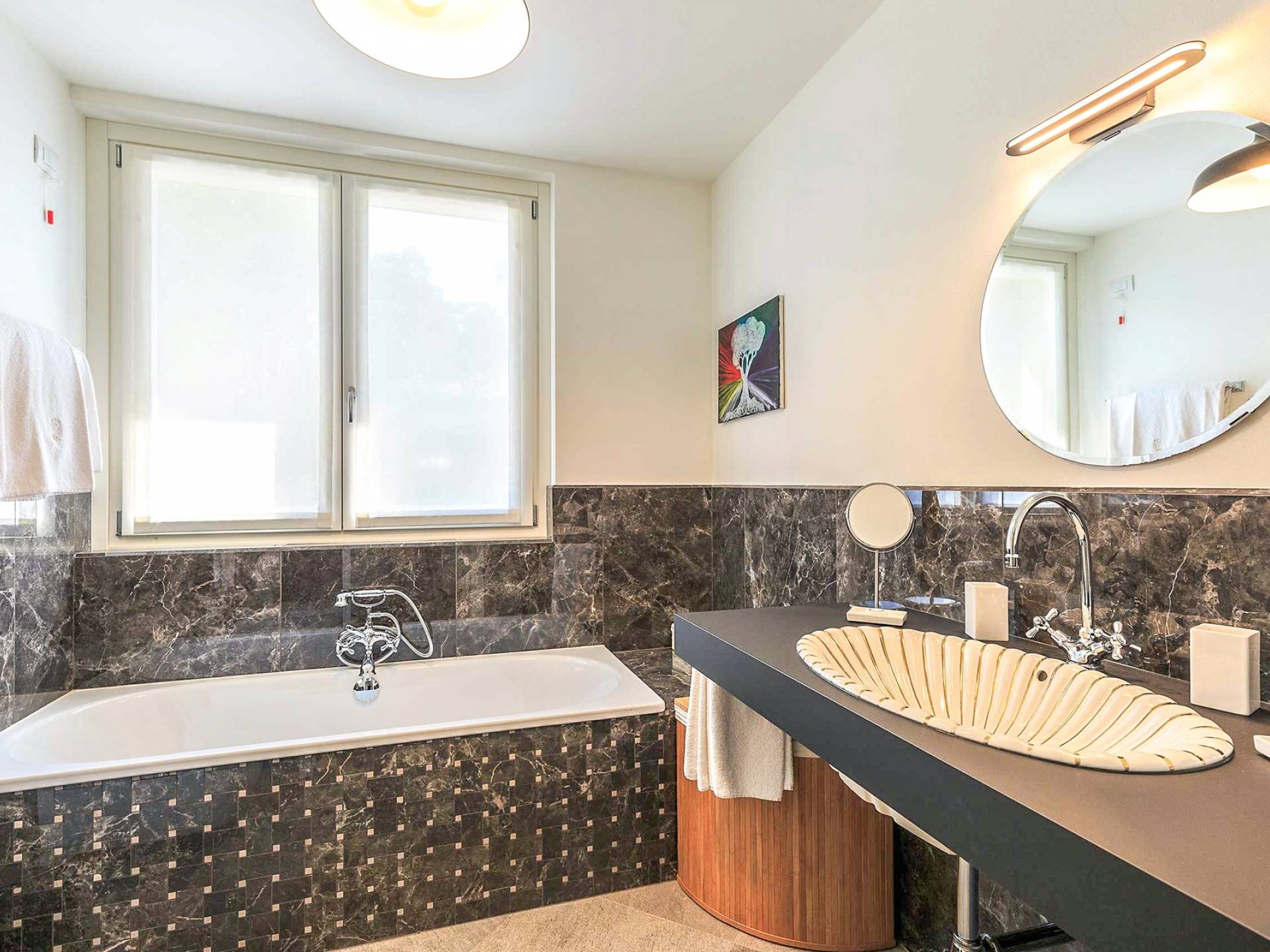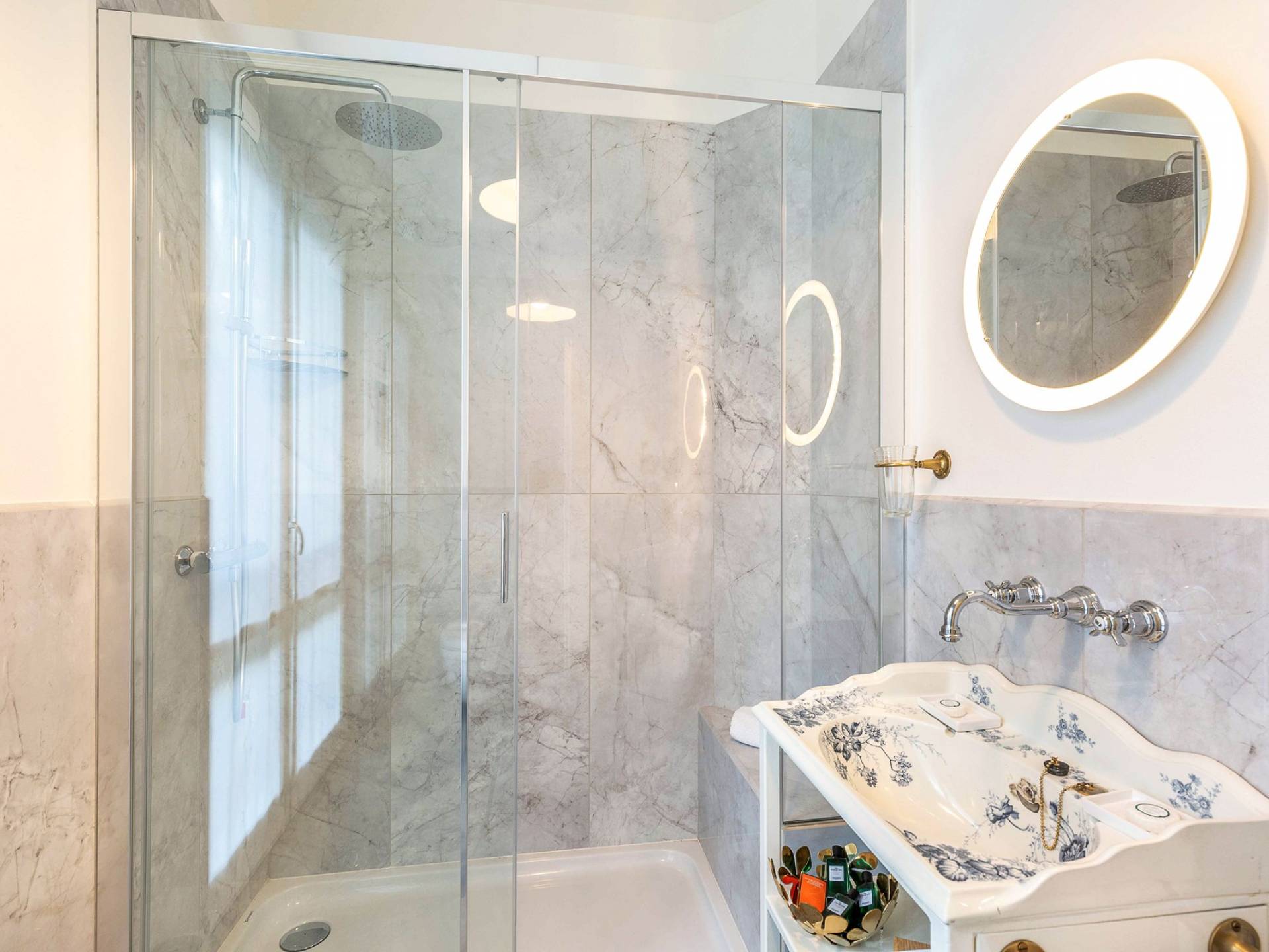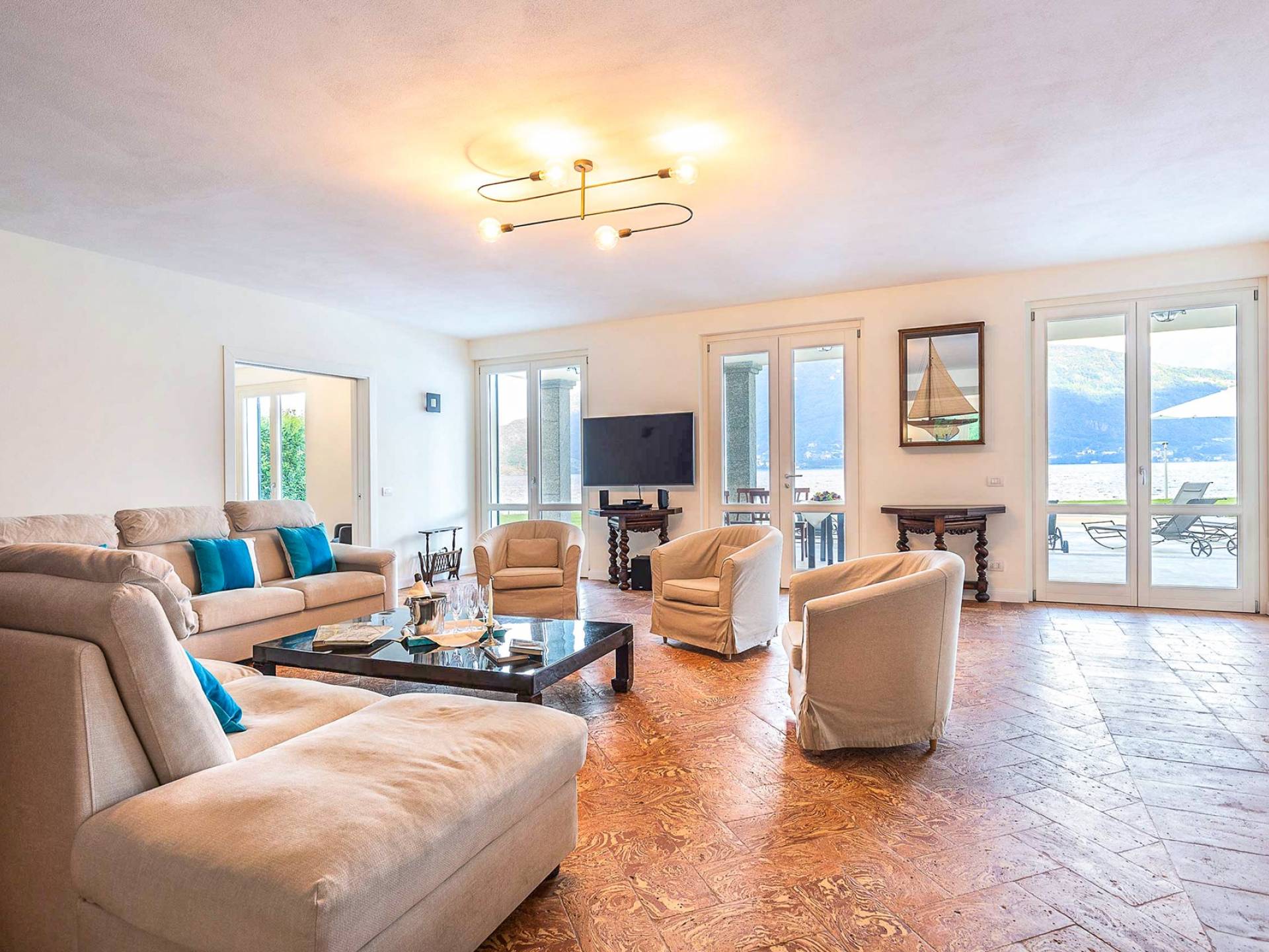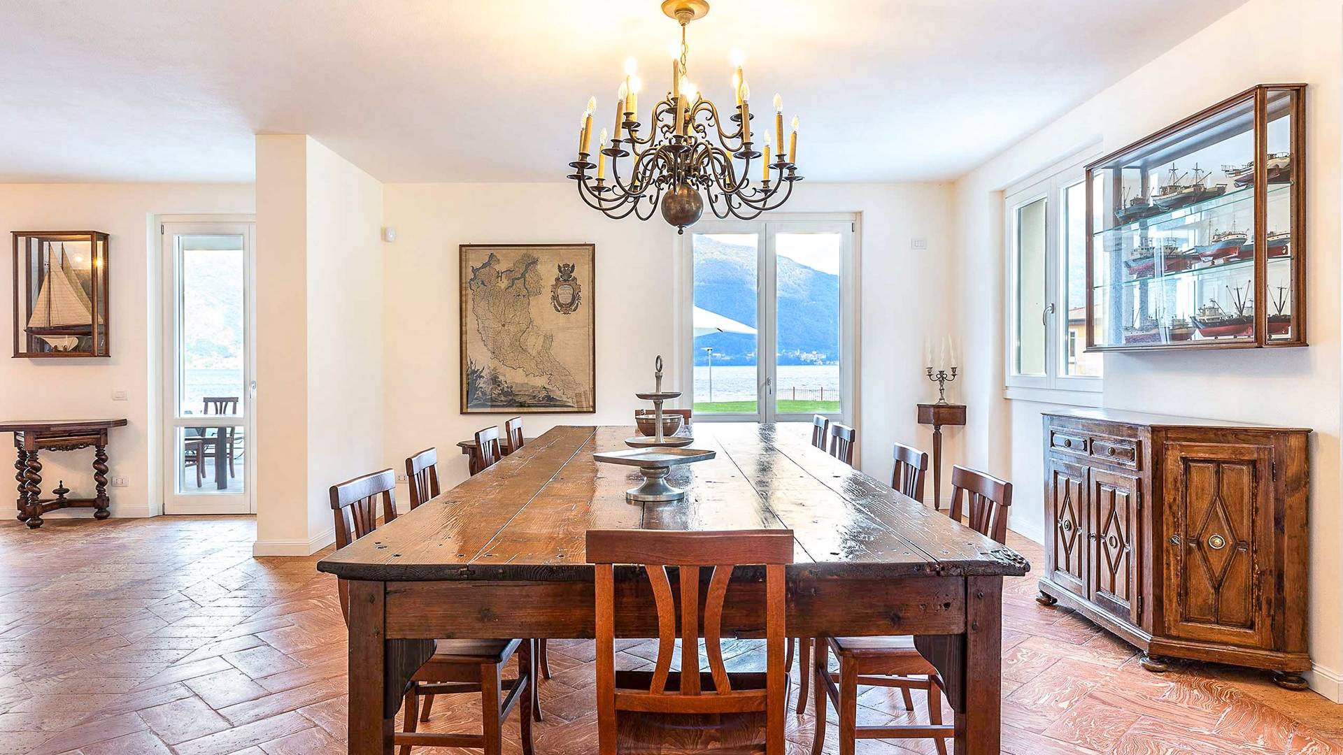 Il y a un grand salon ensoleillé avec des canapés confortables et une télévision par satellite, une salle à manger avec une table ancienne en bois pouvant accueillir jusqu'à 18 personnes, un salon confortable avec un magnifique piano à queue, une cuisine moderne et entièrement équipée (2 fours, une cellule de refroidissement rapide, 2 lave-vaisselle, un grand réfrigérateur avec congélateur et un large îlot de cuisine). Une chambre double, avec une salle de bain attenante, accessible aux personnes handicapées. Au fond de la cuisine, il y a une chambre du personnel (9 m²) avec une salle de bain dédiée (6,50 m²).