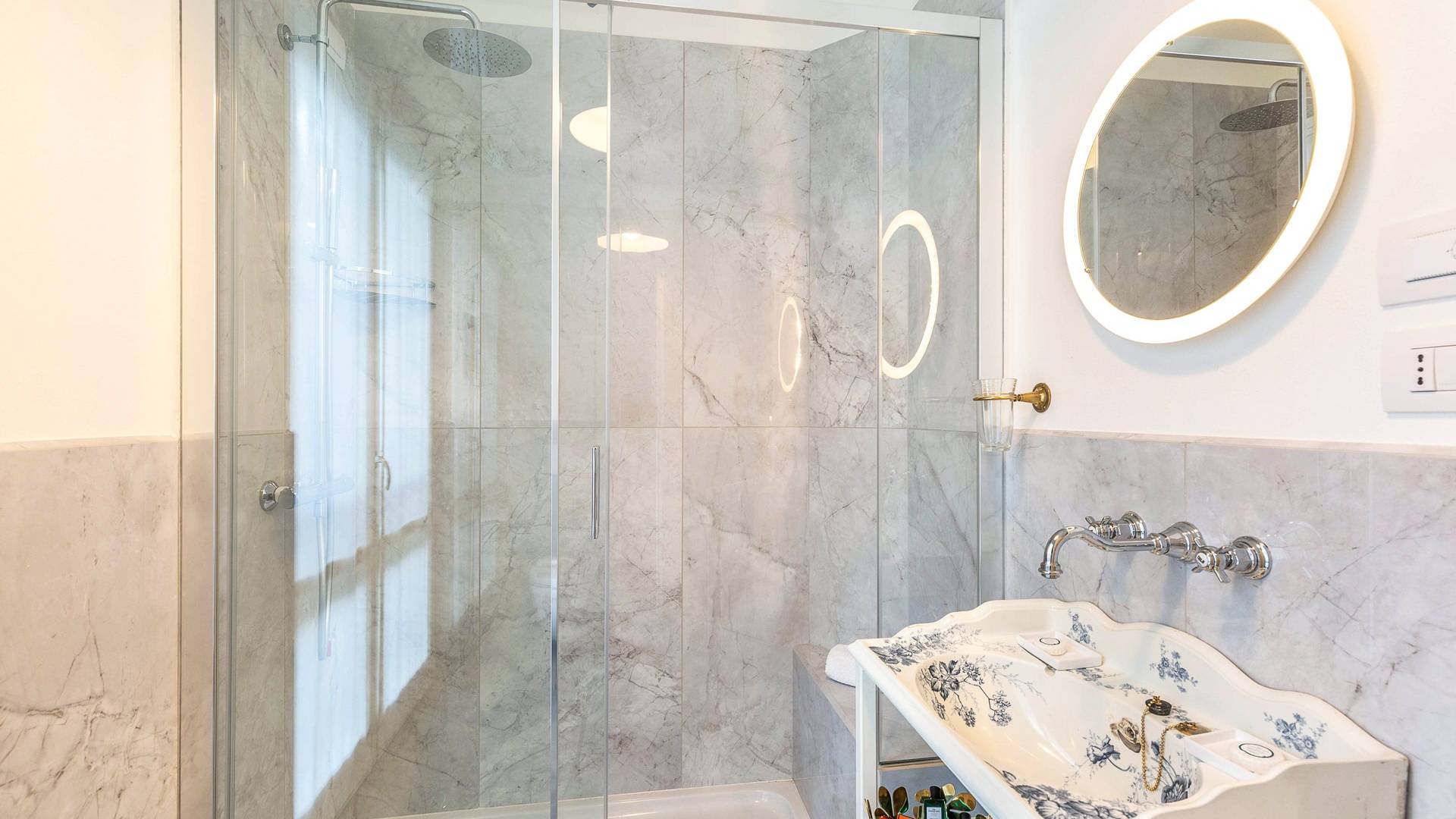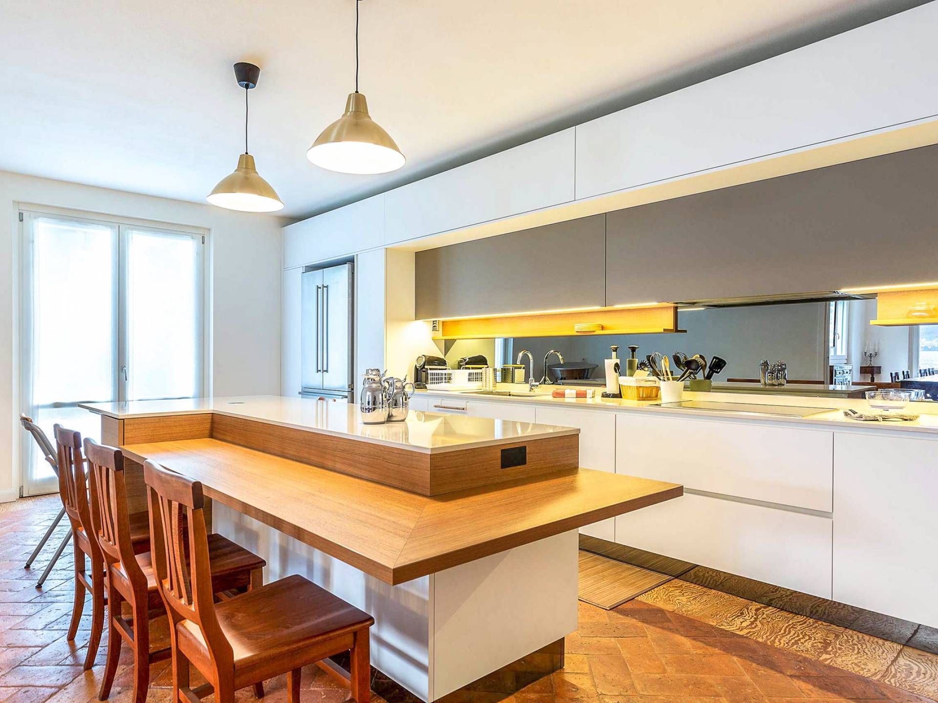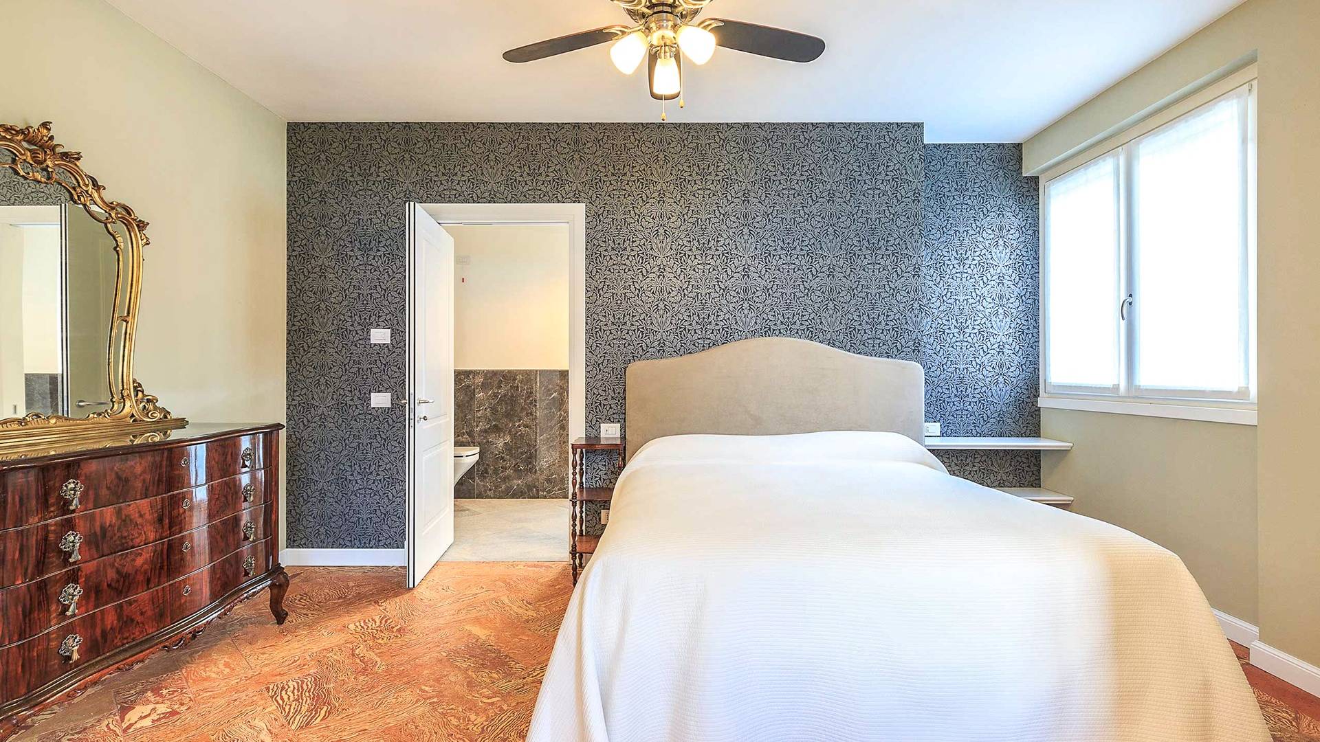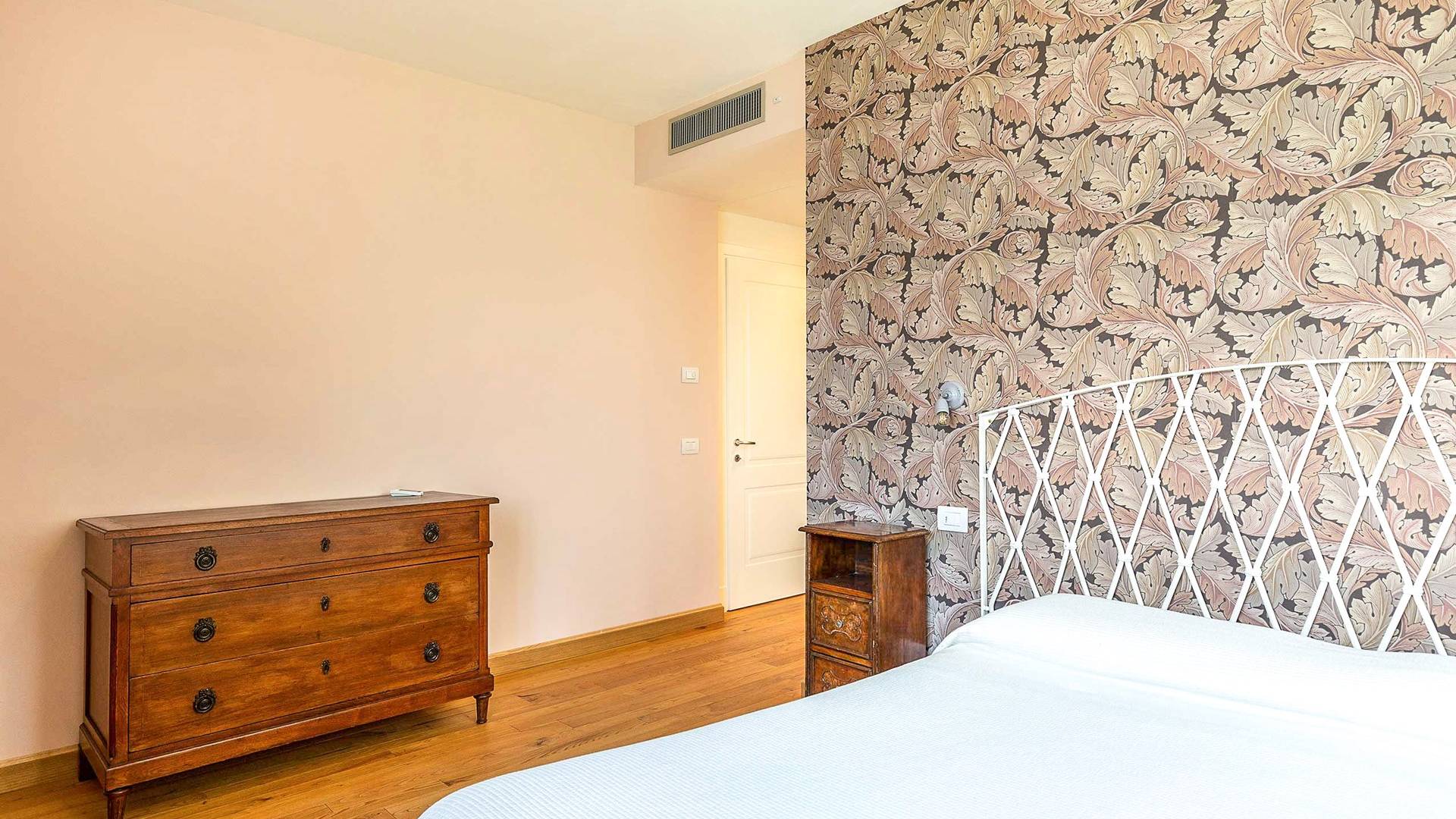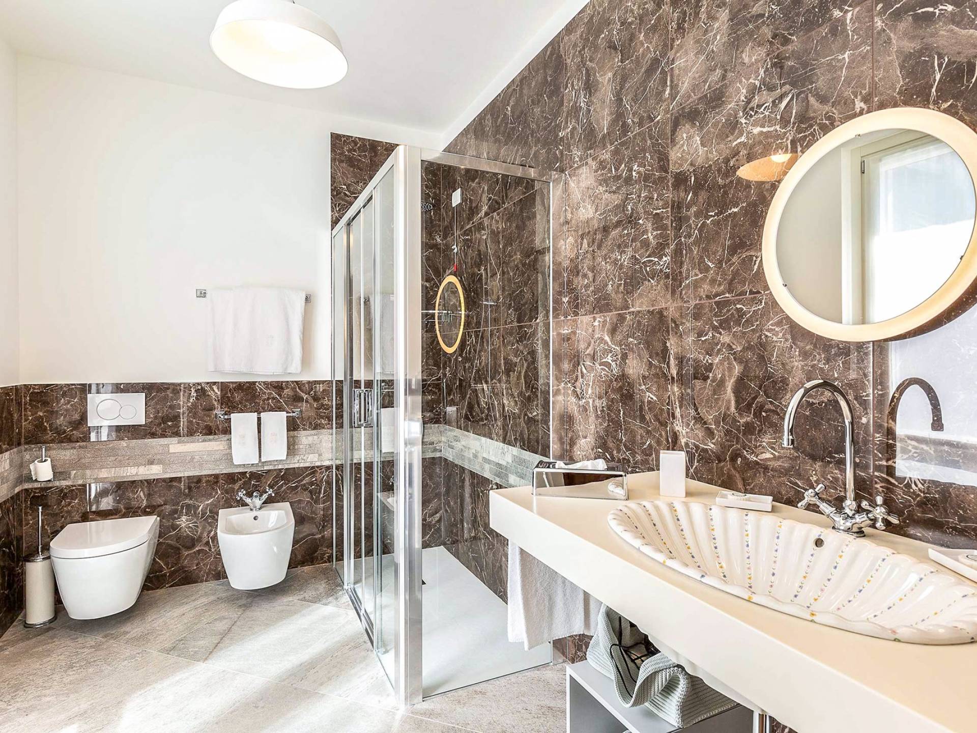 Il y a un grand salon ensoleillé avec des canapés confortables et une télévision par satellite, une salle à manger avec une table ancienne en bois pouvant accueillir jusqu'à 18 personnes, un salon confortable avec un magnifique piano à queue, une cuisine moderne et entièrement équipée (2 fours, une cellule de refroidissement rapide, 2 lave-vaisselle, un grand réfrigérateur avec congélateur et un large îlot de cuisine). Une chambre double, avec une salle de bain attenante, accessible aux personnes handicapées. Au fond de la cuisine, il y a une chambre du personnel (9 m²) avec une salle de bain dédiée (6,50 m²).