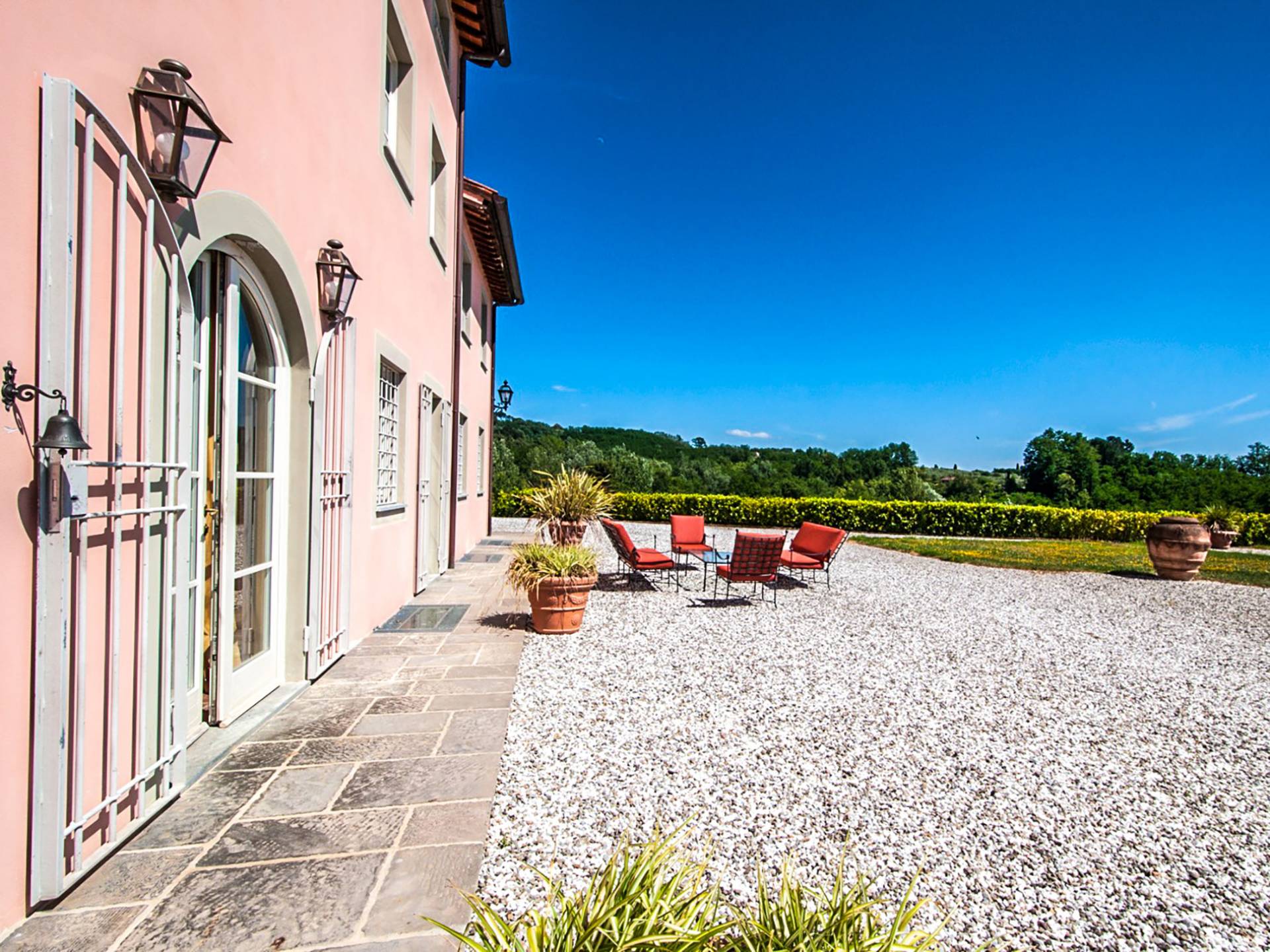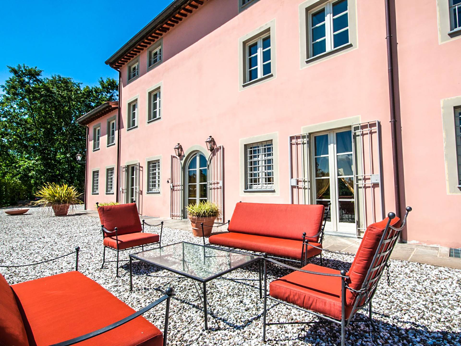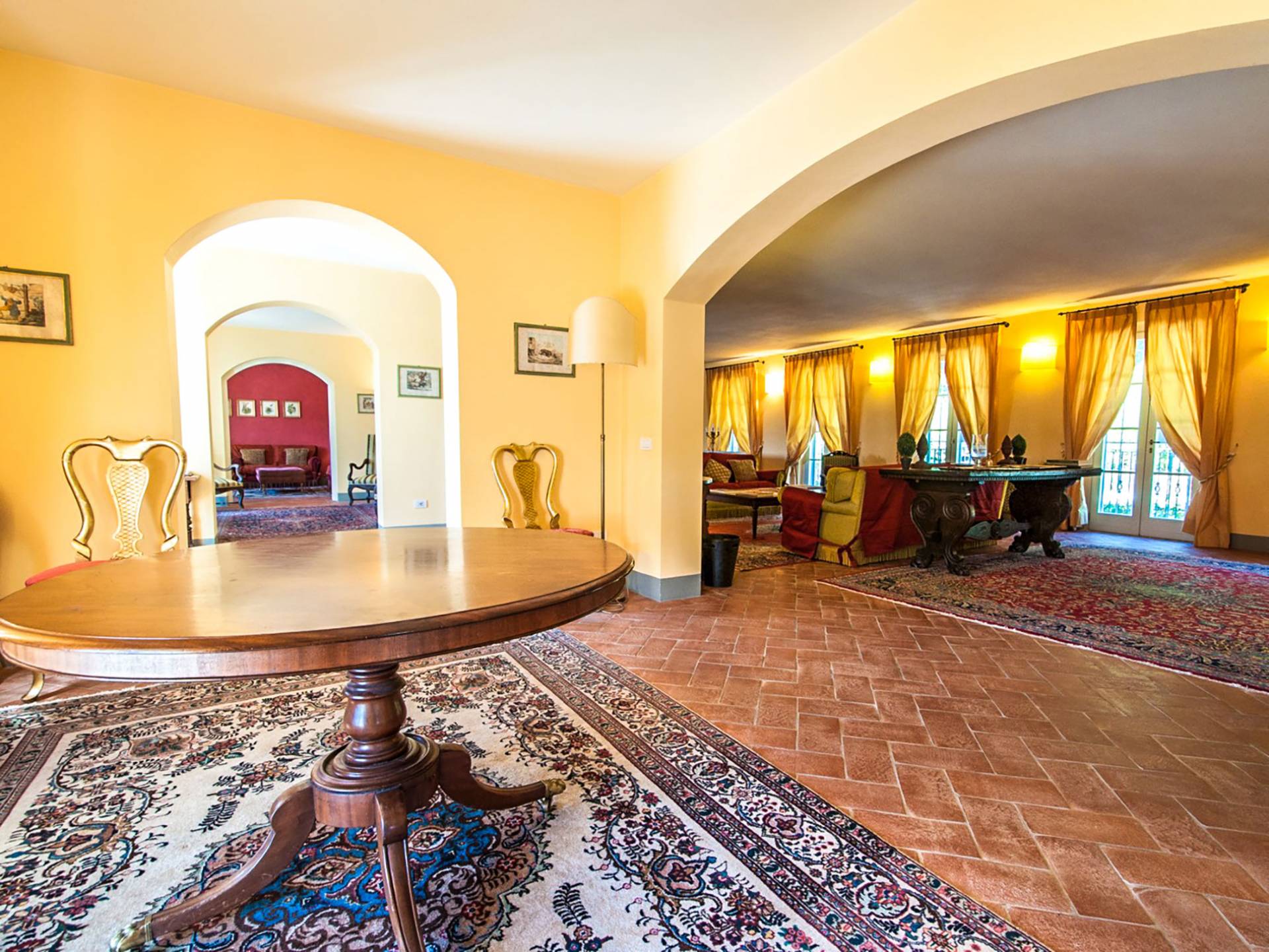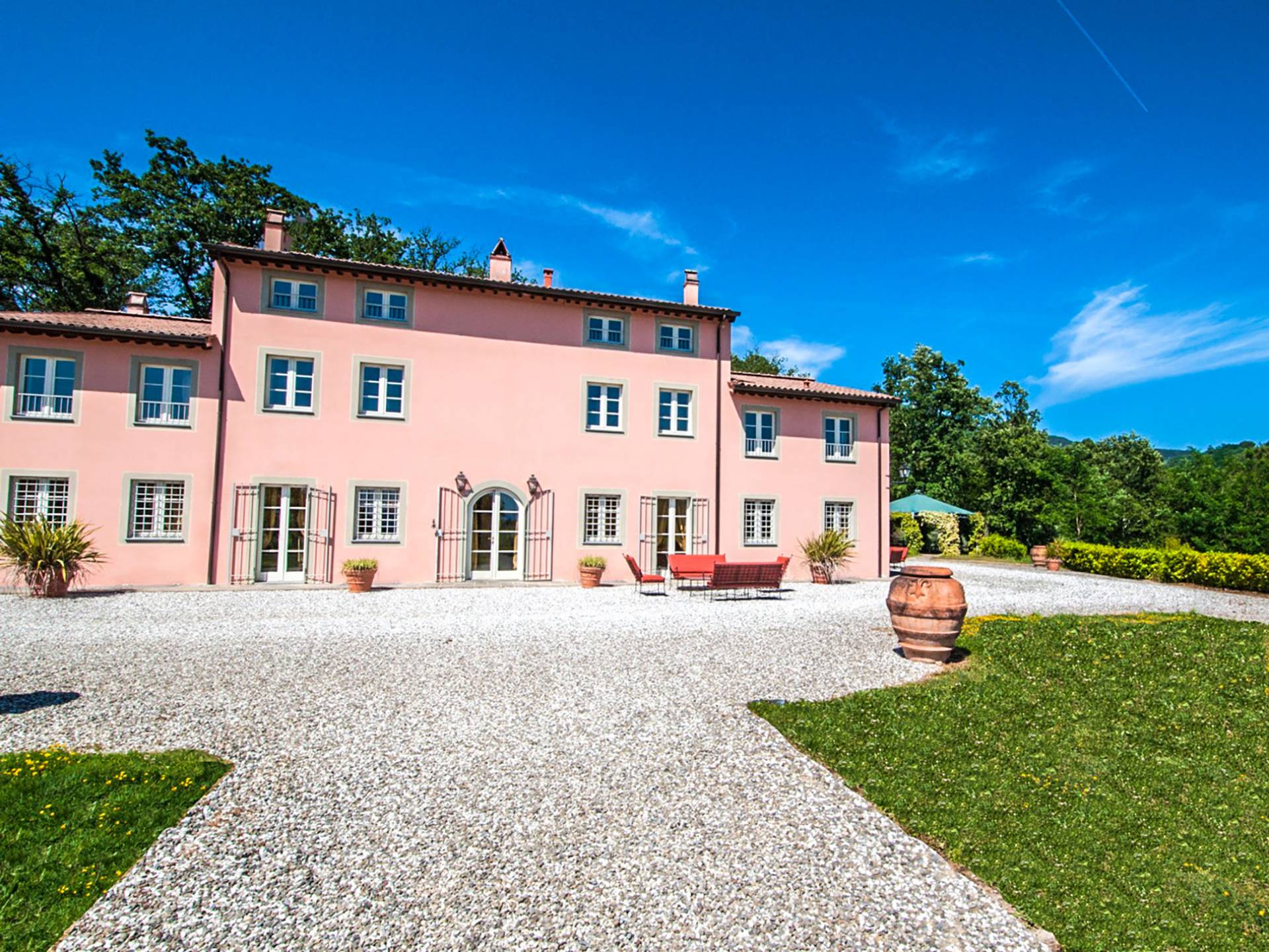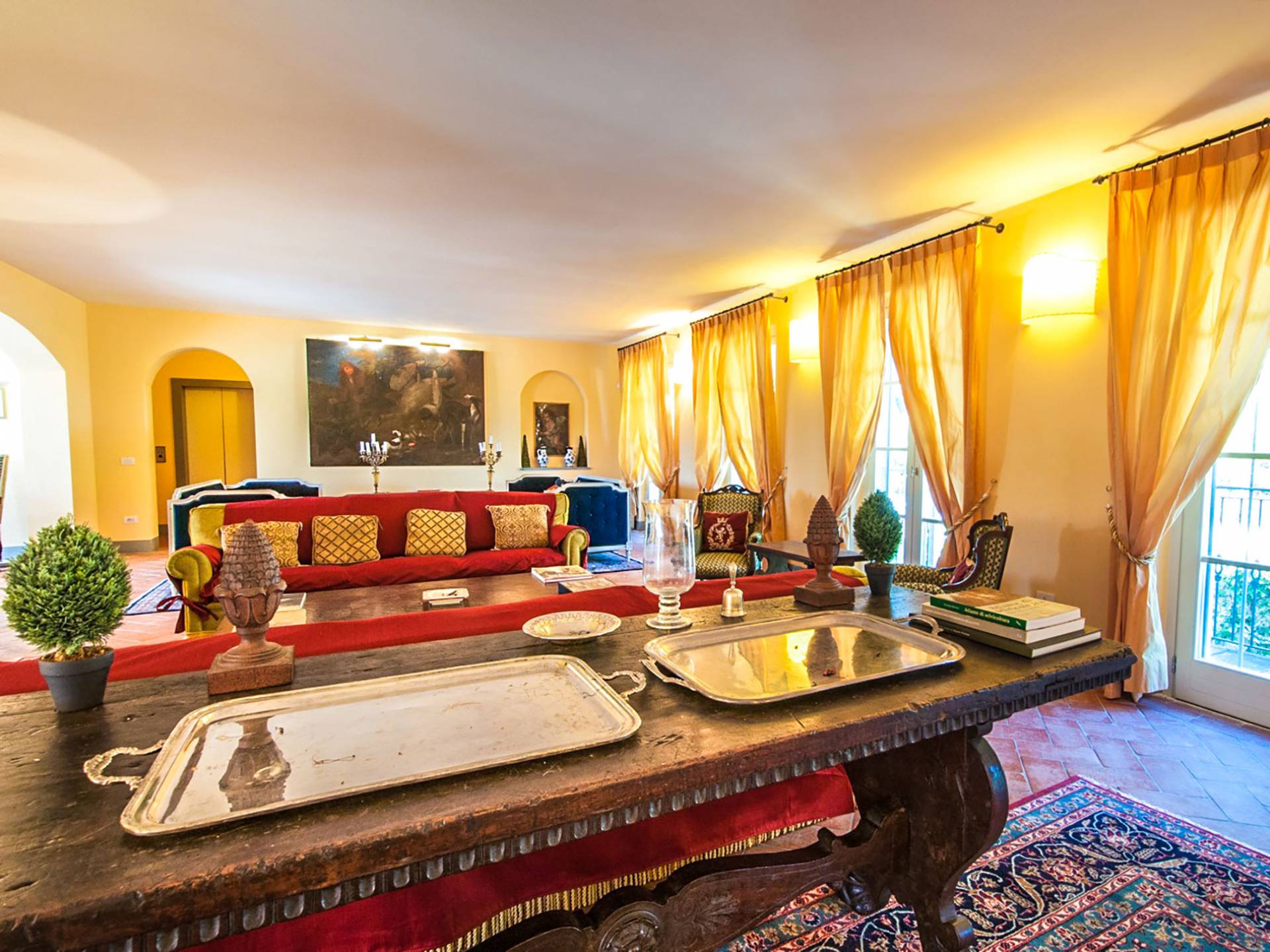 Bien que de style classique, la rénovation s'est accompagnée de matériaux contemporains, constituant une sorte de Versailles à l'échelle réduite, en Toscane. En raison de son architecture - longs couloirs avec de larges chambres en suite, grands espaces communs bien répartis dans toute la maison - cette maison est parfaite pour les grands groupes et en particulier les familles voyageant ensemble.