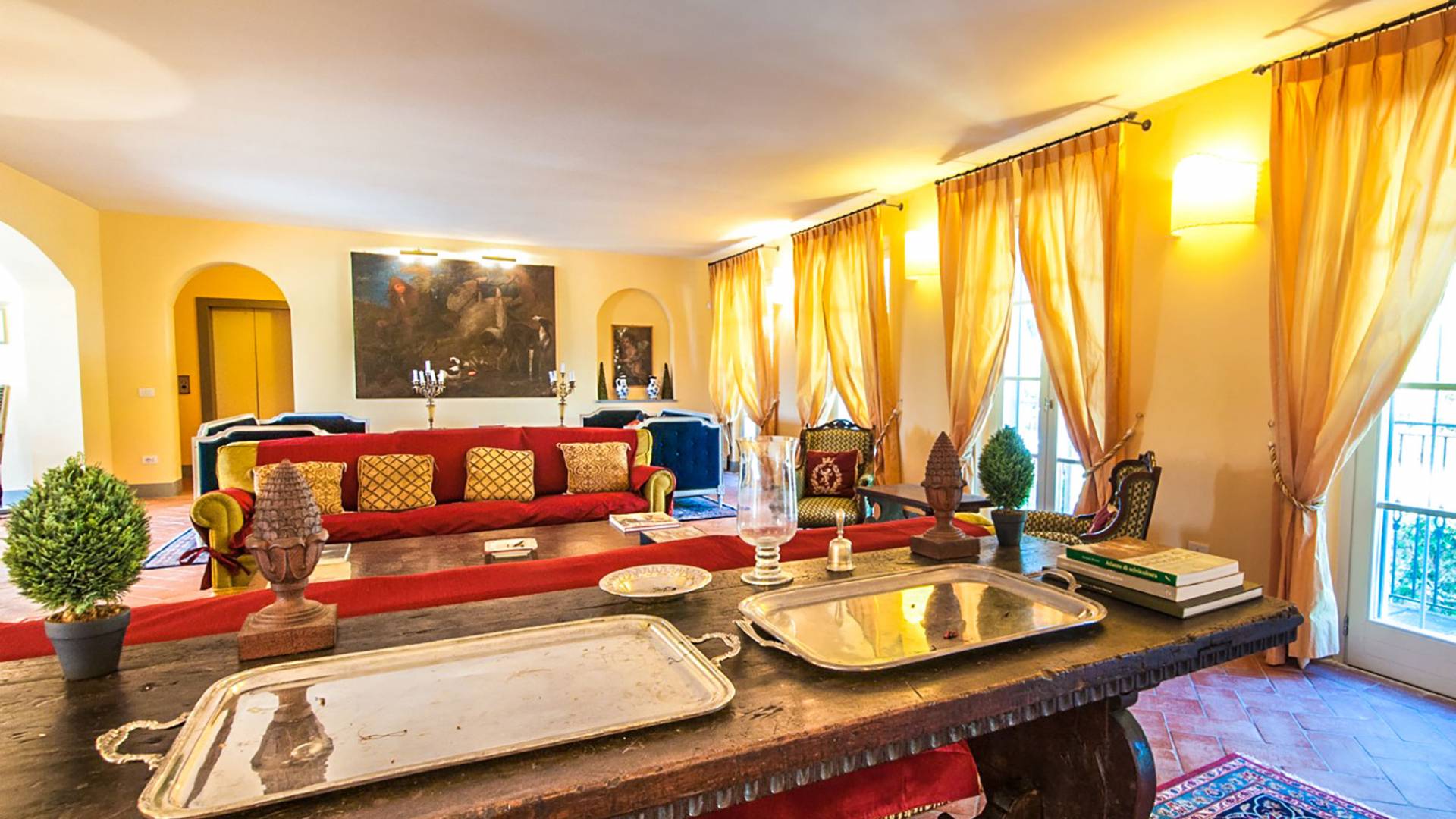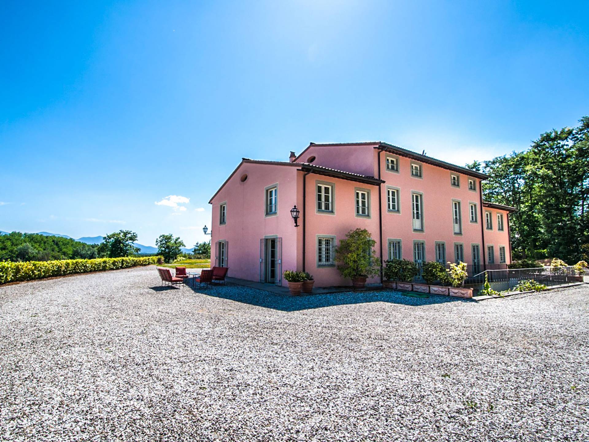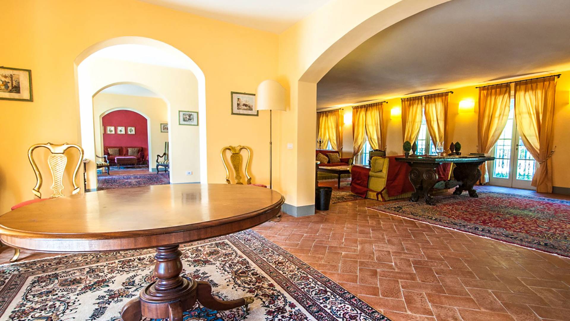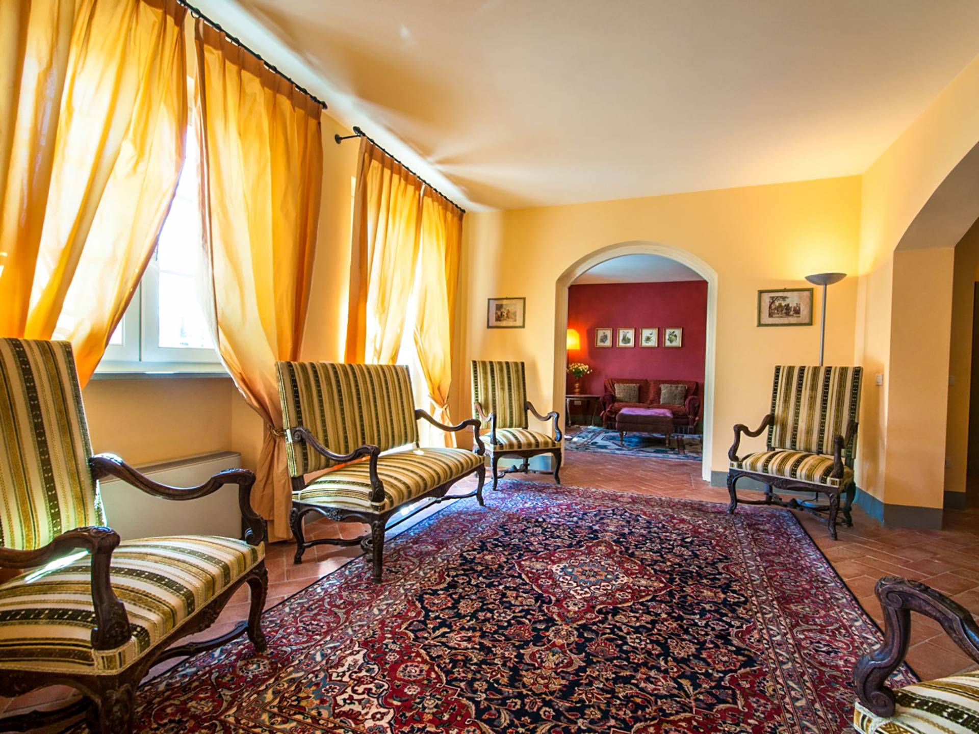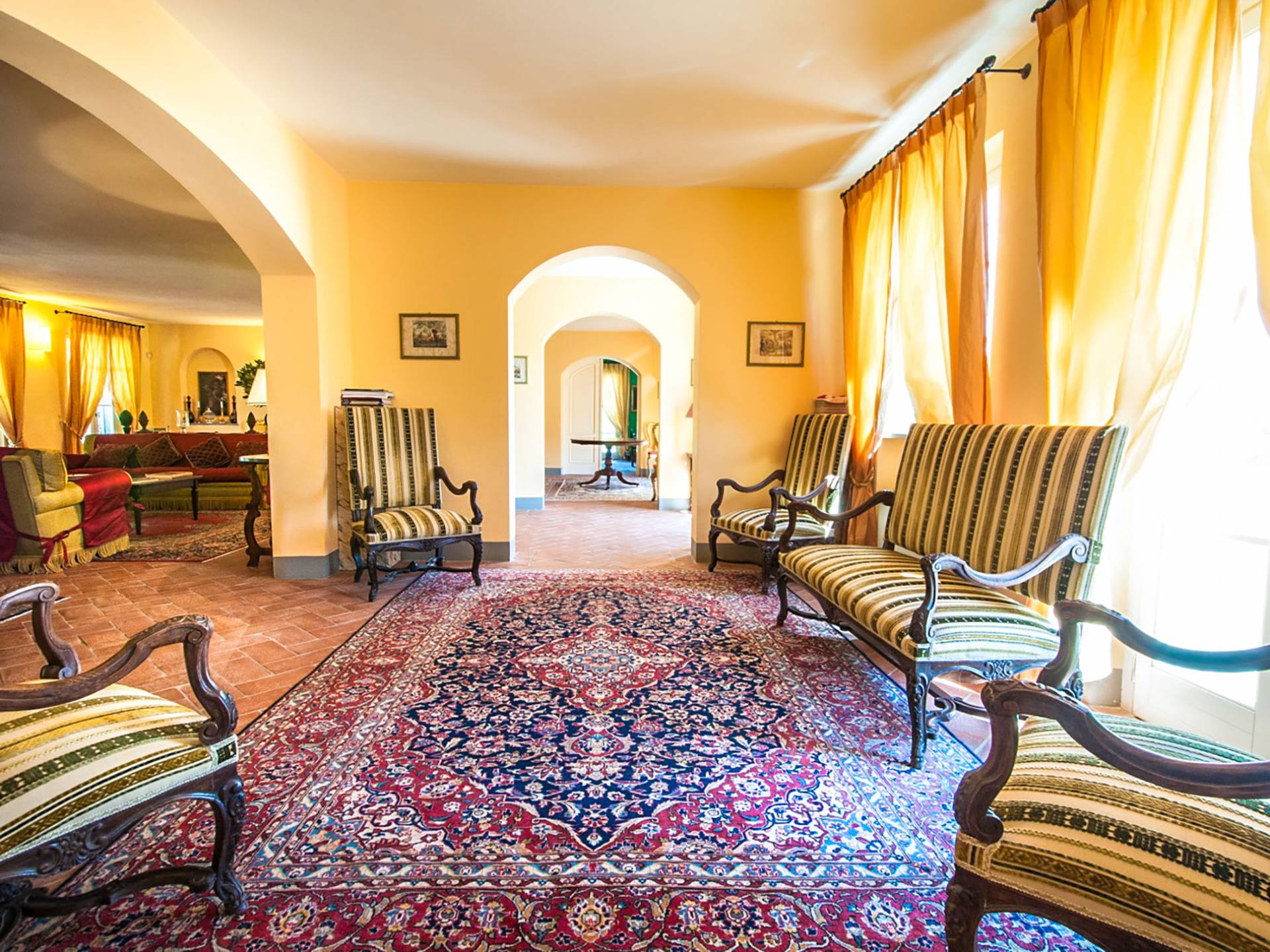 Bien que de style classique, la rénovation s'est accompagnée de matériaux contemporains, constituant une sorte de Versailles à l'échelle réduite, en Toscane. En raison de son architecture - longs couloirs avec de larges chambres en suite, grands espaces communs bien répartis dans toute la maison - cette maison est parfaite pour les grands groupes et en particulier les familles voyageant ensemble.