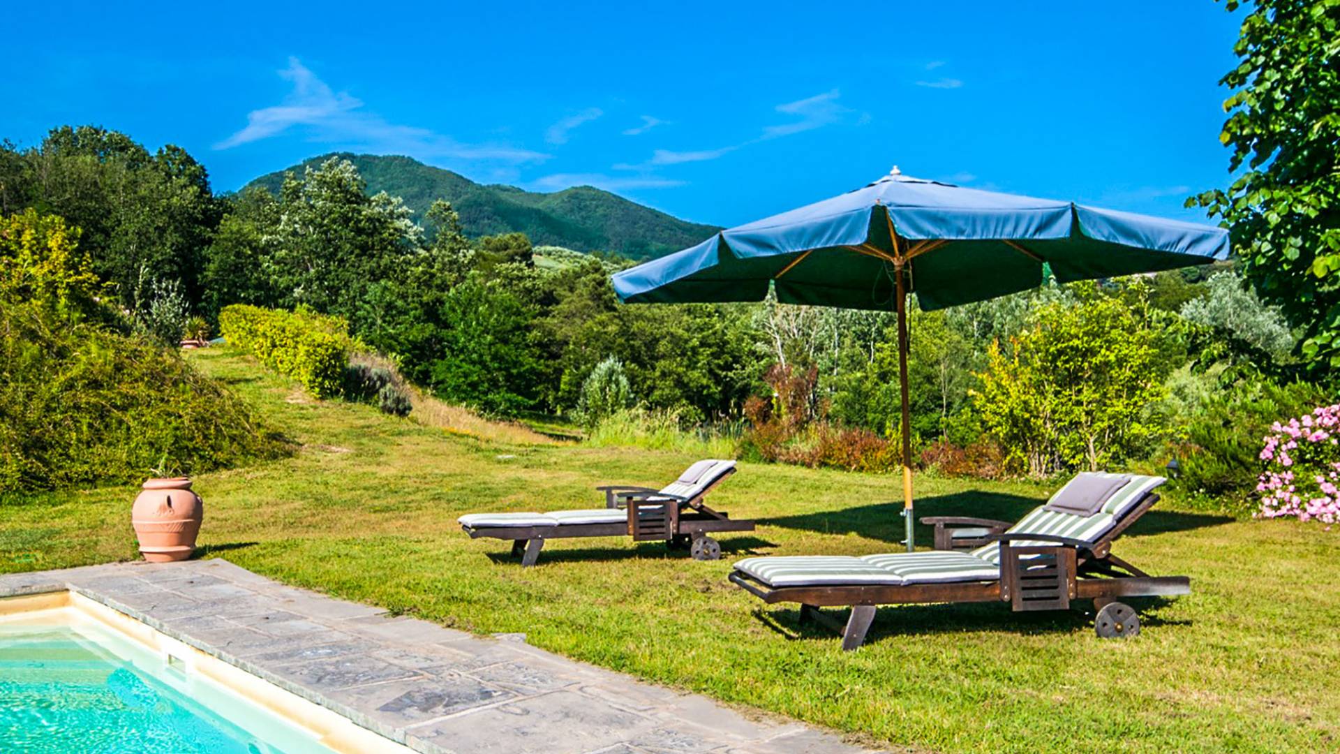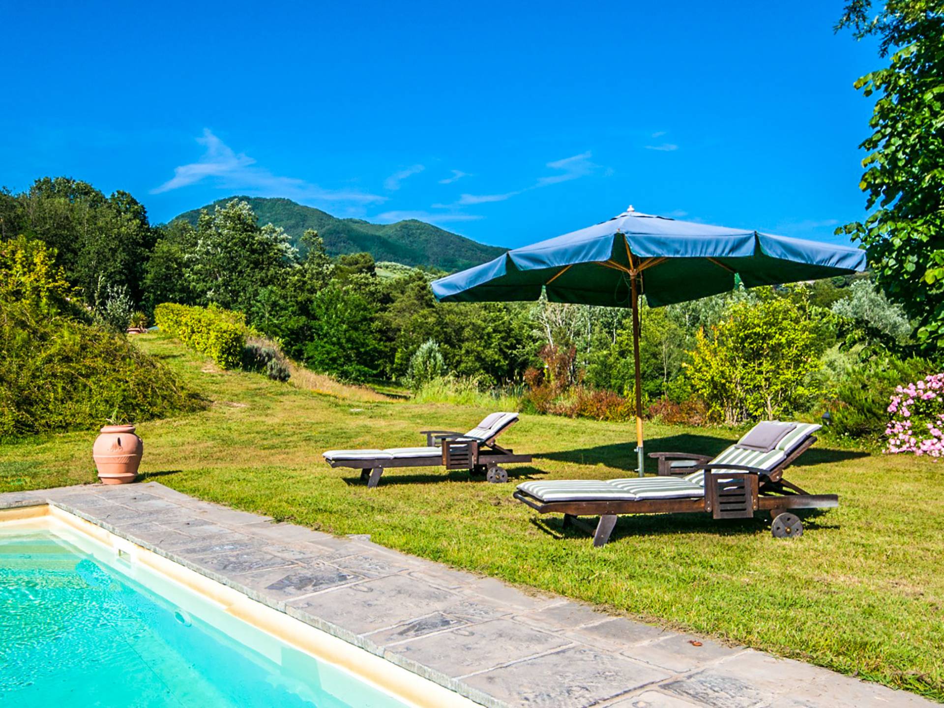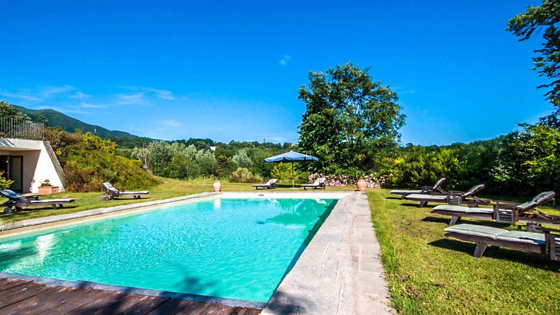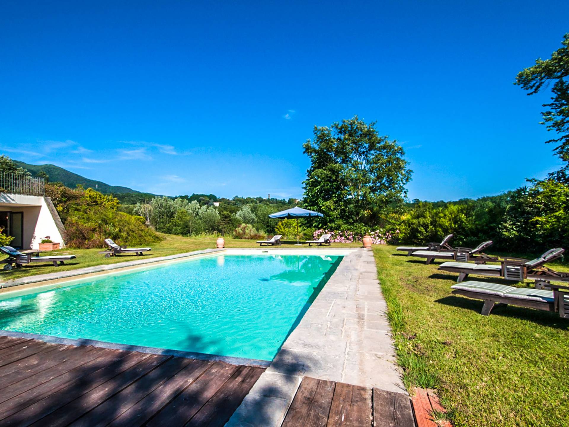 Toute la Villa Fontana Tuscany est couverte par un puissant accès Internet sans fil, afin que les clients puissent se prélasser au soleil, admirer la vue sur les environs de Lucques, écouter de la musique, répondre à leurs e-mails, faire de l'exercice et se défouler, allez pour nager, prendre une douche et se changer juste à temps pour boire un verre de l'après-midi - et ils n'ont toujours pas quitté la cour arrière. Au bord de la piscine, il y a des chaises longues en bois et des sièges pour quatorze. Adjacent à la piscine, l'établissement dispose d'un pool house avec sa propre salle de sport, un sauna, des douches avec vestiaires et un mini-bar.