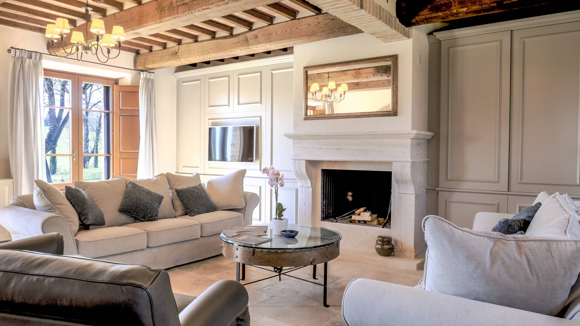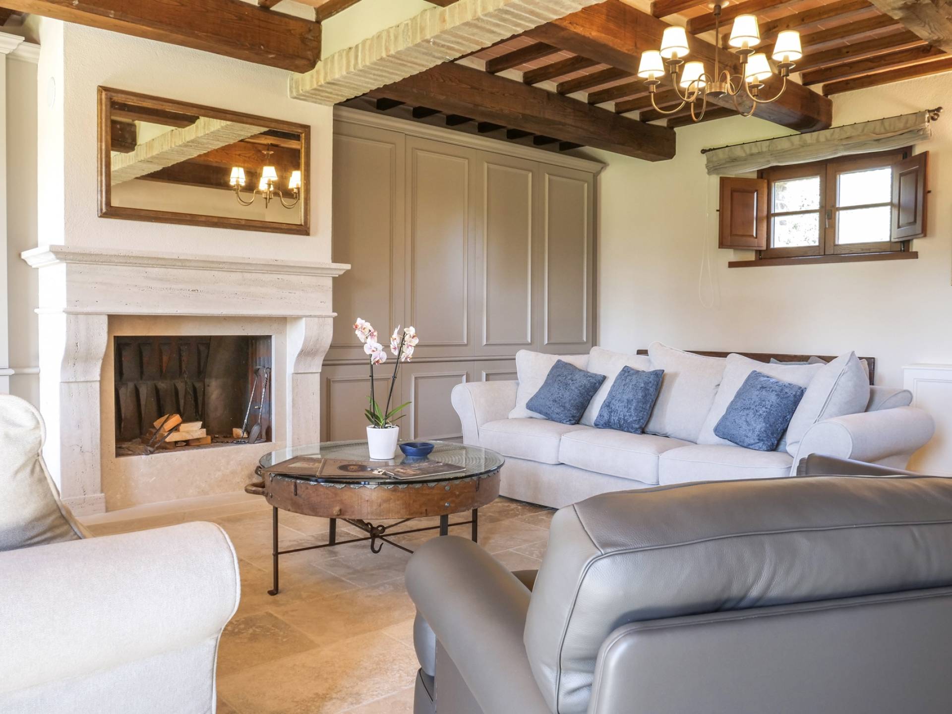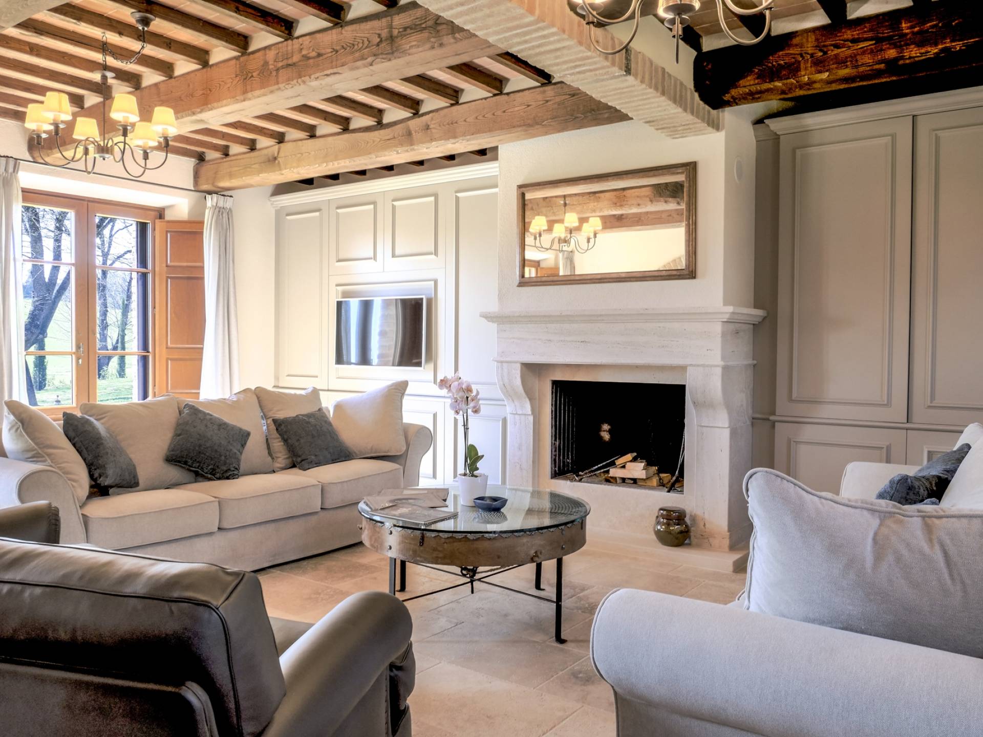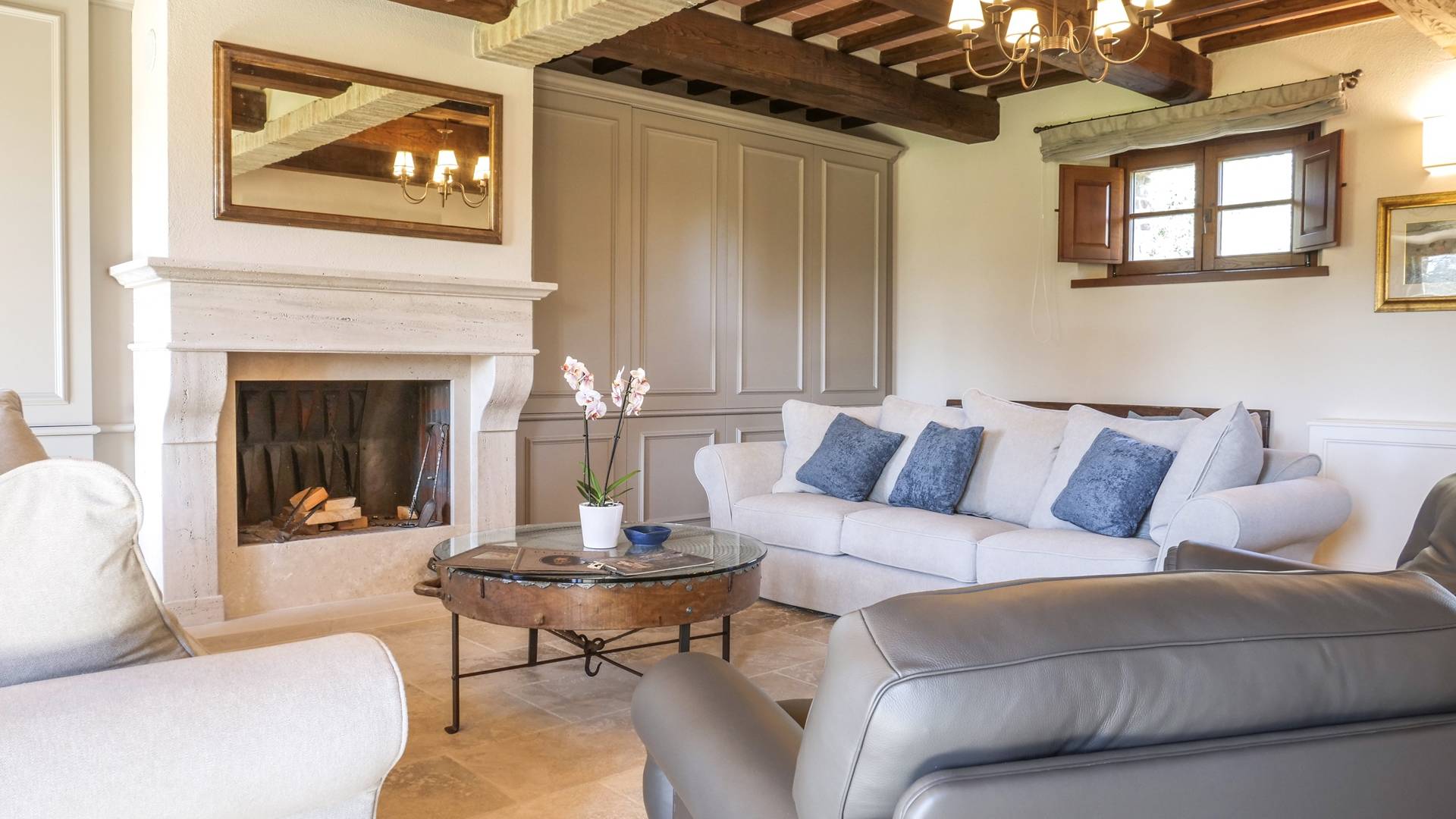 Dans le bâtiment principal, vous trouverez 5 chambres doubles toutes avec salle de bain privée. Également au rez-de-chaussée, vous serez accueillis dans un grand salon avec un grand foyer de pierre placé au centre de spectaculaires boiseries blanches. Cet espace est dominé par des canapés, aux larges assises, blancs et gris qui créent un contraste saisissant avec les poutres apparentes et le travertin des sols. Le mobilier est luxueux et raffiné et donne un aspect magique et chaleureux à l'ensemble de la maison qui dispose également d'une bibliothèque et d'une salle de conférence.