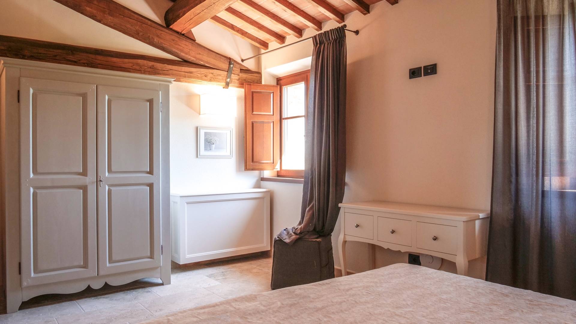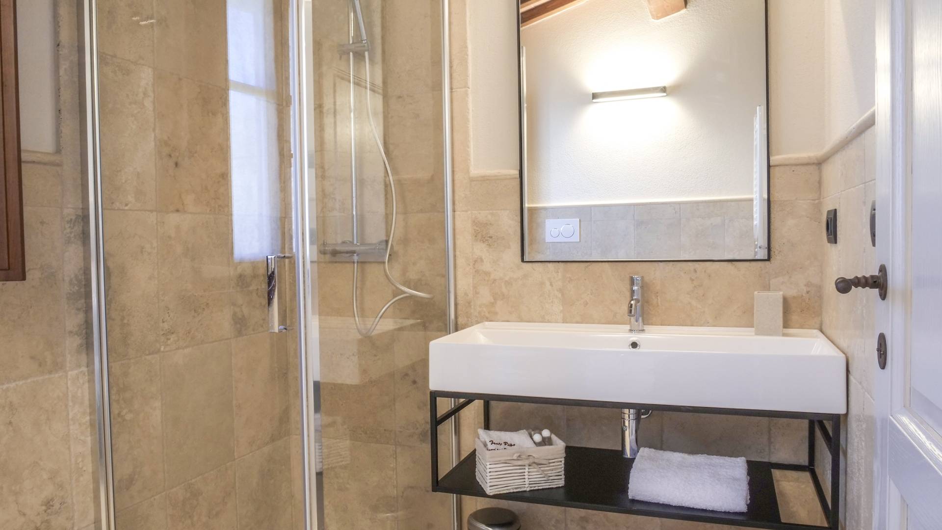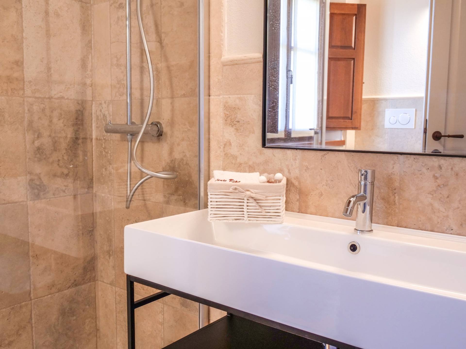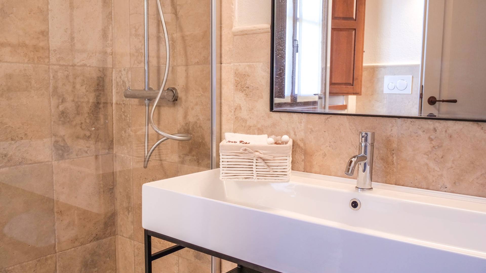 Dans le bâtiment principal, vous trouverez 5 chambres doubles toutes avec salle de bain privée. Également au rez-de-chaussée, vous serez accueillis dans un grand salon avec un grand foyer de pierre placé au centre de spectaculaires boiseries blanches. Cet espace est dominé par des canapés, aux larges assises, blancs et gris qui créent un contraste saisissant avec les poutres apparentes et le travertin des sols. Le mobilier est luxueux et raffiné et donne un aspect magique et chaleureux à l'ensemble de la maison qui dispose également d'une bibliothèque et d'une salle de conférence.