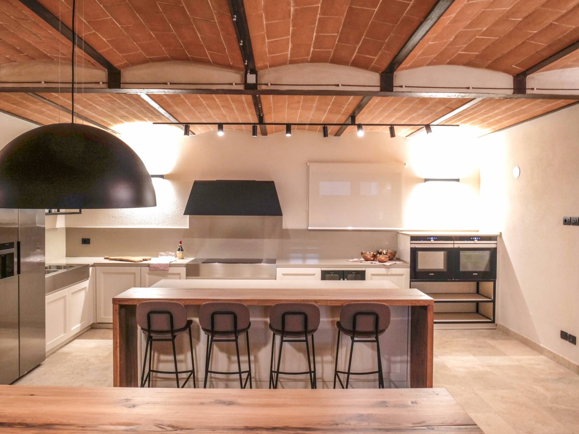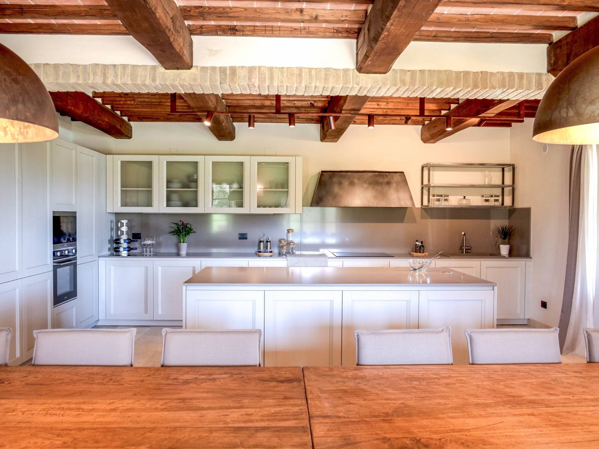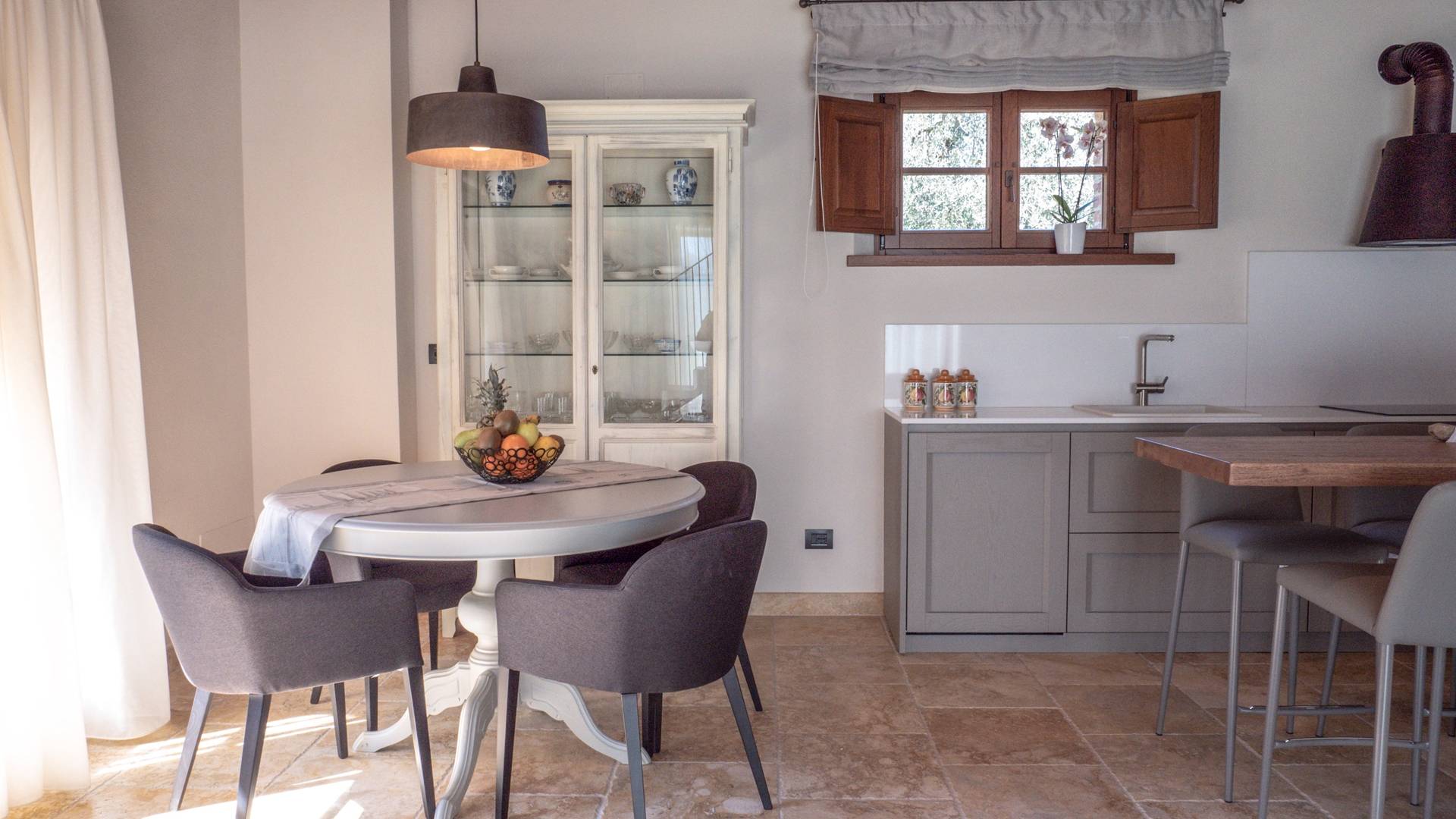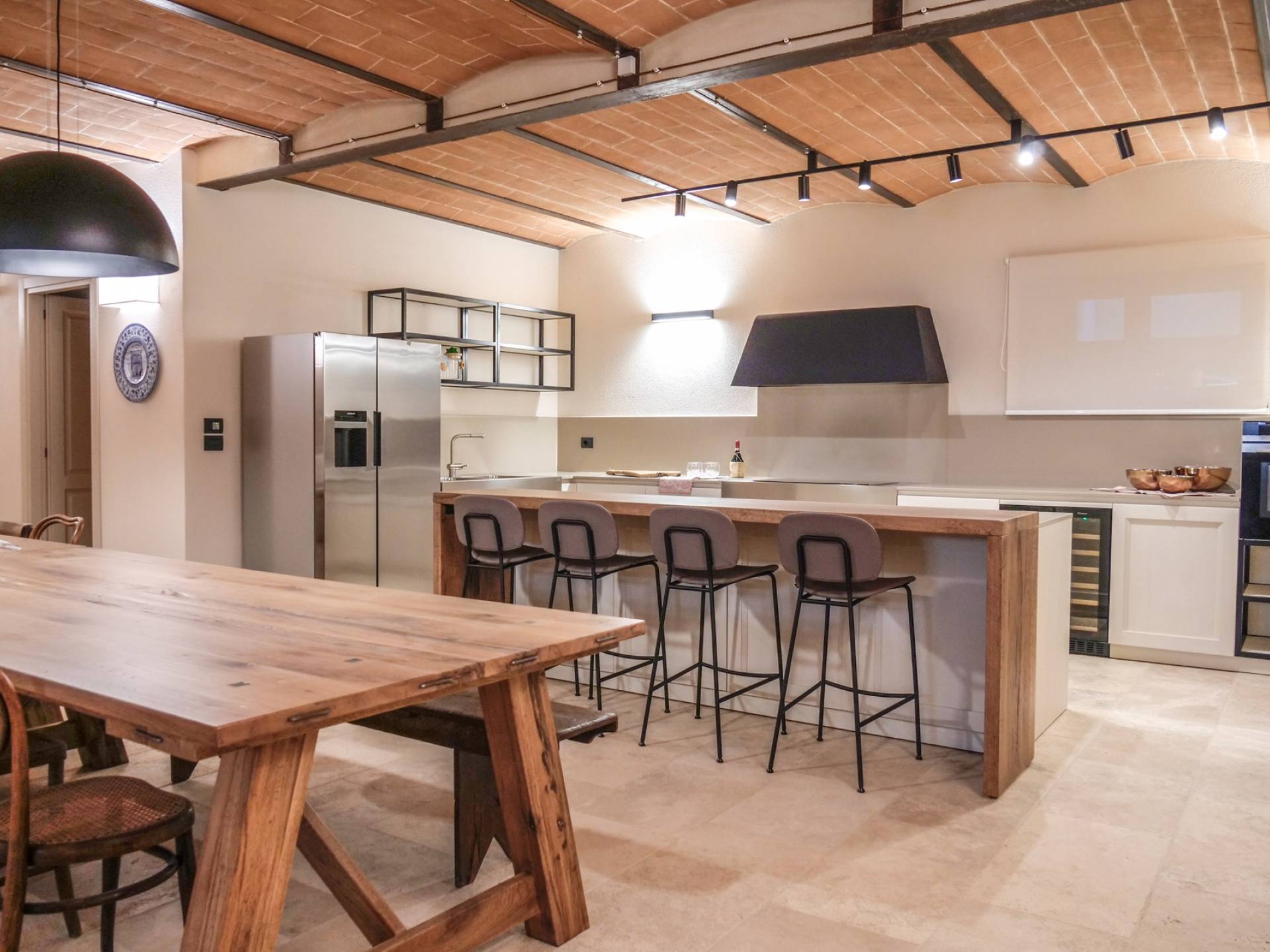 La cuisine est particulièrement confortable, avec un îlot très spacieux au centre, équipé d'une immense table à manger pouvant accueillir jusqu'à 14 convives. Four double, lave-vaisselle, micro-ondes, réfrigérateur, bouilloire complètent chaque détail avec style. Dans l'annexe, pouvant accueillir jusqu'à 4 personnes, il y a une chambre double et un canapé-lit. La structure est complètement indépendante car elle dispose également d'une cuisine, d'une salle à manger et d'un coin salon au rez-de-chaussée. A l'étage, accessible par un escalier intérieur en fer, un espace nuit très habitable et lumineux obtenu avec sagesse et maîtrise d'un ancien accessoire.