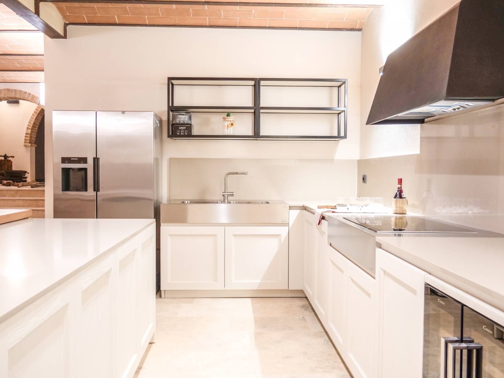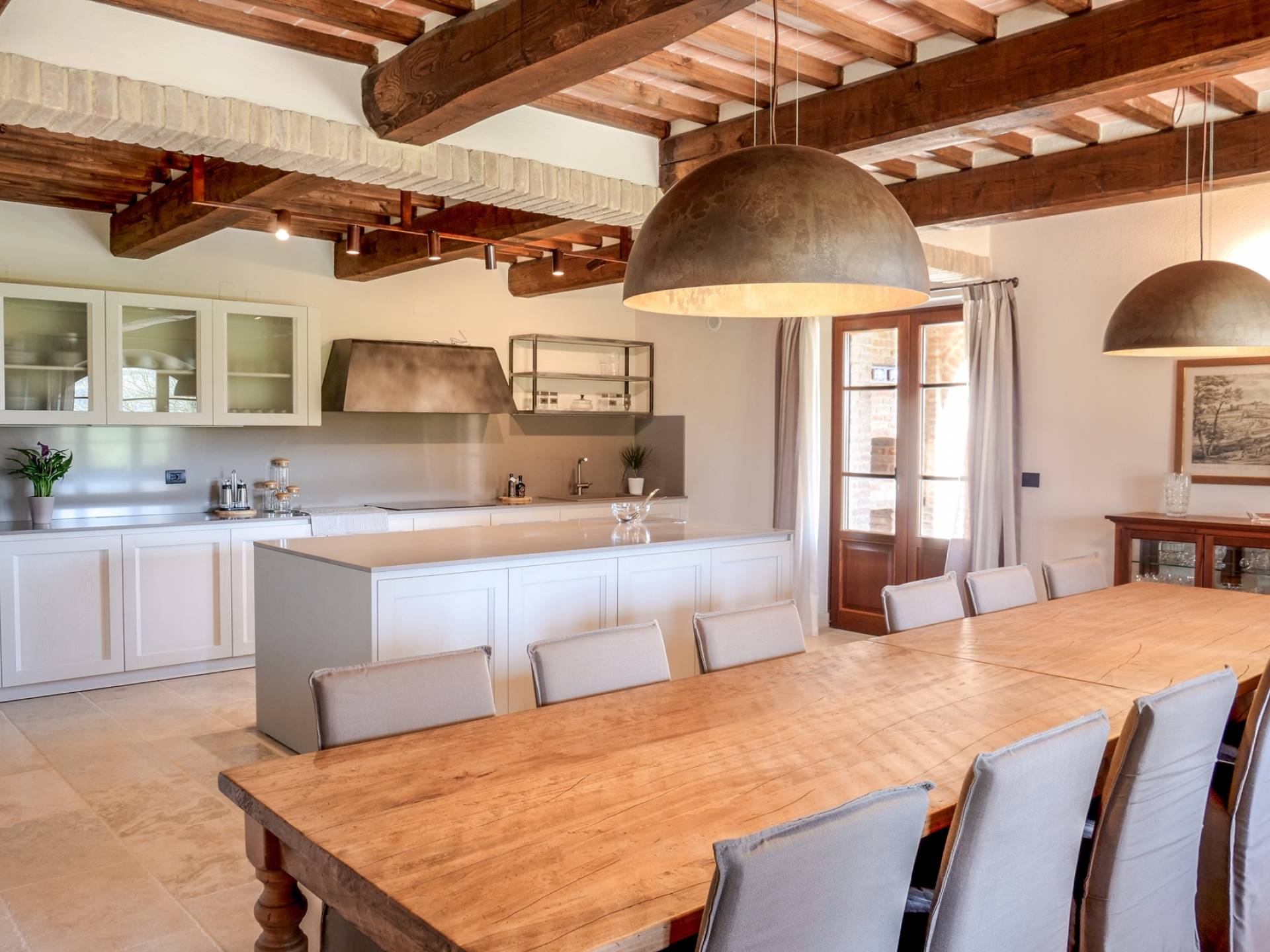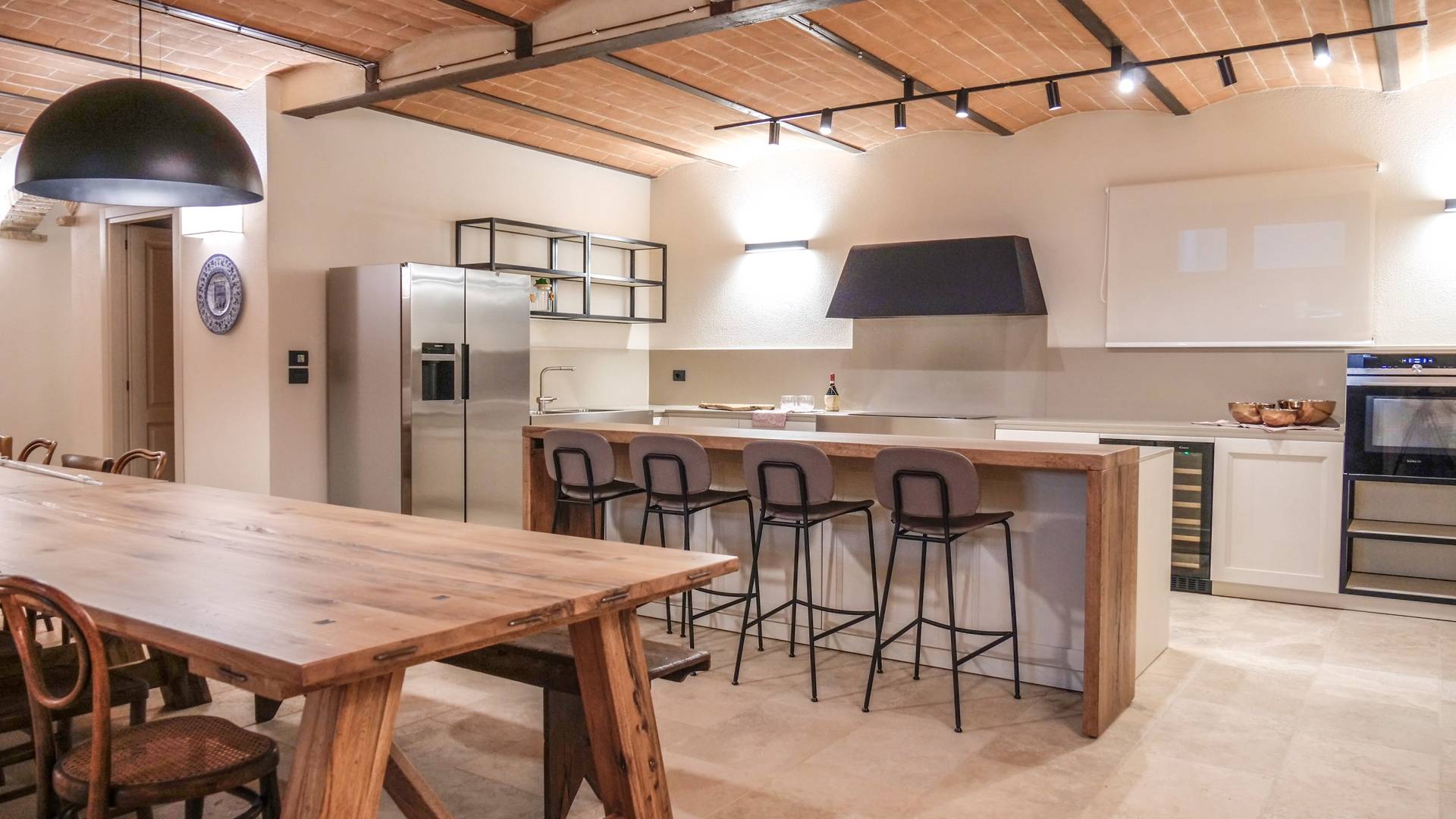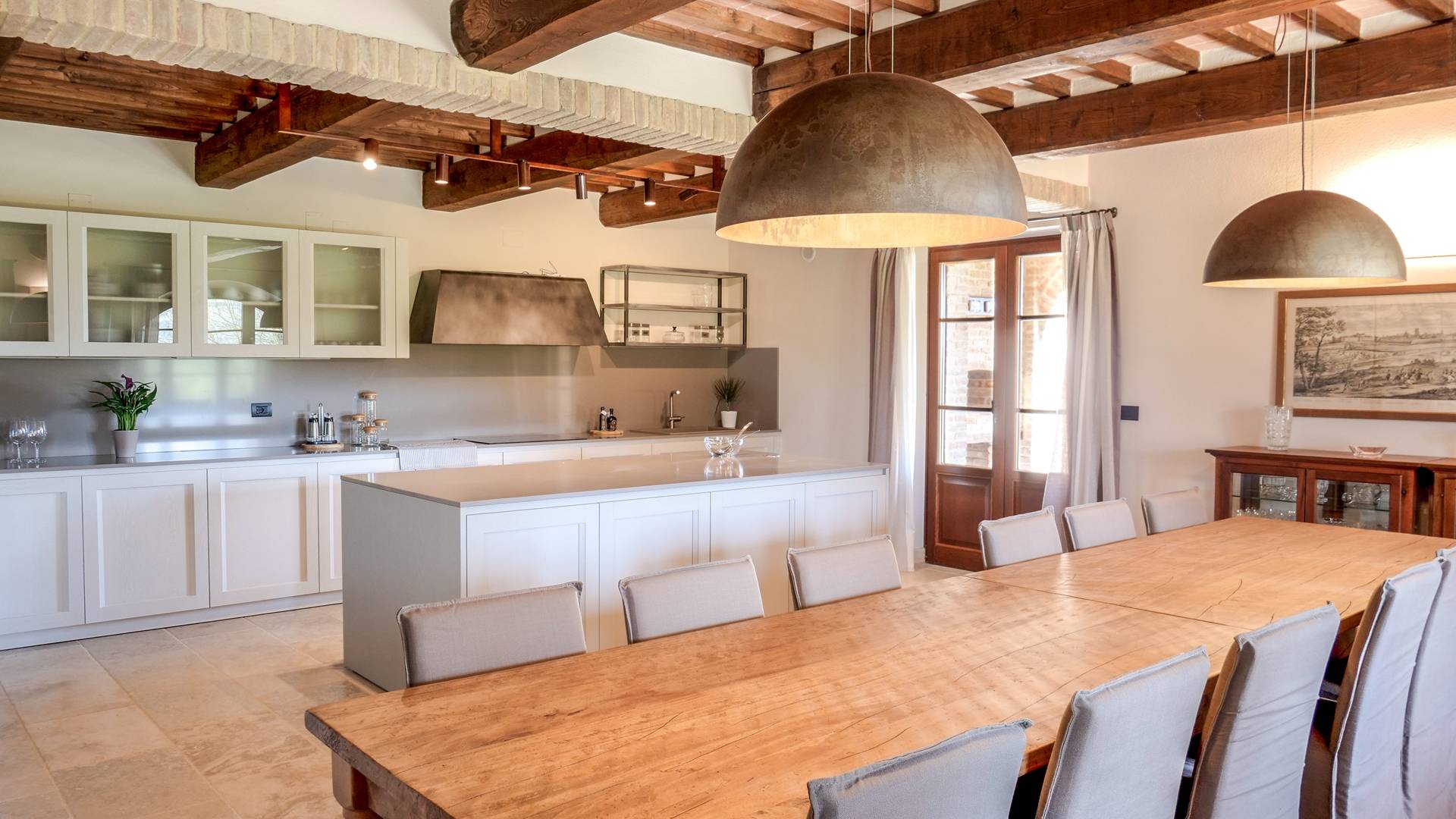 La cuisine est particulièrement confortable, avec un îlot très spacieux au centre, équipé d'une immense table à manger pouvant accueillir jusqu'à 14 convives. Four double, lave-vaisselle, micro-ondes, réfrigérateur, bouilloire complètent chaque détail avec style. Dans l'annexe, pouvant accueillir jusqu'à 4 personnes, il y a une chambre double et un canapé-lit. La structure est complètement indépendante car elle dispose également d'une cuisine, d'une salle à manger et d'un coin salon au rez-de-chaussée. A l'étage, accessible par un escalier intérieur en fer, un espace nuit très habitable et lumineux obtenu avec sagesse et maîtrise d'un ancien accessoire.
