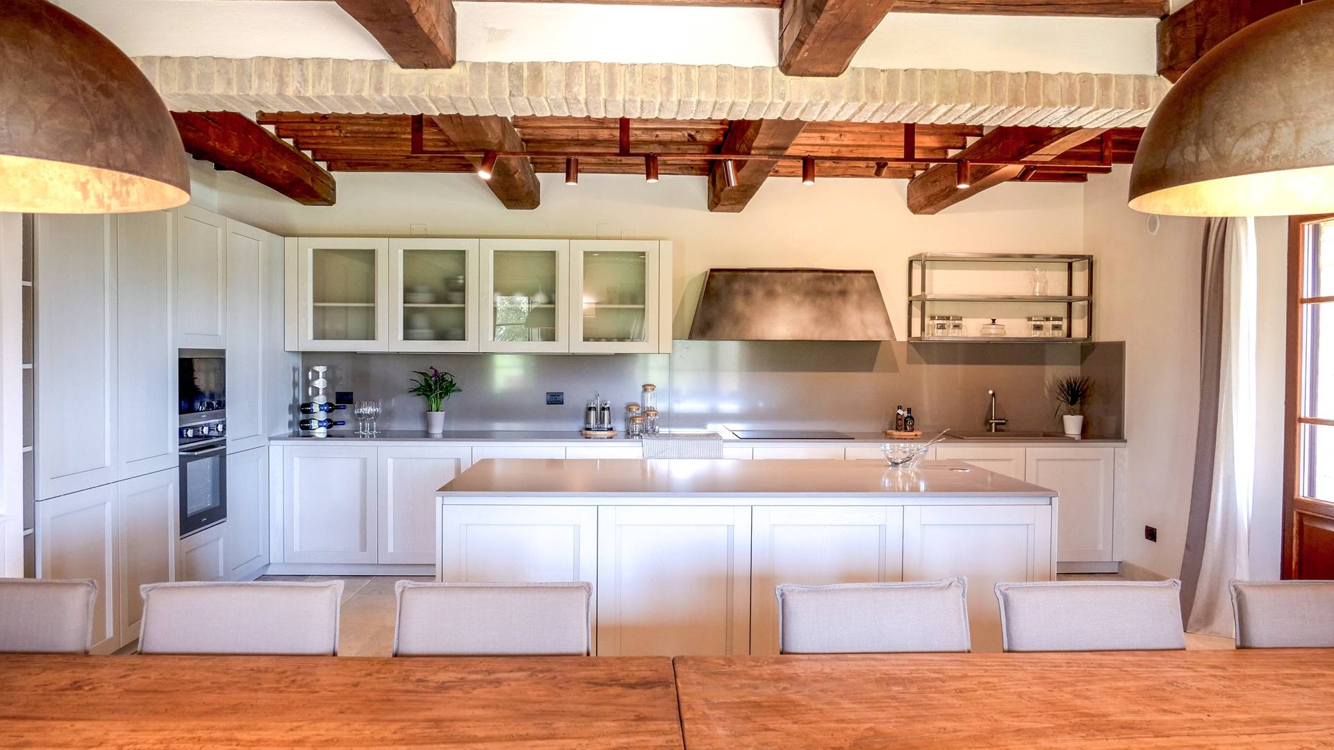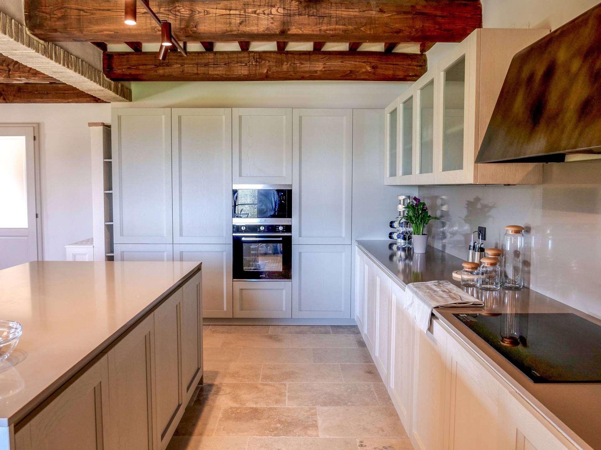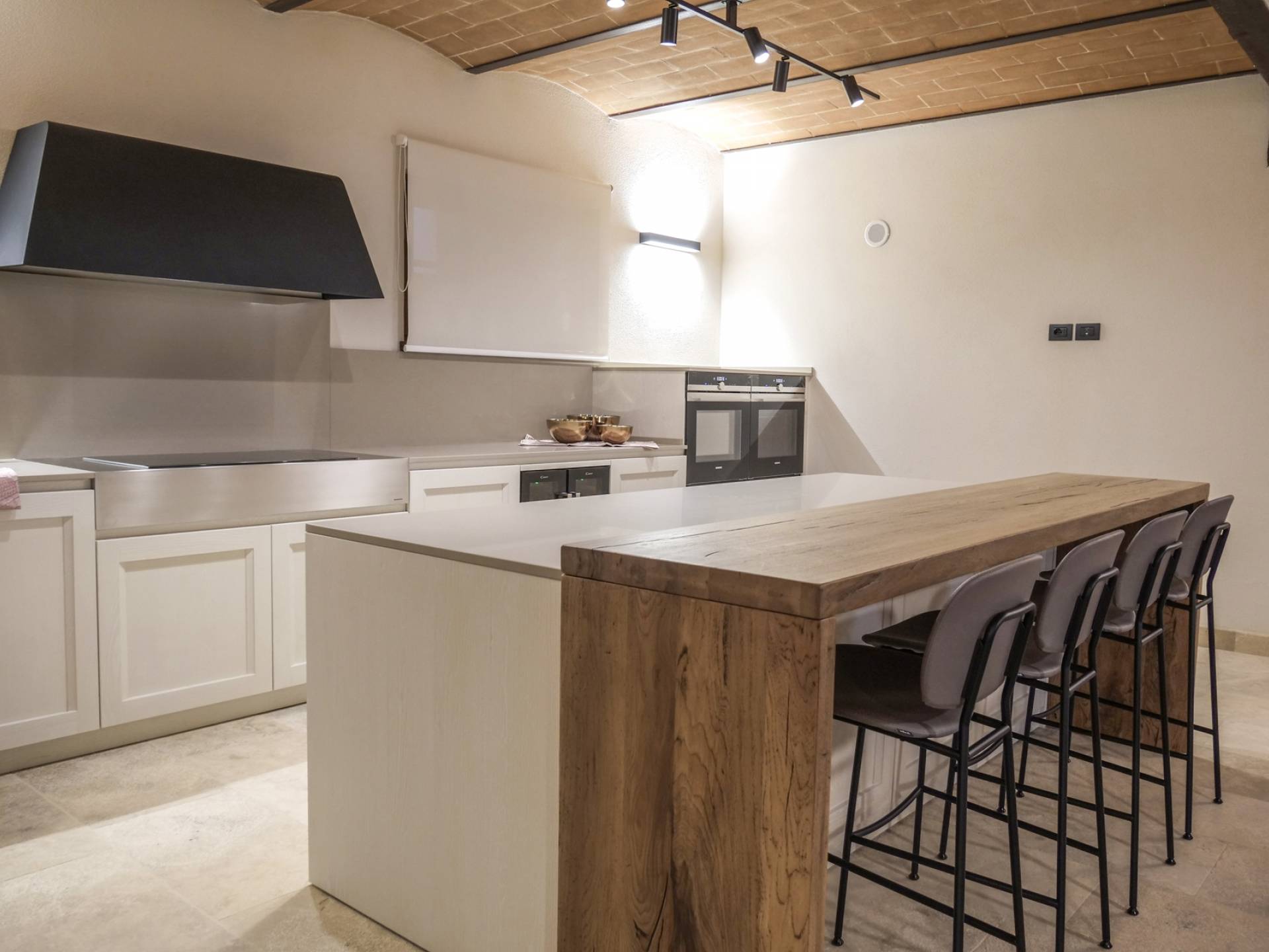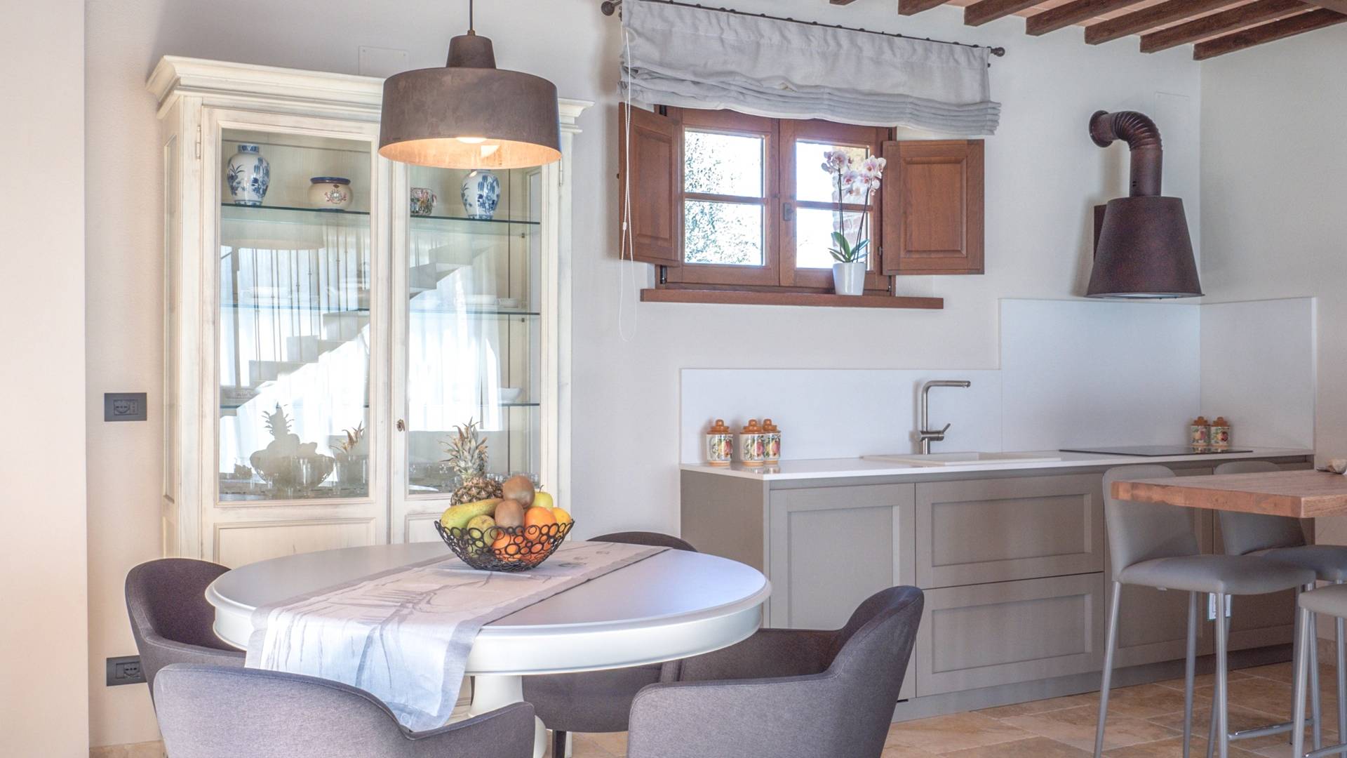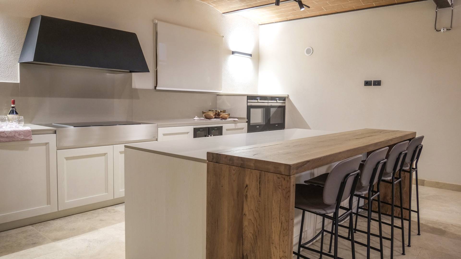 La cuisine est particulièrement confortable, avec un îlot très spacieux au centre, équipé d'une immense table à manger pouvant accueillir jusqu'à 14 convives. Four double, lave-vaisselle, micro-ondes, réfrigérateur, bouilloire complètent chaque détail avec style. Dans l'annexe, pouvant accueillir jusqu'à 4 personnes, il y a une chambre double et un canapé-lit. La structure est complètement indépendante car elle dispose également d'une cuisine, d'une salle à manger et d'un coin salon au rez-de-chaussée. A l'étage, accessible par un escalier intérieur en fer, un espace nuit très habitable et lumineux obtenu avec sagesse et maîtrise d'un ancien accessoire.