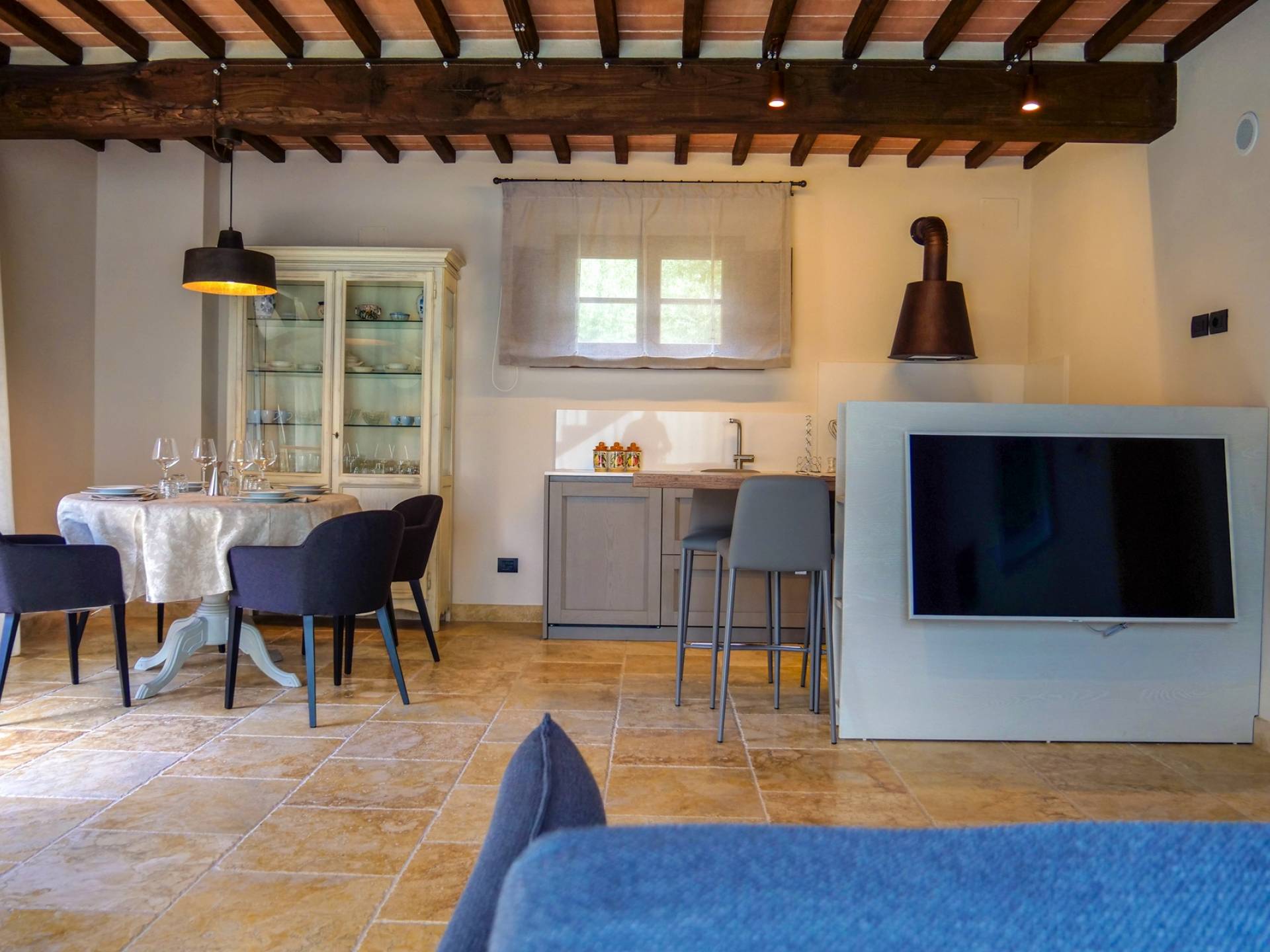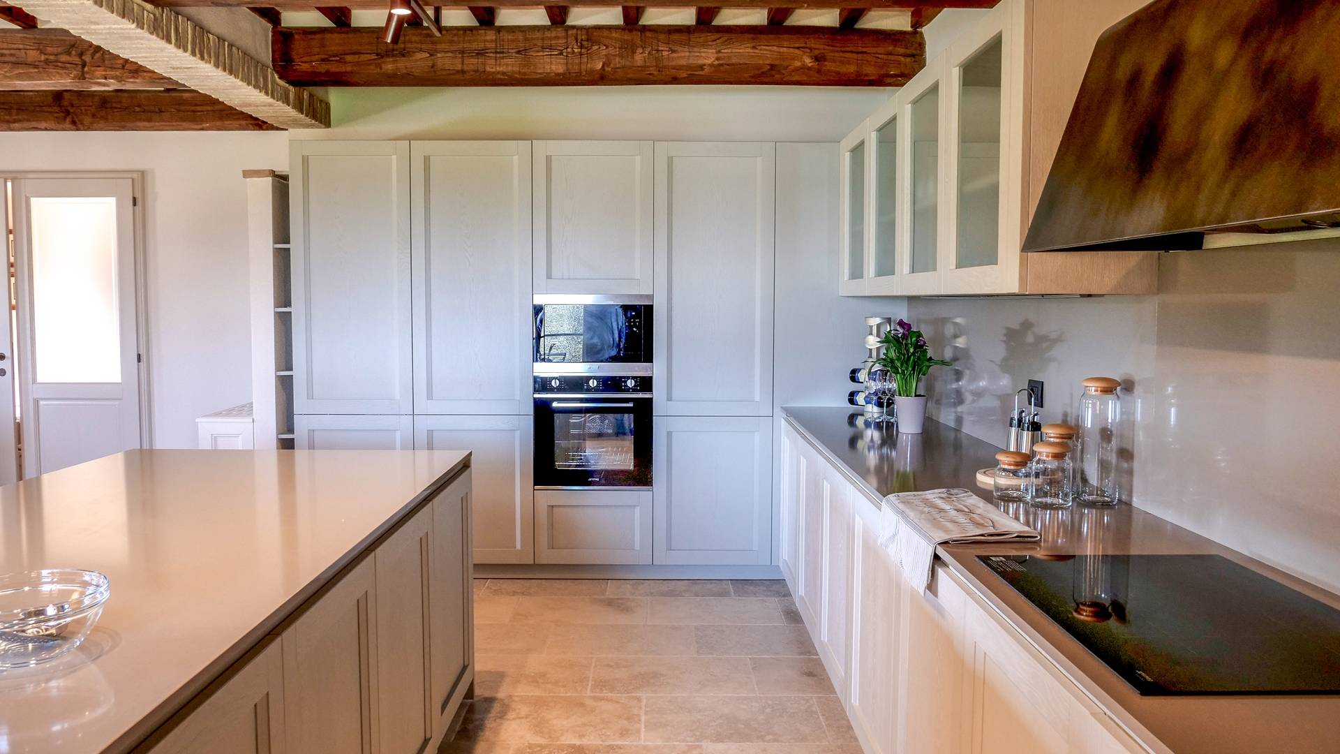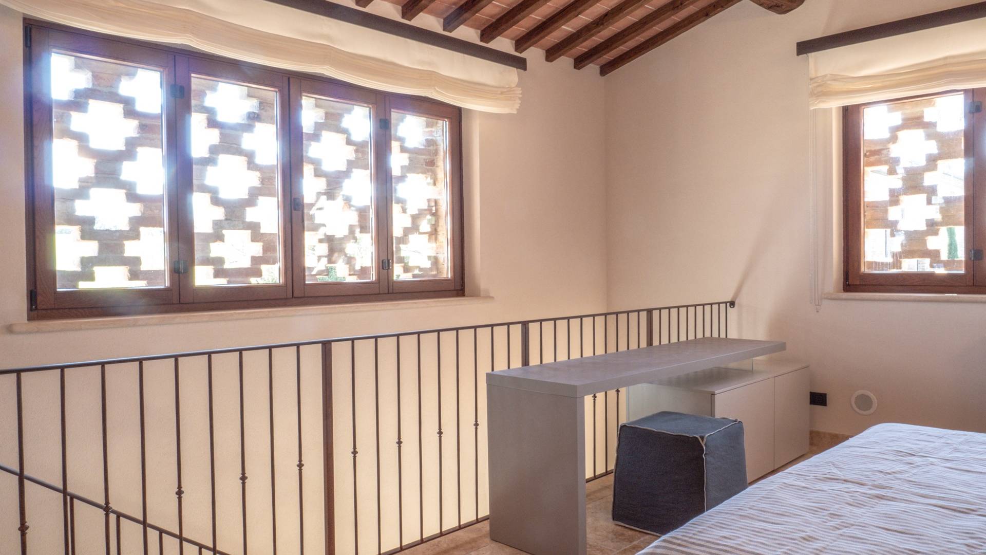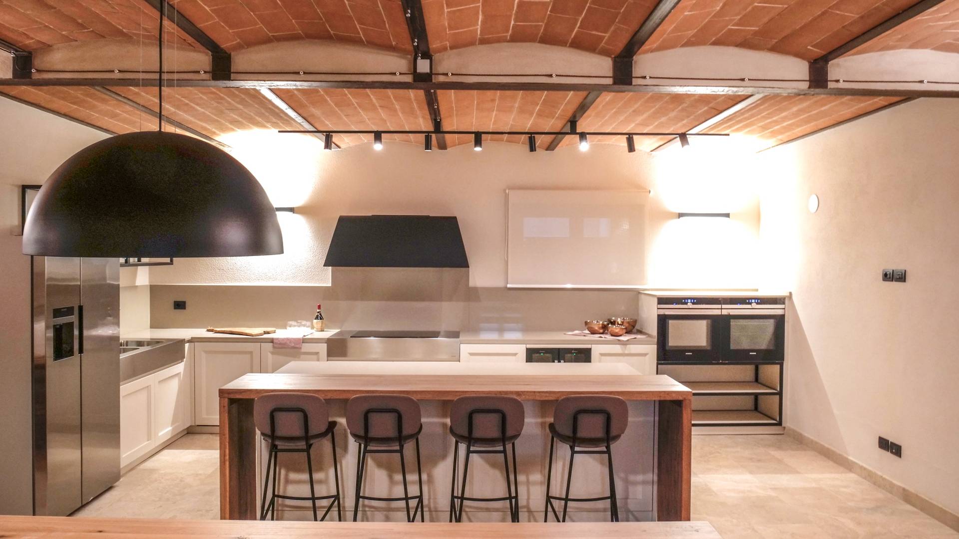 La cuisine est particulièrement confortable, avec un îlot très spacieux au centre, équipé d'une immense table à manger pouvant accueillir jusqu'à 14 convives. Four double, lave-vaisselle, micro-ondes, réfrigérateur, bouilloire complètent chaque détail avec style. Dans l'annexe, pouvant accueillir jusqu'à 4 personnes, il y a une chambre double et un canapé-lit. La structure est complètement indépendante car elle dispose également d'une cuisine, d'une salle à manger et d'un coin salon au rez-de-chaussée. A l'étage, accessible par un escalier intérieur en fer, un espace nuit très habitable et lumineux obtenu avec sagesse et maîtrise d'un ancien accessoire.