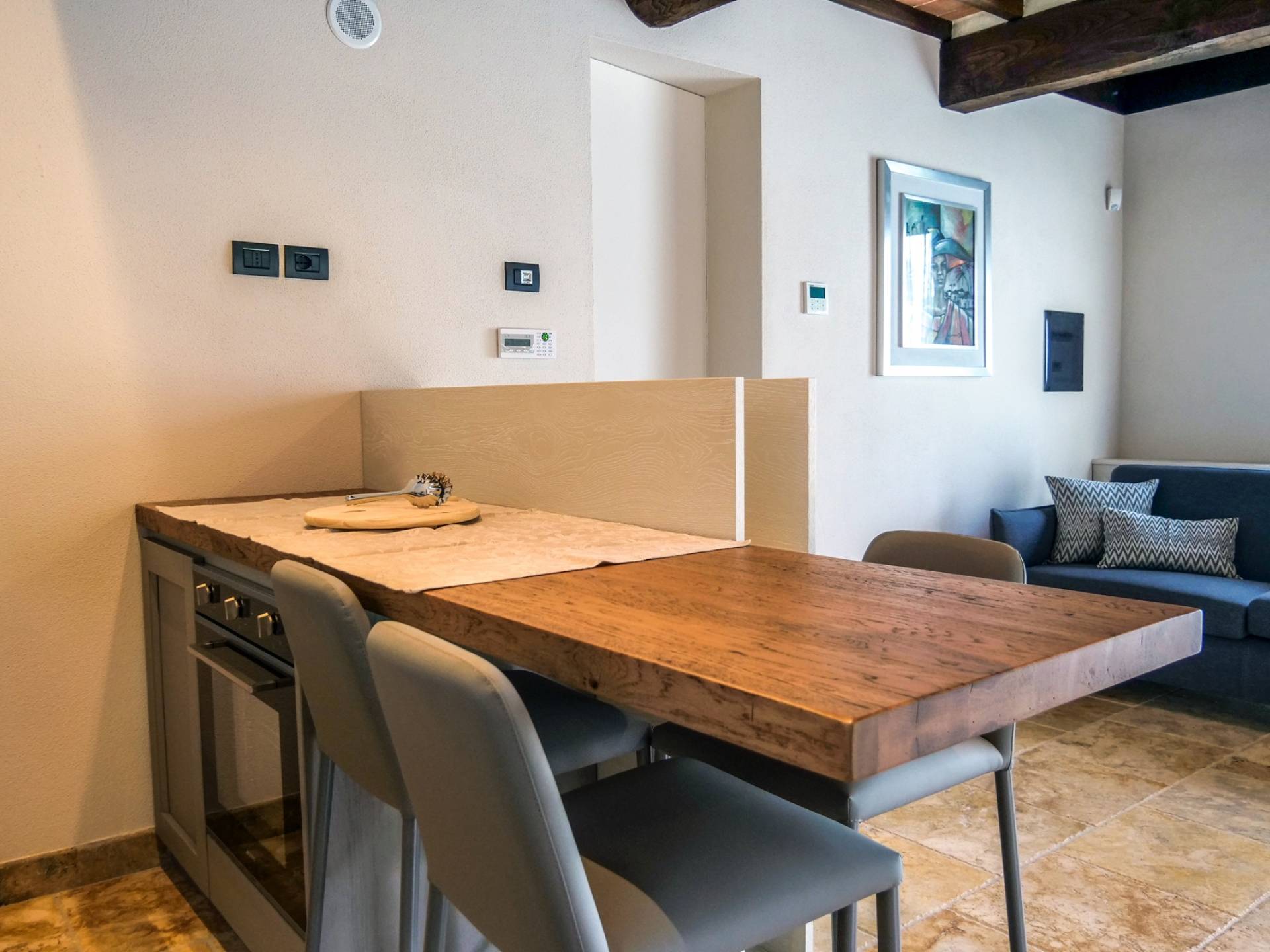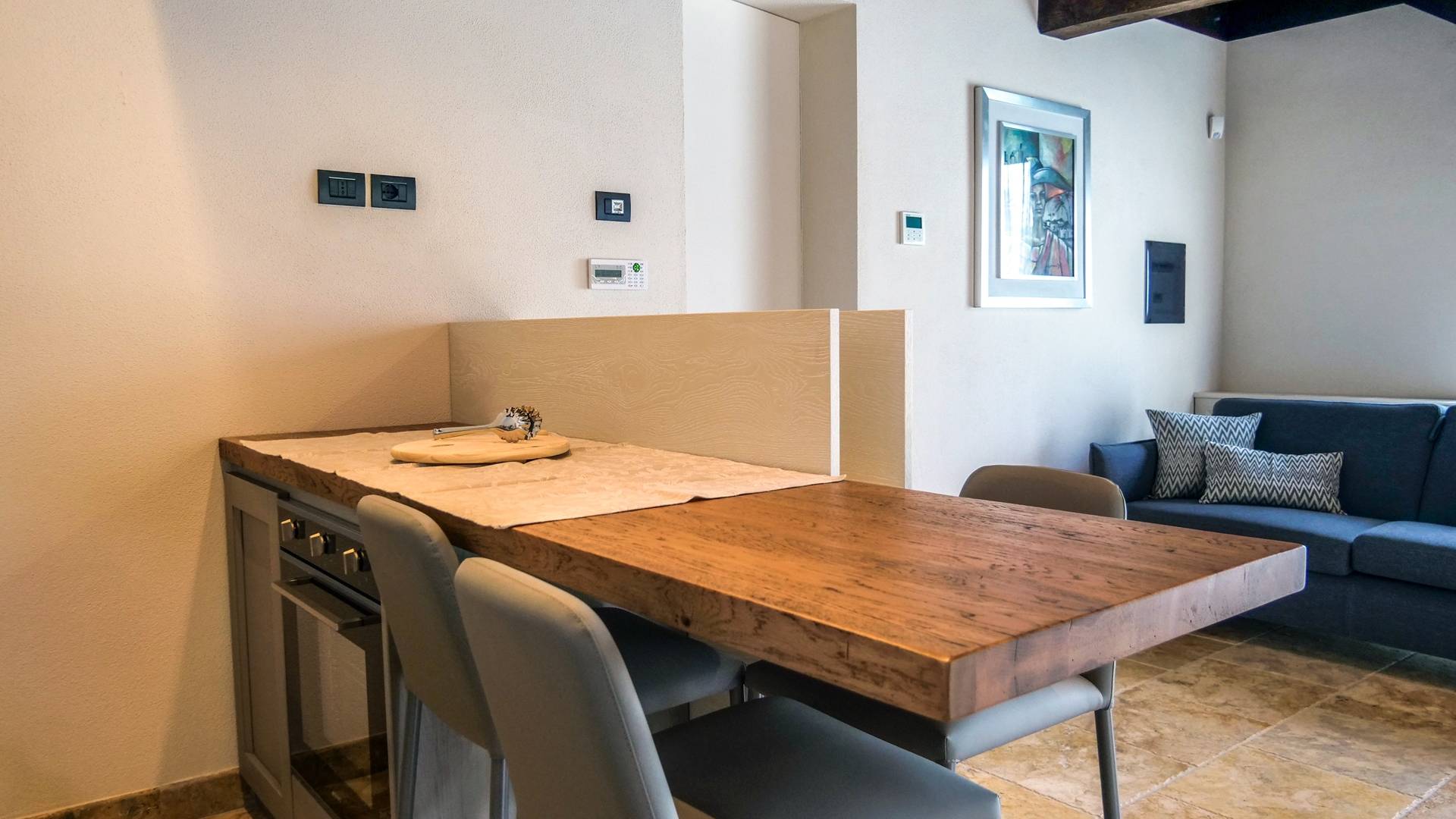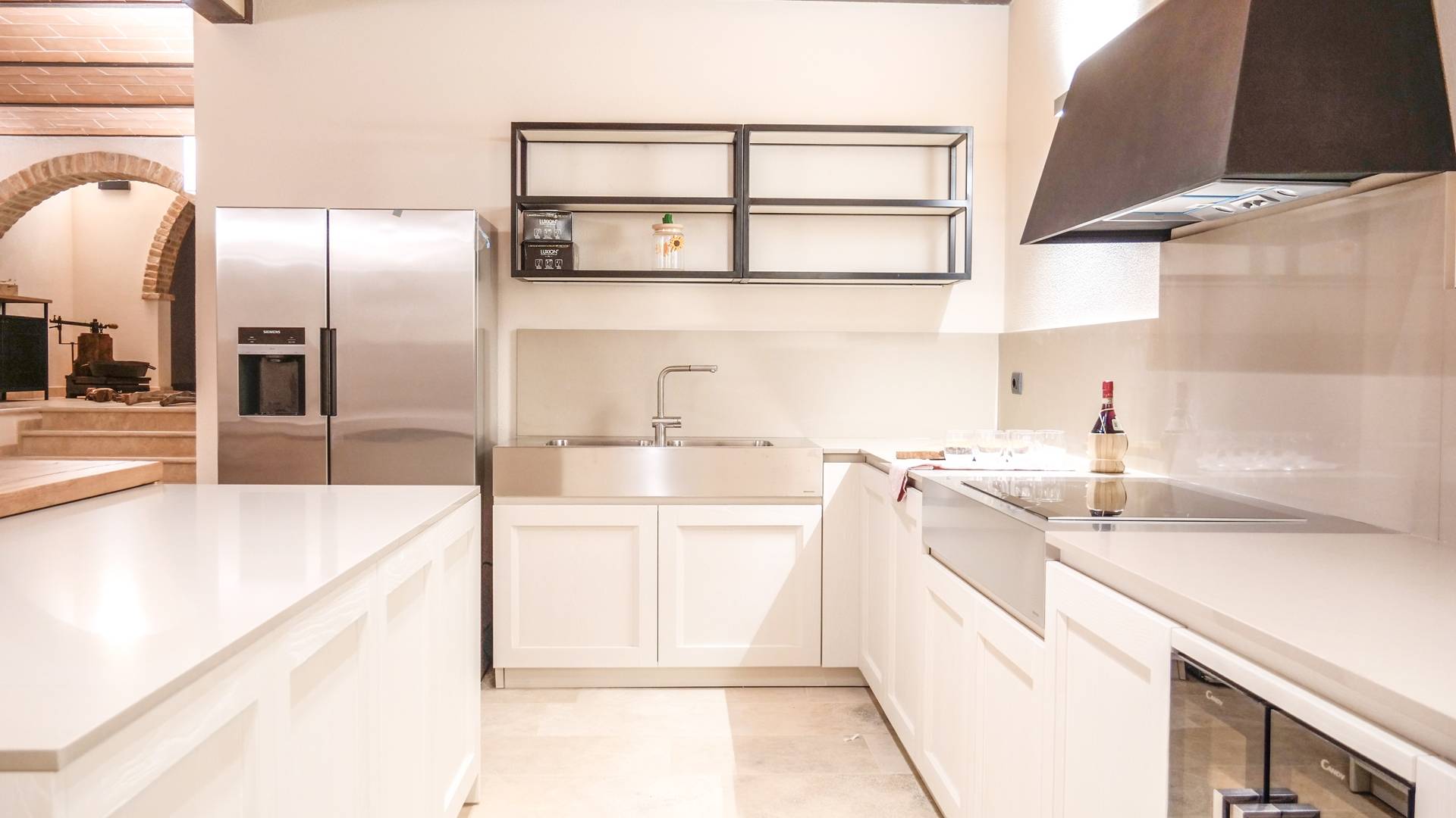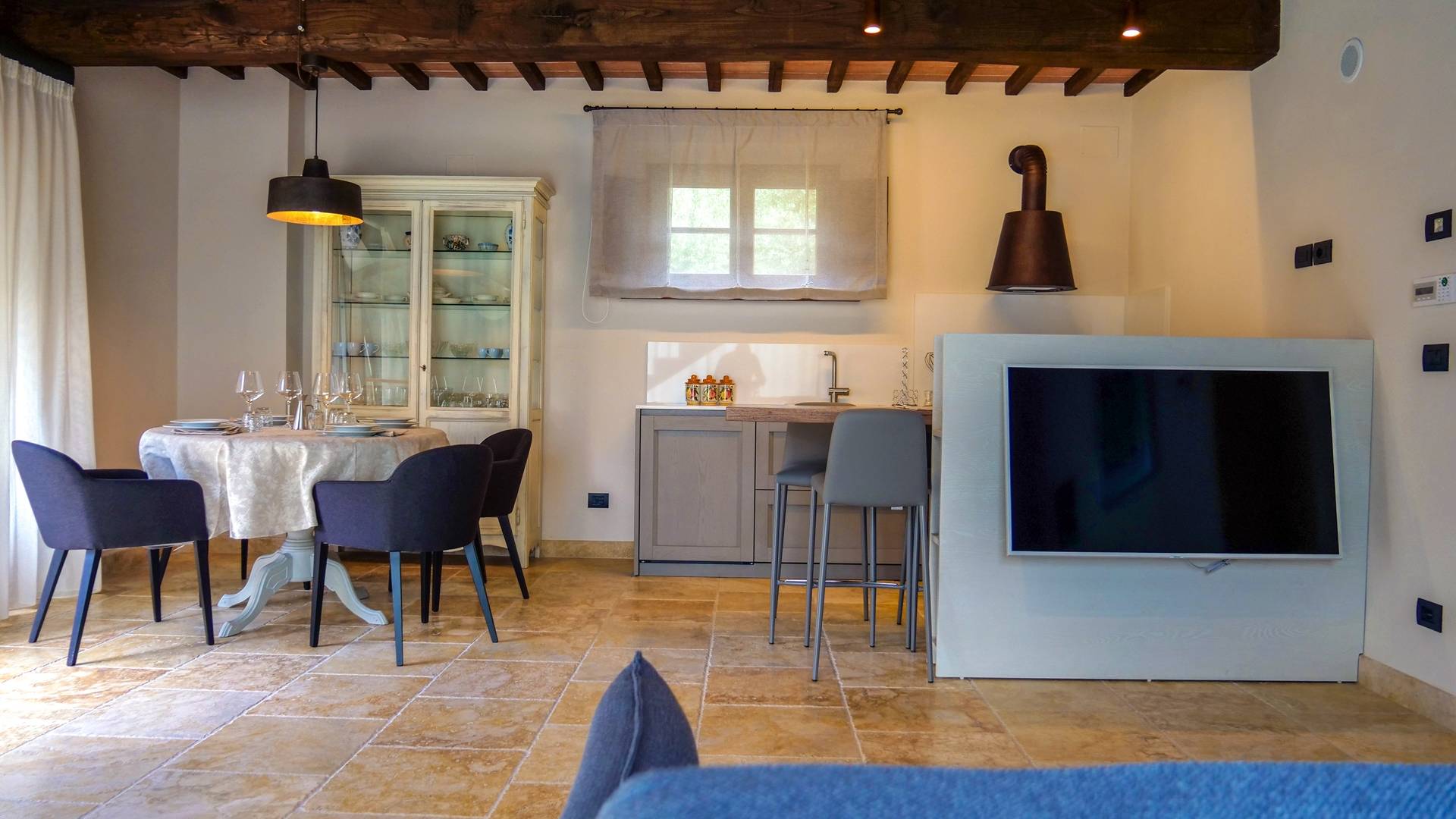La cuisine est particulièrement confortable, avec un îlot très spacieux au centre, équipé d'une immense table à manger pouvant accueillir jusqu'à 14 convives. Four double, lave-vaisselle, micro-ondes, réfrigérateur, bouilloire complètent chaque détail avec style. Dans l'annexe, pouvant accueillir jusqu'à 4 personnes, il y a une chambre double et un canapé-lit. La structure est complètement indépendante car elle dispose également d'une cuisine, d'une salle à manger et d'un coin salon au rez-de-chaussée. A l'étage, accessible par un escalier intérieur en fer, un espace nuit très habitable et lumineux obtenu avec sagesse et maîtrise d'un ancien accessoire.