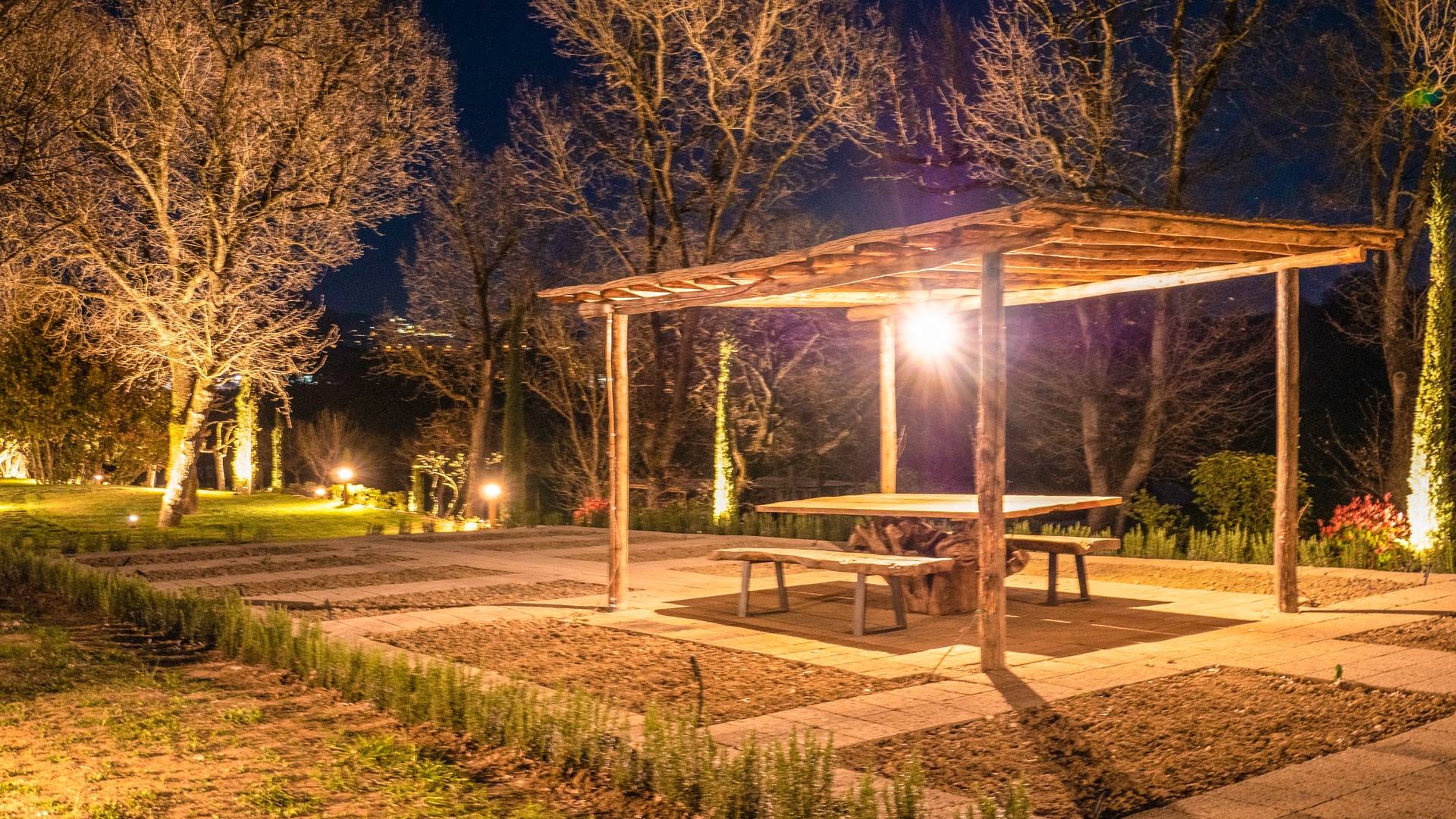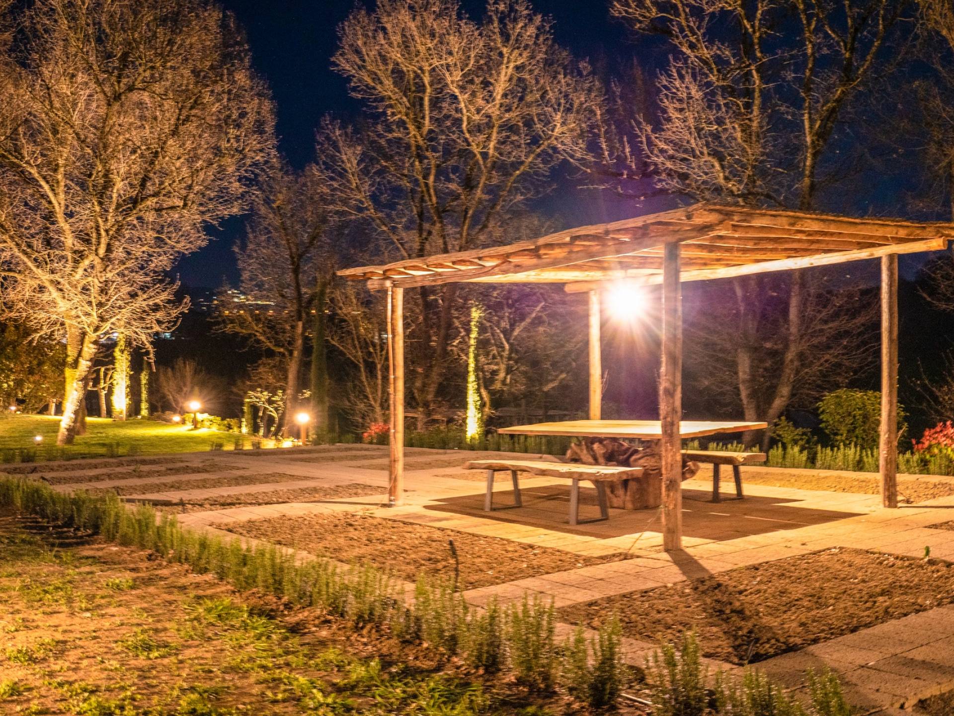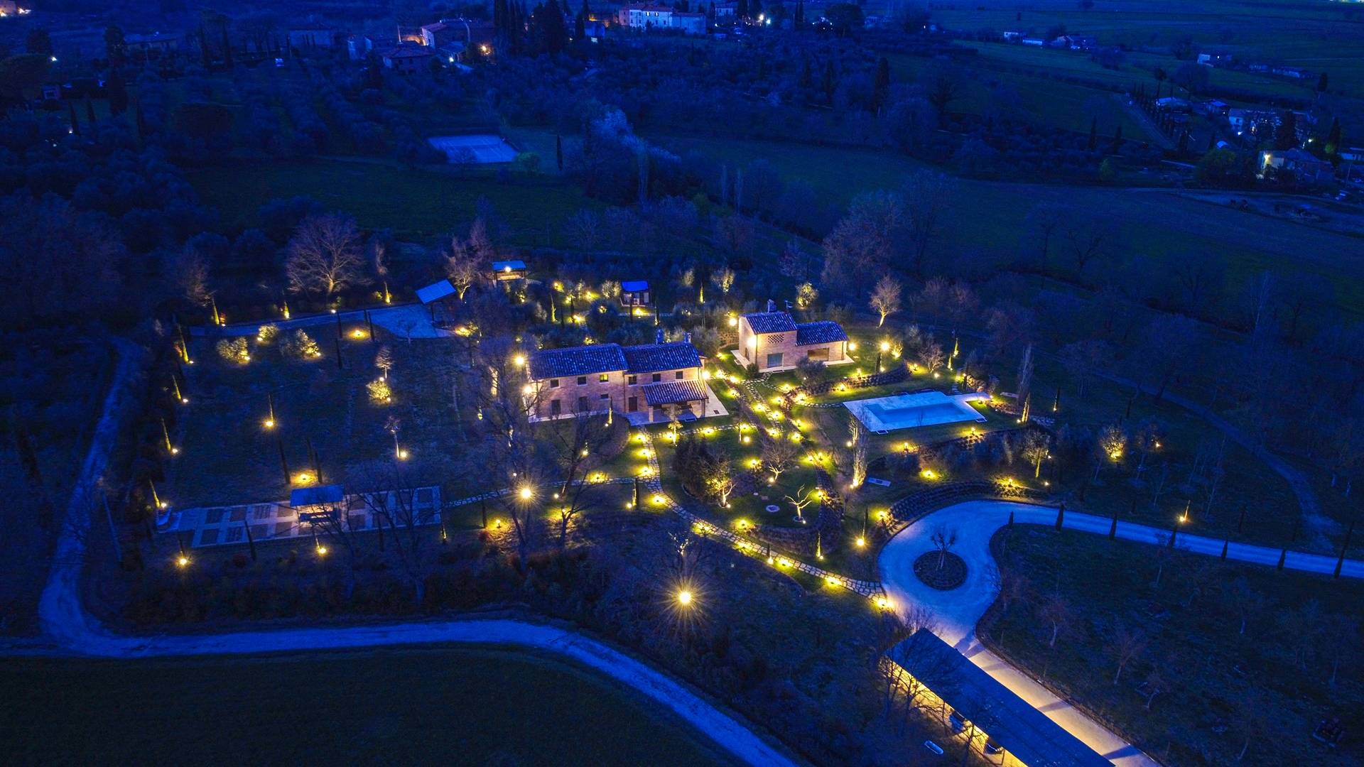 Dans les espaces extérieurs, desservis par des chemins de pierre qui relient les différentes situations, il y a une piscine confortable, mais aussi des espaces abrités par une verrière où vous pourrez déjeuner et dîner ou passer des moments en compagnie et en convivialité. Également à l'extérieur, dans le jardin verdoyant illuminé par une série de projecteurs qui donnent l'impression d'un ciel étoilé la nuit, il y a un petit terrain de football et un terrain de volley-ball, et des aires de jeux pour les enfants.