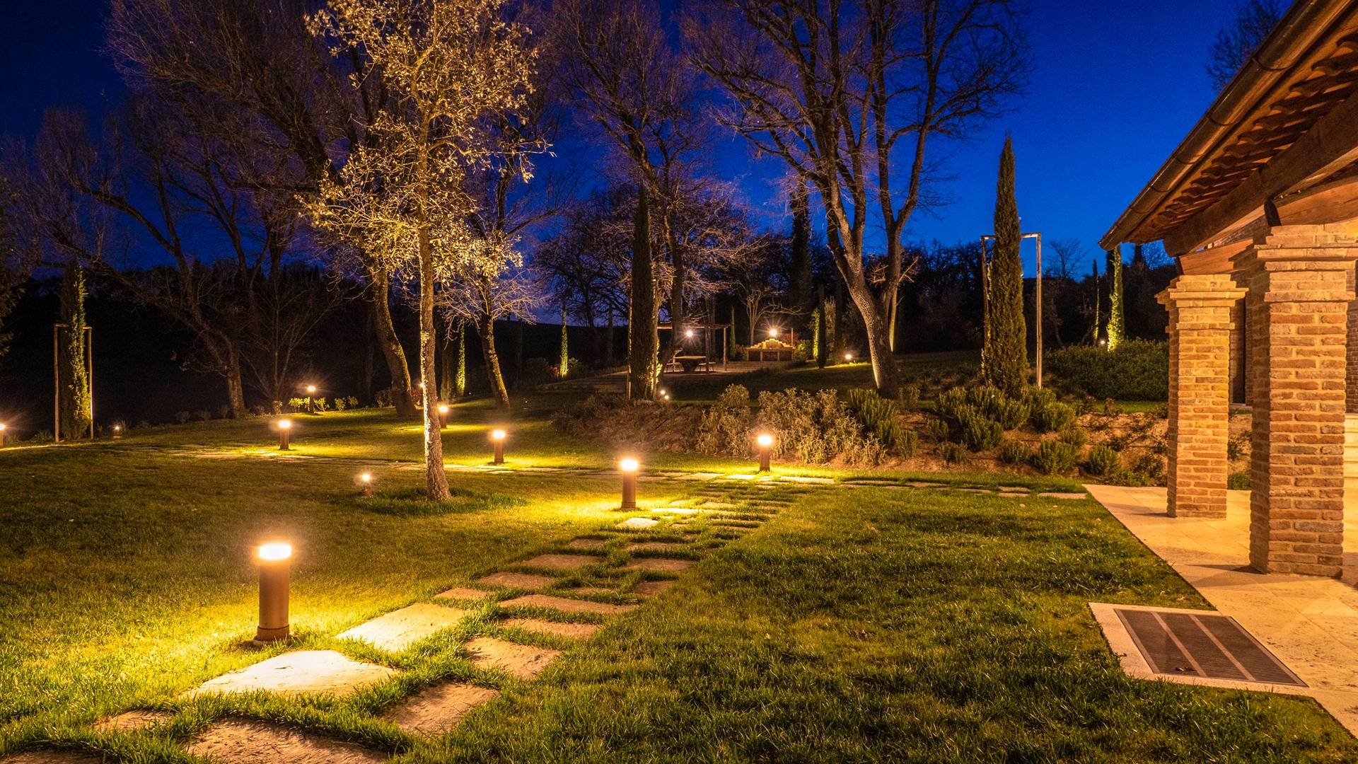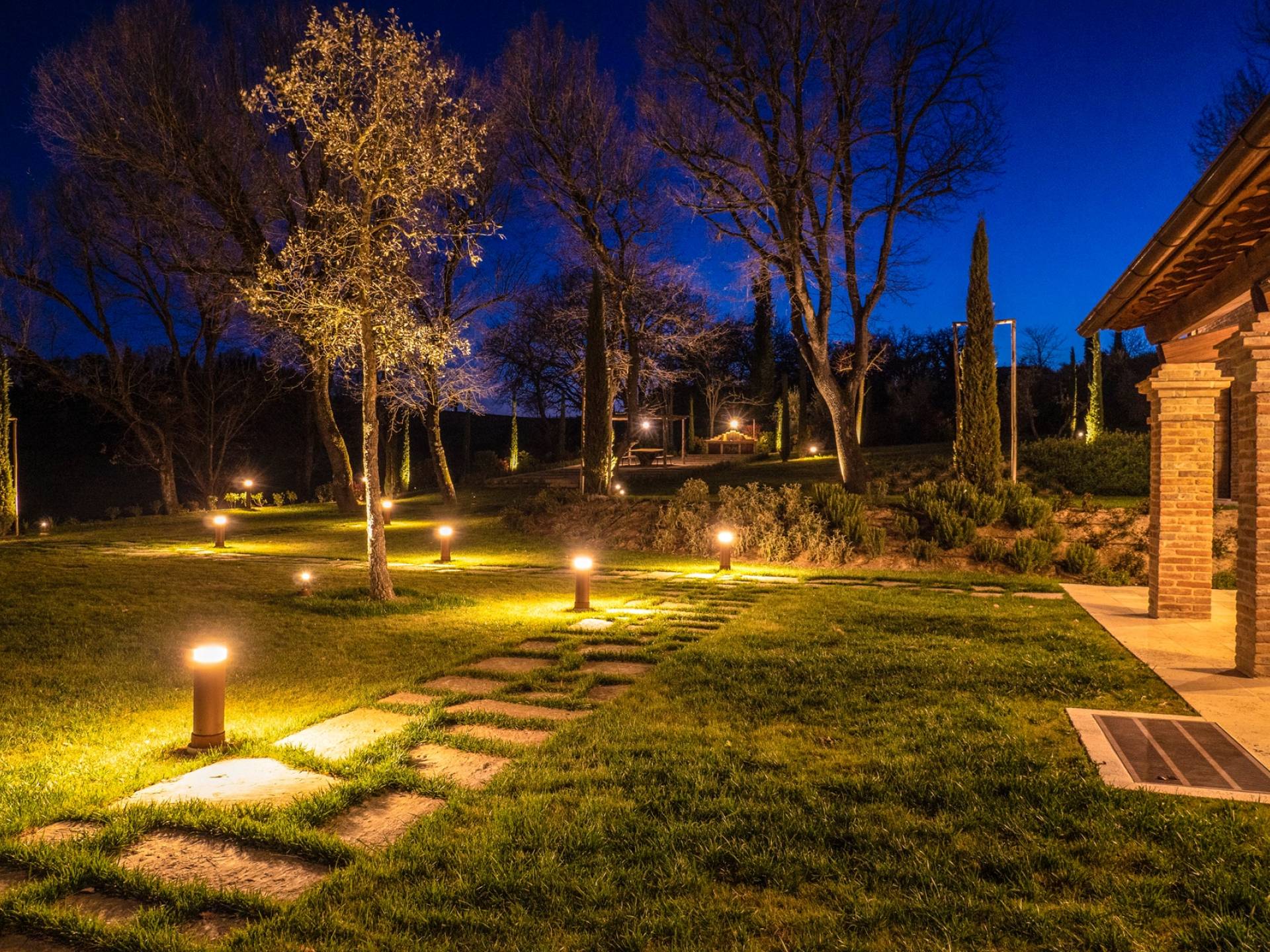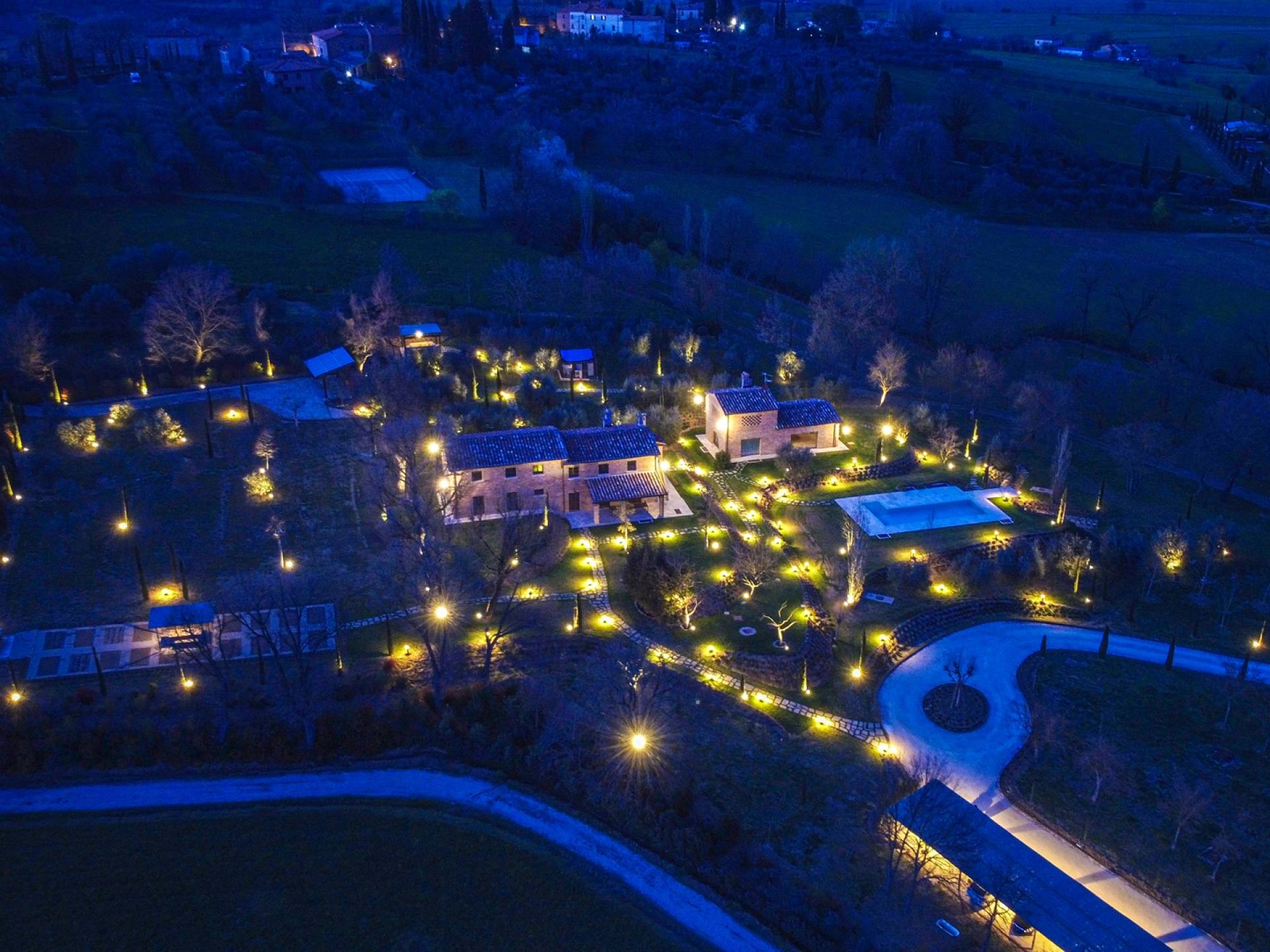 Dans les espaces extérieurs, desservis par des chemins de pierre qui relient les différentes situations, il y a une piscine confortable, mais aussi des espaces abrités par une verrière où vous pourrez déjeuner et dîner ou passer des moments en compagnie et en convivialité. Également à l'extérieur, dans le jardin verdoyant illuminé par une série de projecteurs qui donnent l'impression d'un ciel étoilé la nuit, il y a un petit terrain de football et un terrain de volley-ball, et des aires de jeux pour les enfants.